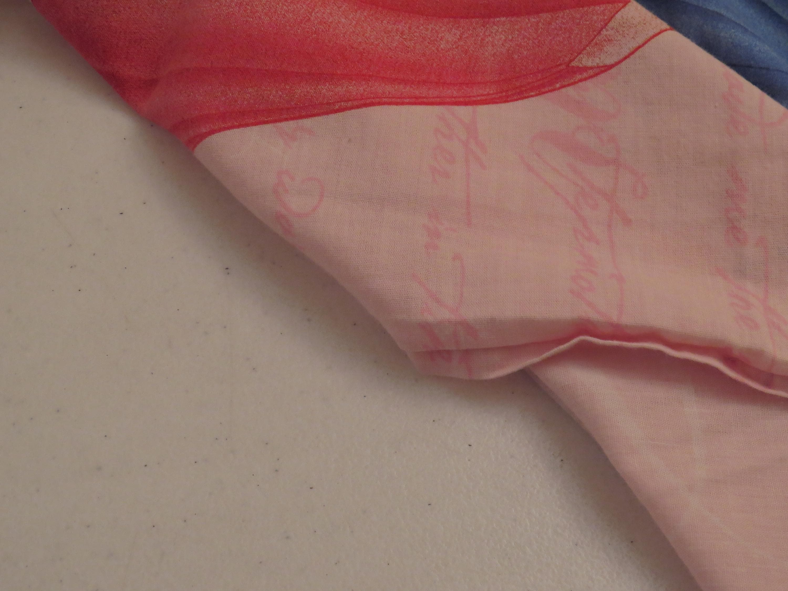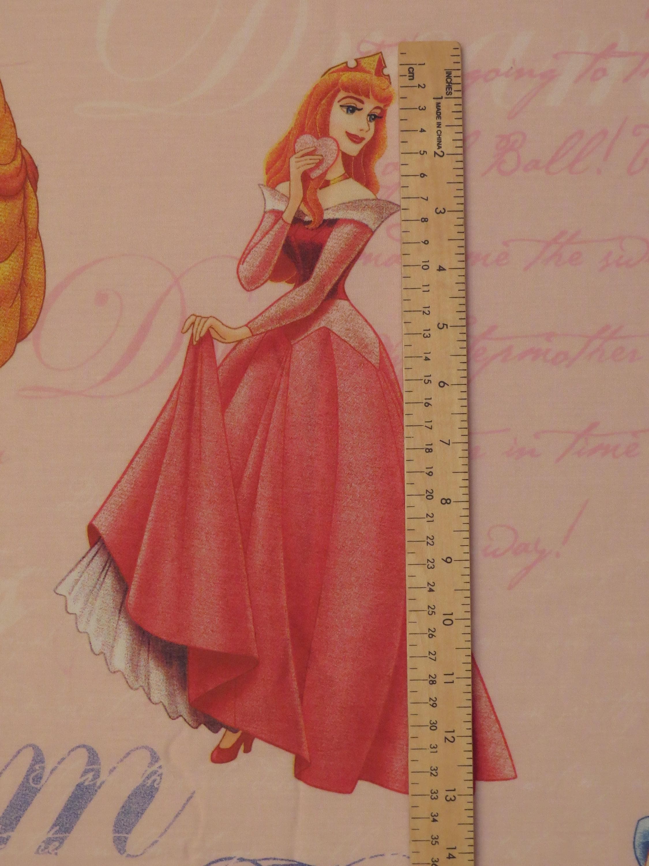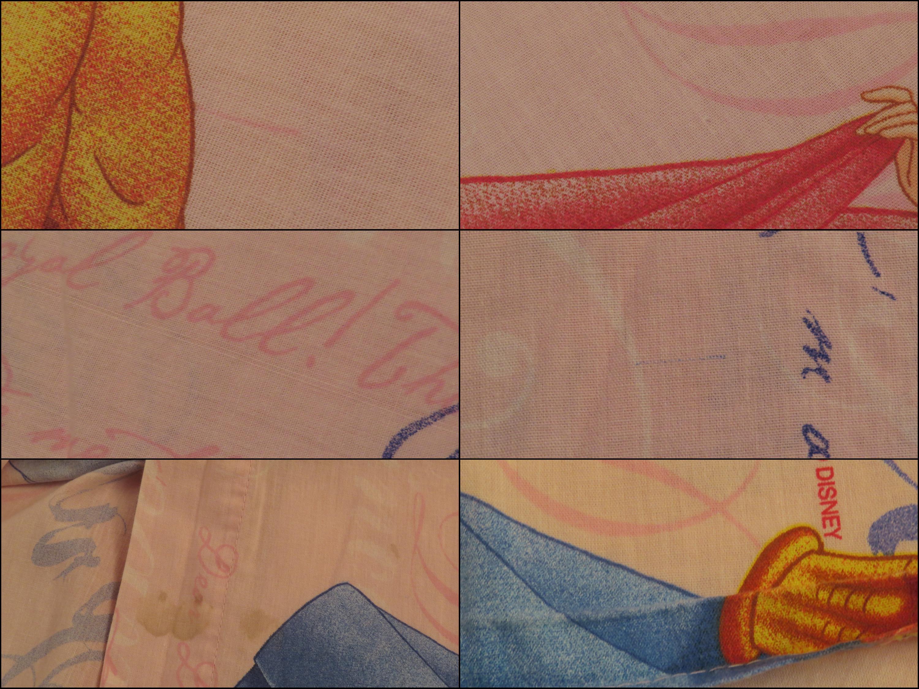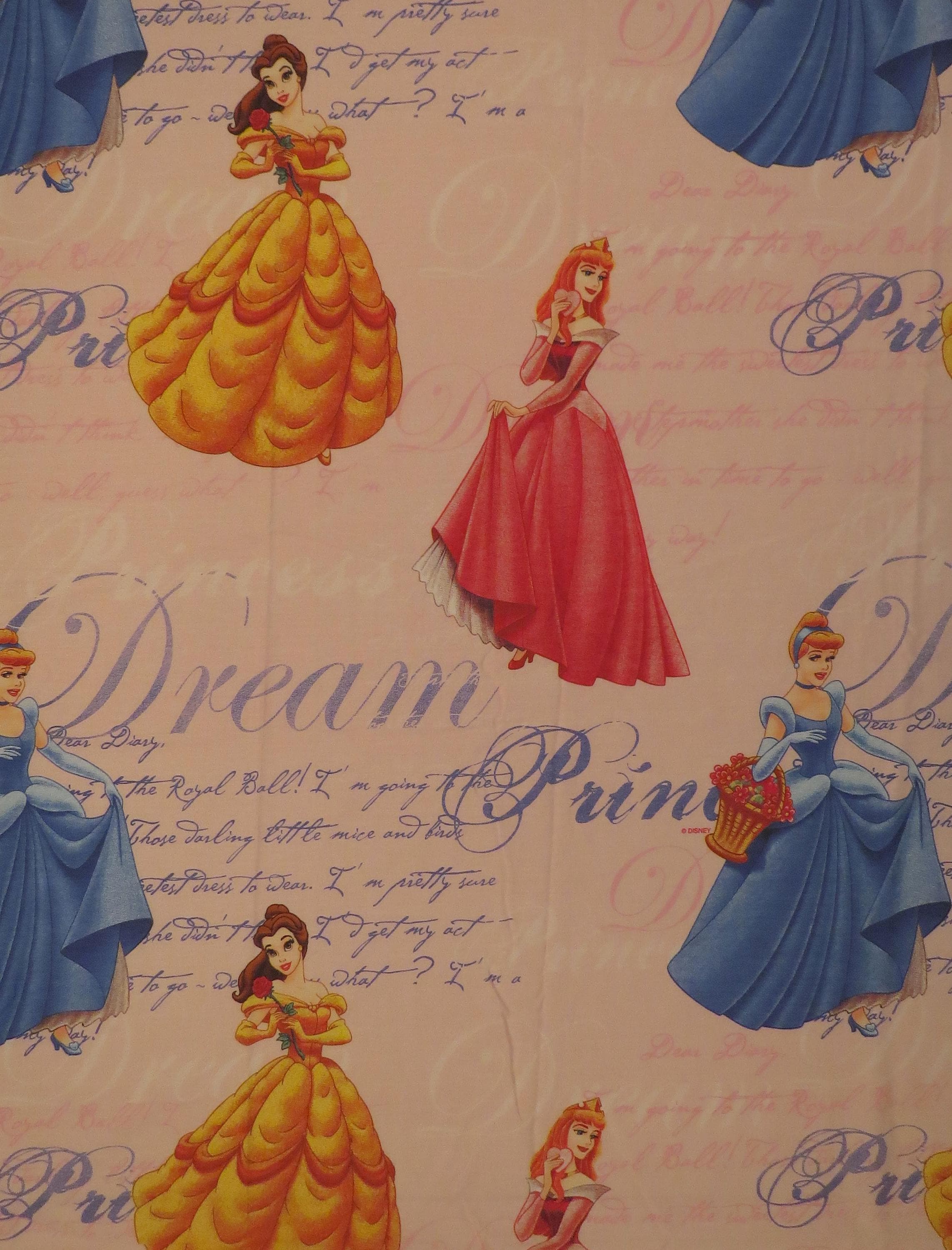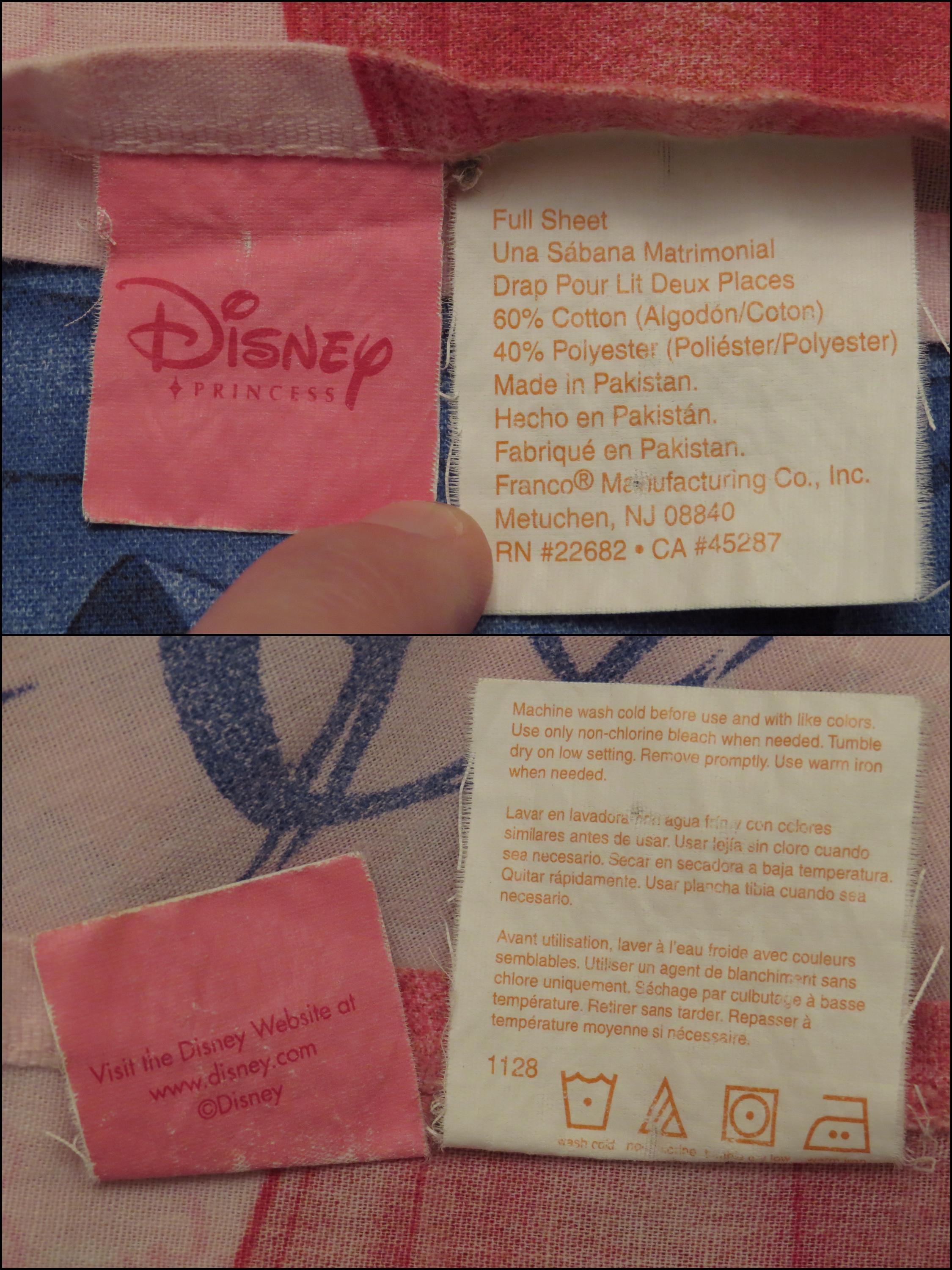 Vintage Disney Princess full sized flat sheet which is 60% cotton and 40% polyester. It has some line marks/printing errors, thin spots, and thread snags. There are fold/crease lines along the edges, and a couple missing thread spots across the middle. It has a stain cluster near the bottom edge.