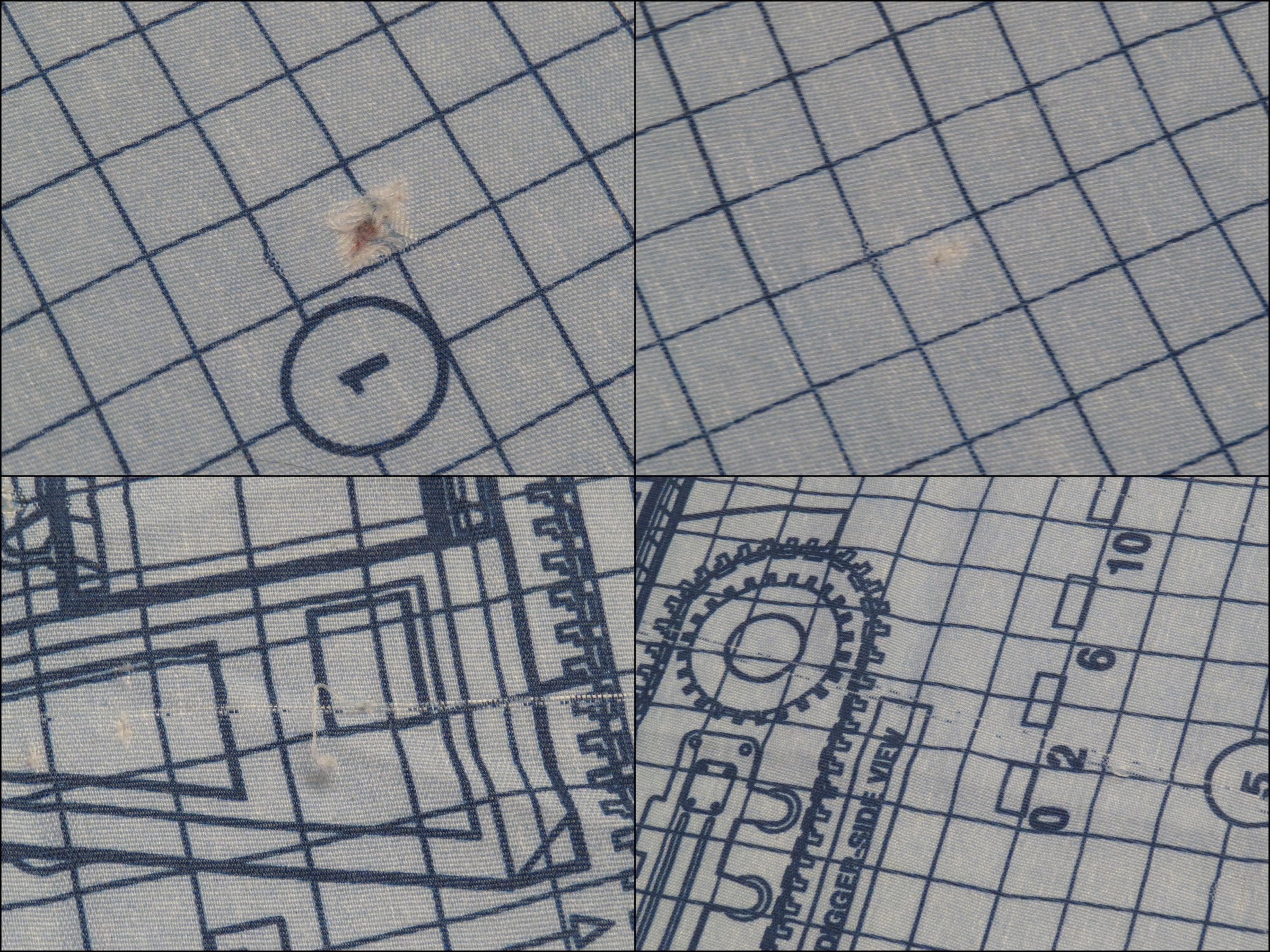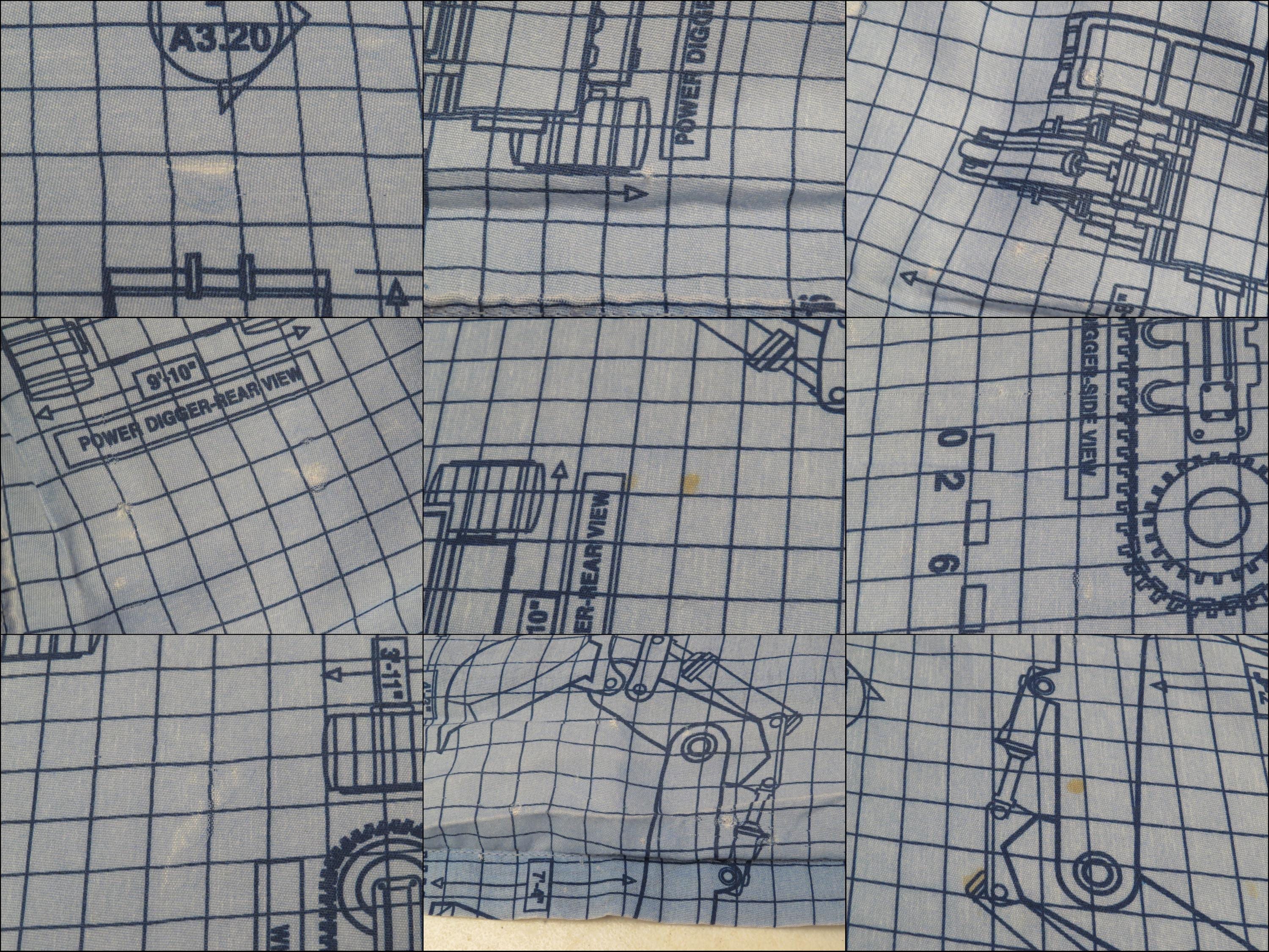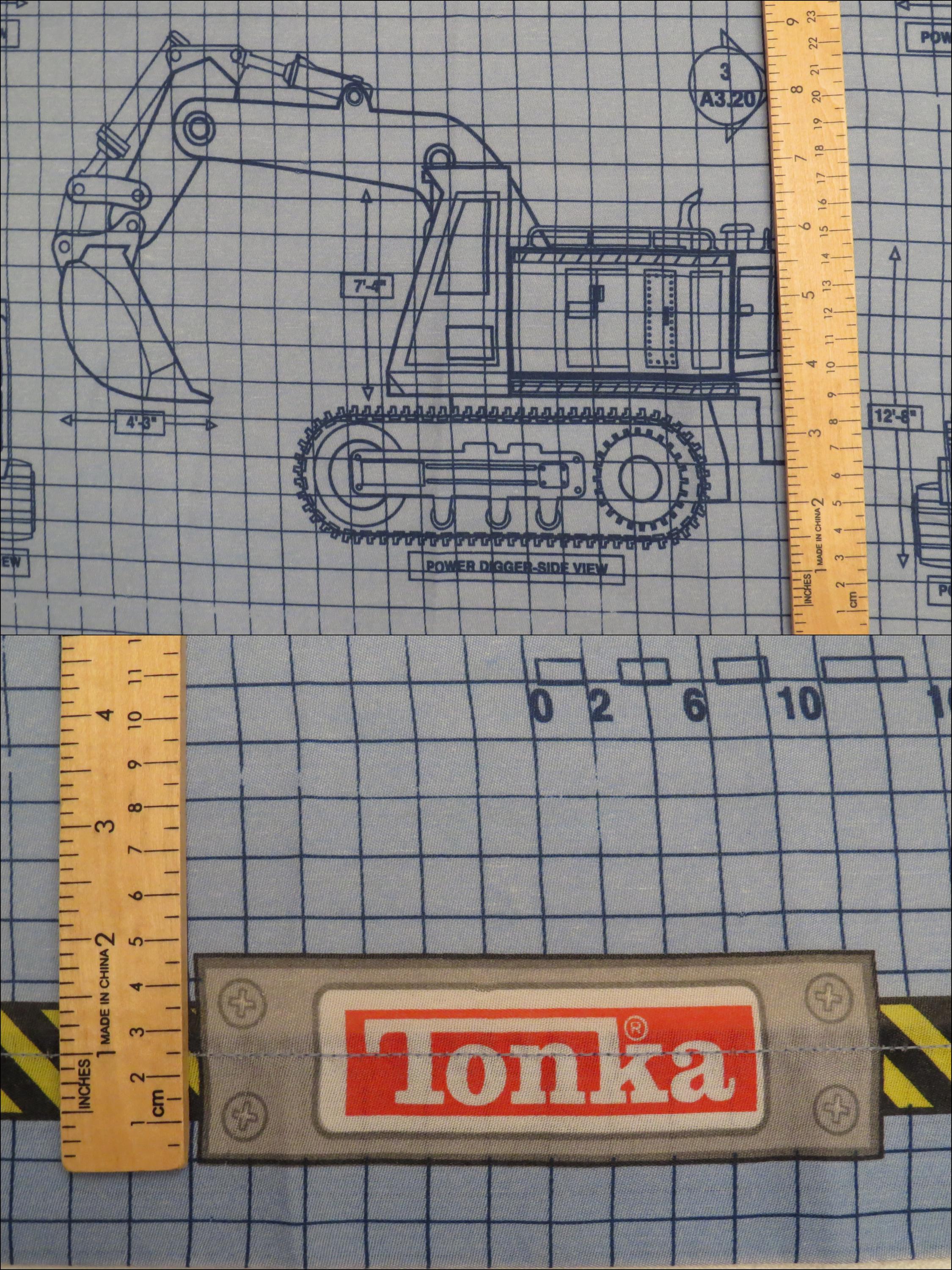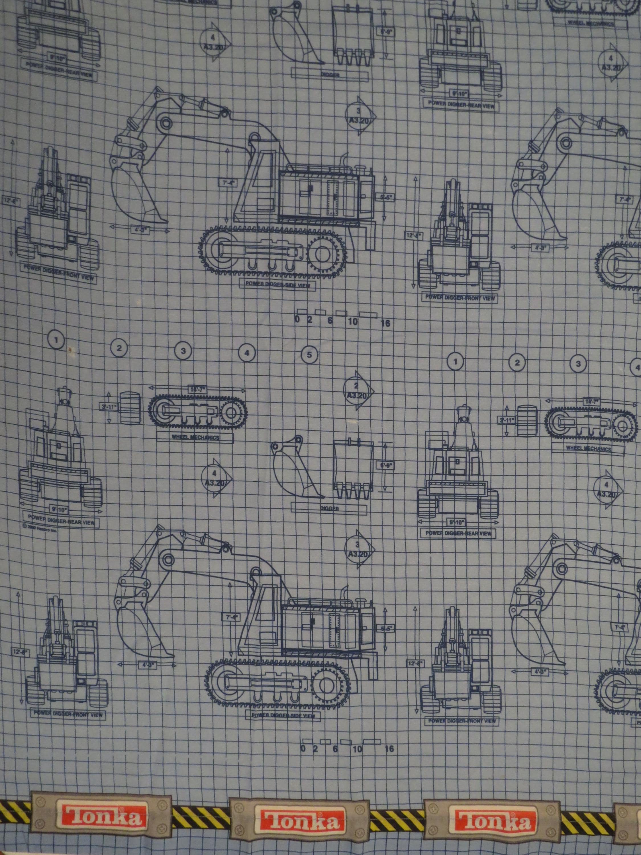 Vintage Tonka twin flat sheet from 2000. It is faded and thin. There are missing thread spots, multiple small holes, and thin spots. It has a few small stains, fold/crease lines along the edges, and light whitish marks. It is worn along the edges/stitching.