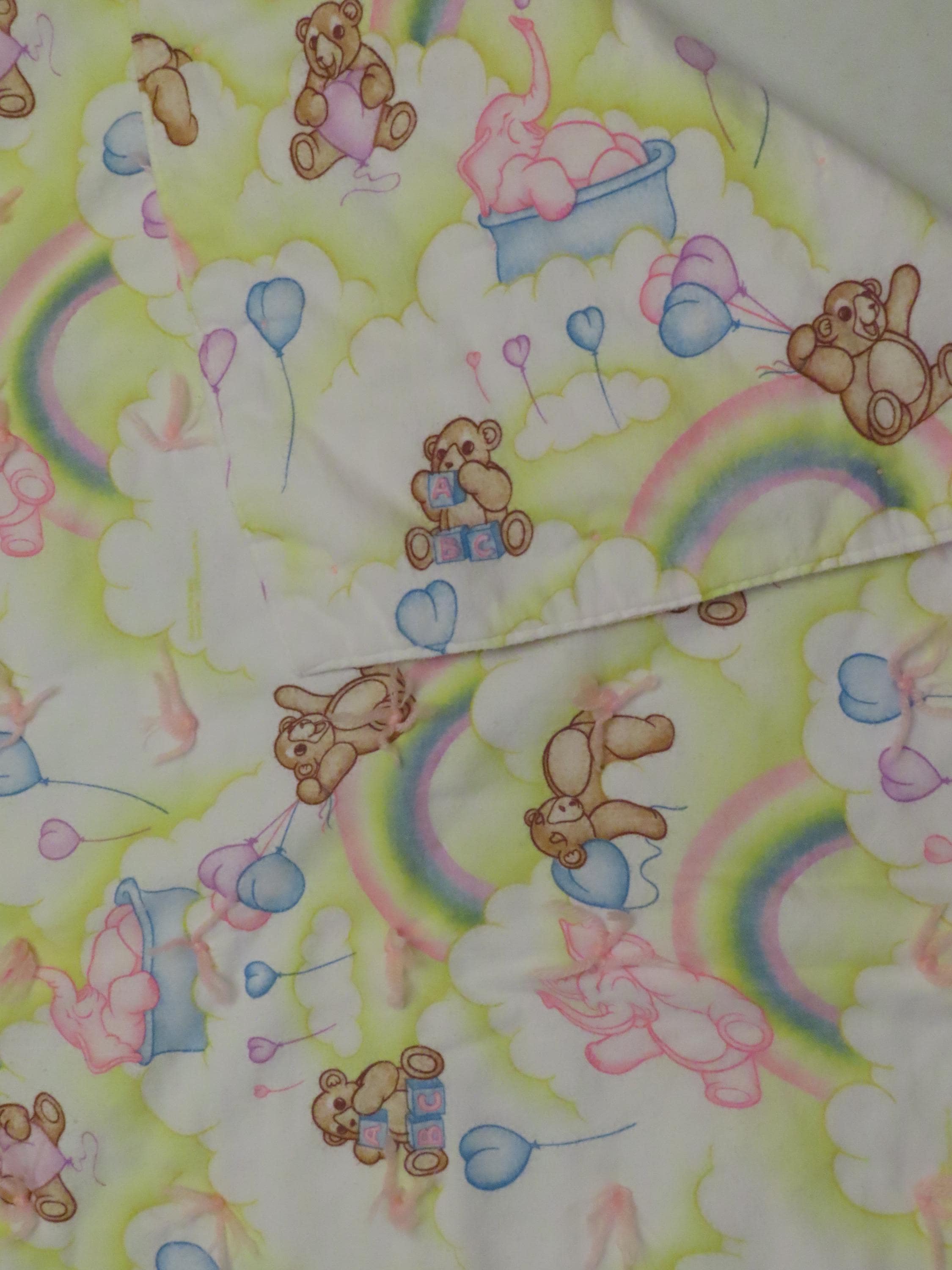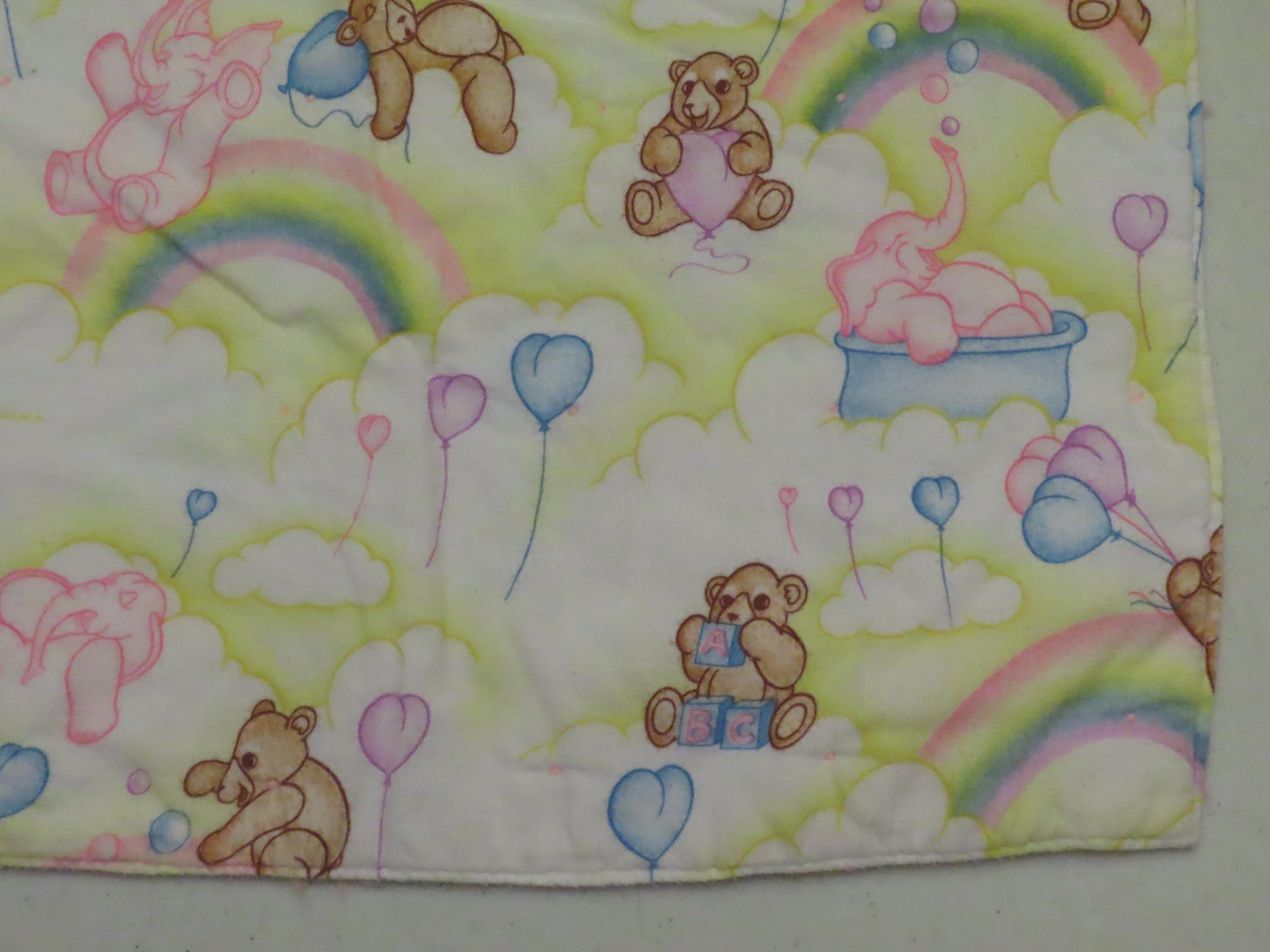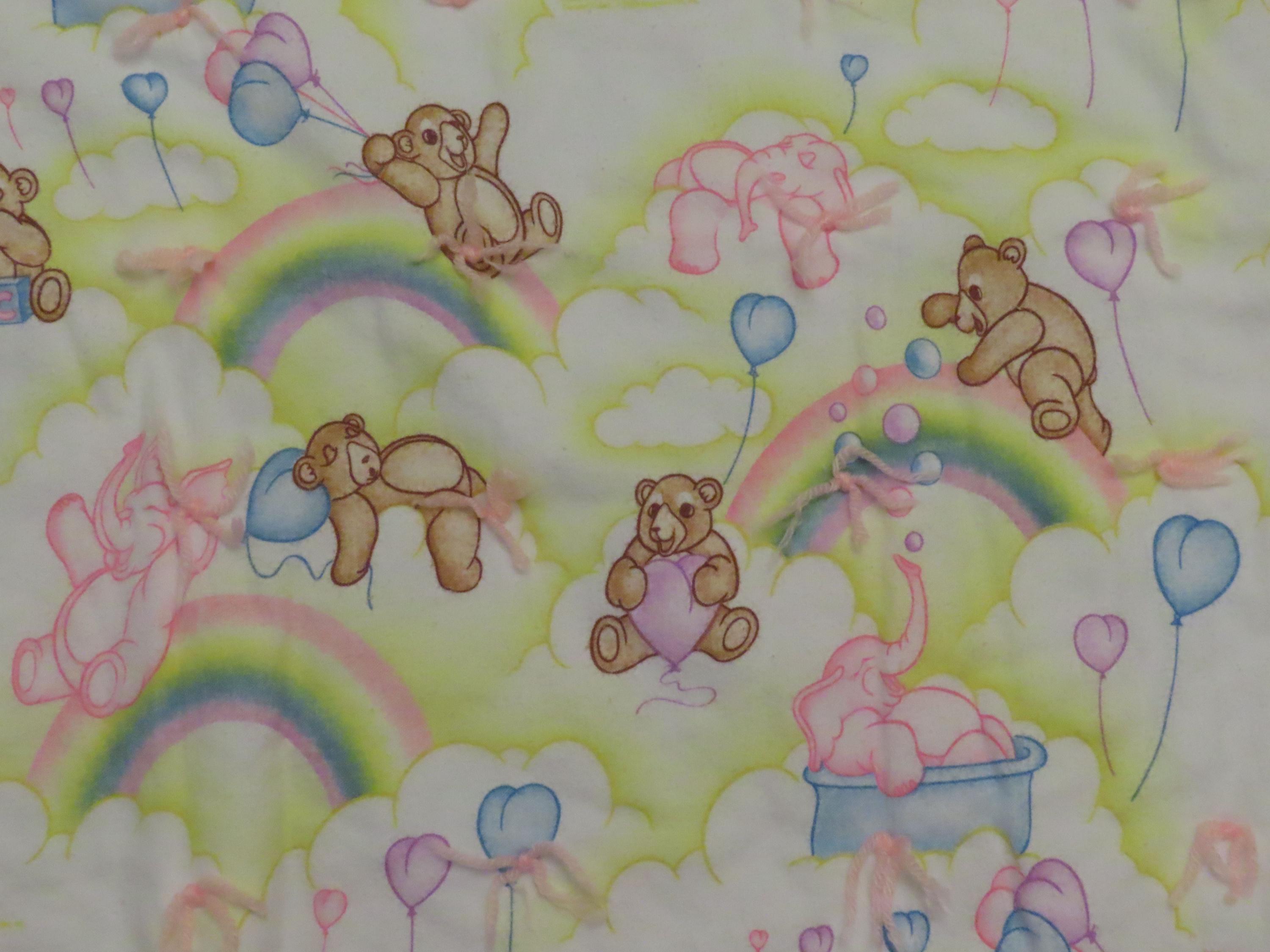 Vintage Teddy bears and pink elephants small blanket which is about 53.5" wide by 32.5" tall (136 cm by 82 cm). It is a flannel fabric on both sides, with pink yarn ties throughout. It has the fabric information printed on it, but I can't make out what it says. There is heavy pilling, the fabric is worn, and the colors are a little faded. It has some thin spots, tiny white marks, and the fabric bunches up some along the edges.