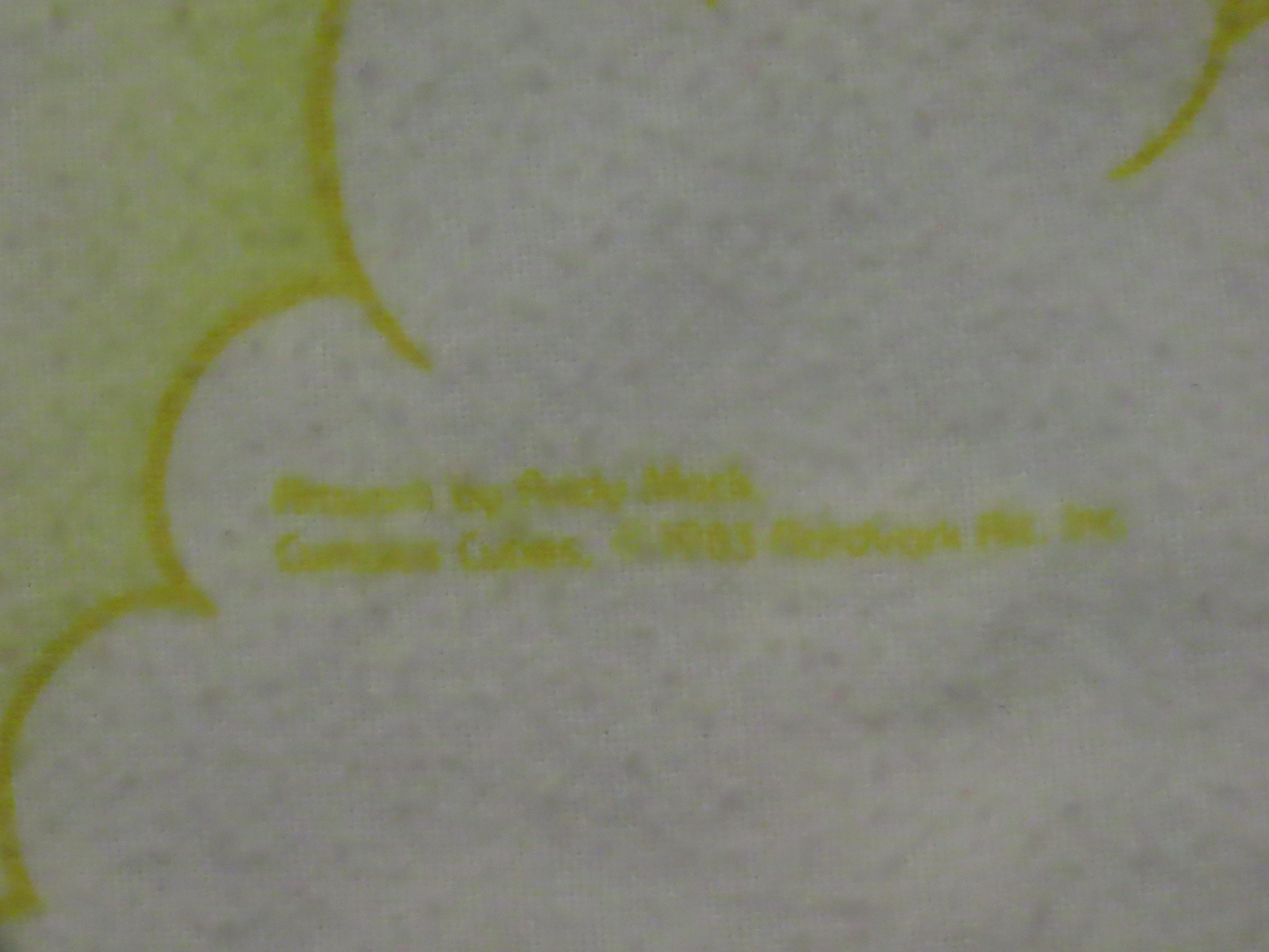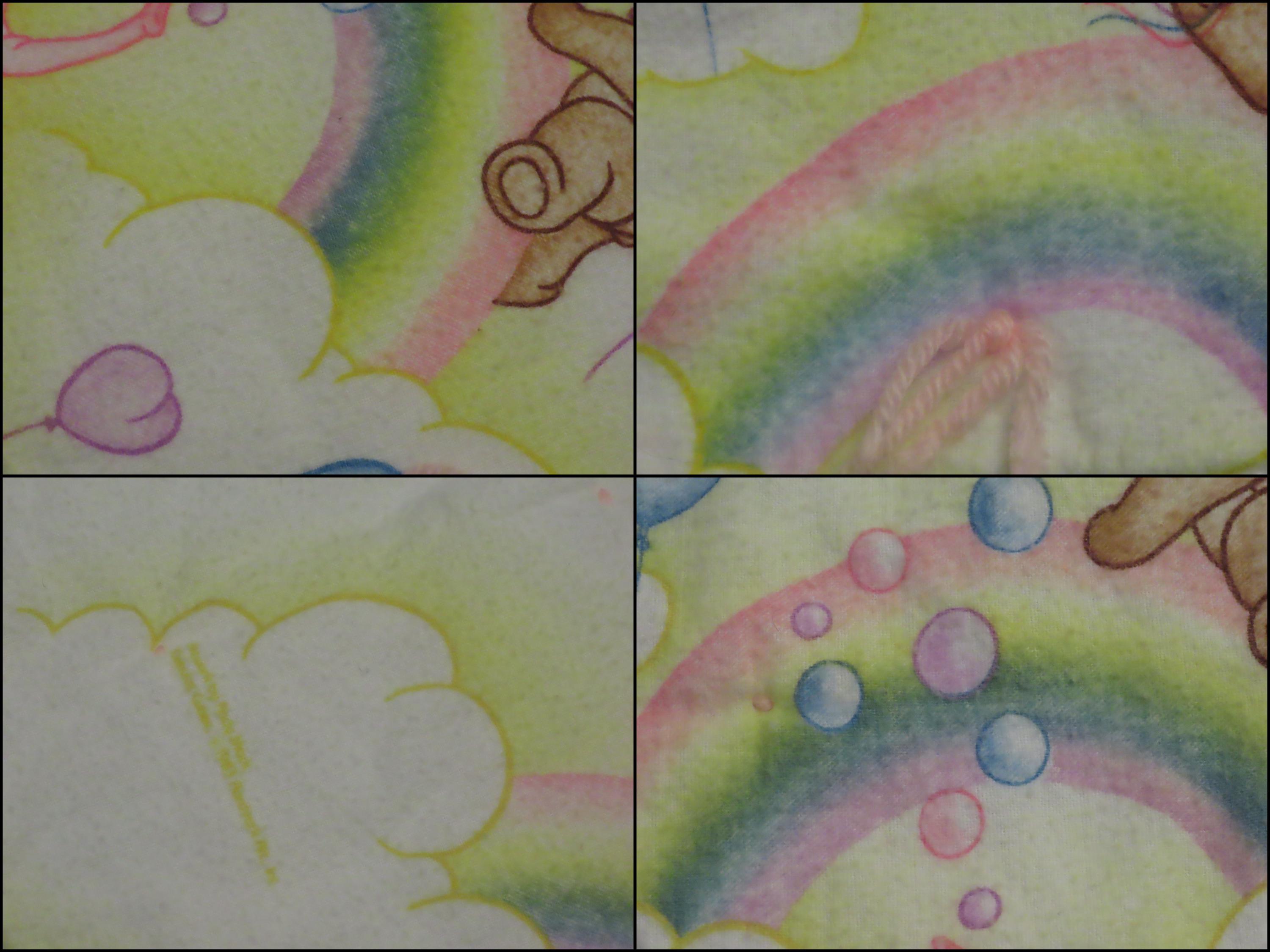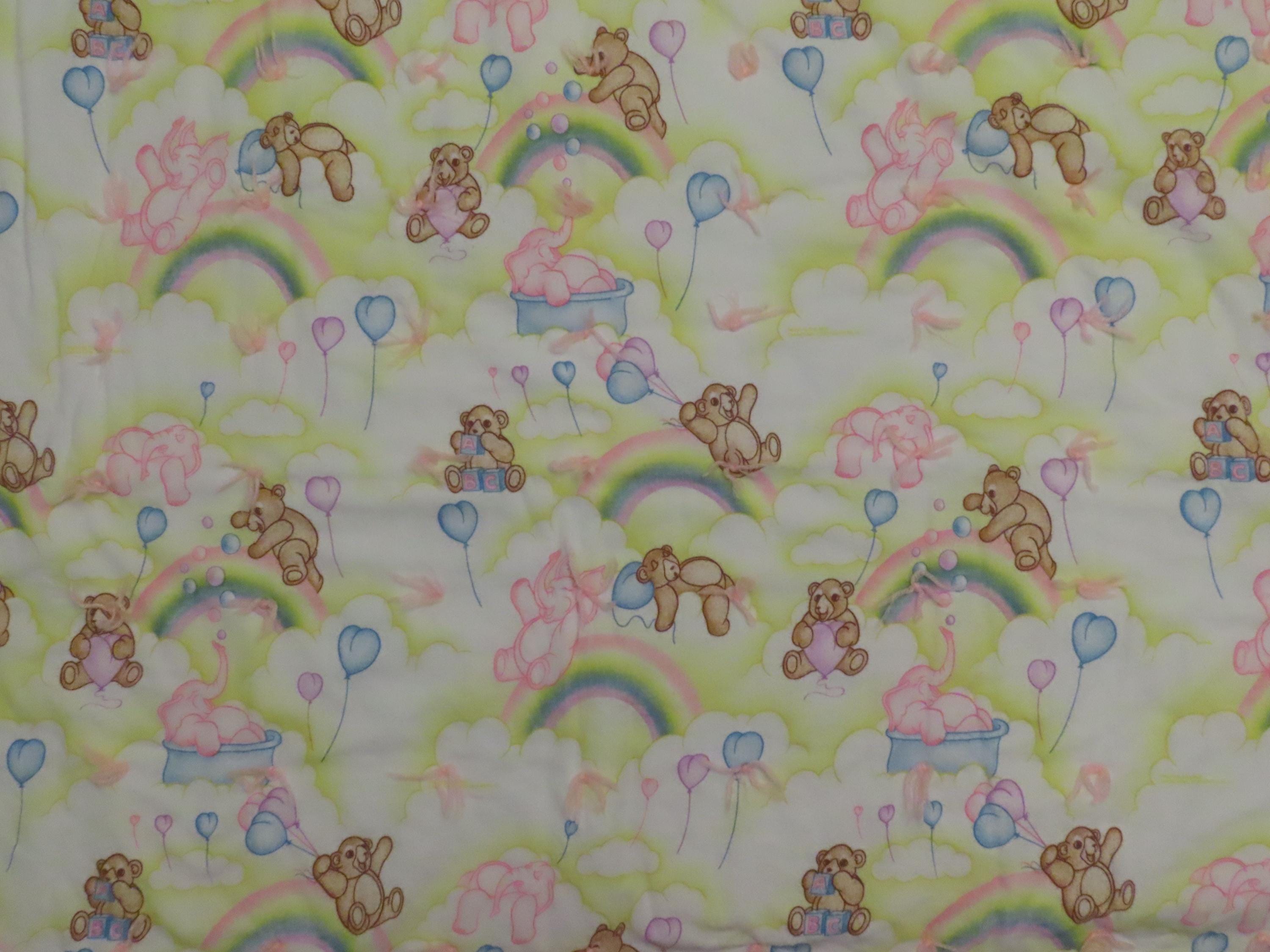 Vintage Teddy bears and pink elephants small blanket which is about 53.5" wide by 32.5" tall (136 cm by 82 cm). It is a flannel fabric on both sides, with pink yarn ties throughout. It has the fabric information printed on it, but I can't make out what it says. There is heavy pilling, the fabric is worn, and the colors are a little faded. It has some thin spots, tiny white marks, and the fabric bunches up some along the edges.