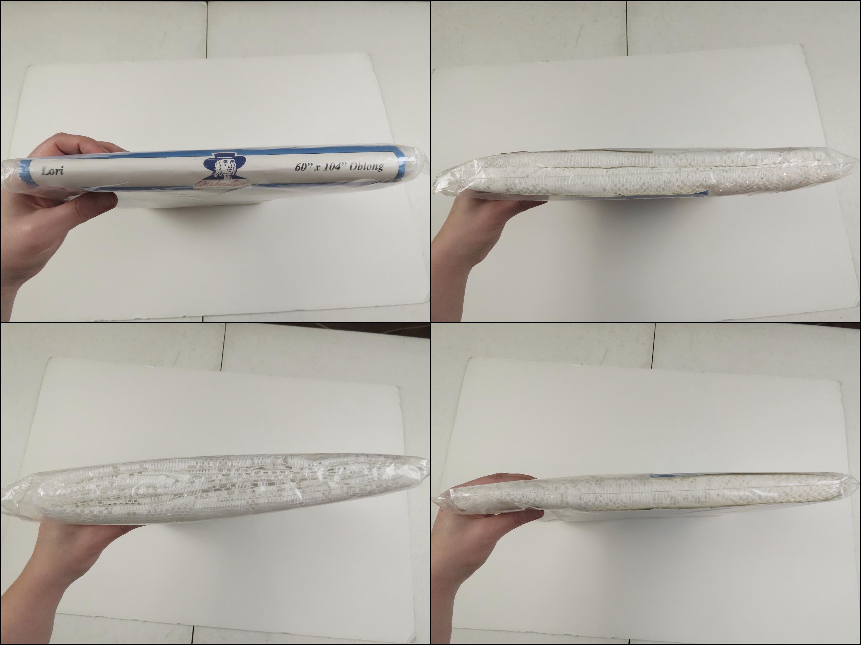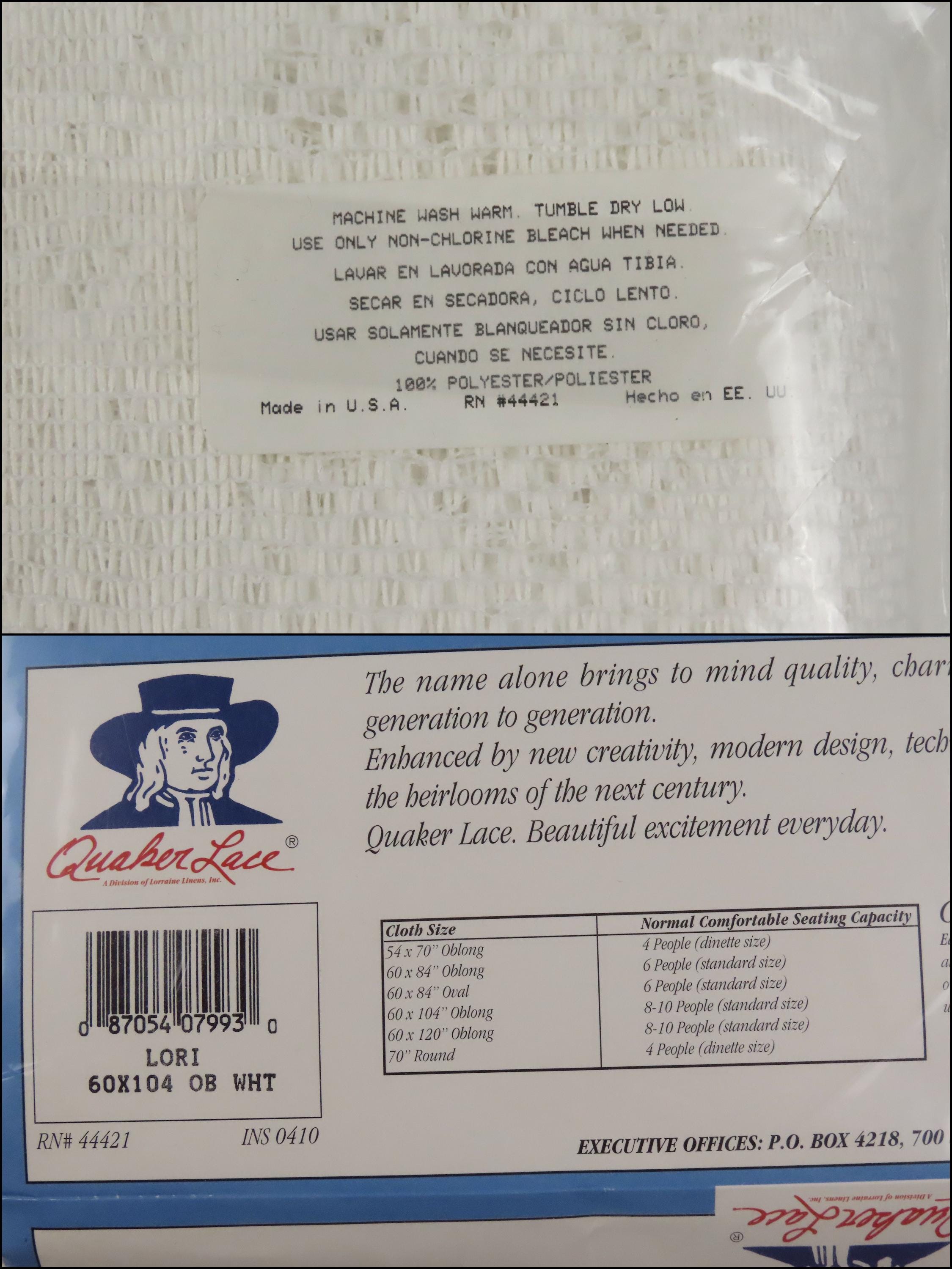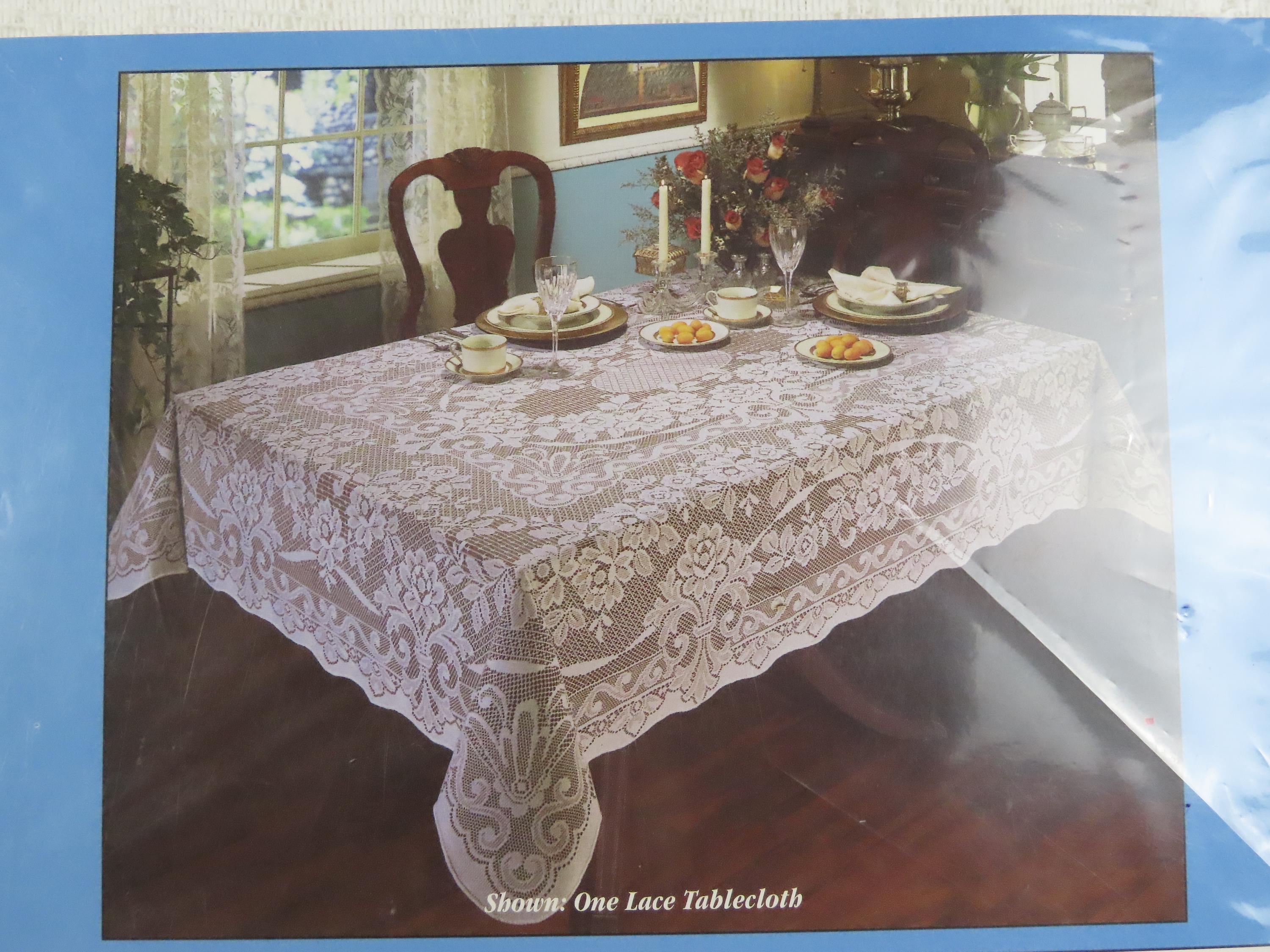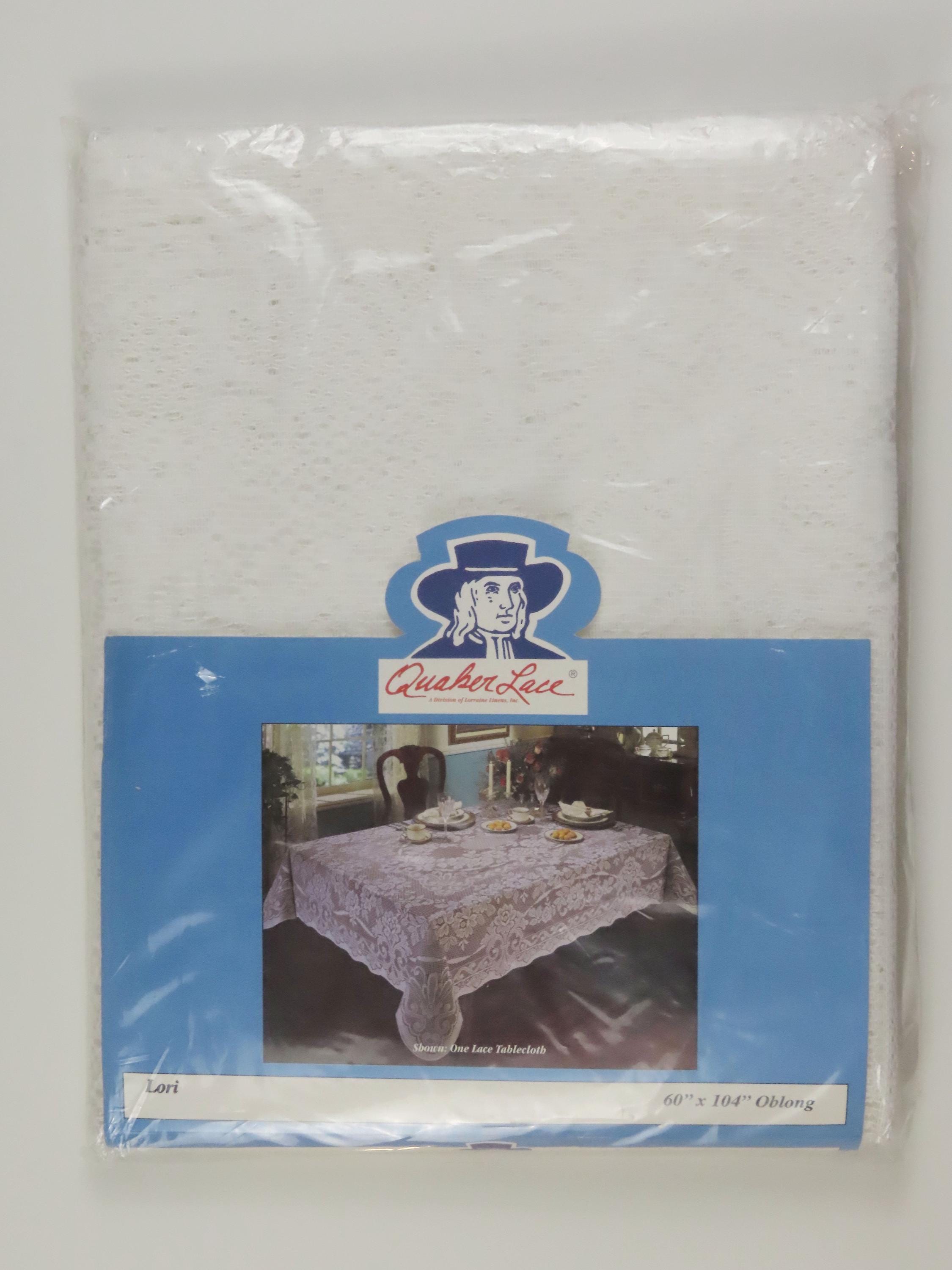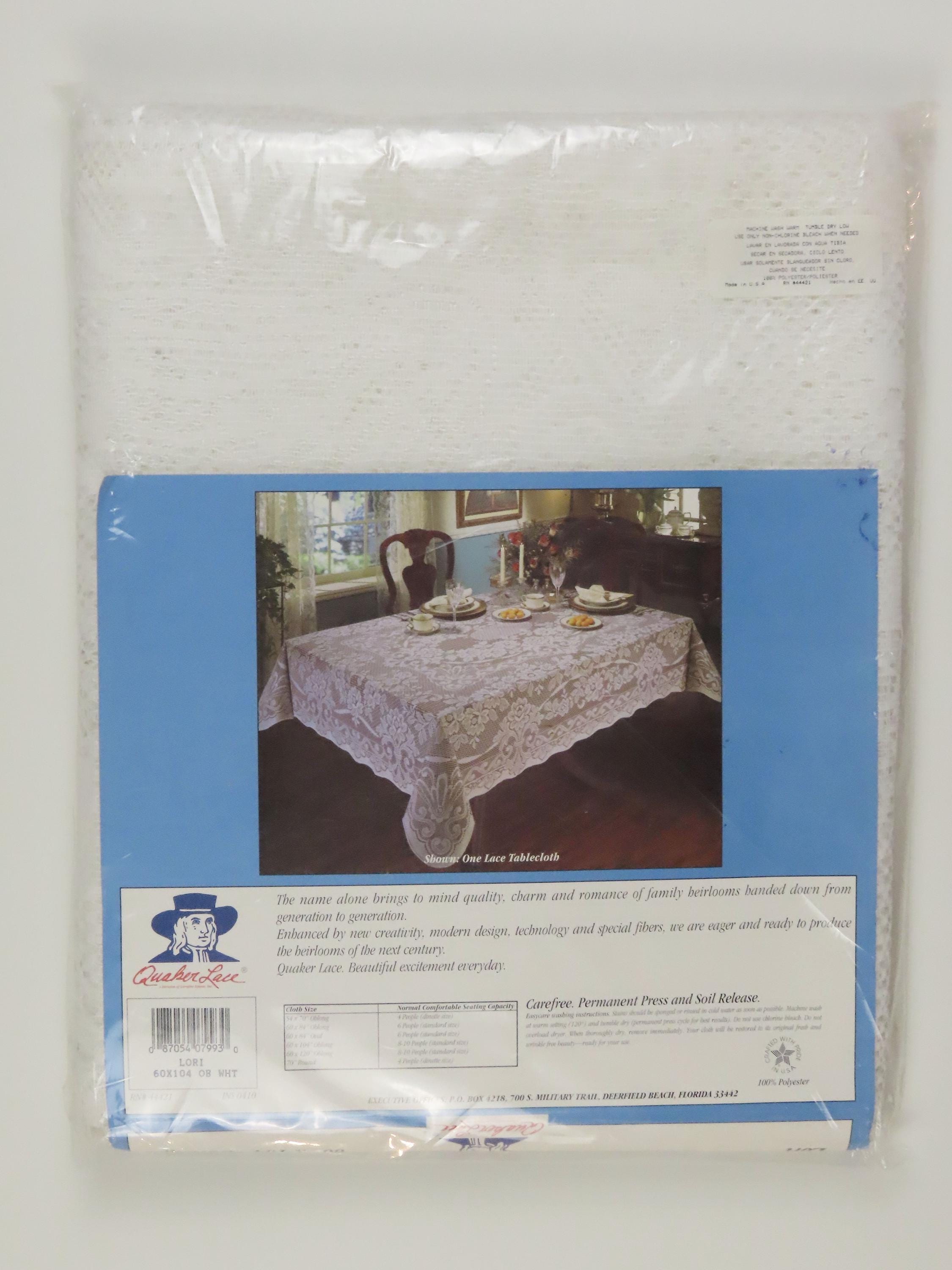 Vintage Quaker Lace "Lori" floral oblong lace tablecloth which is new in the package. It measures 60" by 104" and is 100% polyester. The packaging is worn. The plastic has some blue marks, and some small holes. The cardboard insert is worn.