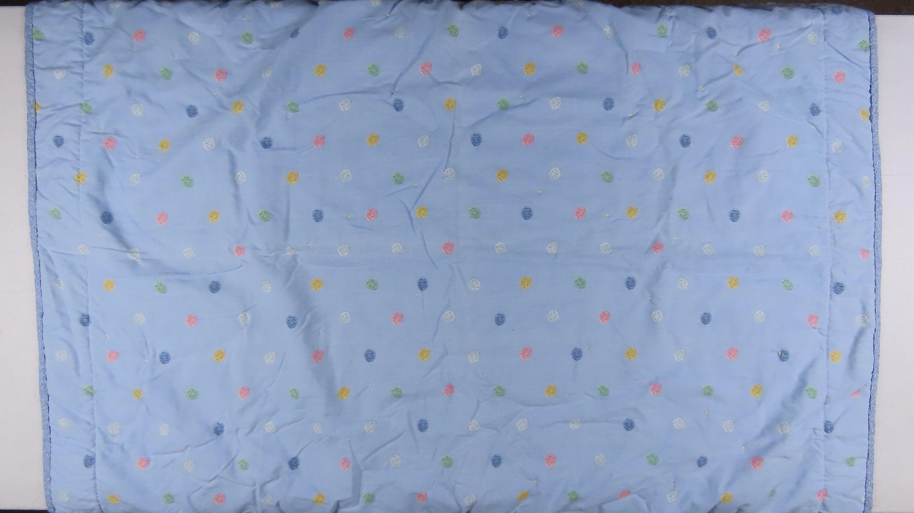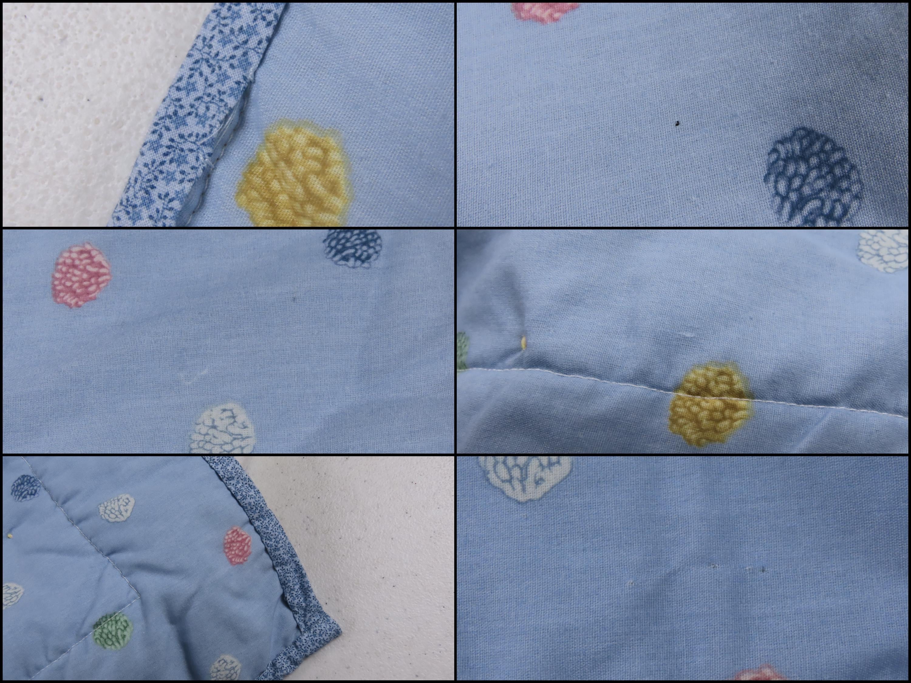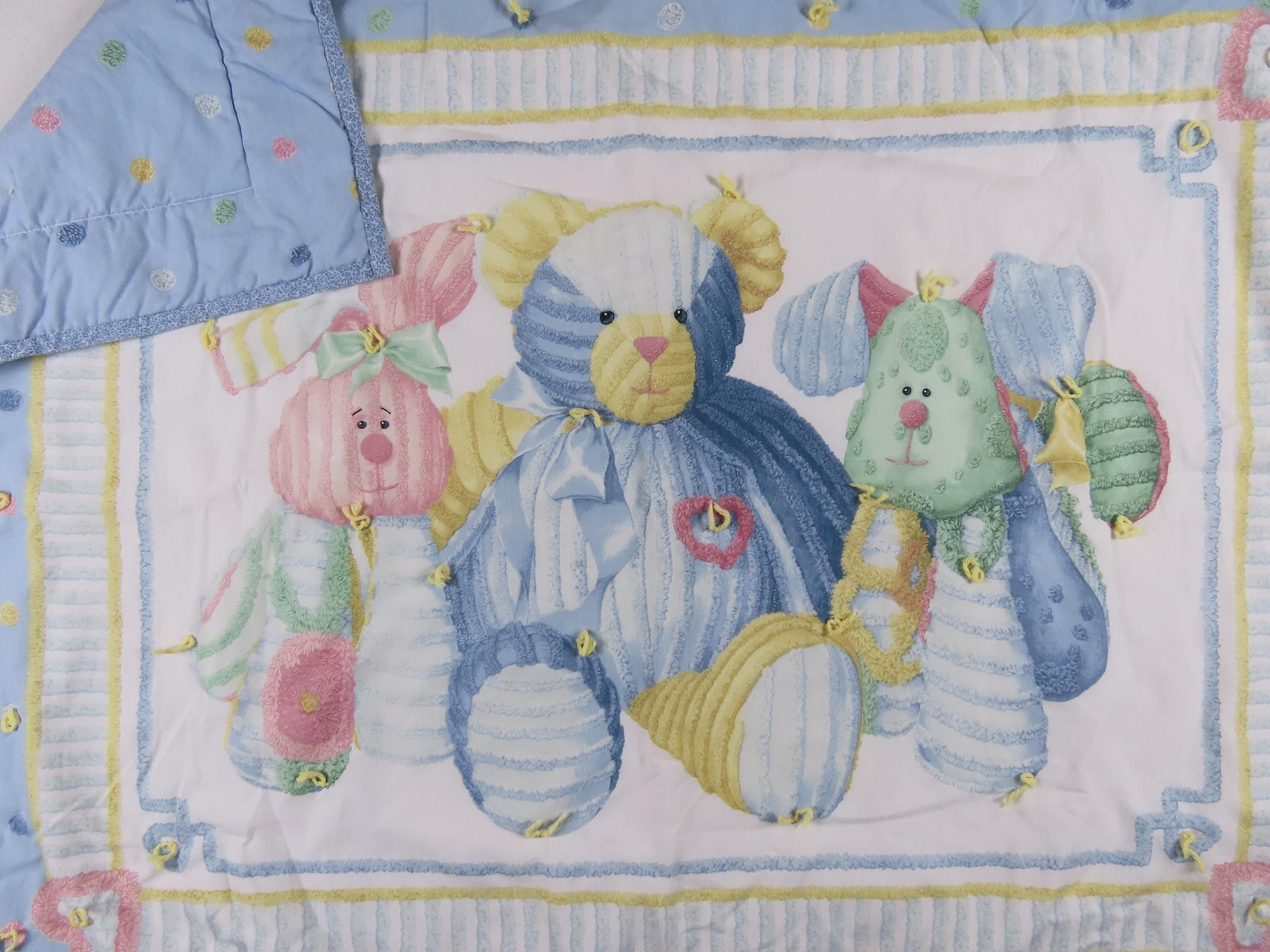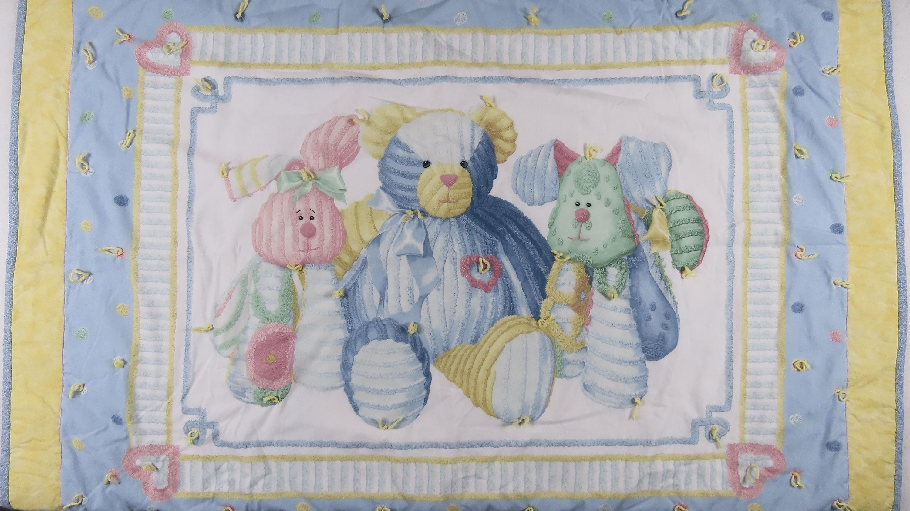 Vintage Teddy Bear small blanket which is 51" wide by 41" tall (129 cm by 104 cm). The fabric bunches up some along the stitching, and pools up in other areas. It is sewn unevenly in areas, and is worn along the edges/stitching. There are tiny marks, thread snags, and loose threads. It has some thin spots, a couple pin holes, and a small cluster of tiny holes. There are tiny white marks, and light whitish marks. The backside is faded in areas with more fading down the middle. There is extremely light pilling on areas of the backside.