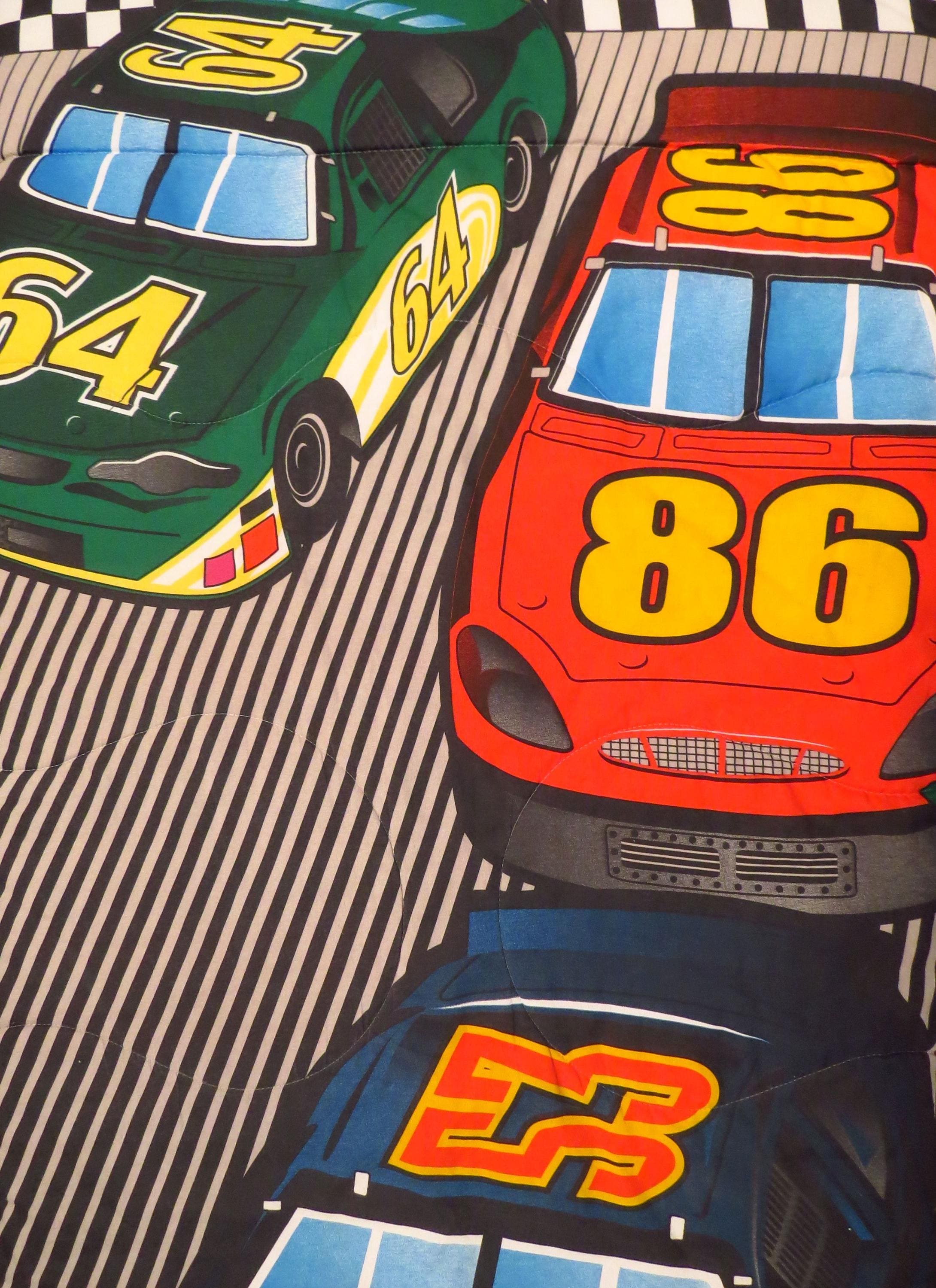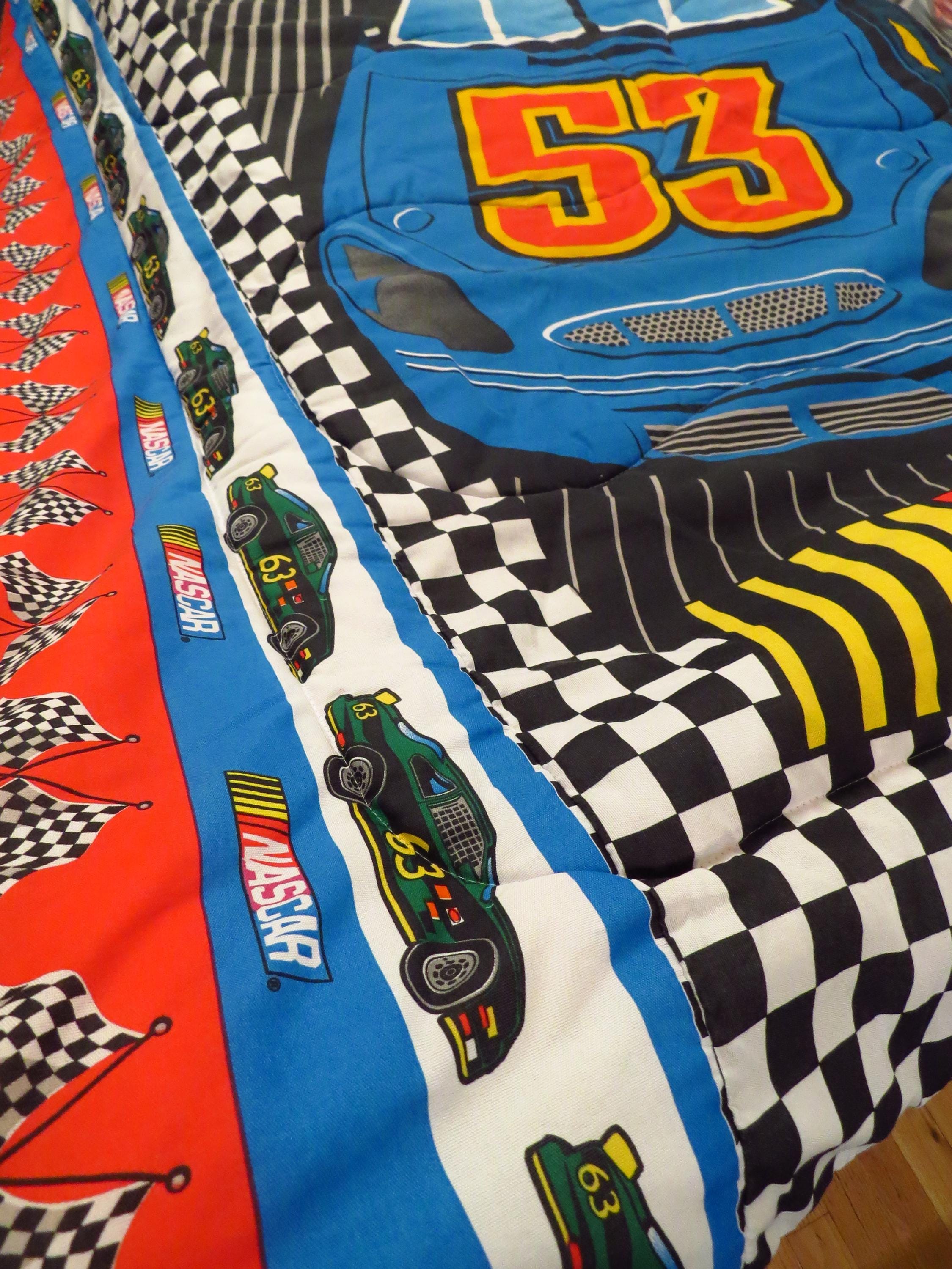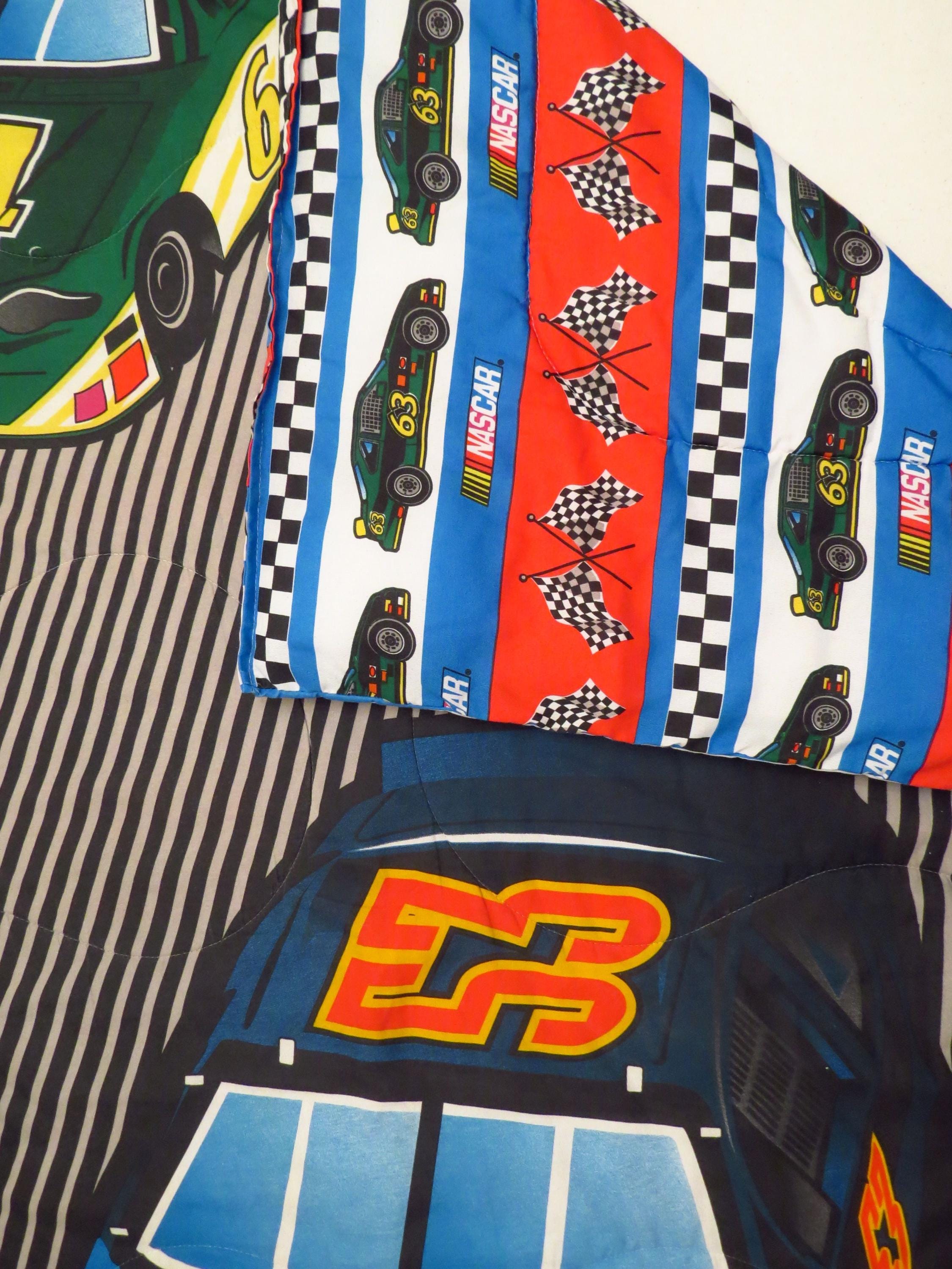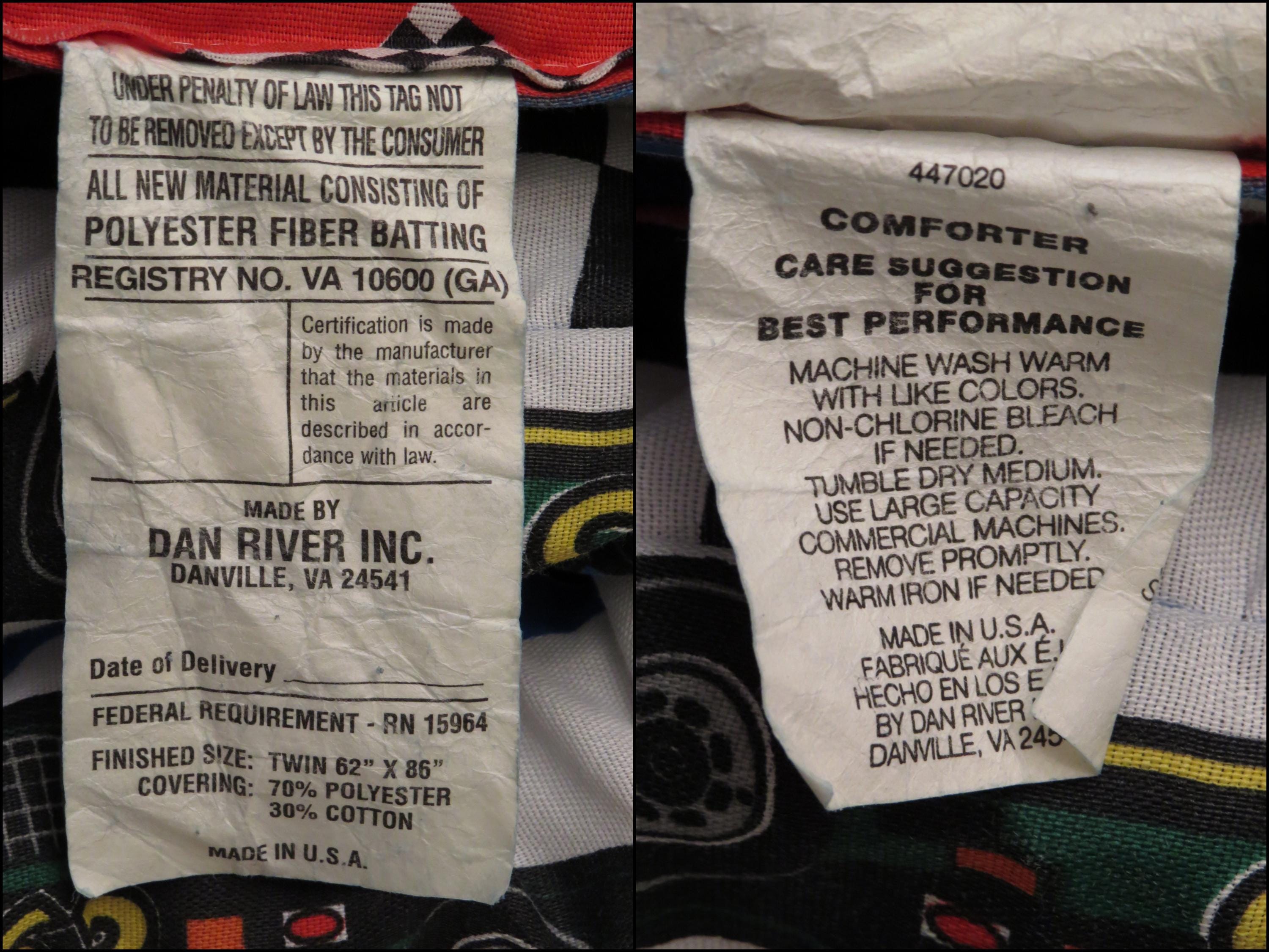 Vintage Nascar twin comforter which is 70% polyester and 30% cotton. The filling is 100% polyester, and has settled slightly unevenly in areas. It is pilling in areas, the darker colors are a little faded/worn, and it is worn along the edges/stitching. Some of the blue color has some streaky line marks, and some areas of red are a little darker.
