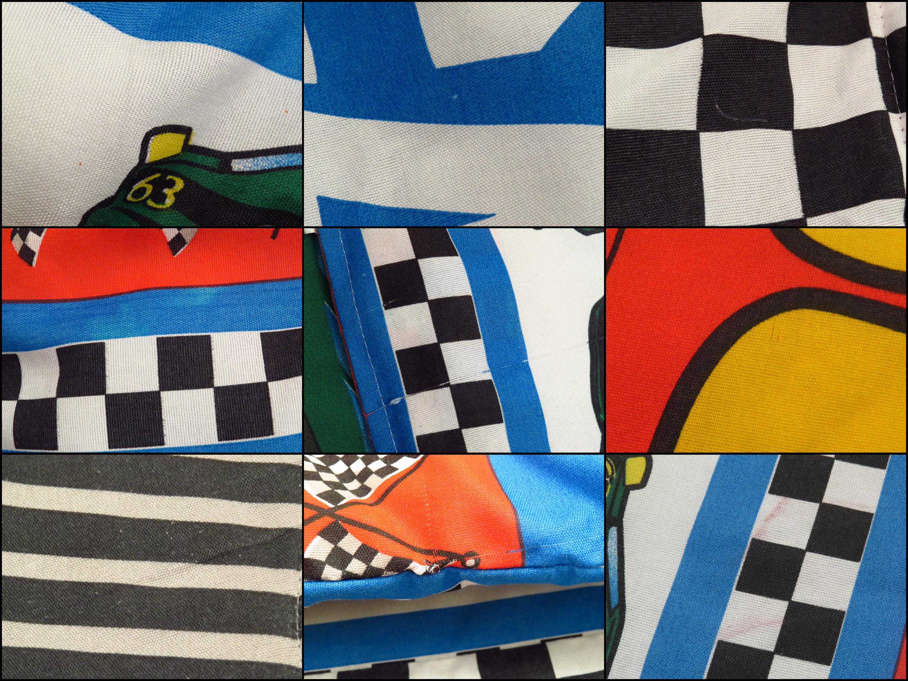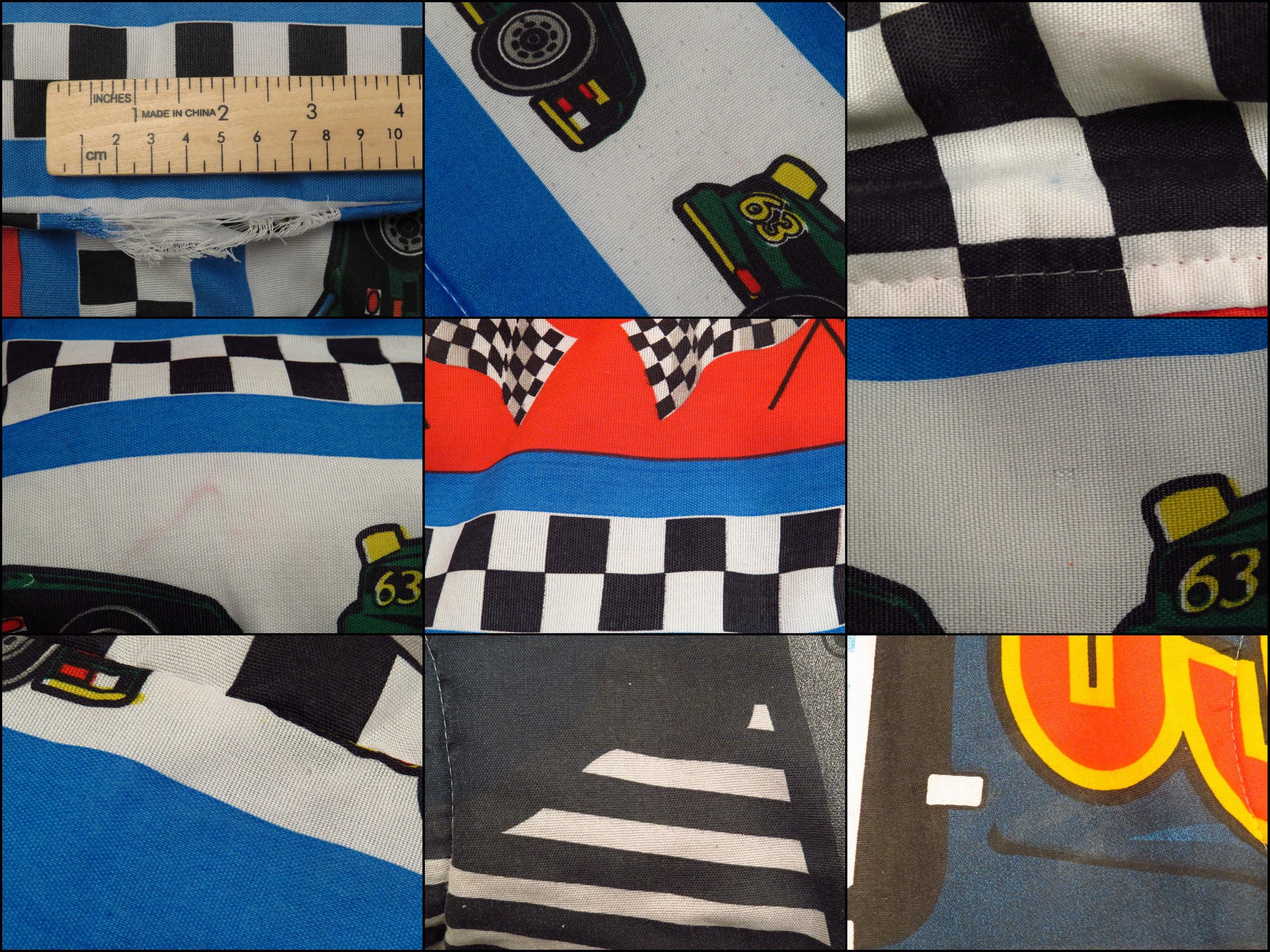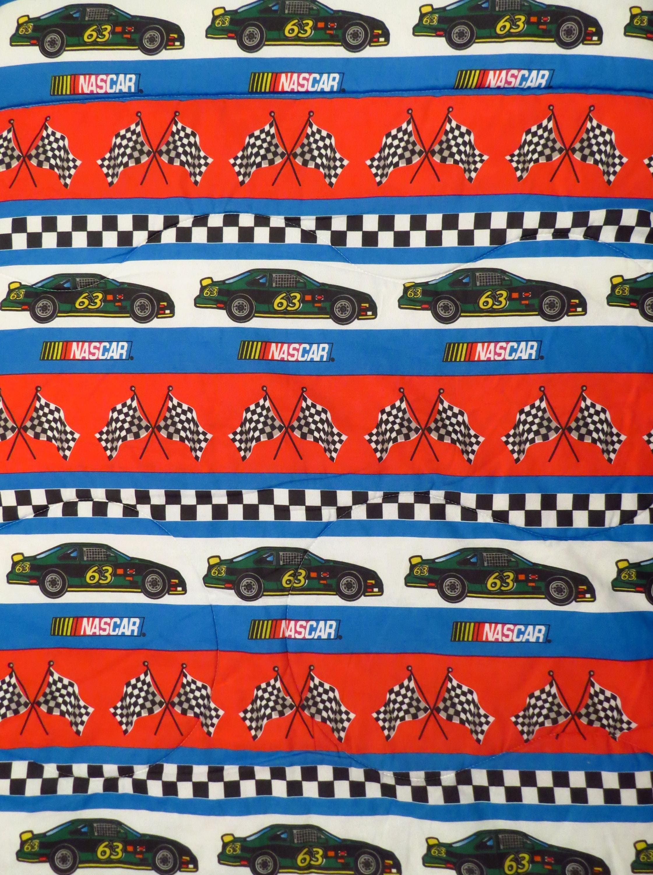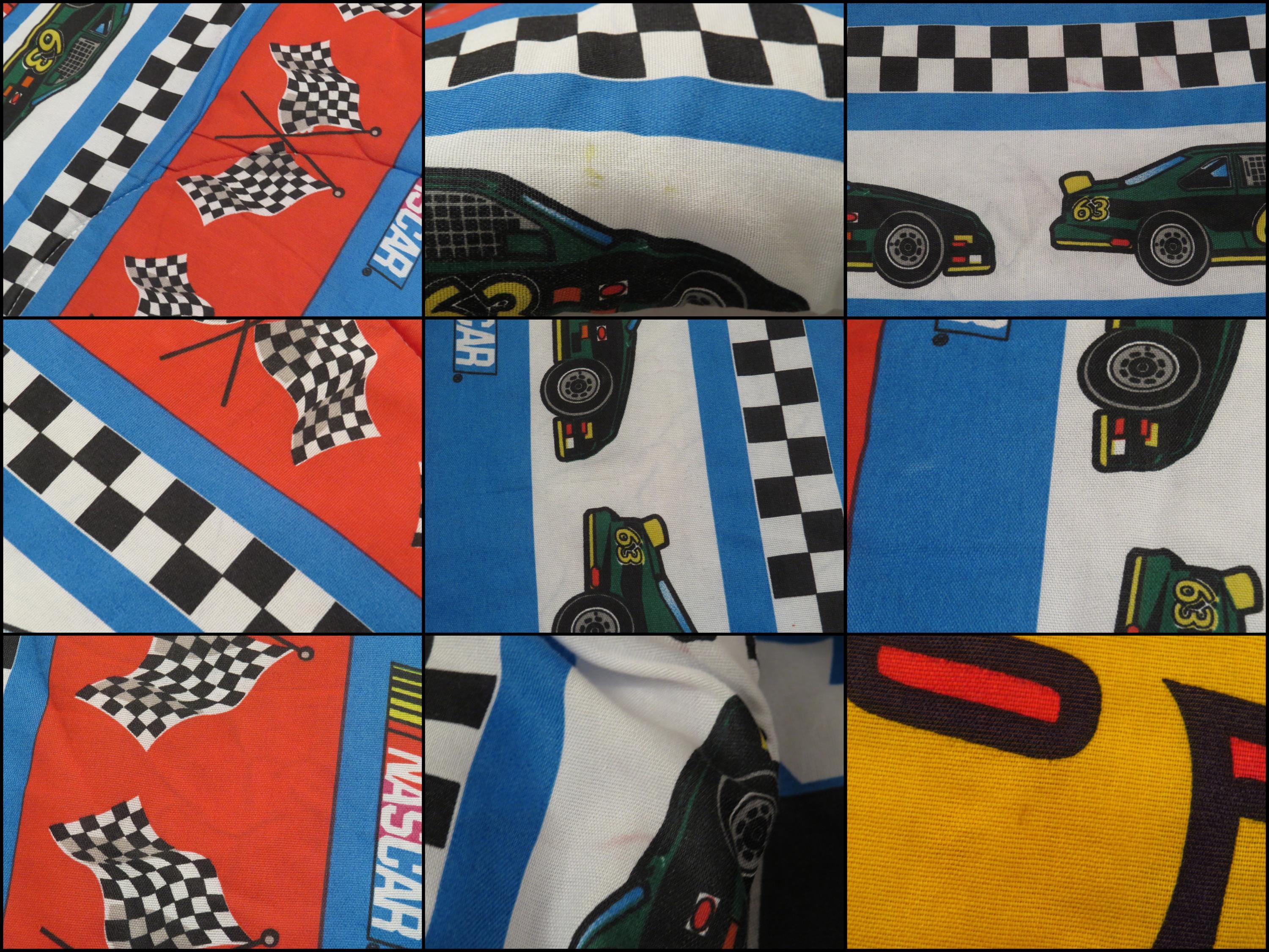Vintage Nascar twin comforter which is 70% polyester and 30% cotton. The filling is 100% polyester, and has settled slightly unevenly in areas. It is pilling in areas, the darker colors are a little faded/worn, and it is worn along the edges/stitching. Some of the blue color has some streaky line marks, and some areas of red are a little darker.