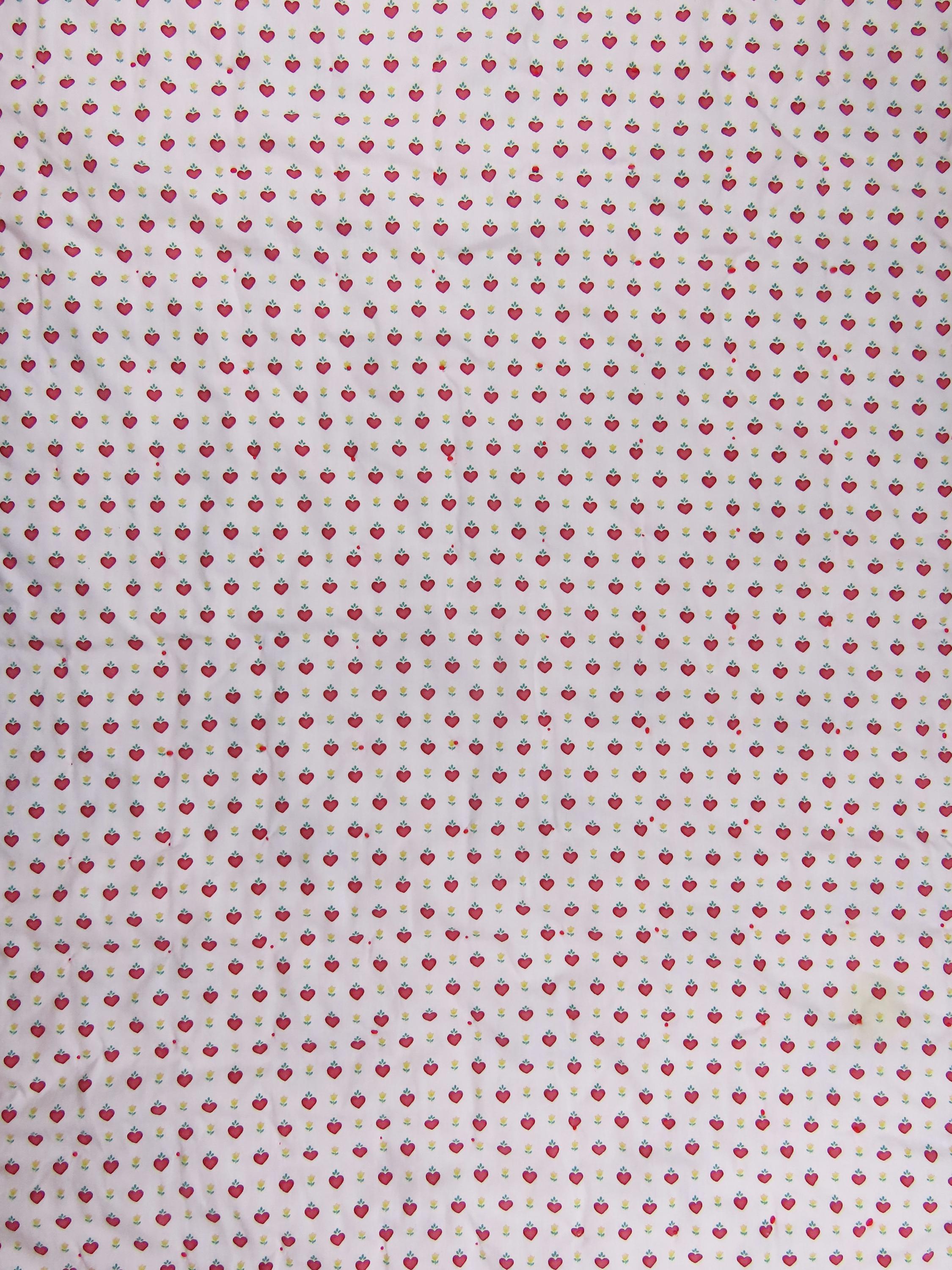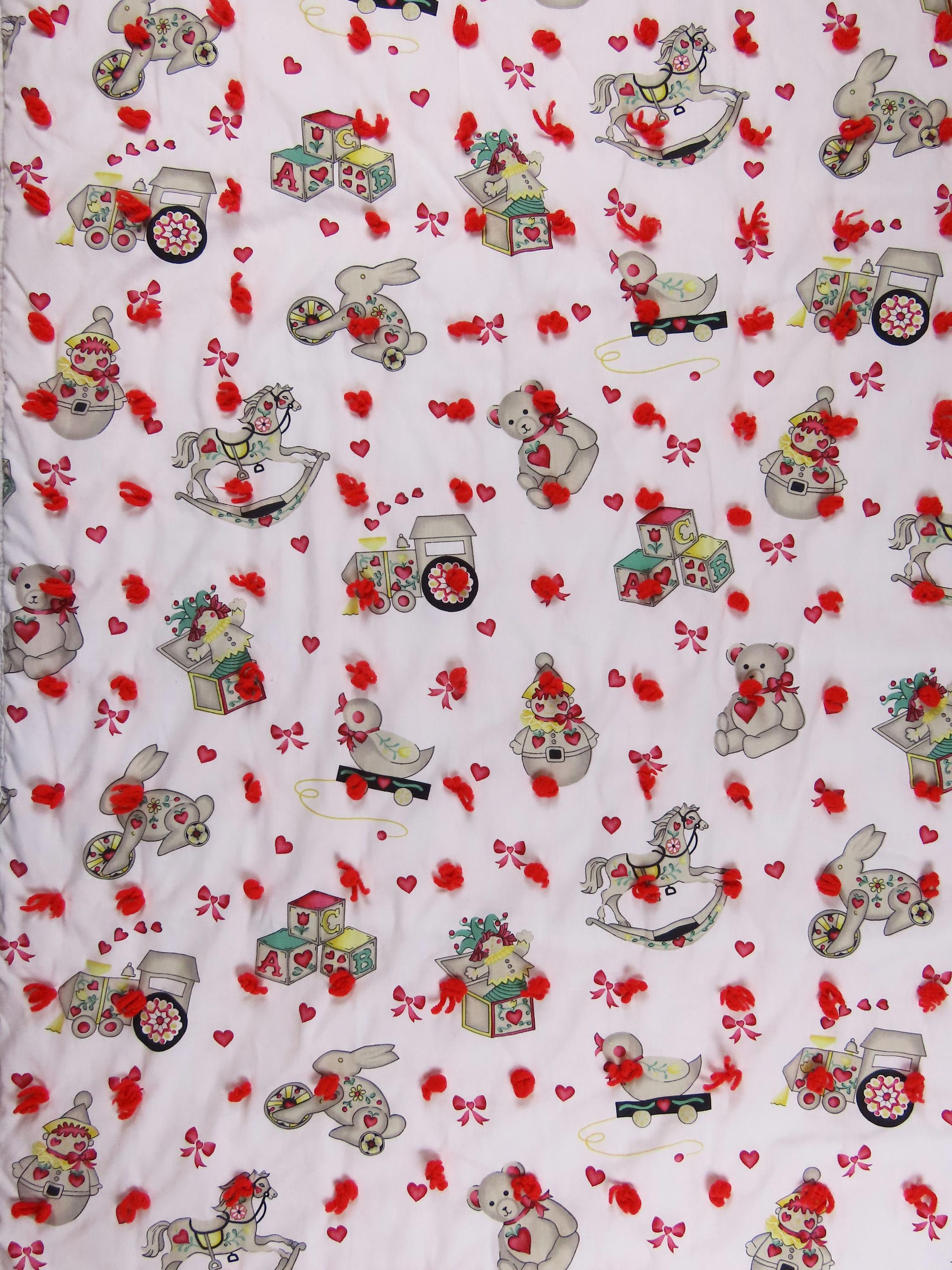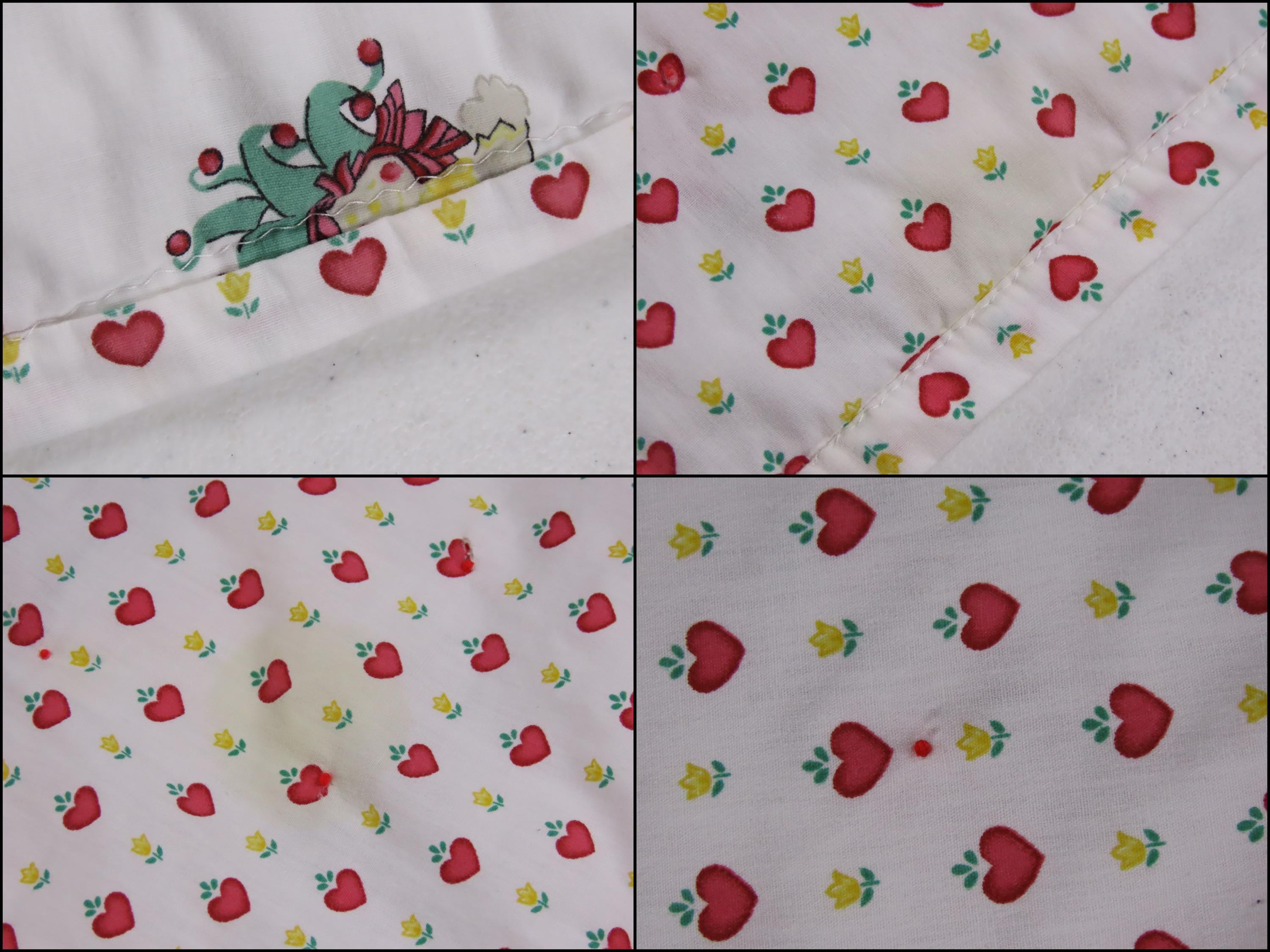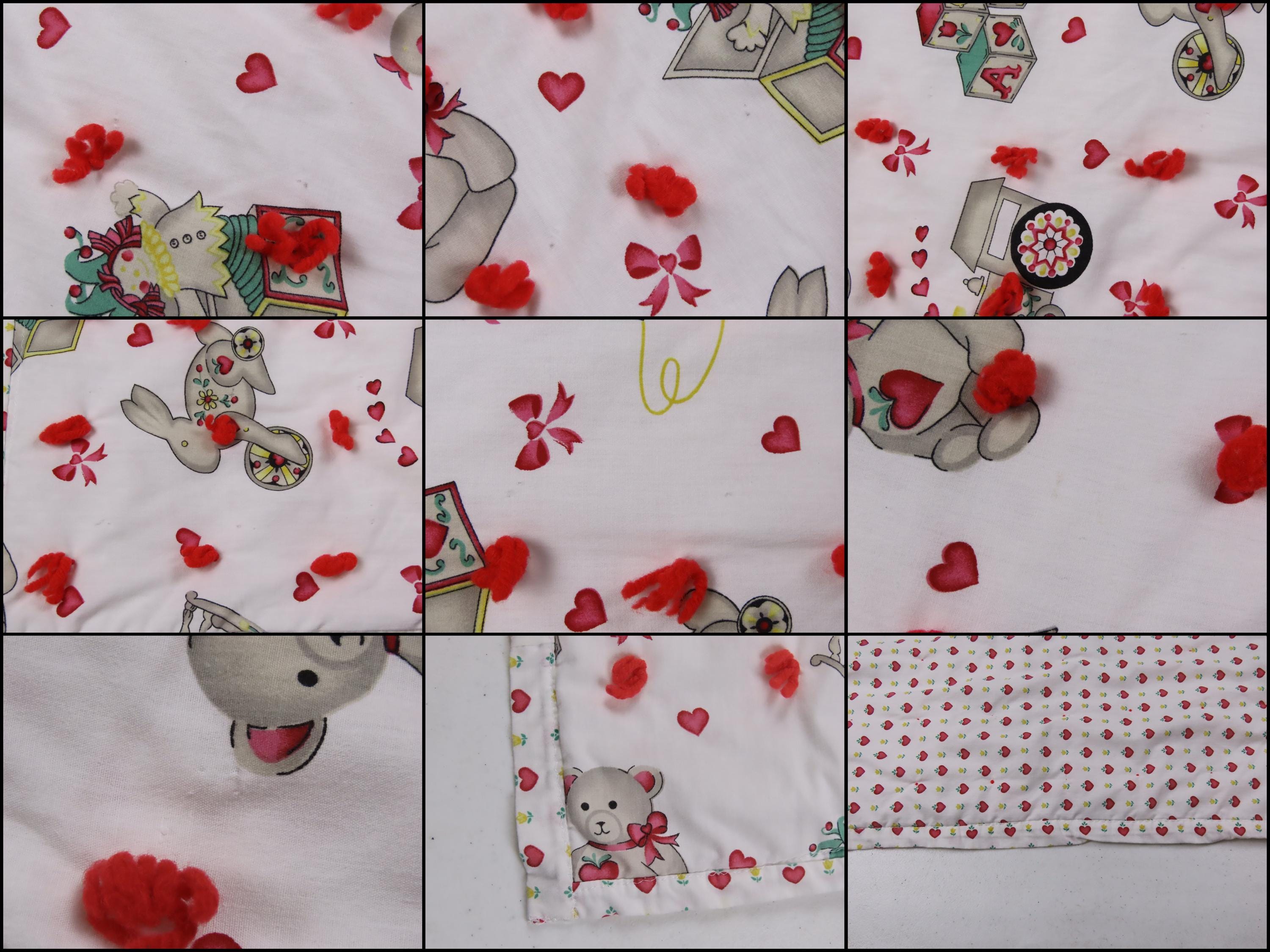 Vintage Teddy Bear and hearts small blanket which is about 47" tall by 44.5" wide (120 cm by 113 cm). It has red yarn ties throughout which are fraying/matted. It is sewn a little unevenly along the edges. It has thread snags, a small stain, and multiple tiny holes possibly from whoever making it changing their mind where to put the yarn ties (mostly on right side of blanket). There are a few large yellowish stains on the backside.