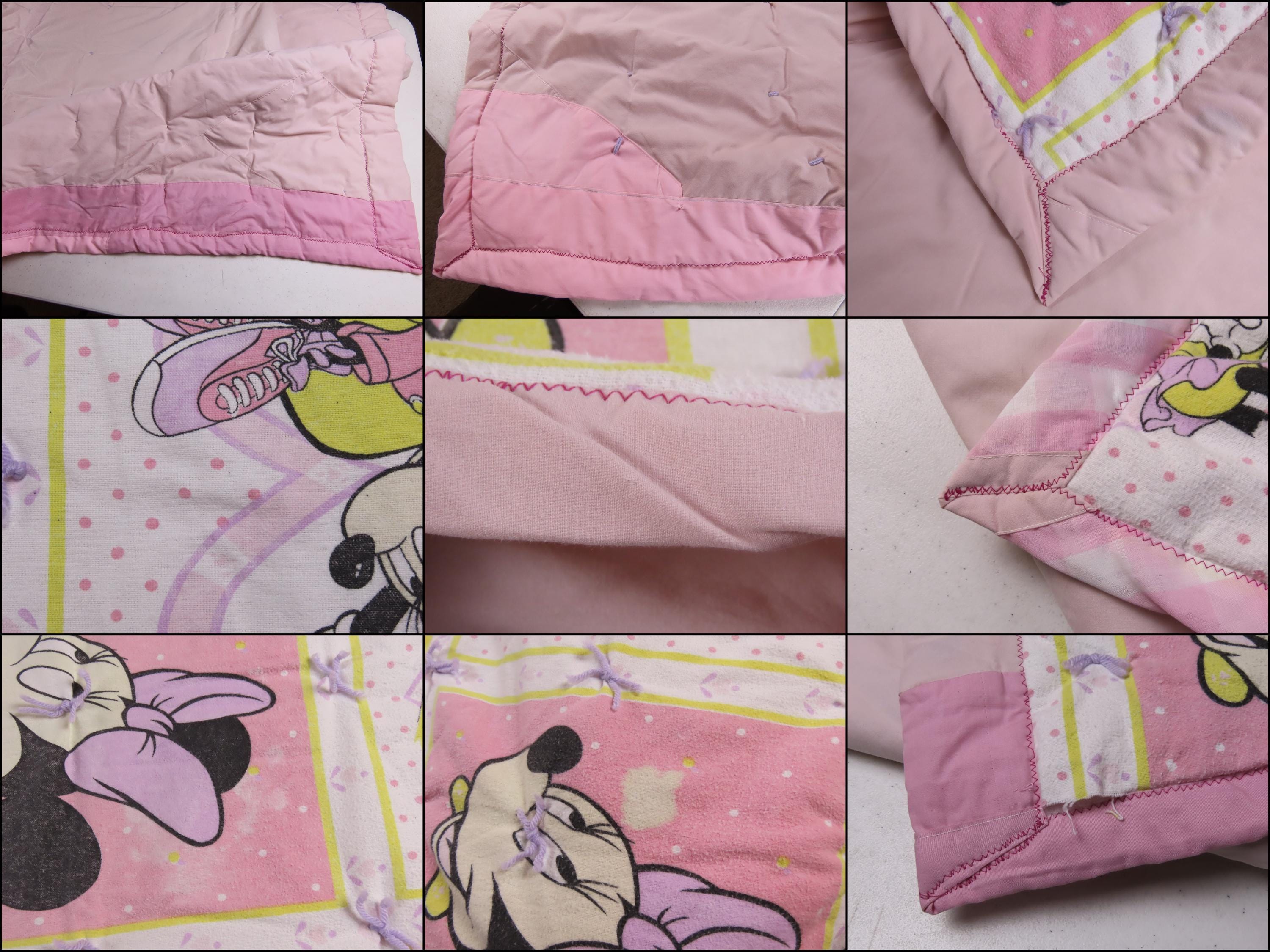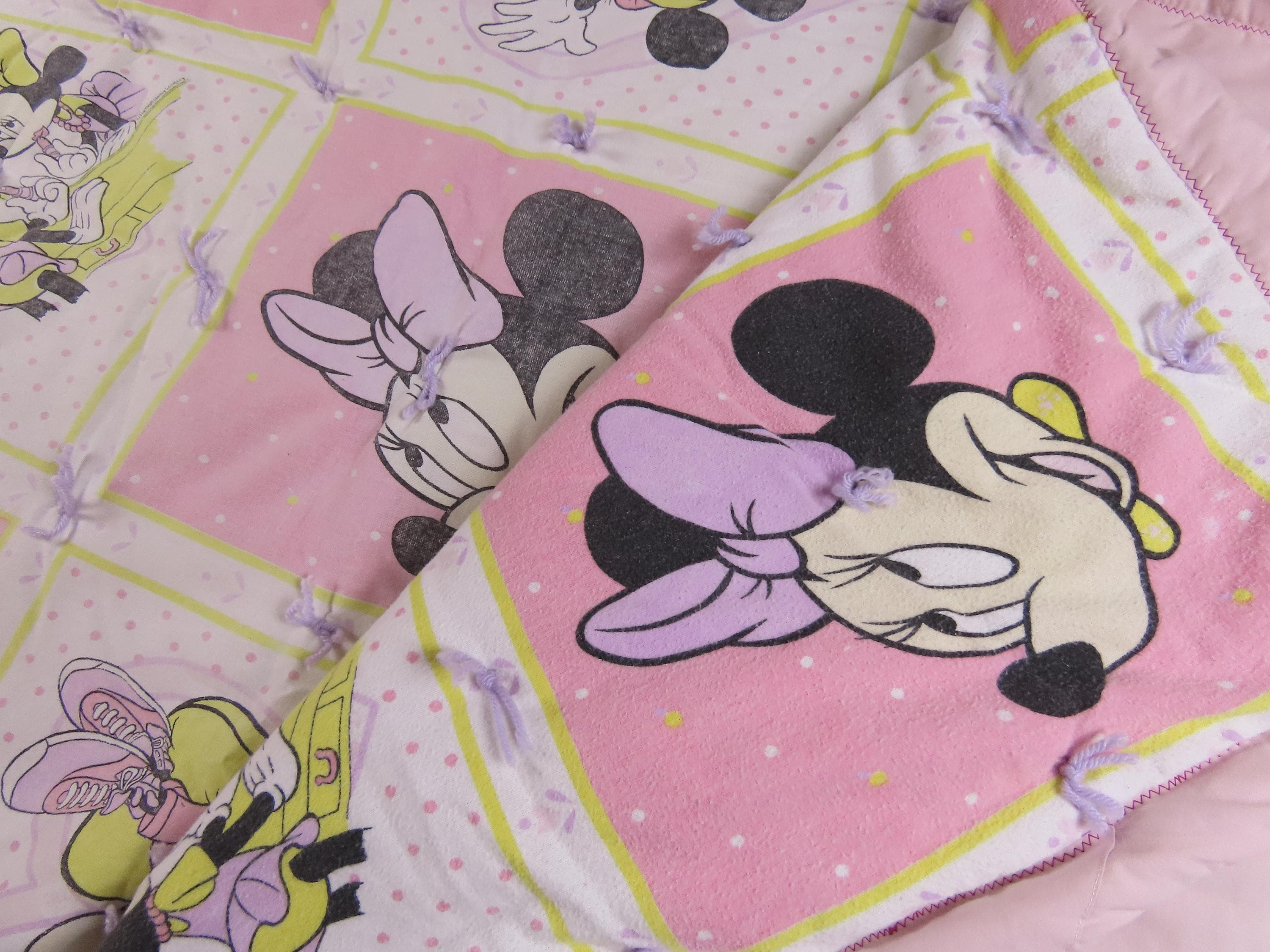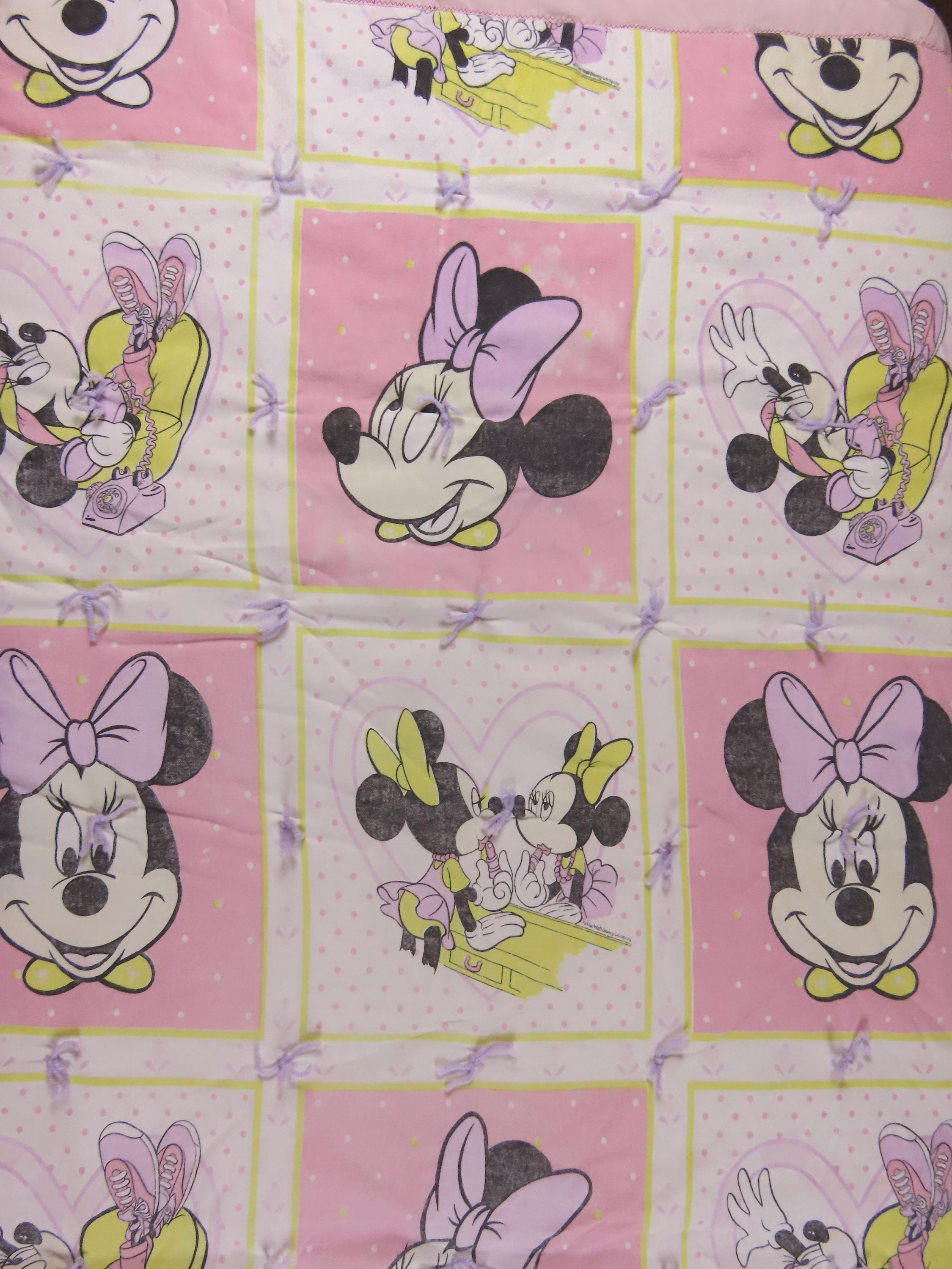 Vintage Minnie Mouse blanket which is about 77" tall by 56" wide (195 cm by 142 cm). It is close to the size of a twin size comforter, but it is a little smaller. It looks like someone made the blanket from a flannel Minnie Mouse bed sheet. It is sewn a little unevenly, and the backside/binding are pieced together from different fabrics. The colors are very faded/streaky in areas, and it is pilling.