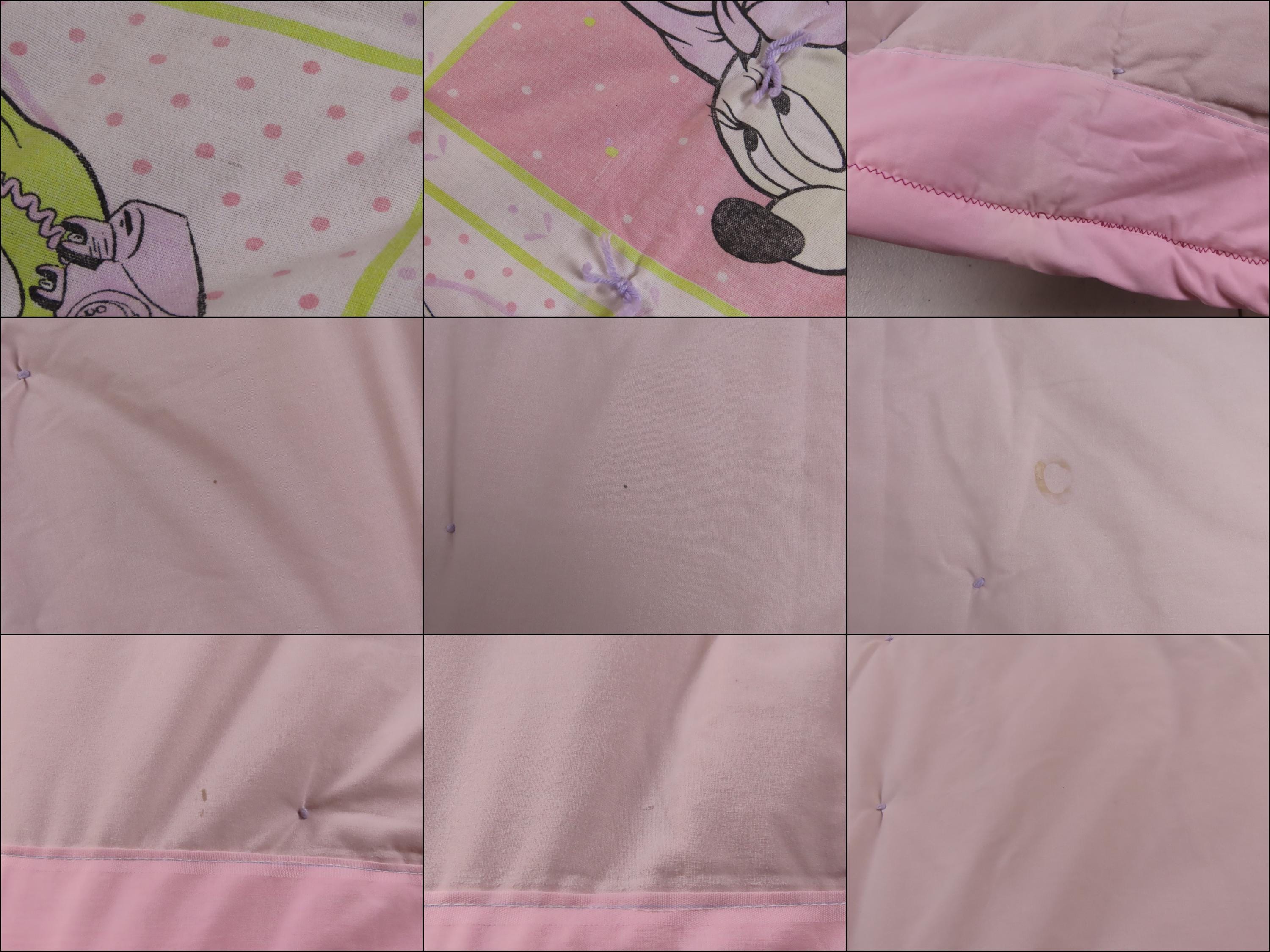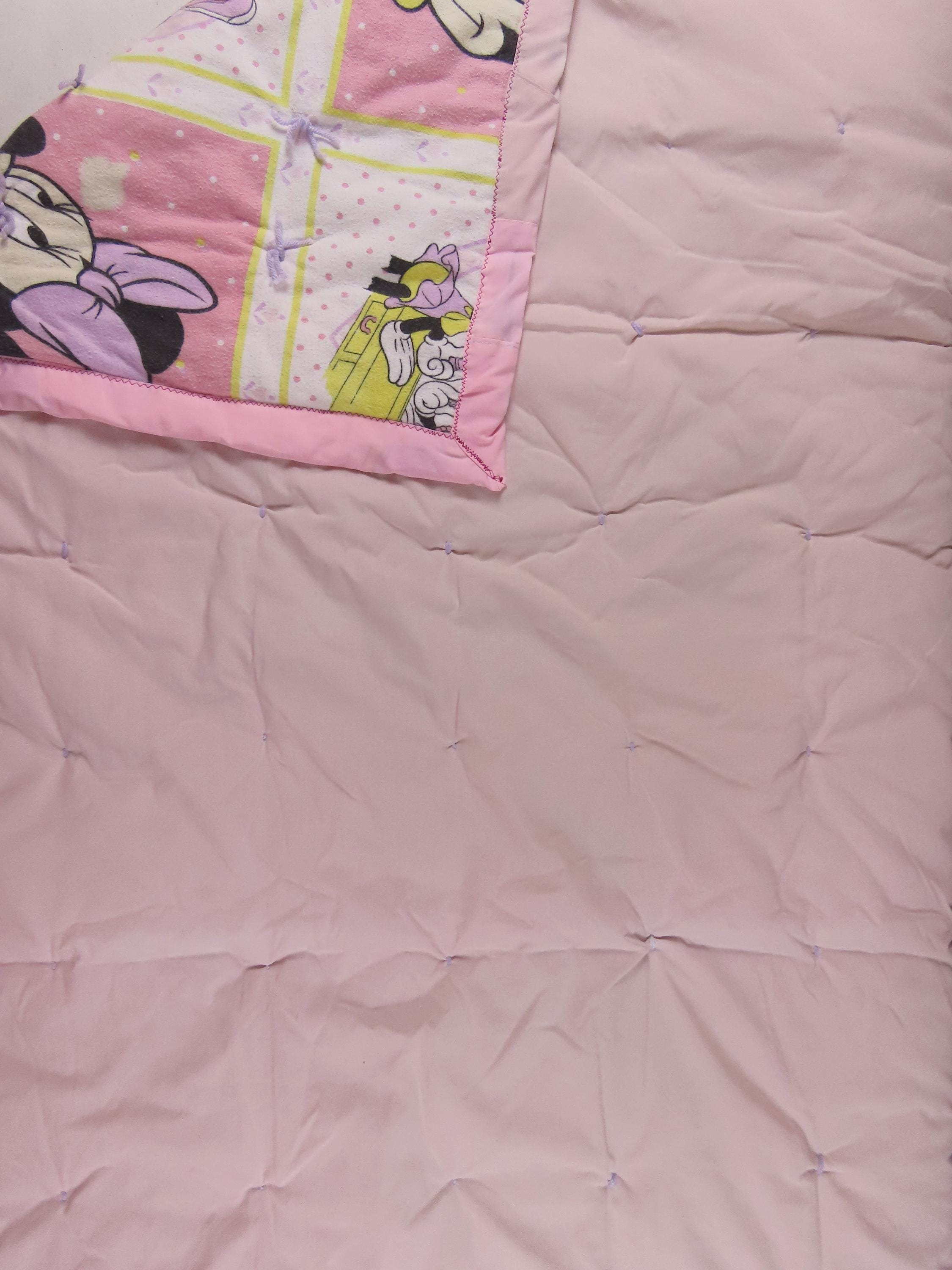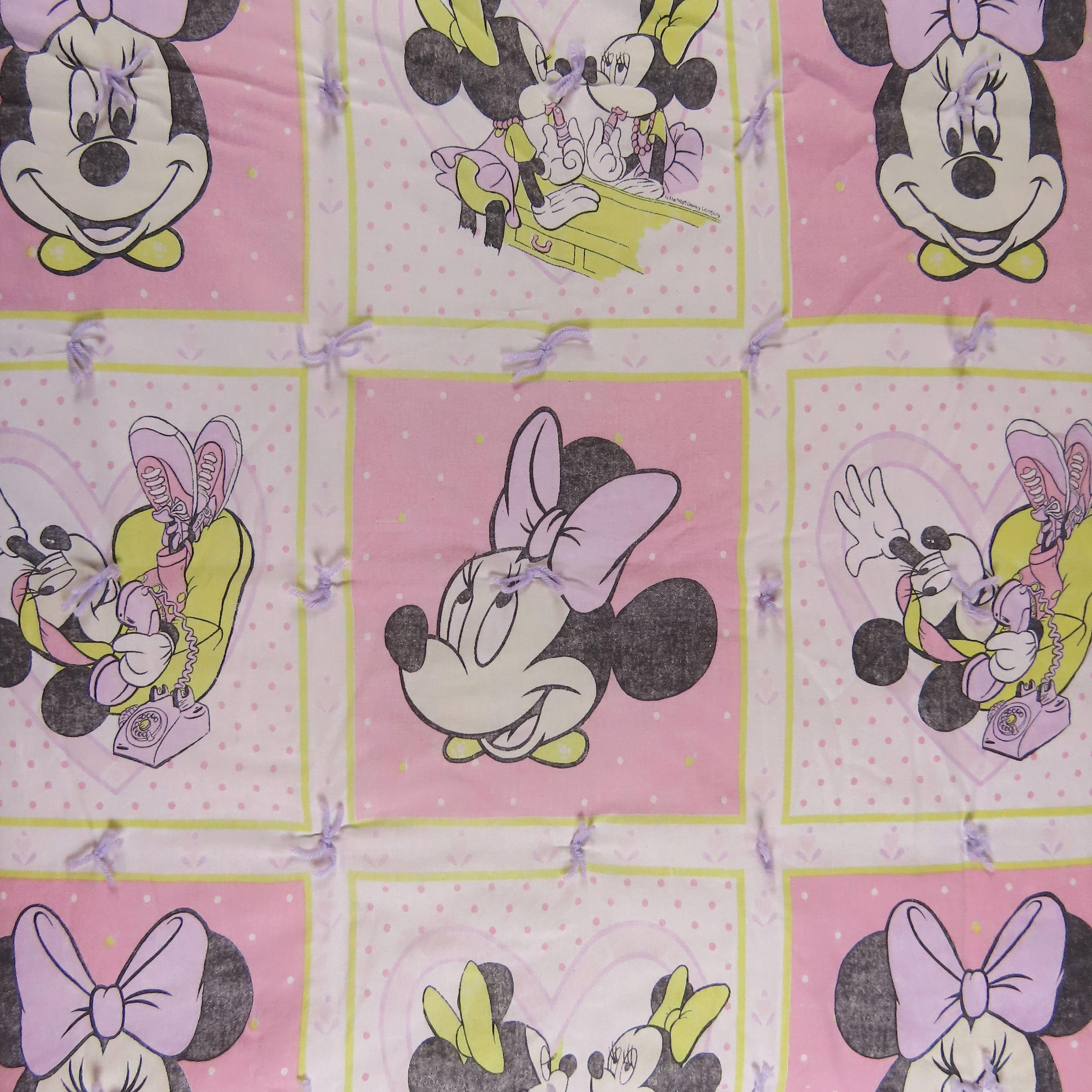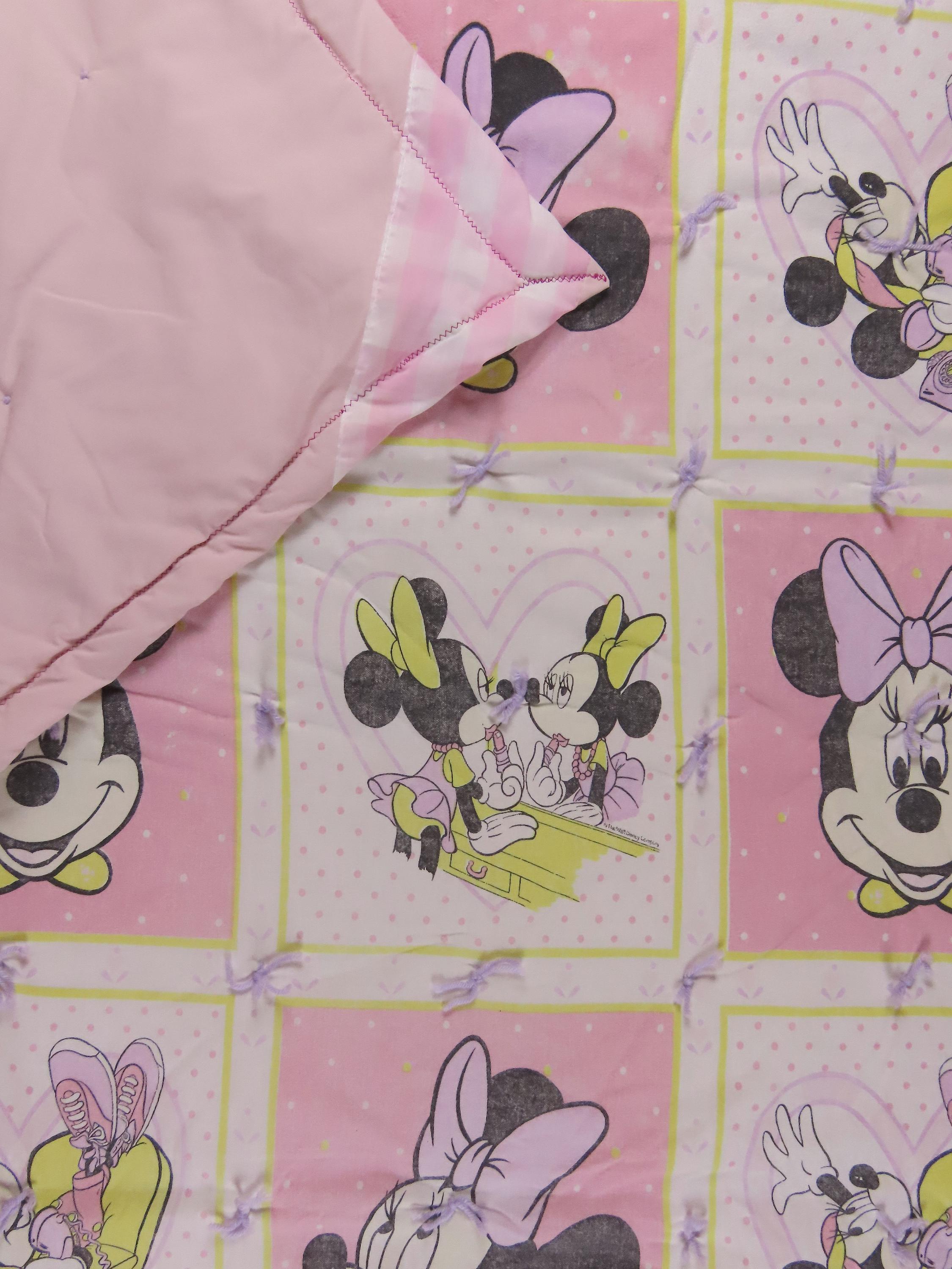 Vintage Minnie Mouse blanket which is about 77" tall by 56" wide (195 cm by 142 cm). It is close to the size of a twin size comforter, but it is a little smaller. It looks like someone made the blanket from a flannel Minnie Mouse bed sheet. It is sewn a little unevenly, and the backside/binding are pieced together from different fabrics. The colors are very faded/streaky in areas, and it is pilling.