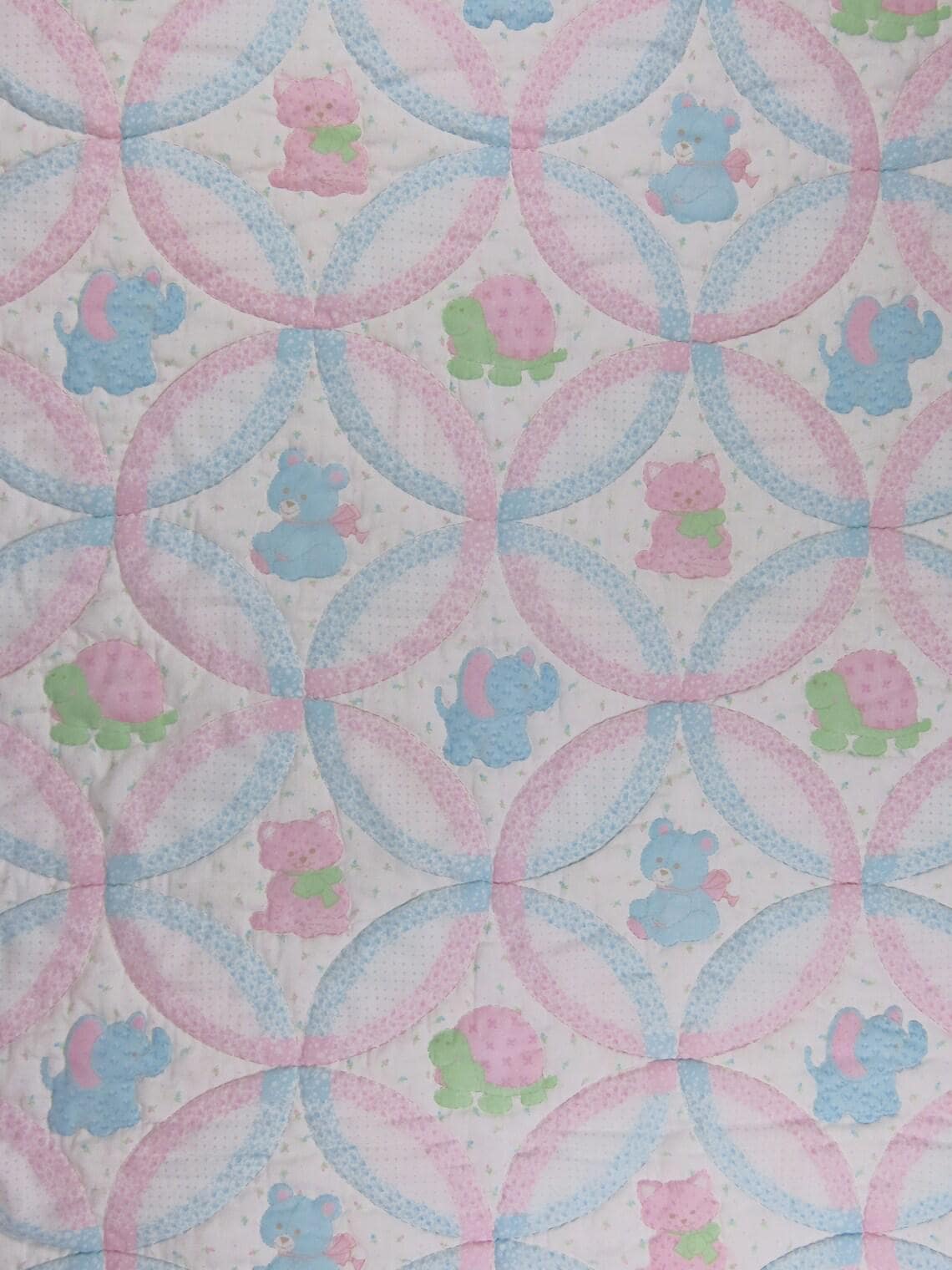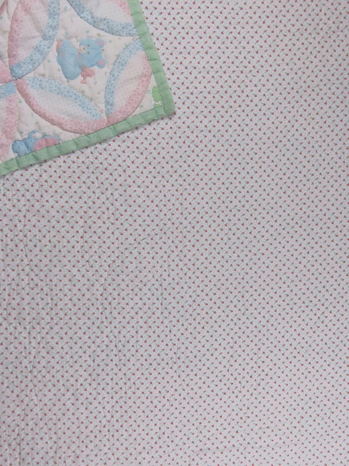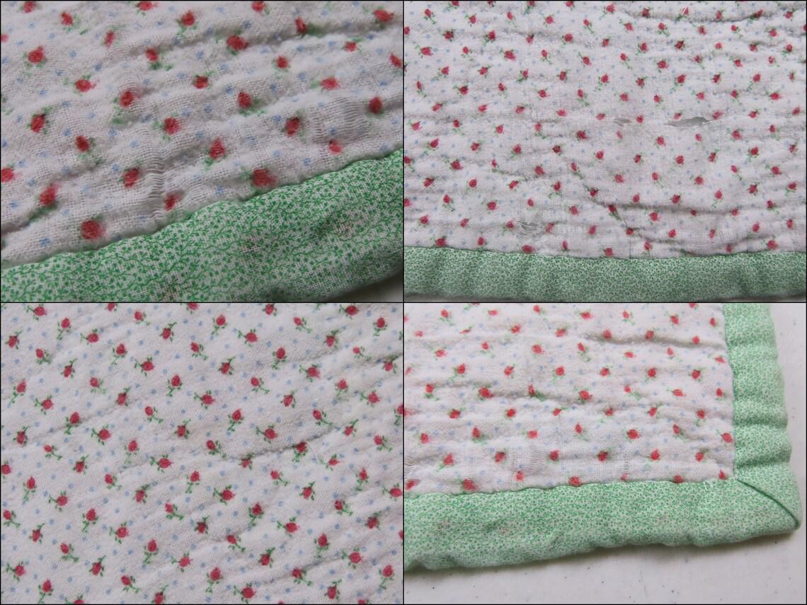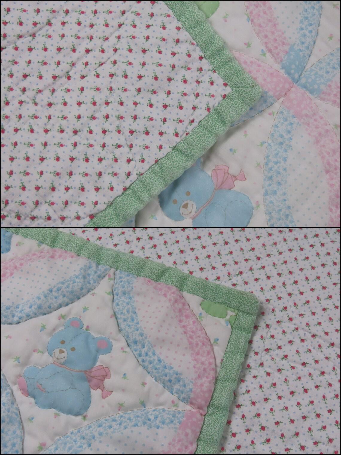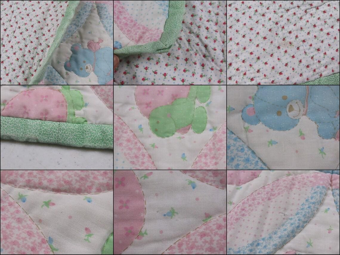 Vintage teddy bear small quilted blanket. It is about 55" tall by 44 wide (142 cm by 113 cm). My camera had a hard time picking up the exact colors. It is worn along the edges. There are missing thread spots, thread snags, and tiny marks. It has a few tiny holes and a small hole. The backside is a flannel fabric, and it has light pilling. The backside has thin spots, small holes, and thin spots trying to form holes. It also has a small stain, and a few light yellowish stains on the back.