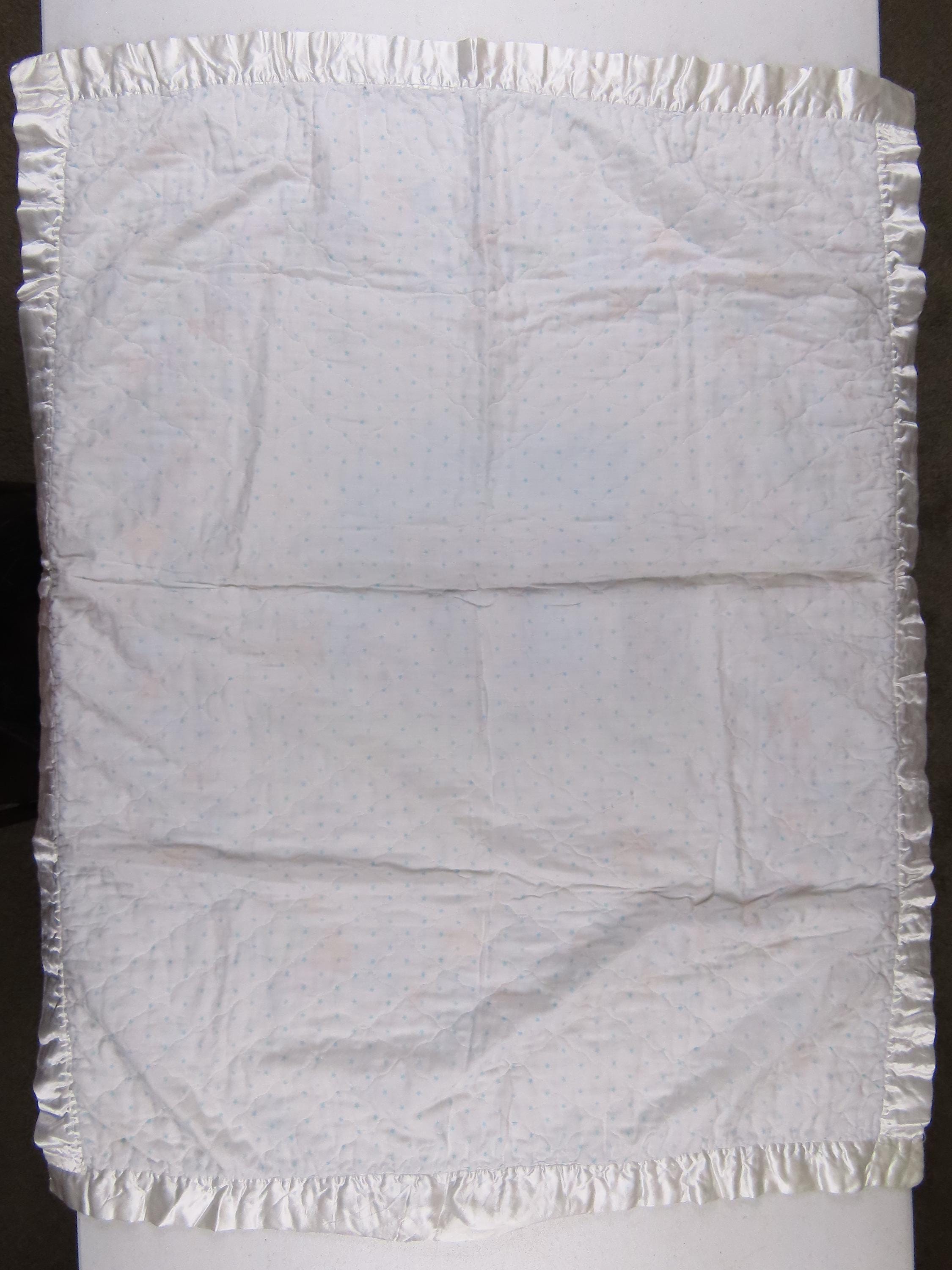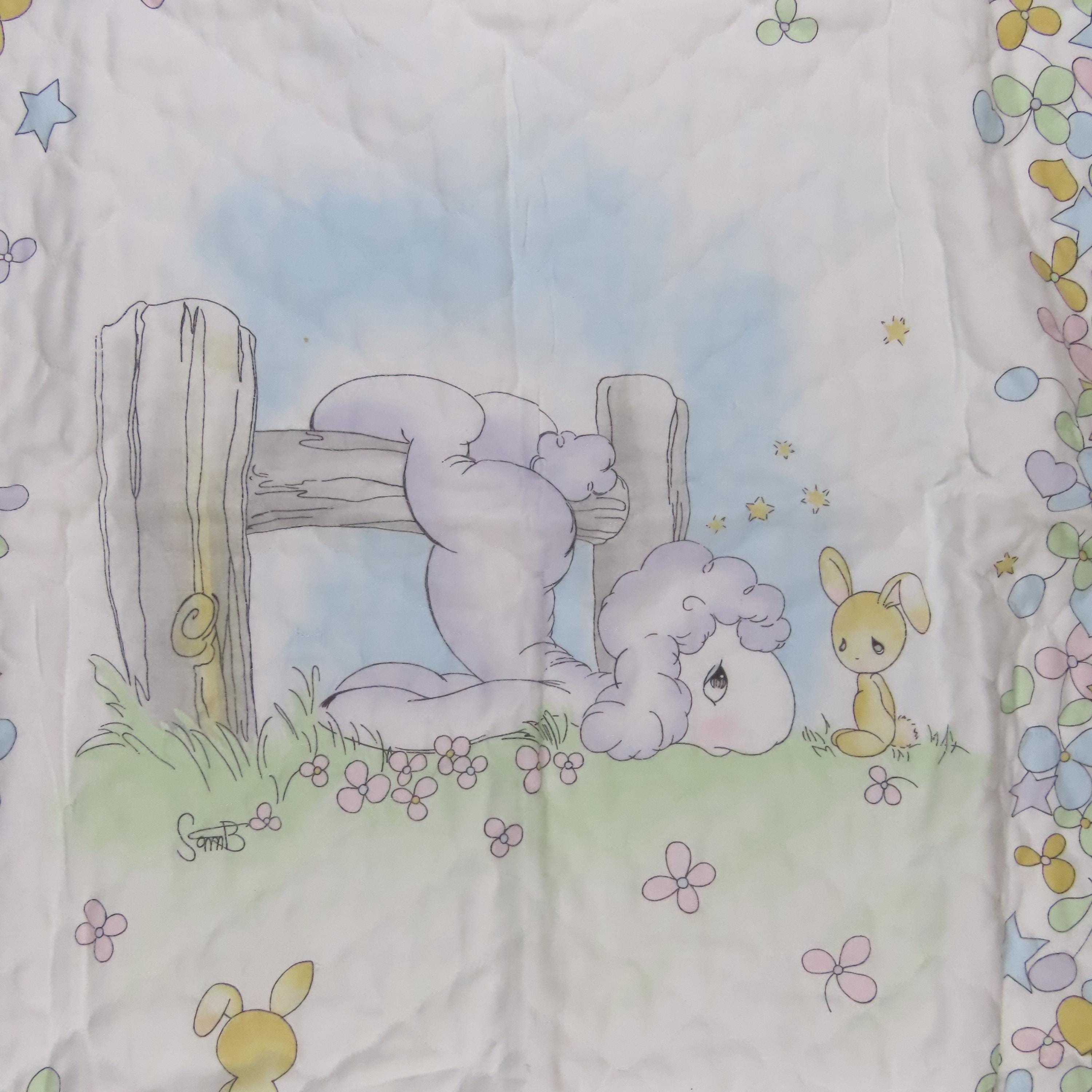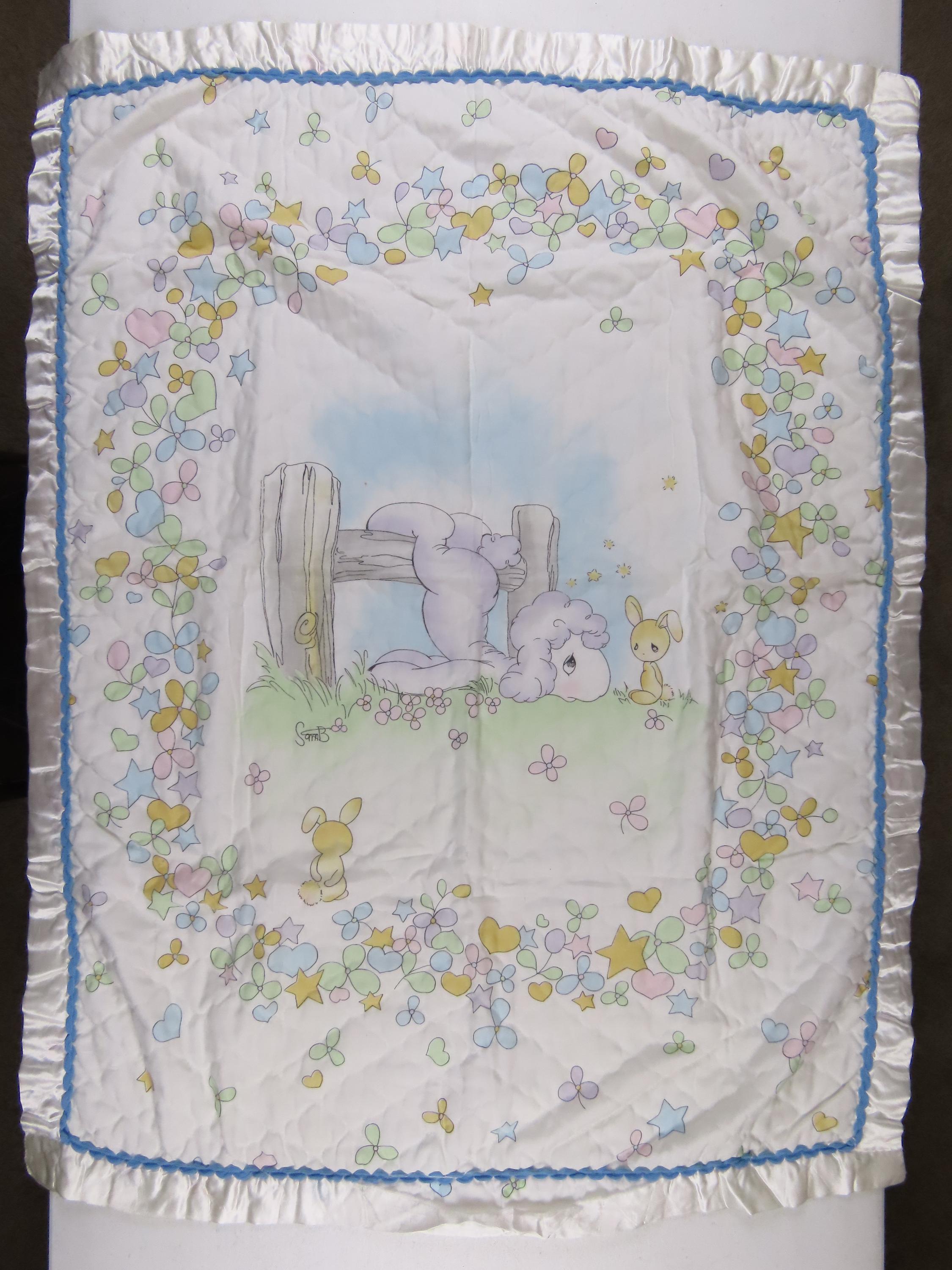 Vintage Precious Moments small quilted blanket which is about 43.5" tall by 34" wide (110 cm by 87 cm). It is sewn a little unevenly, and some of the quilted stitching is undone in areas with loose threads. The fabric pools up in areas, and bunches up along the stitching (it does not want to lay completely flat). It has a couple of line marks, a few tiny stains, and a small stain. There are thread snags, and extremely light pilling in areas. The ribbon edge/binding is undone along the bottom edge for about 11 inches. The ribbon edge has thin spots, missing thread spots, and thin spots trying to form holes.