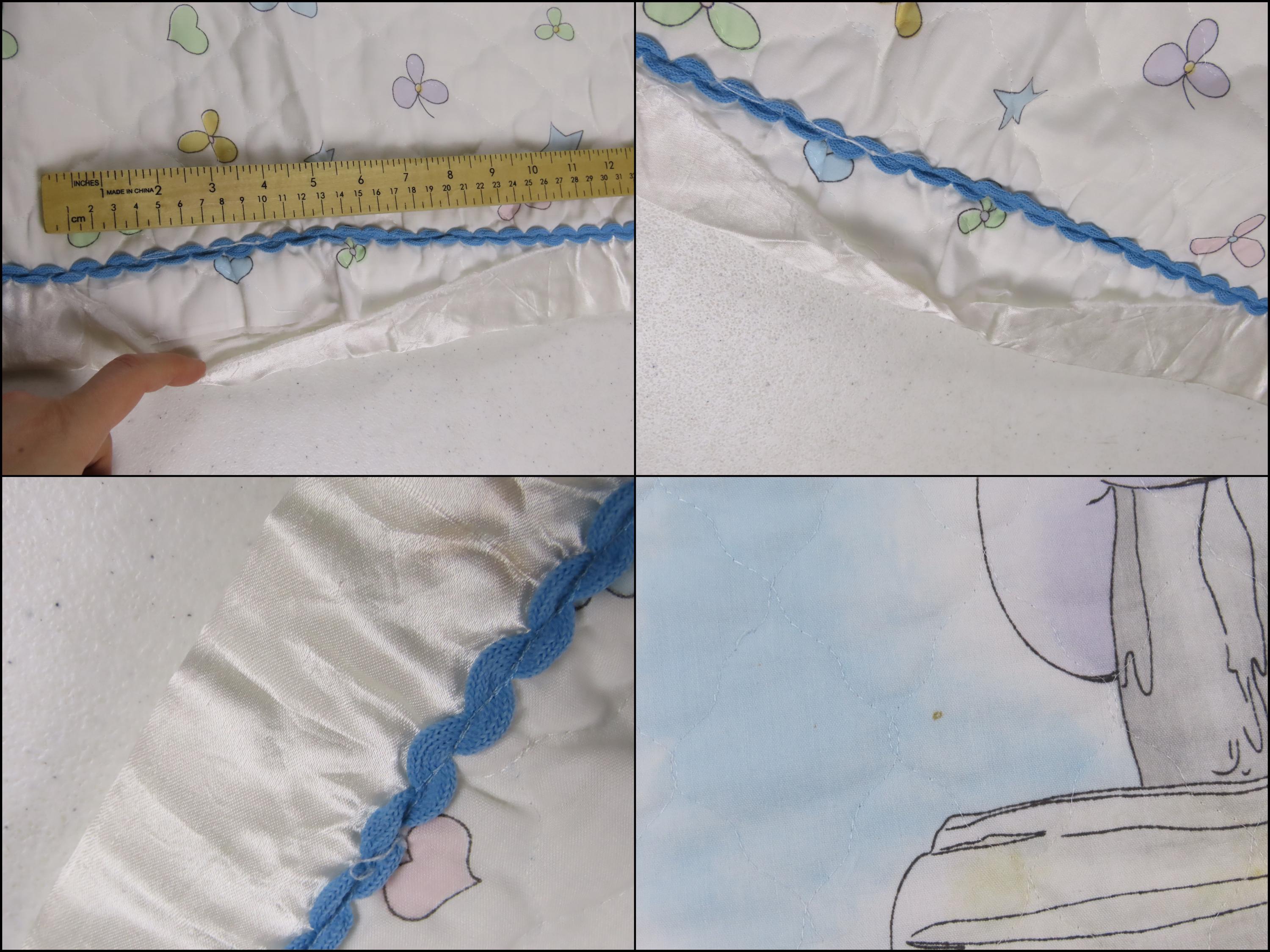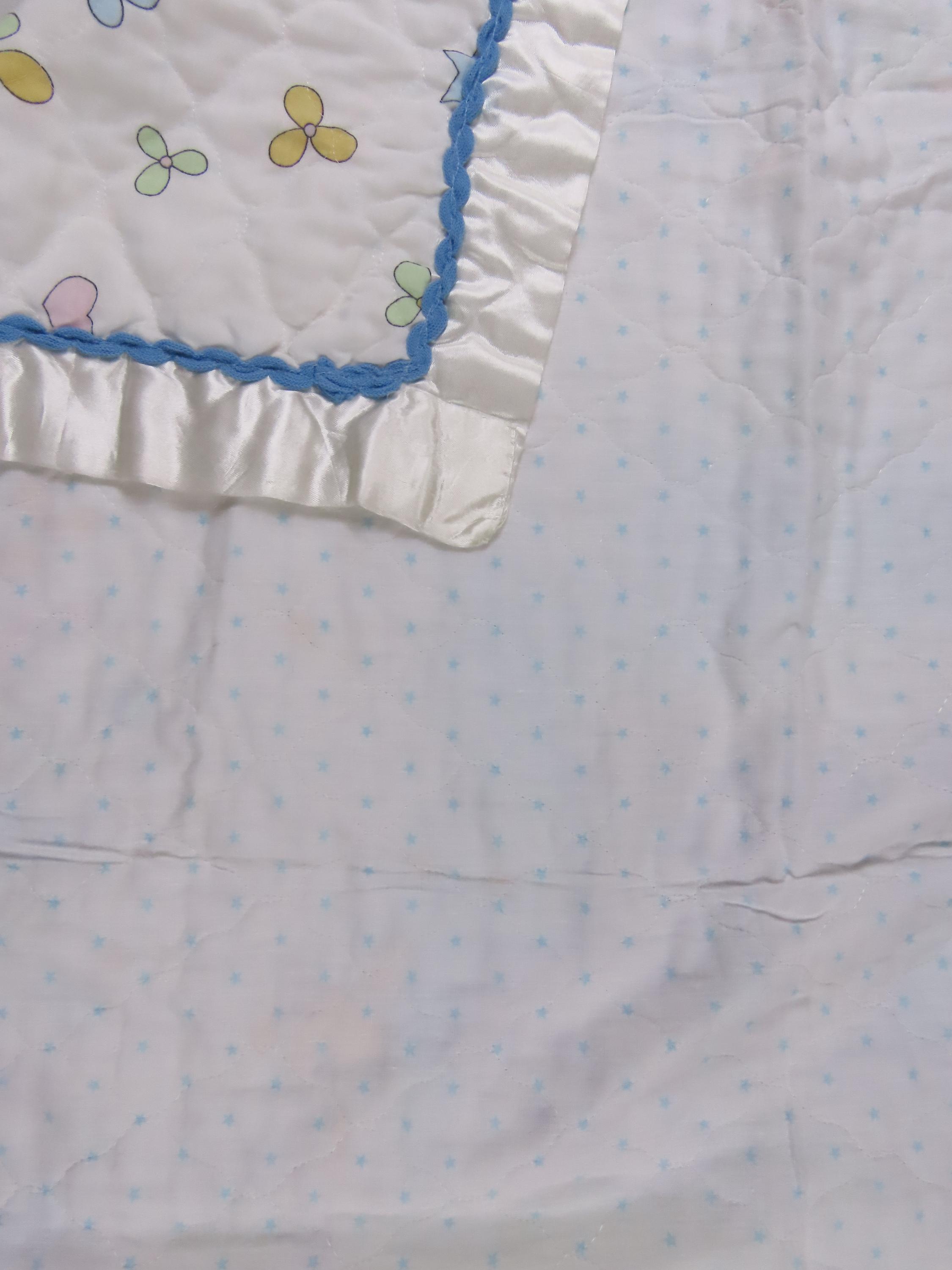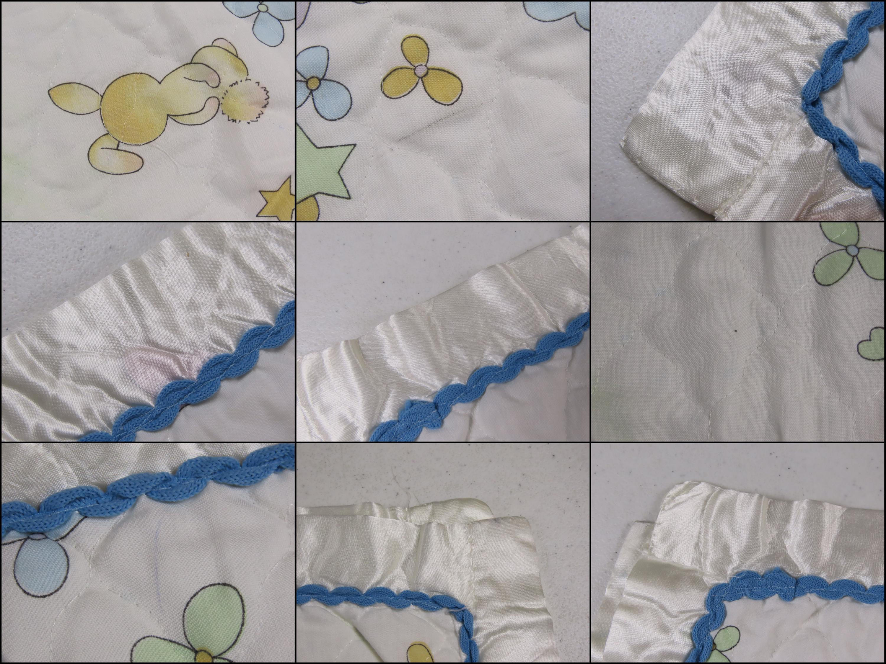 Vintage Precious Moments small quilted blanket which is about 43.5" tall by 34" wide (110 cm by 87 cm). It is sewn a little unevenly, and some of the quilted stitching is undone in areas with loose threads. The fabric pools up in areas, and bunches up along the stitching (it does not want to lay completely flat). It has a couple of line marks, a few tiny stains, and a small stain. There are thread snags, and extremely light pilling in areas. The ribbon edge/binding is undone along the bottom edge for about 11 inches. The ribbon edge has thin spots, missing thread spots, and thin spots trying to form holes.