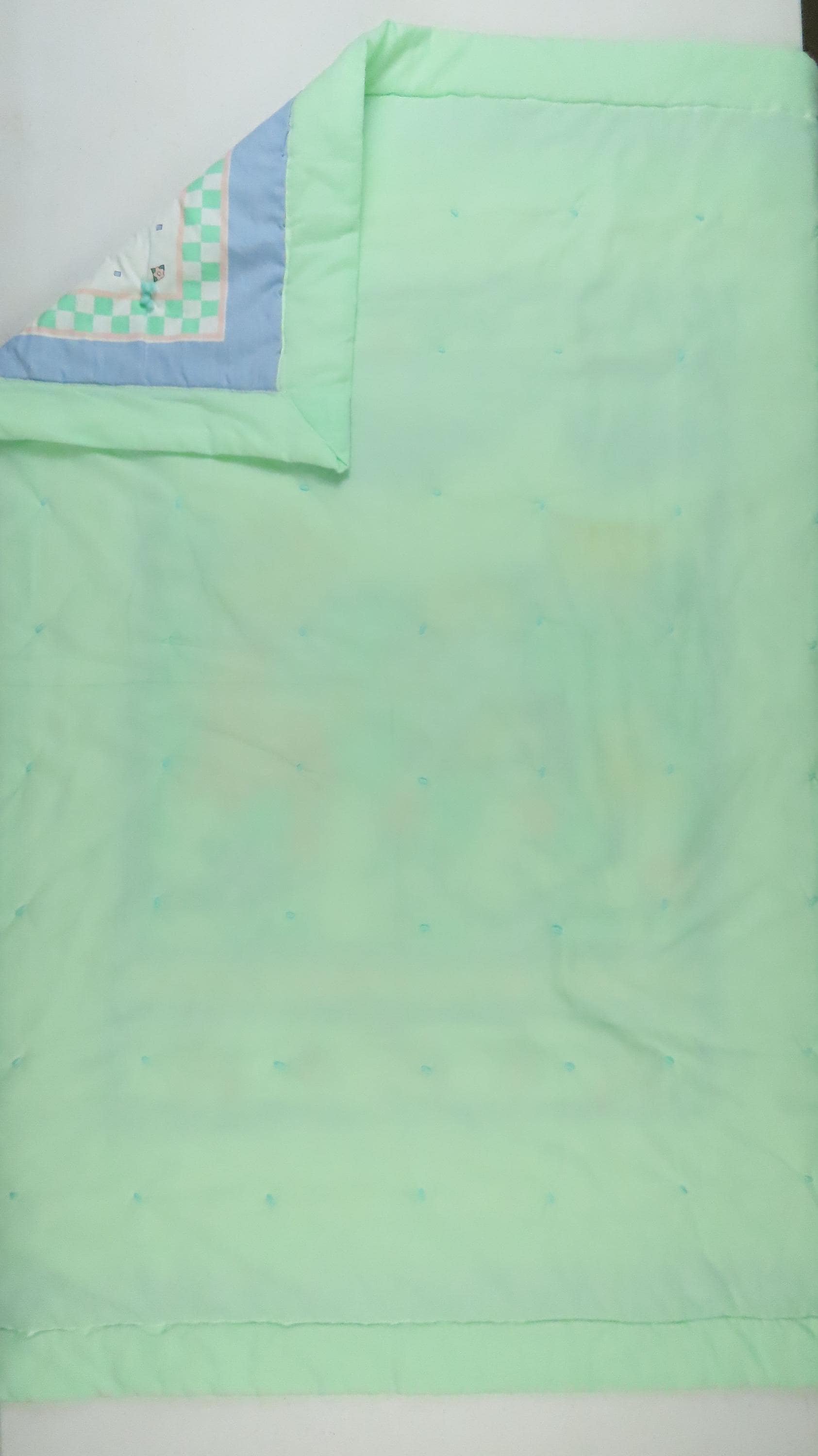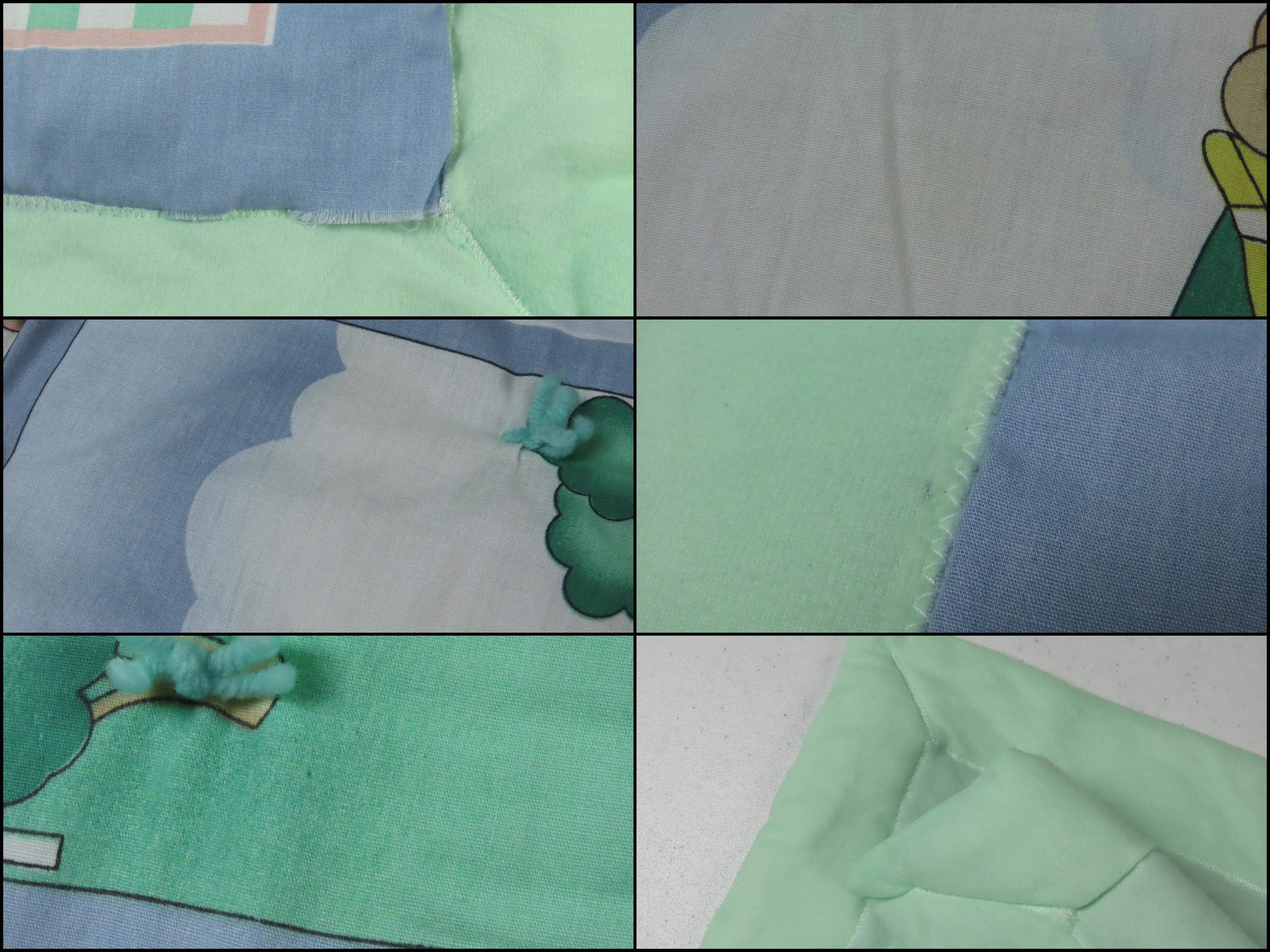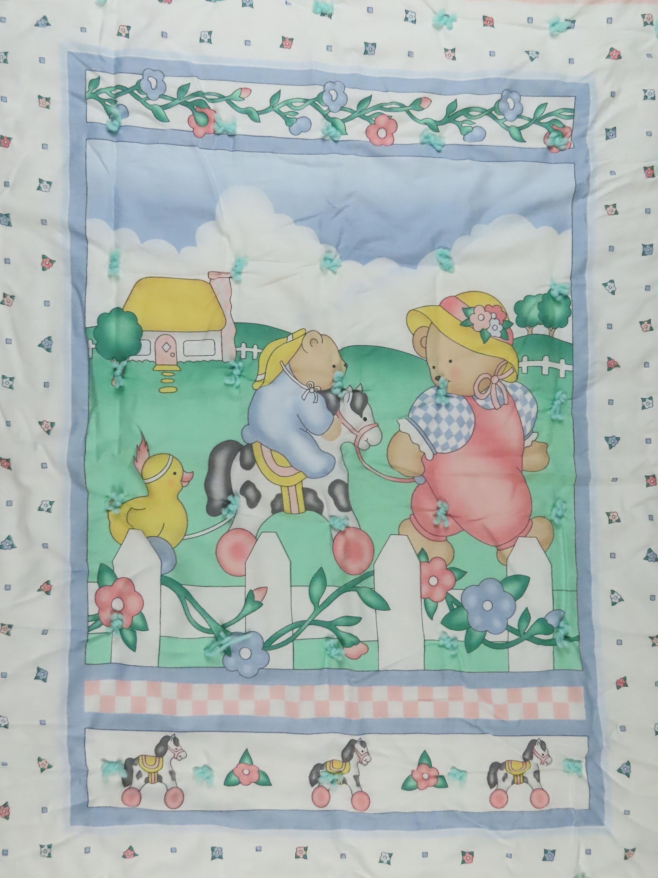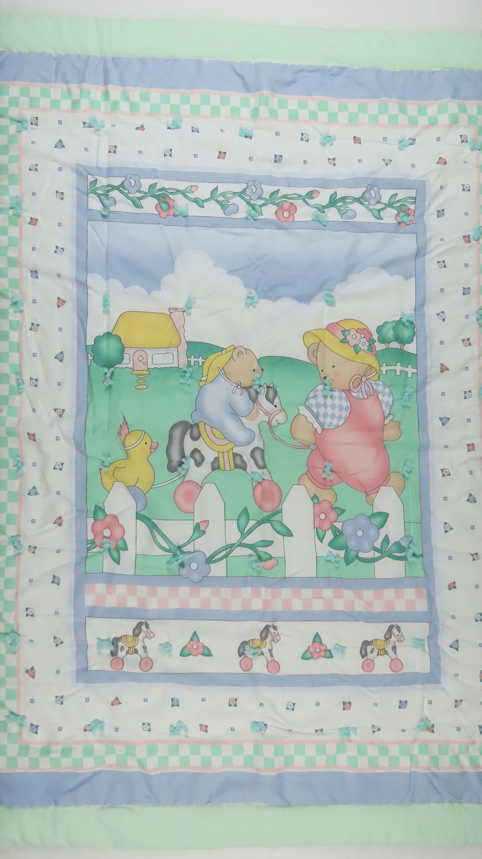 Vintage Teddy Bear small blanket which is about 49" tall by 38.5" wide (125 cm by 98 cm). My camera had a hard time picking up the exact colors. It is sewn a little unevenly, and the border/backside are pilling (very soft fleece type fabric). Some of the stitching along the seams is undone which has formed some holes into the blanket. It has yellowish stain, tiny marks, and thin spots. The yarn ties are worn and fraying some.