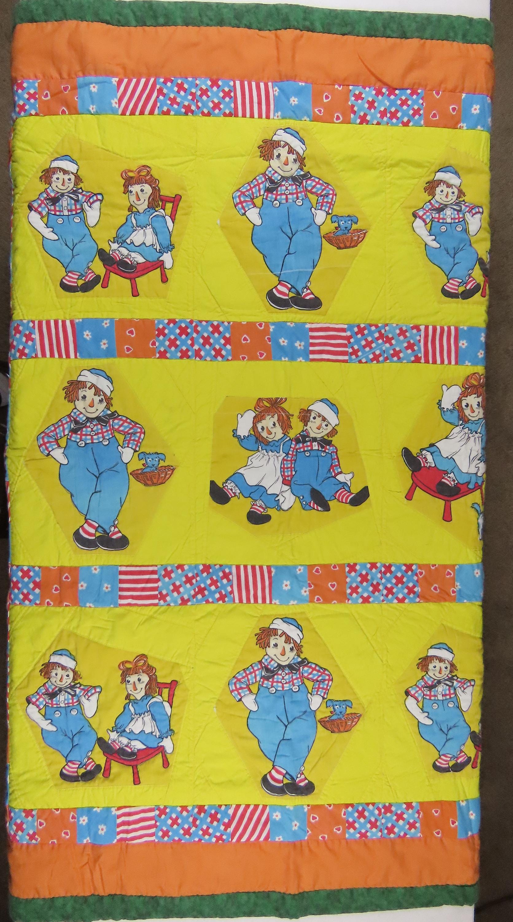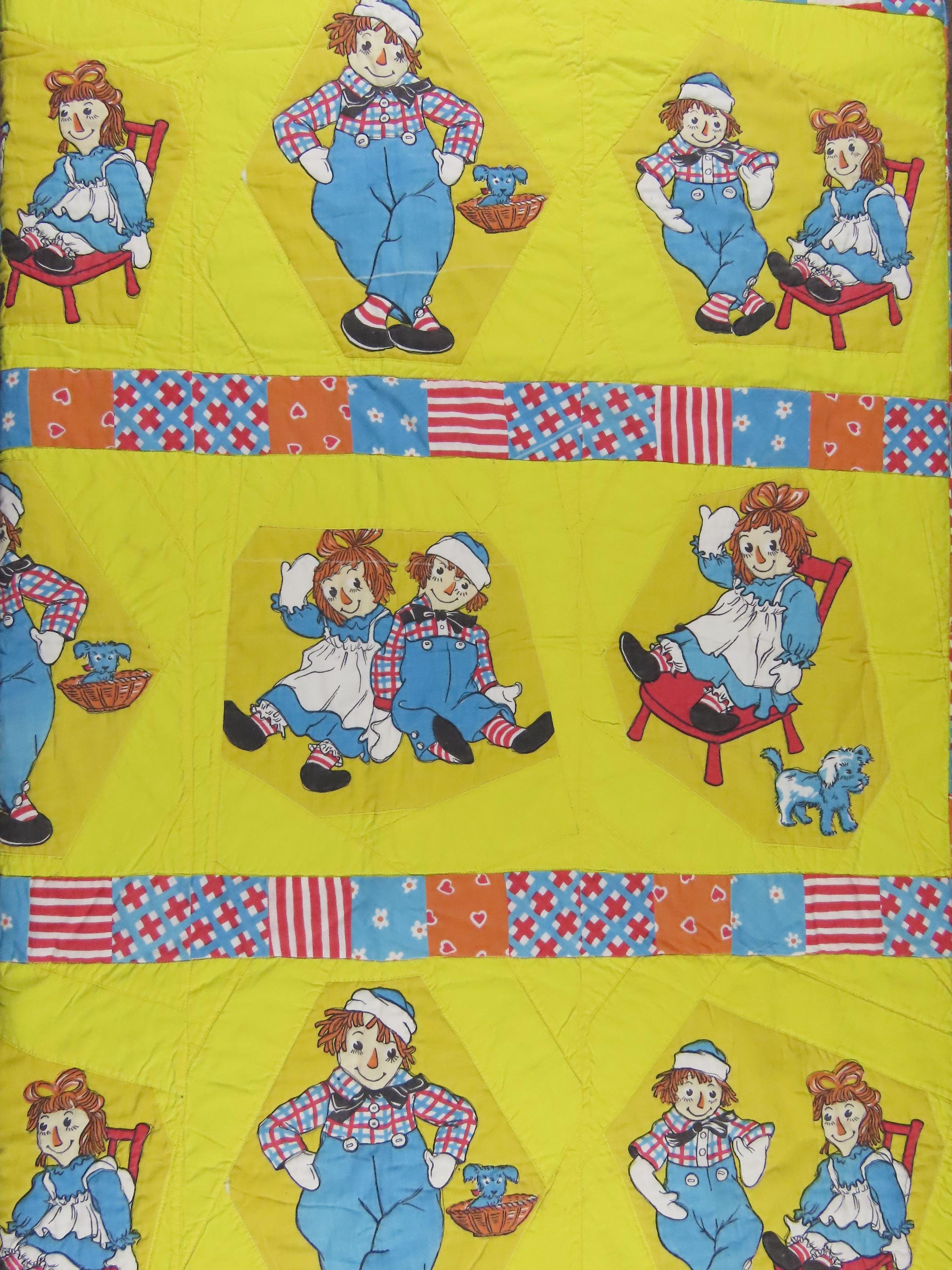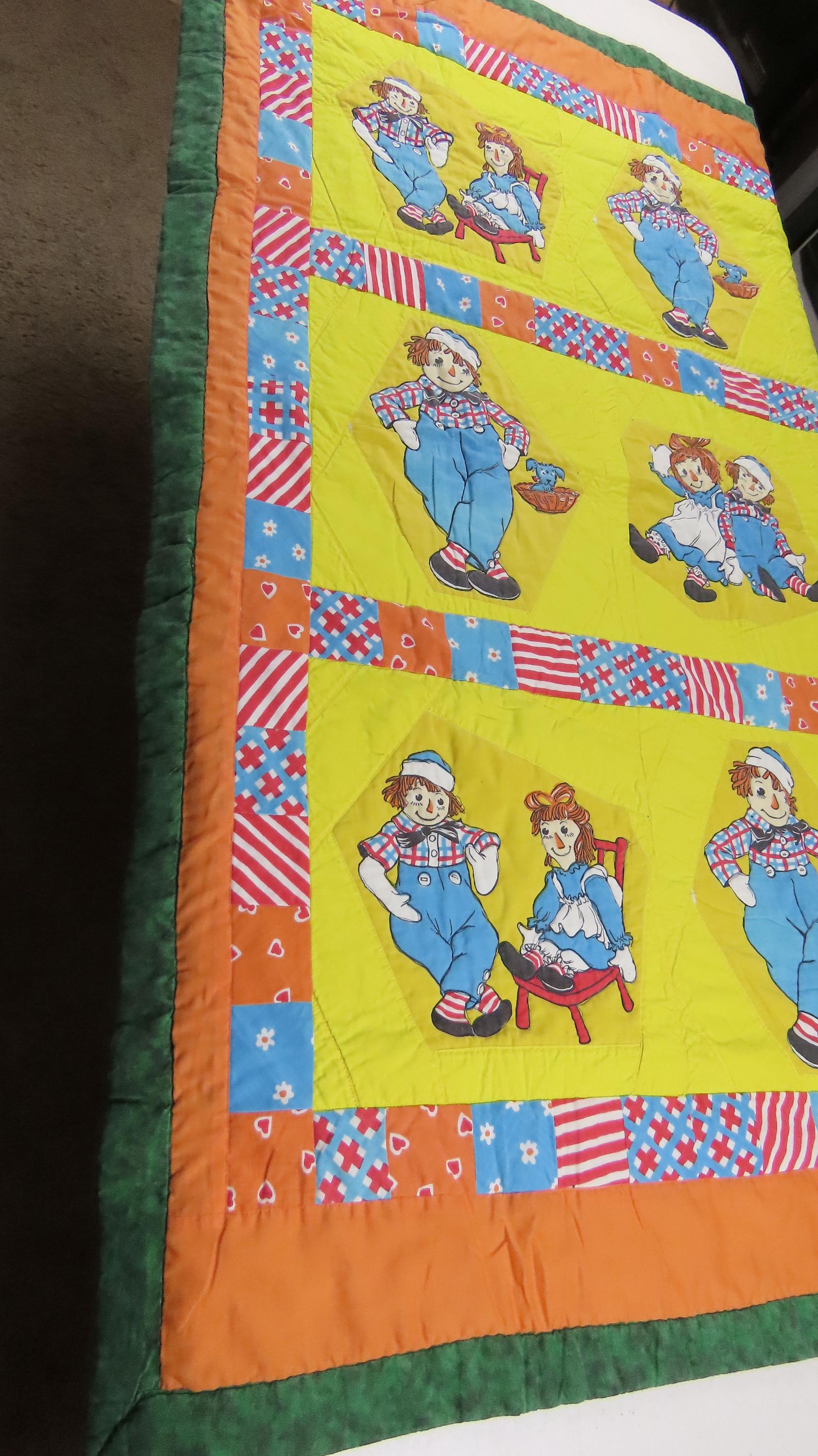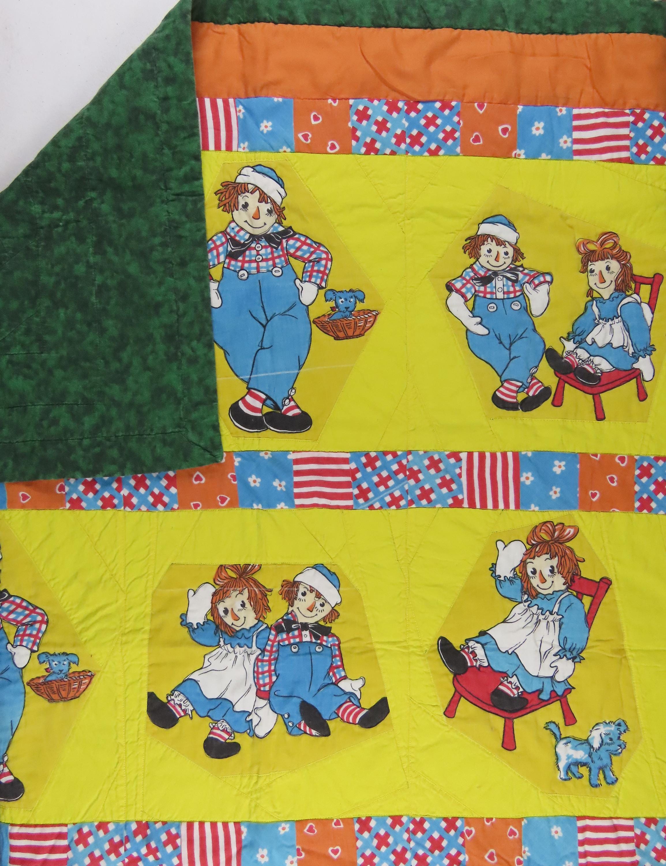 Vintage Raggedy Ann quilted blanket which is about 58" tall by 47" wide (148 cm by 120 cm). My camera had a hard time picking up the exact colors. It is worn along the edges/stitching, sewn a little unevenly in areas, and the fabric bunches up some along the stitching. It has pilling and fading in areas. There are tiny marks, some small stains, and tiny white marks. It has a stain cluster with small stains, whitish line marks, a few missing thread spots. There are also some thin spots.