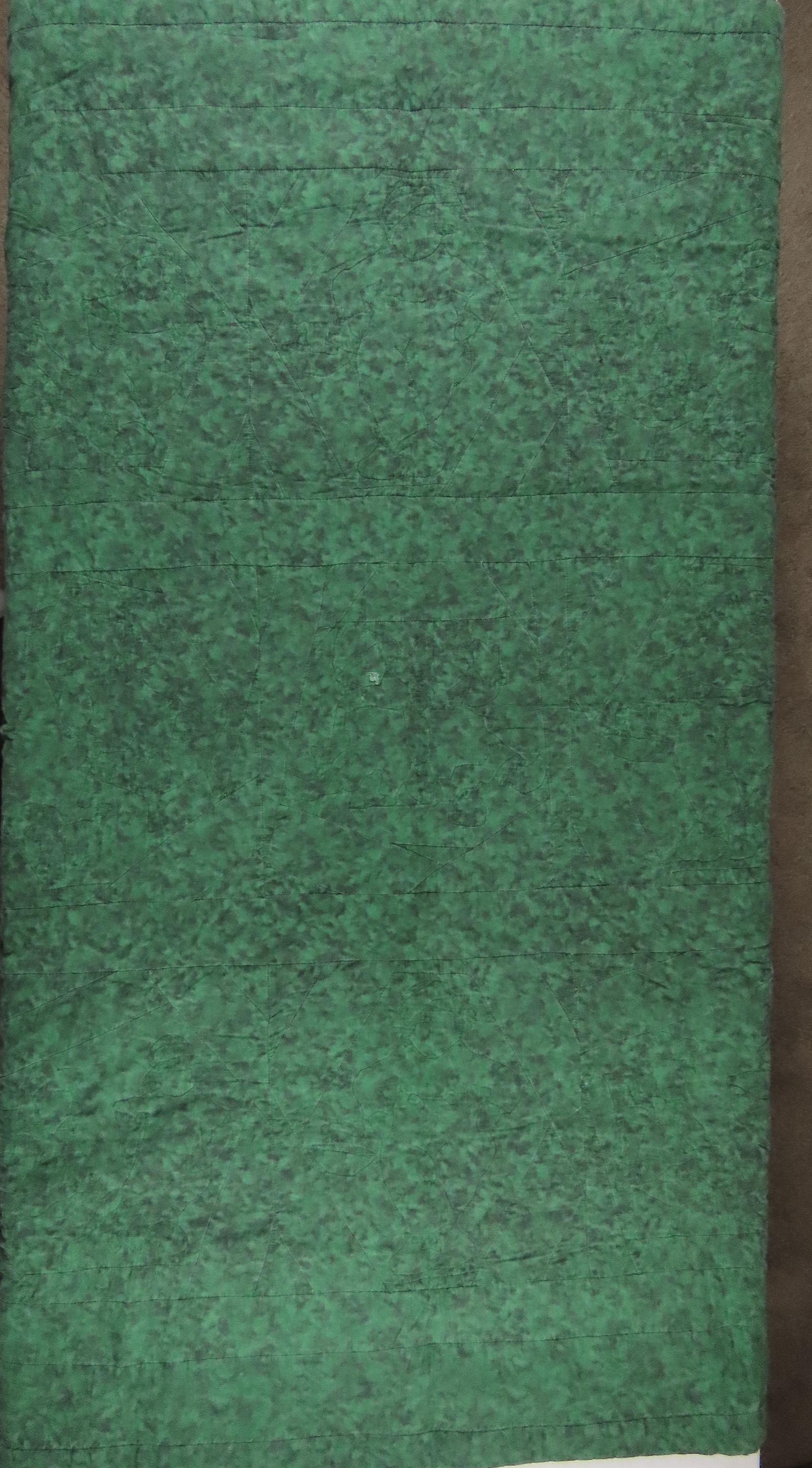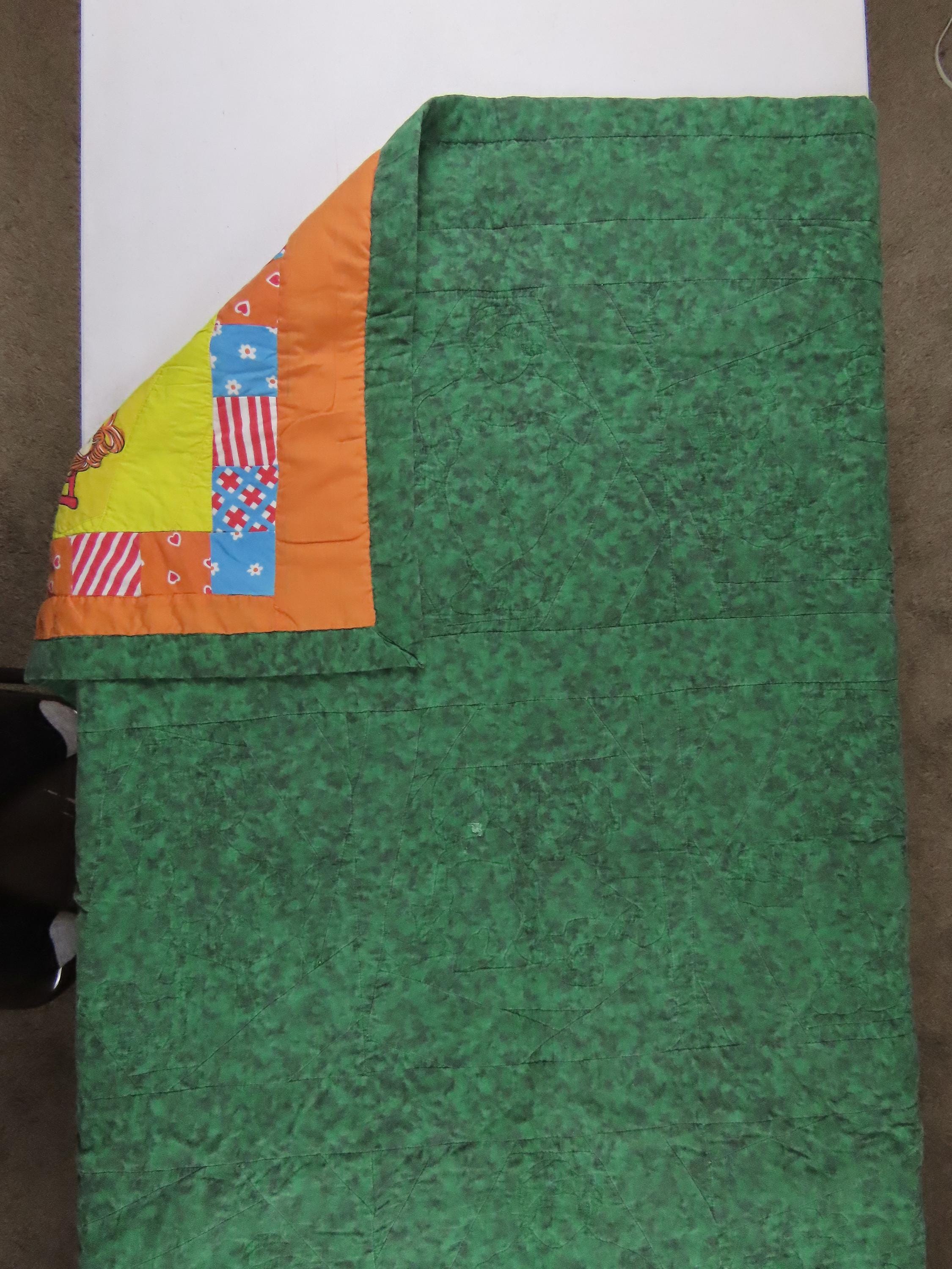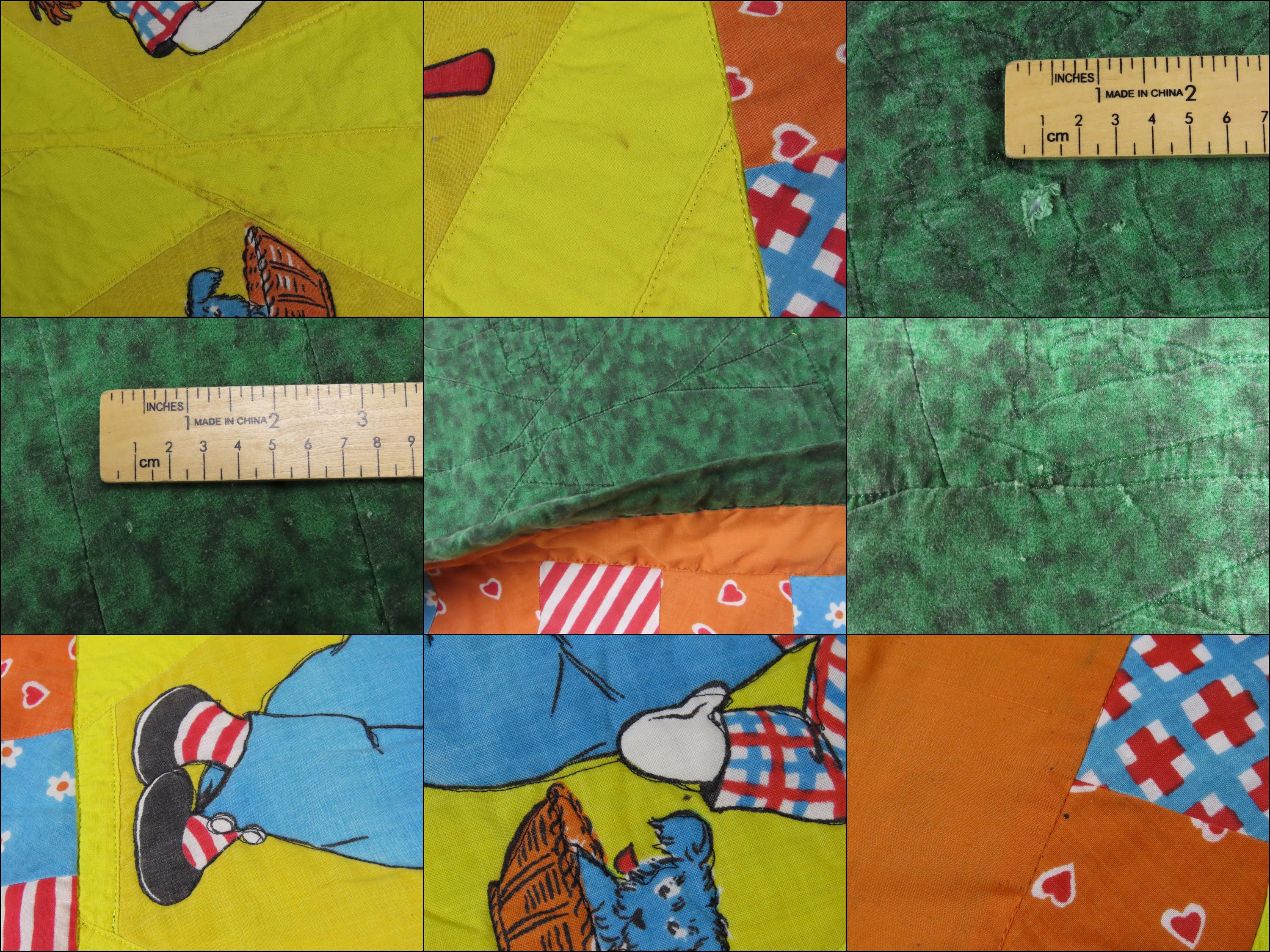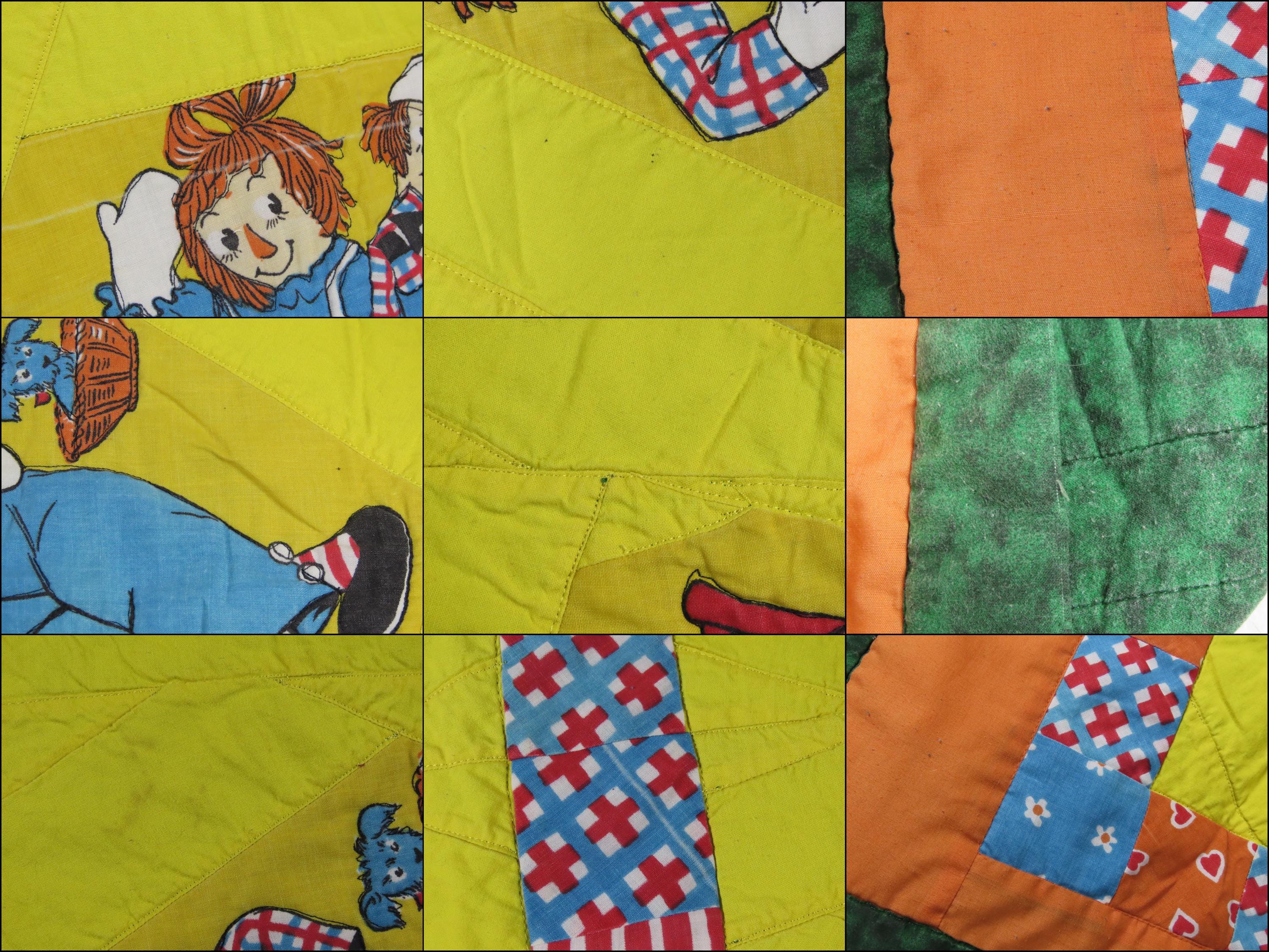 Vintage Raggedy Ann quilted blanket which is about 58" tall by 47" wide (148 cm by 120 cm). My camera had a hard time picking up the exact colors. It is worn along the edges/stitching, sewn a little unevenly in areas, and the fabric bunches up some along the stitching. It has pilling and fading in areas. There are tiny marks, some small stains, and tiny white marks. It has a stain cluster with small stains, whitish line marks, a few missing thread spots. There are also some thin spots.