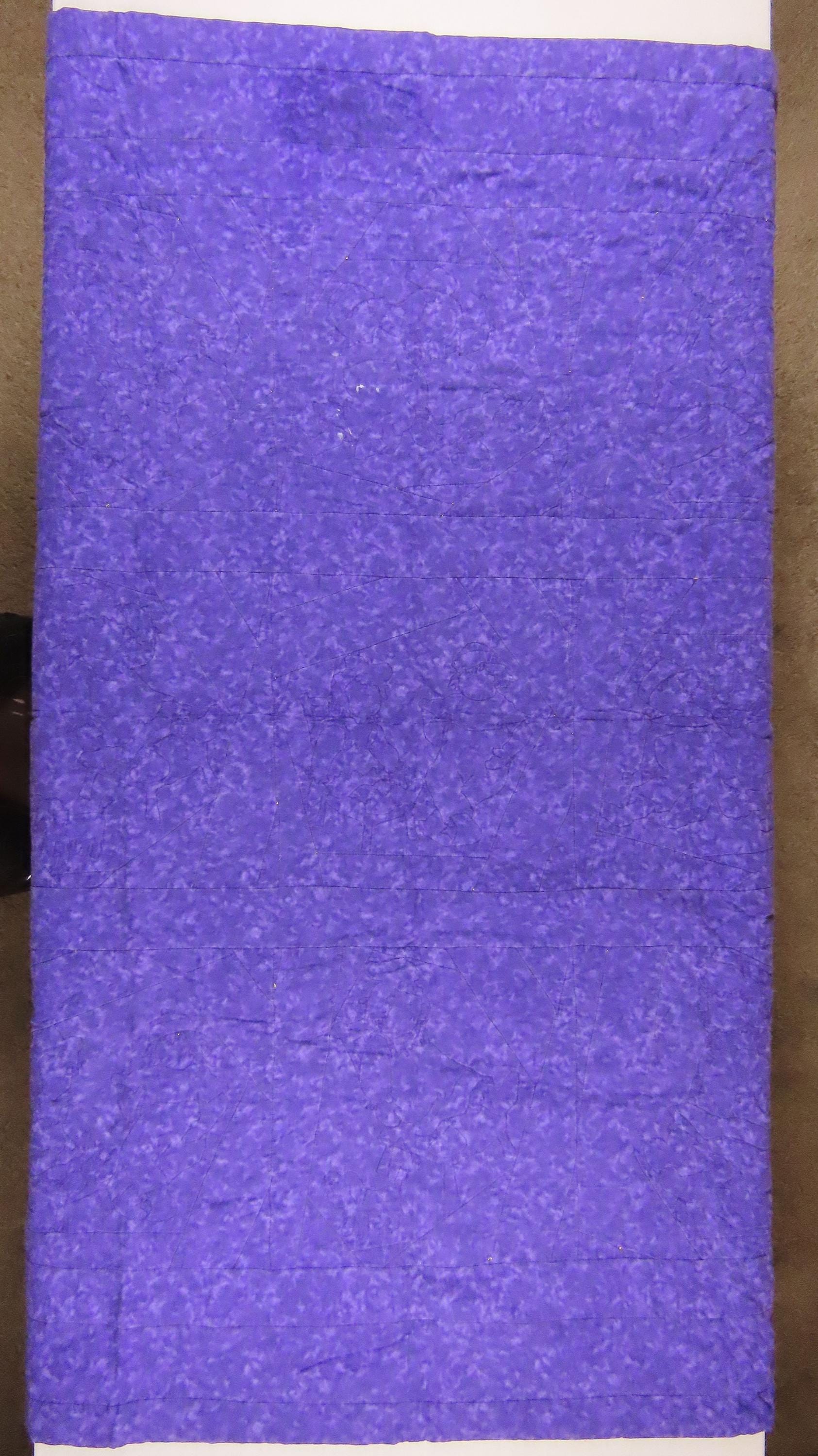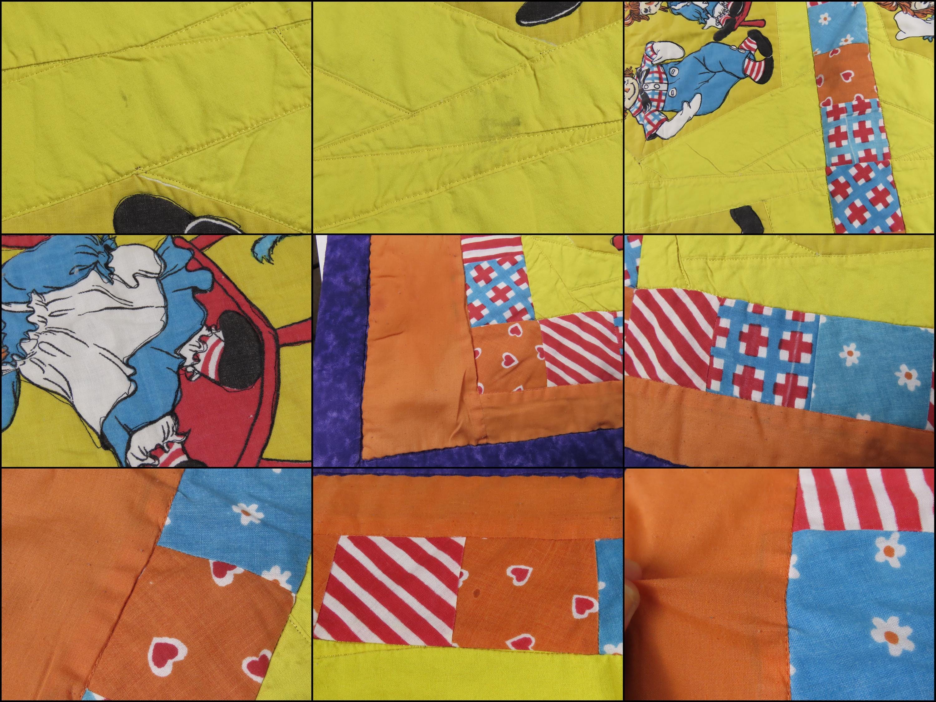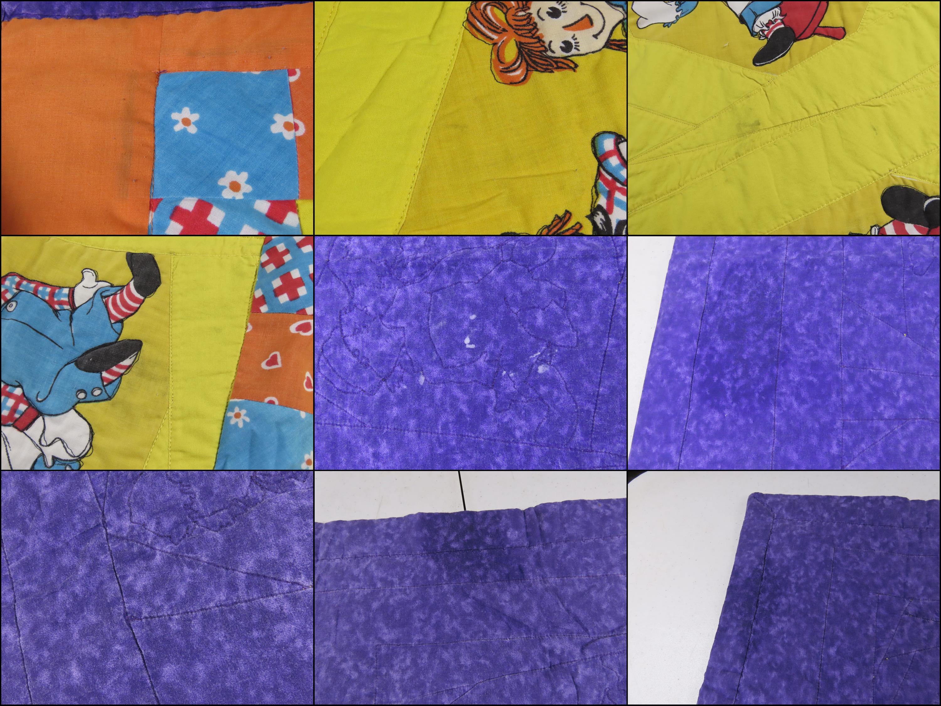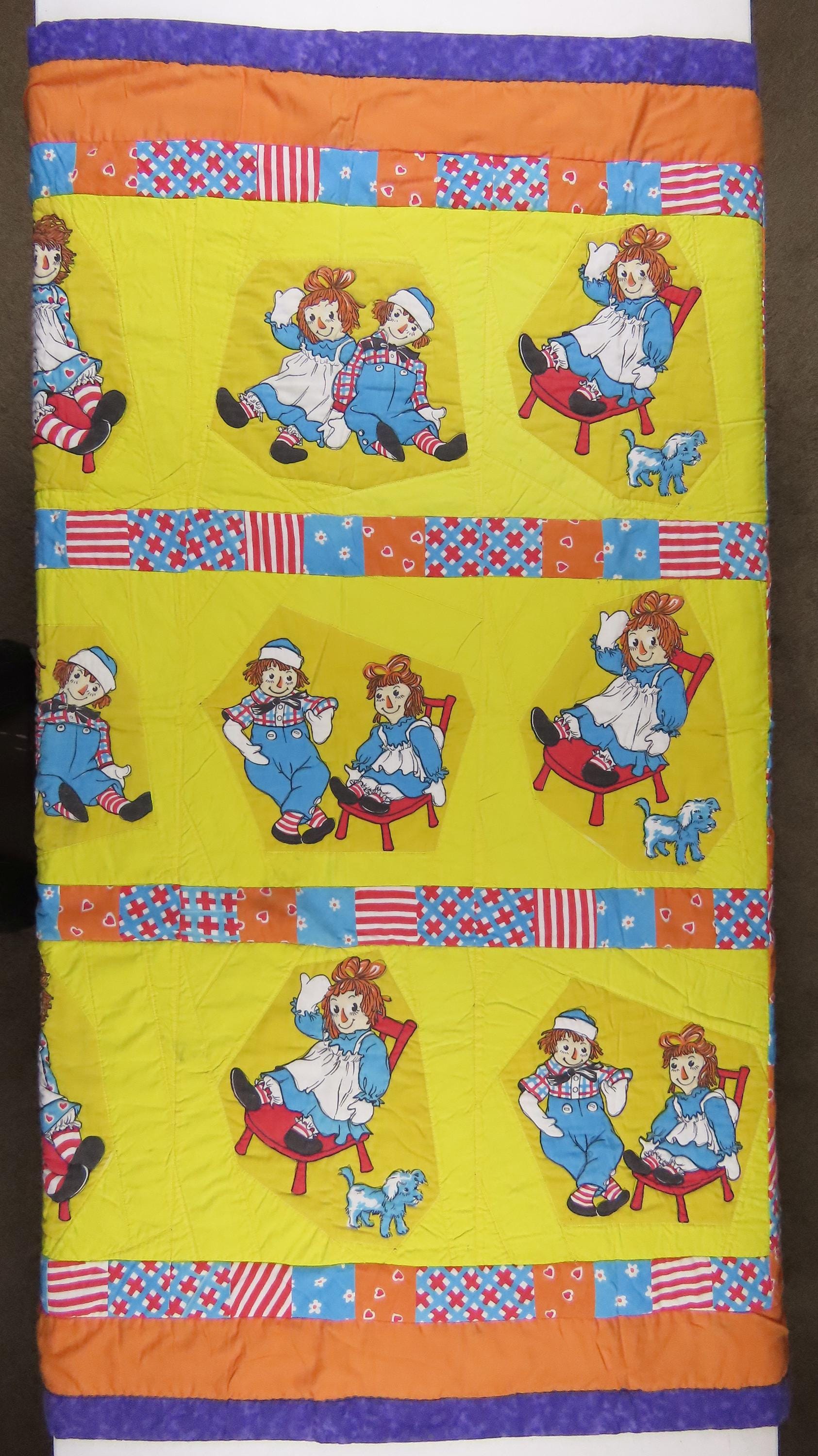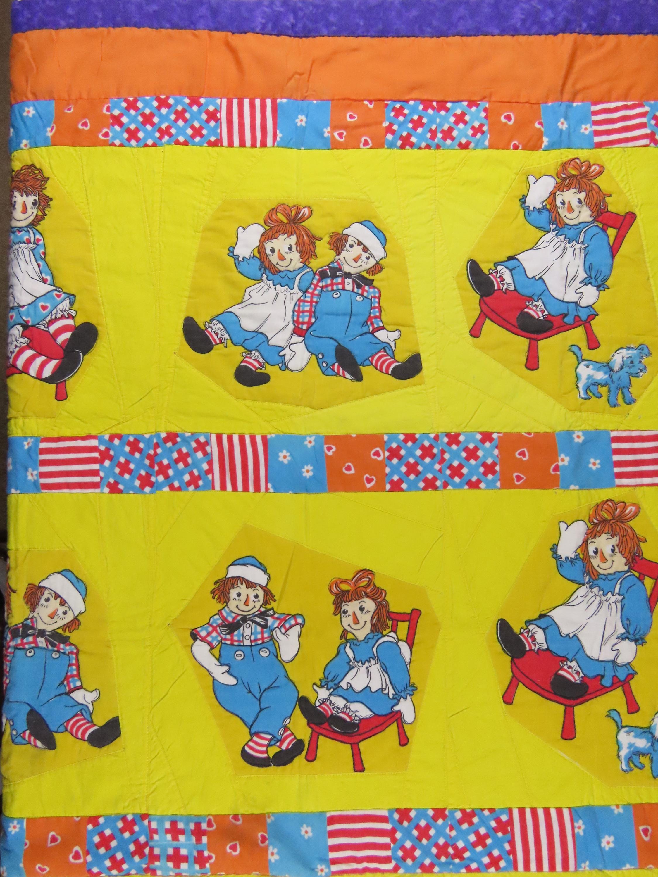 Vintage Raggedy Ann quilted blanket which is about 58" tall by 47" wide (148 cm by 120 cm). My camera had a hard time picking up the exact colors. It is worn along the edges/stitching, sewn a little unevenly in areas, and the fabric bunches up some along the stitching. It has pilling and fading in areas. There are multiple small/tiny stains (some in clusters), some whitish line marks, and tiny marks. It has some tiny white marks and some thin spots/line marks (around the orange border).