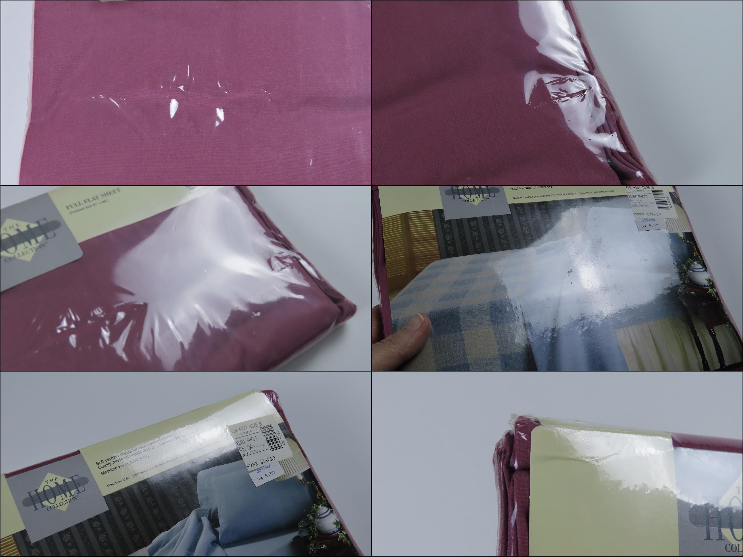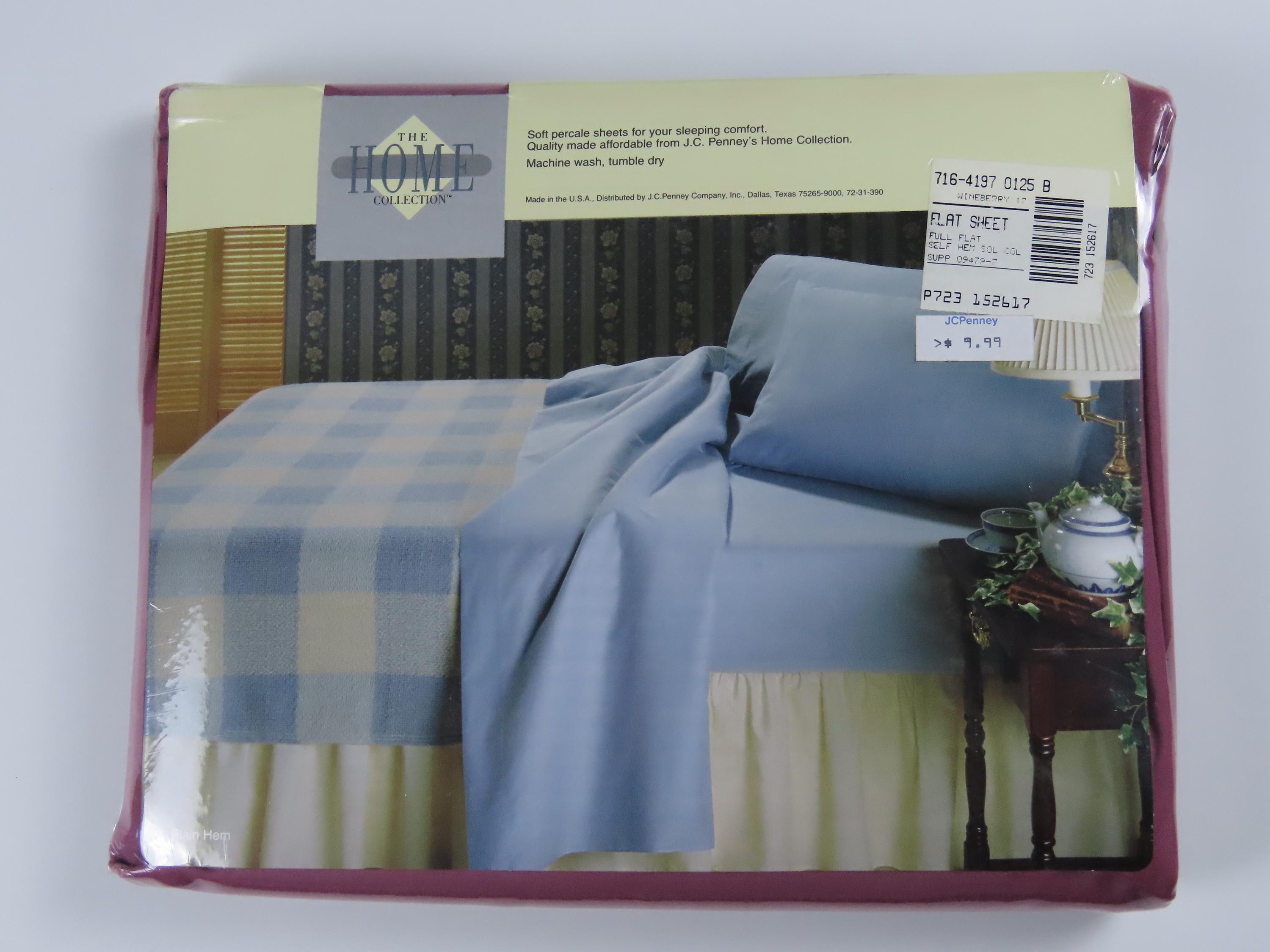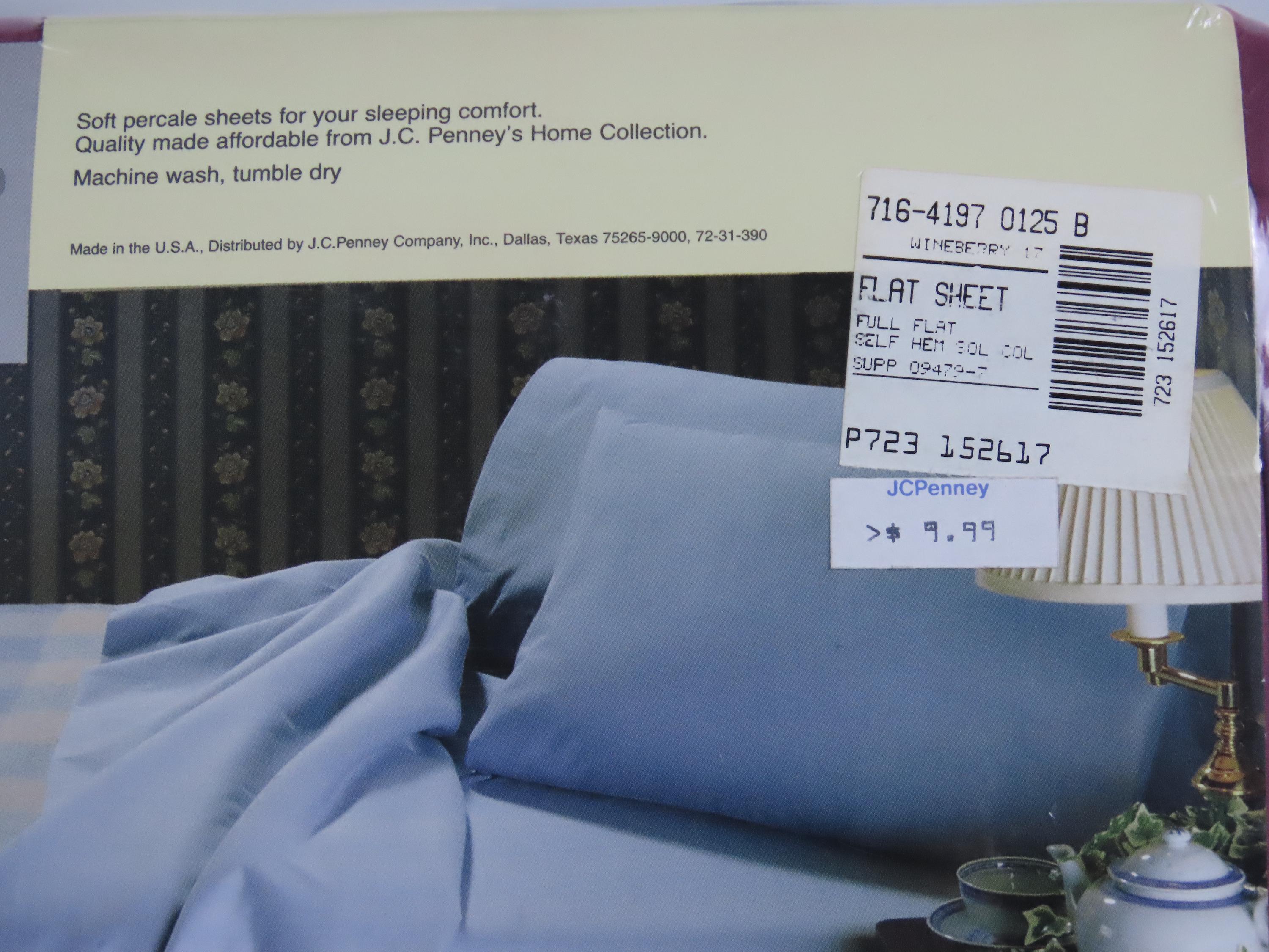 Vintage Home Collection by JC Penney "Wineberry 17" full flat sheet which is new in the package. It is 50% cotton and 50% polyester with a 180 thread count. My camera had a hard time picking up the exact colors. The plastic packaging is worn, and has some old sticker residue. The plastic packaging has a large tear/slit on the front, as well as a couple other smaller holes.