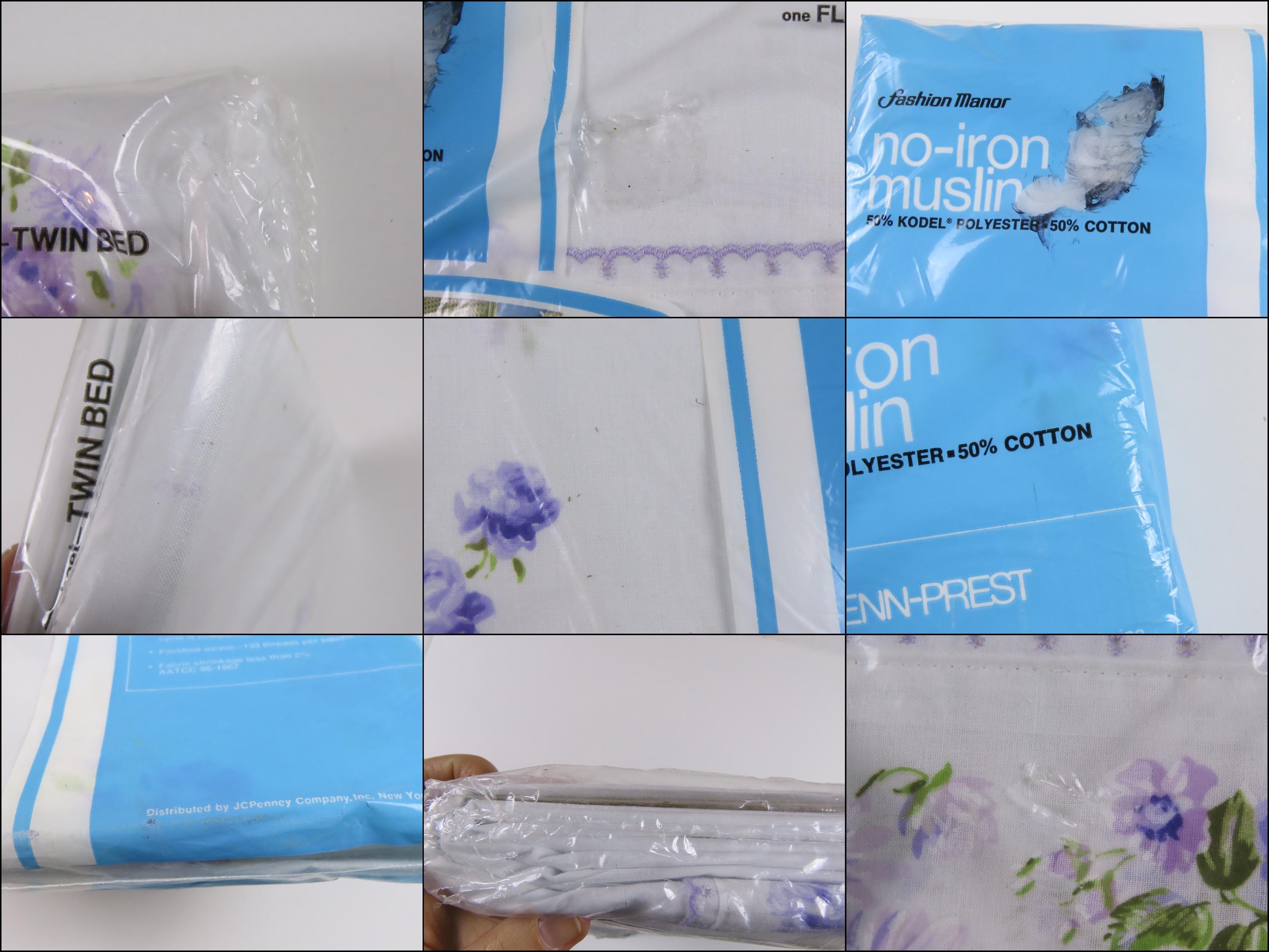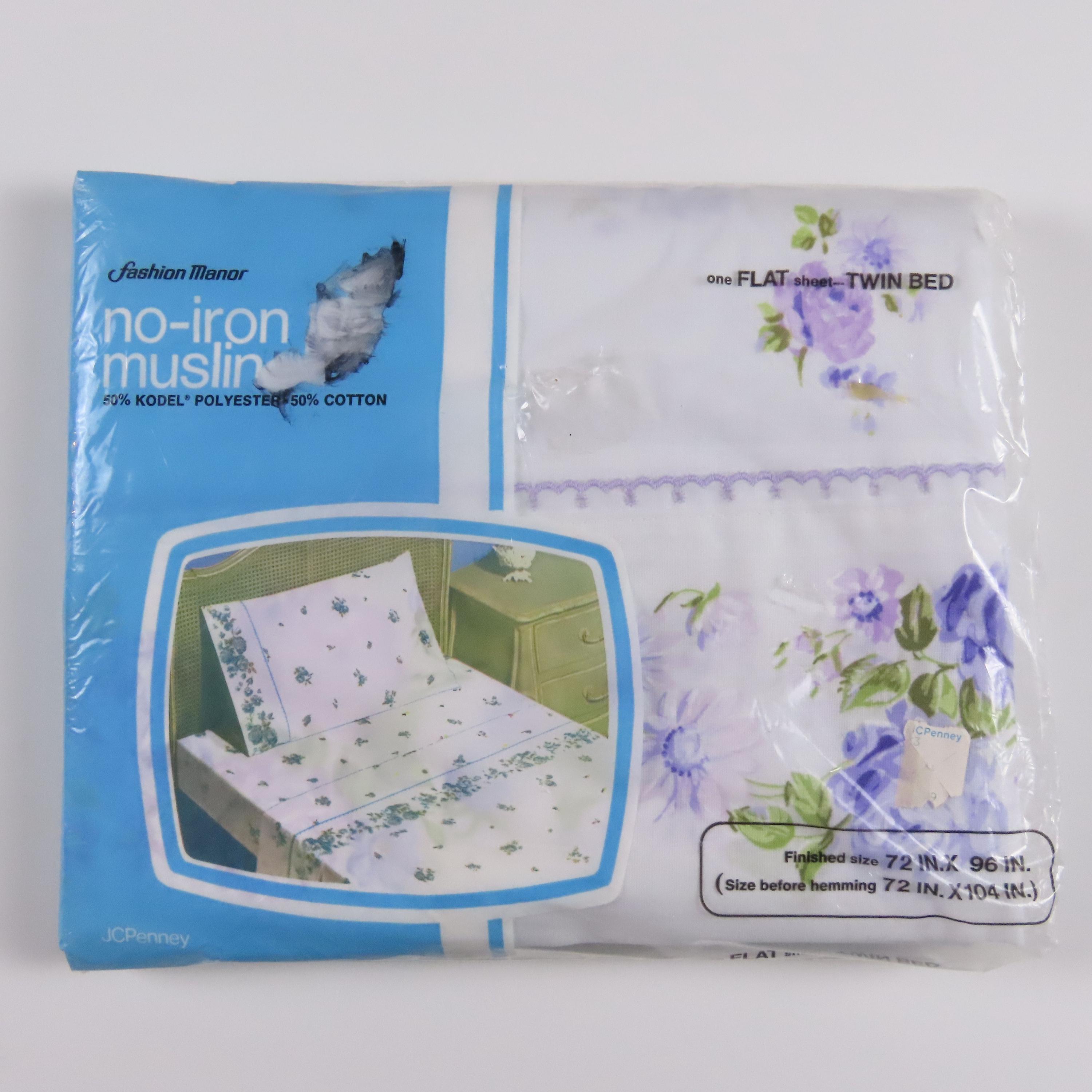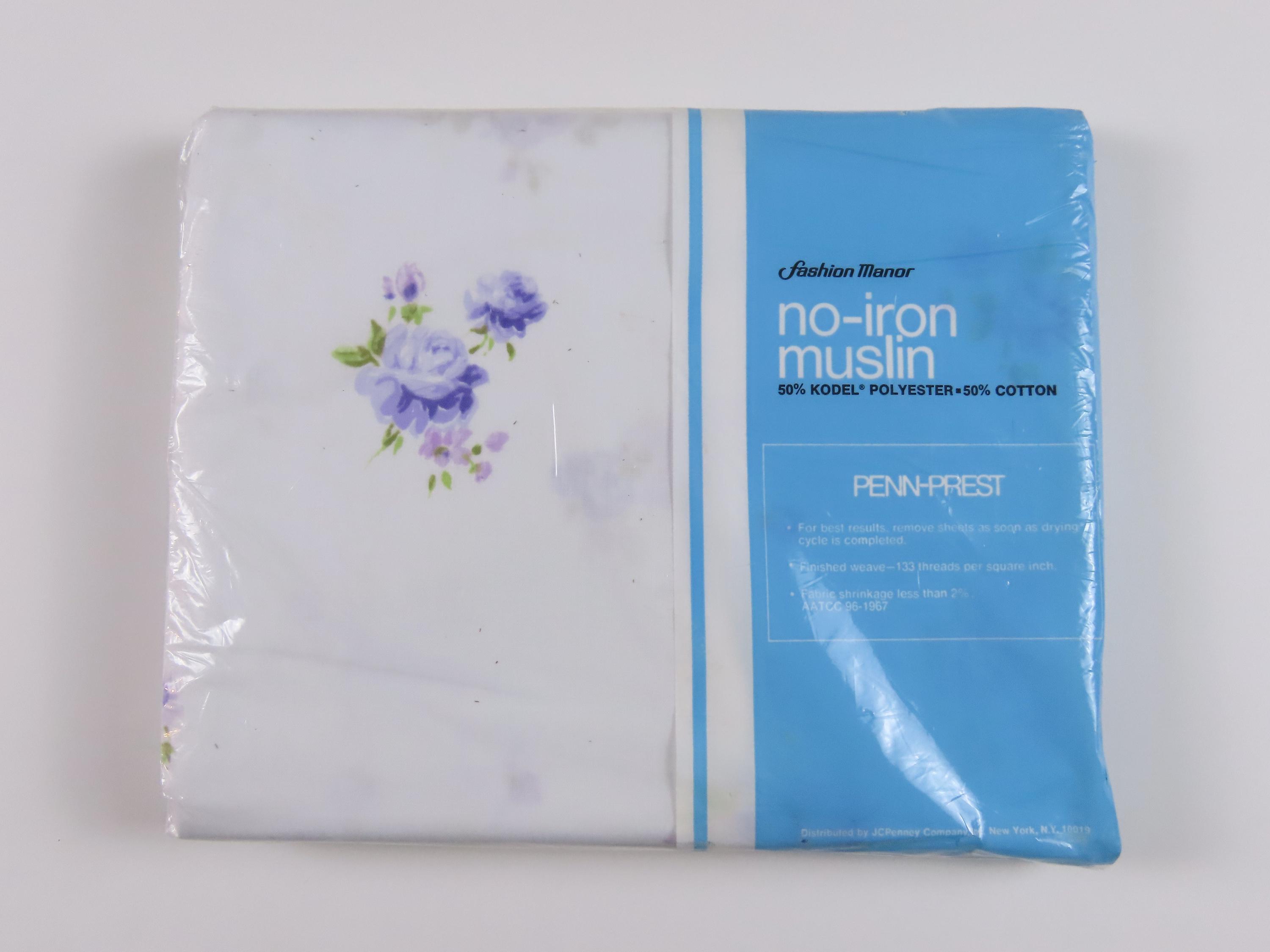 Vintage JC Penney floral twin flat sheet which is new in the package. It is 50% cotton and 50% polyester with a 133 thread count. The plastic packaging is worn. It has sharpie marks, missing ink/smudges, and a few small holes in the plastic. The plastic packaging has old sticker residue, and some loose debris inside that looks like pieces of the cardboard insert. There is a small area of purple ink on the sheet which looks like a possible printing error.