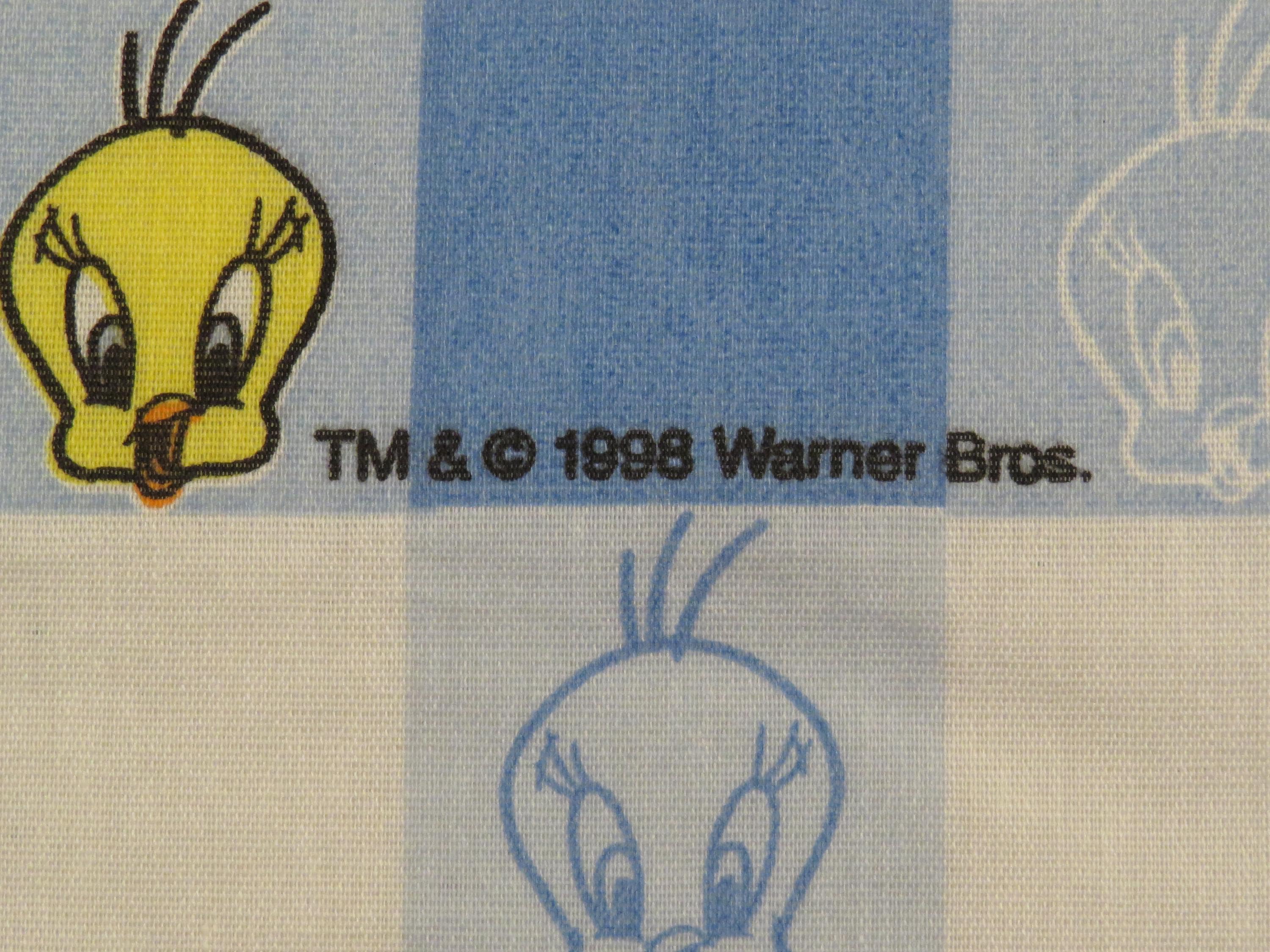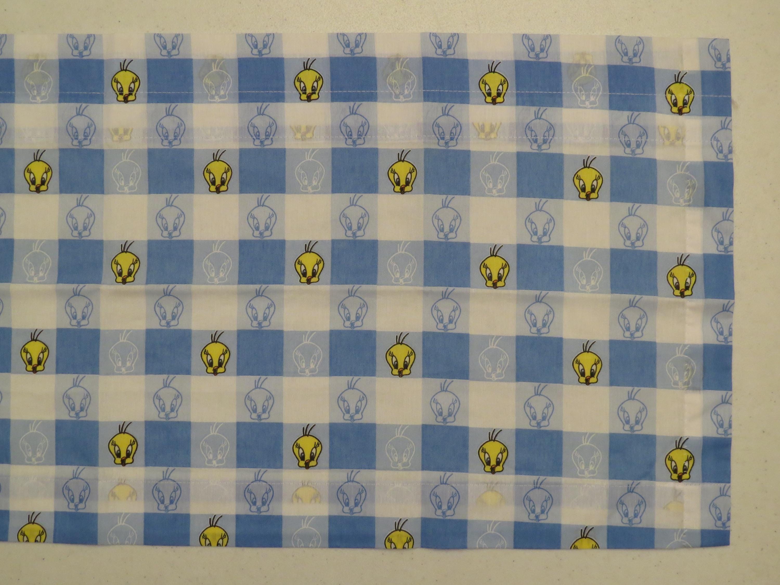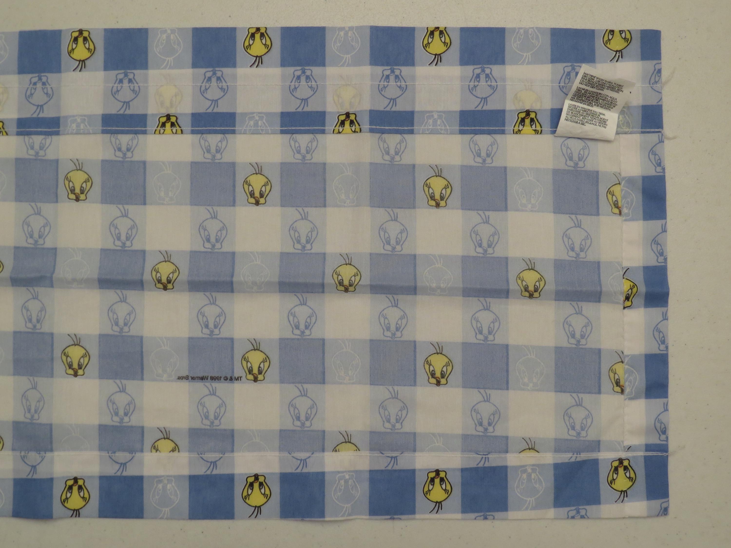 Set of 2 vintage Tweety Bird valances from 1998 which are 70% polyester and 30% cotton. The blue color is a little faded/streaky on both valances.