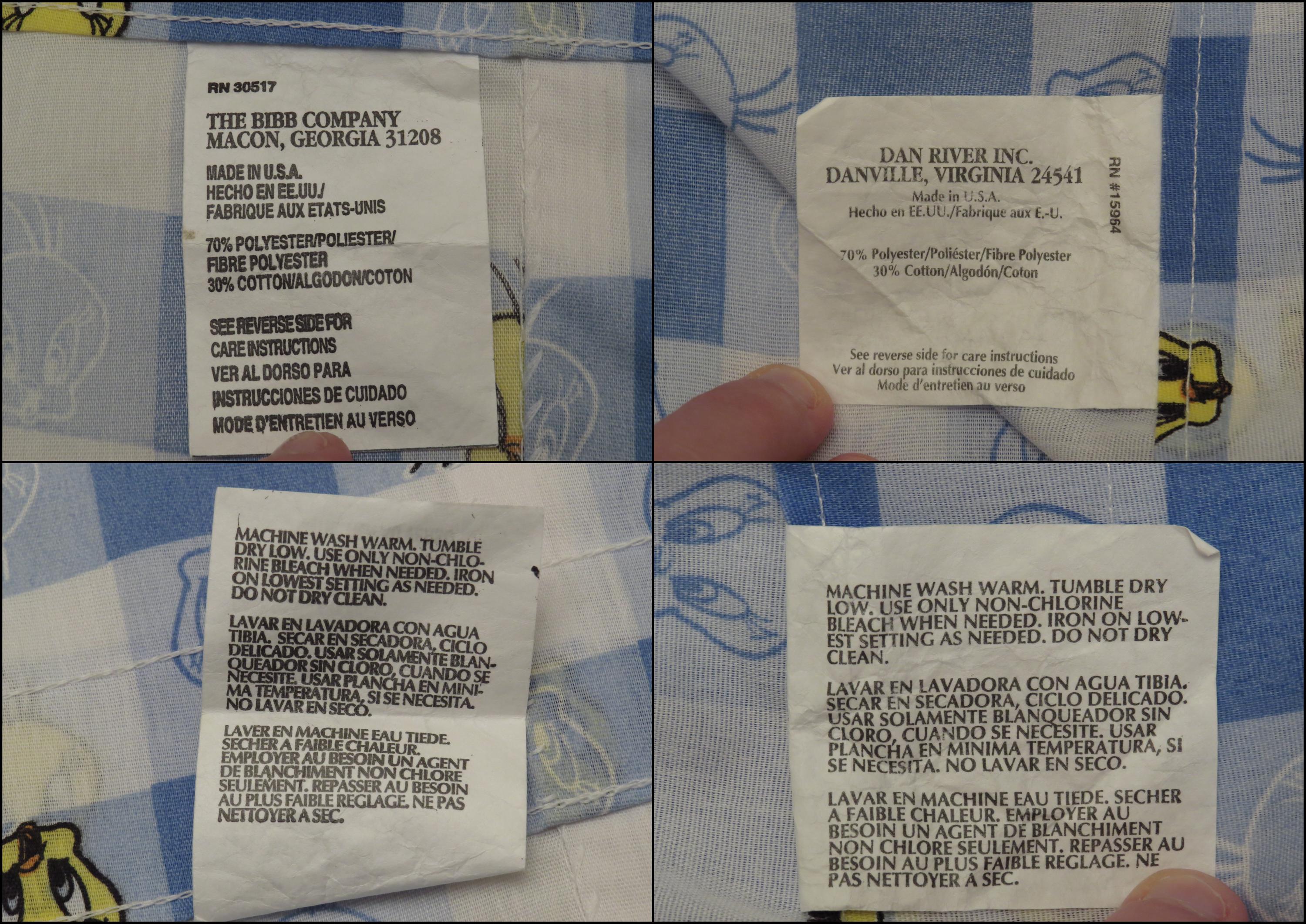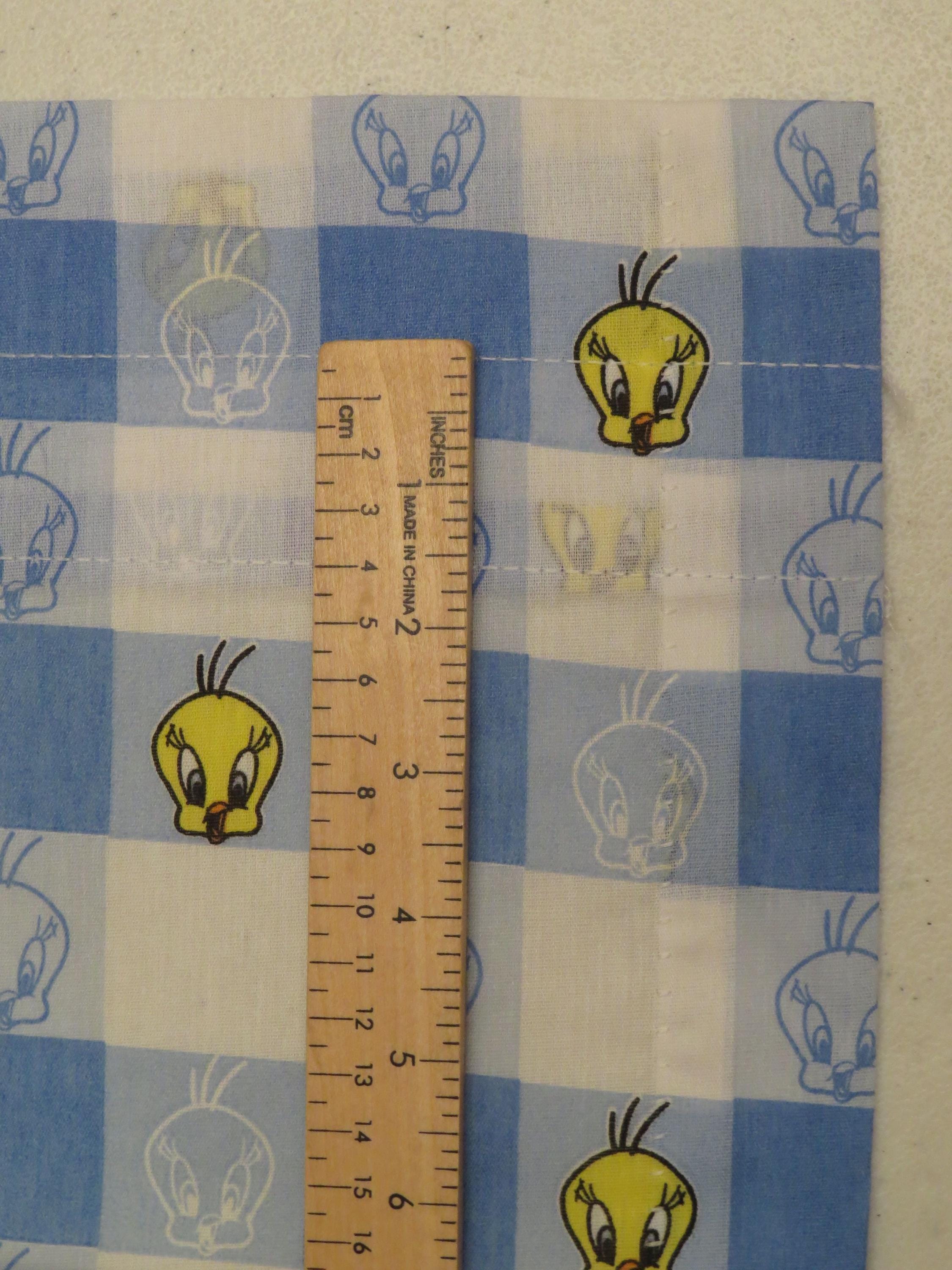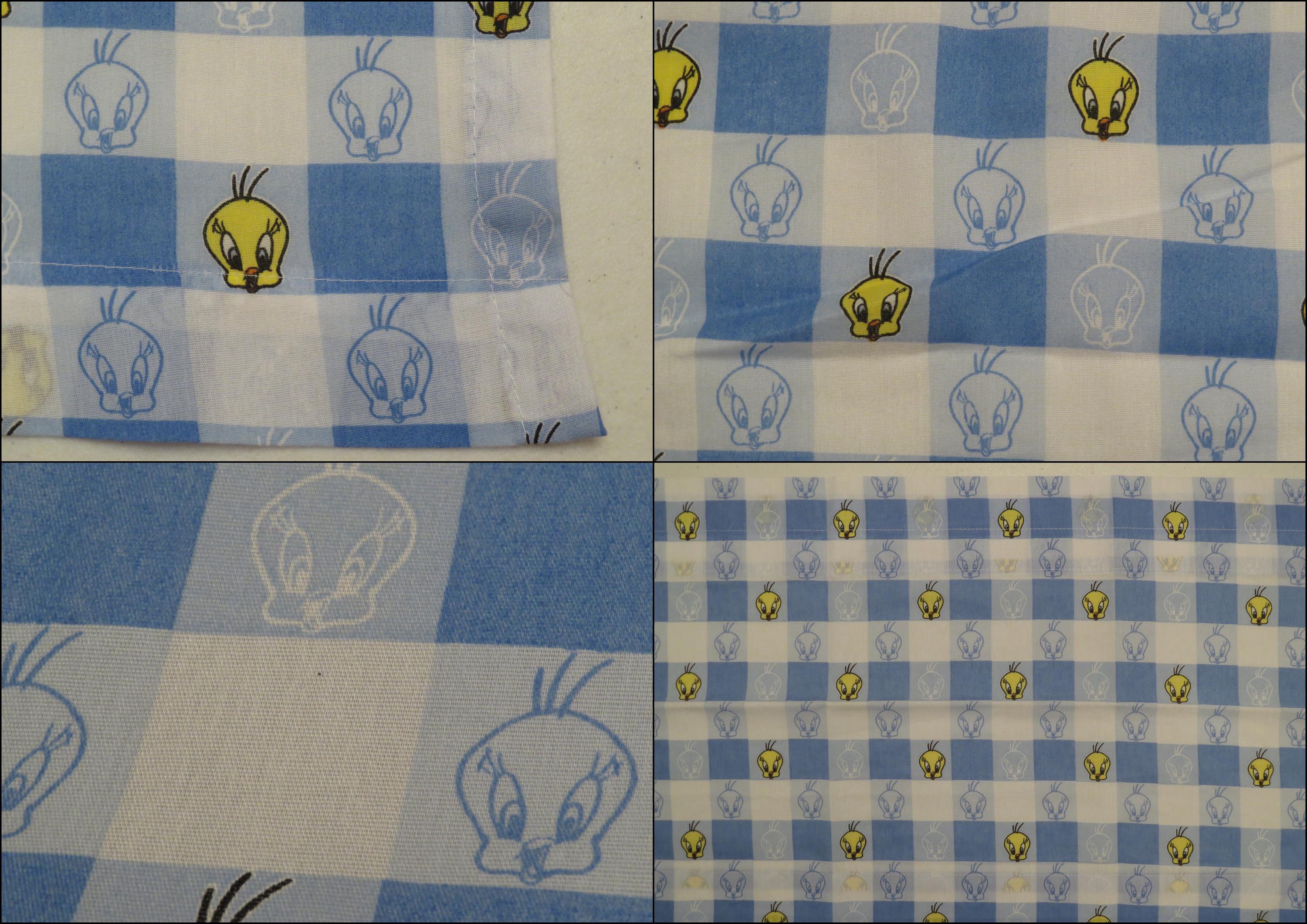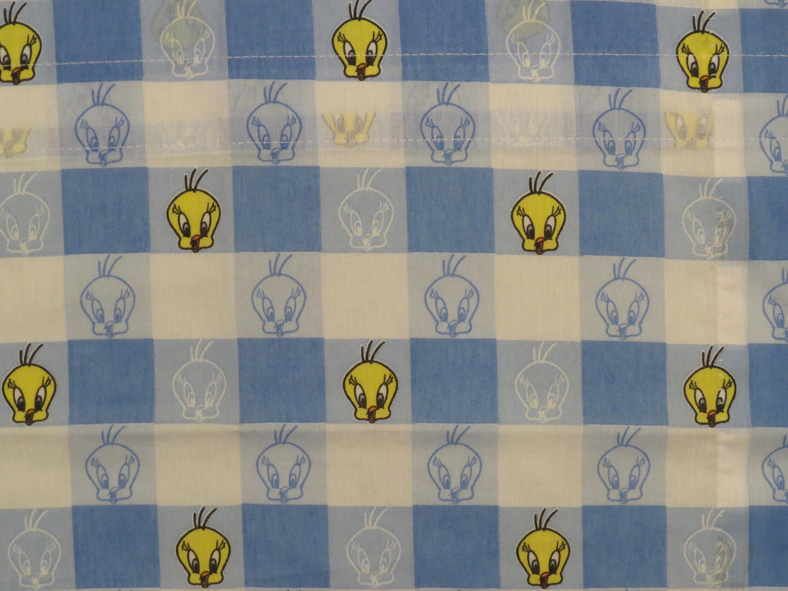 Set of 2 vintage Tweety Bird valances from 1998 which are 70% polyester and 30% cotton. The blue color is a little faded/streaky on both valances.