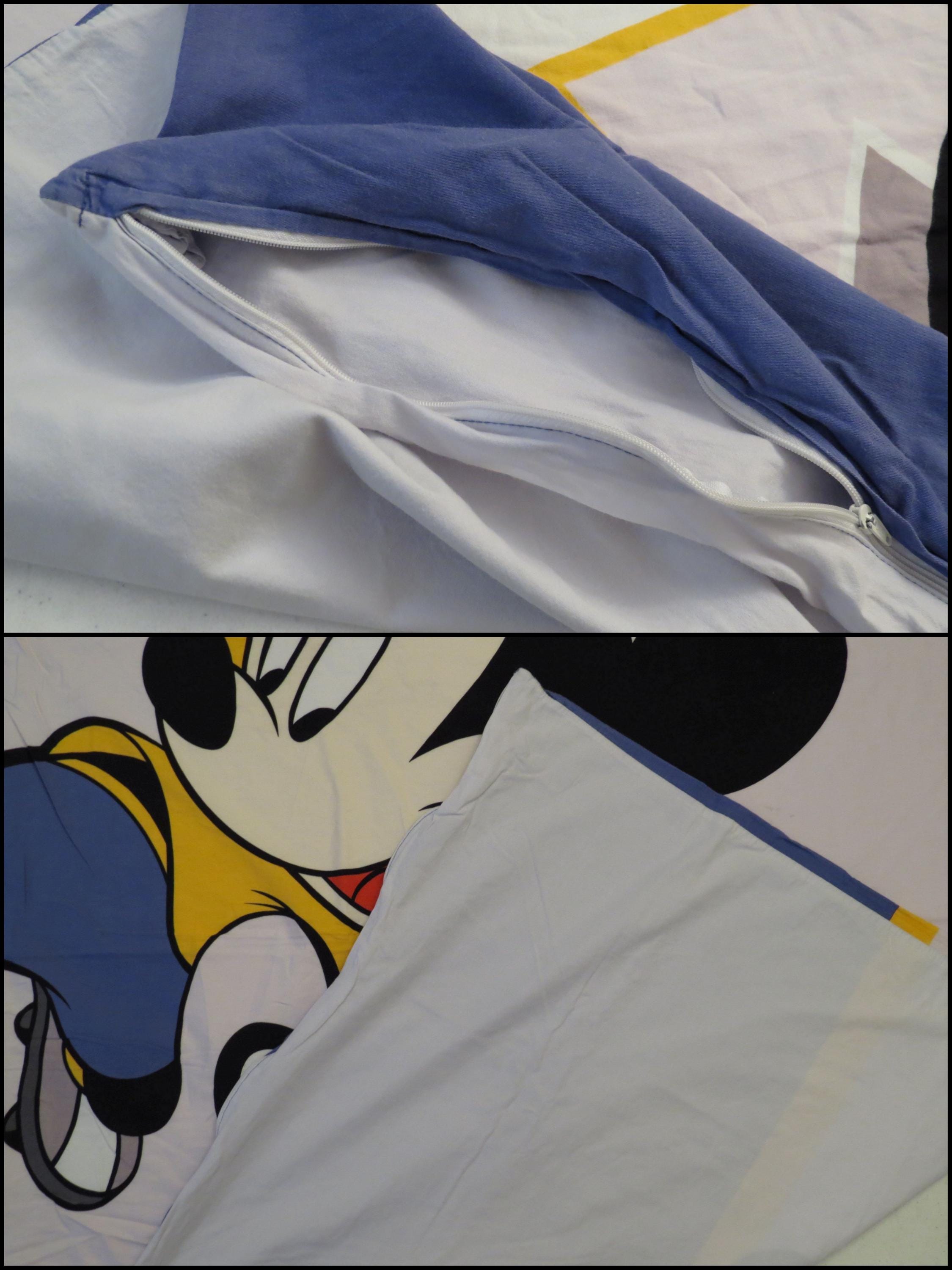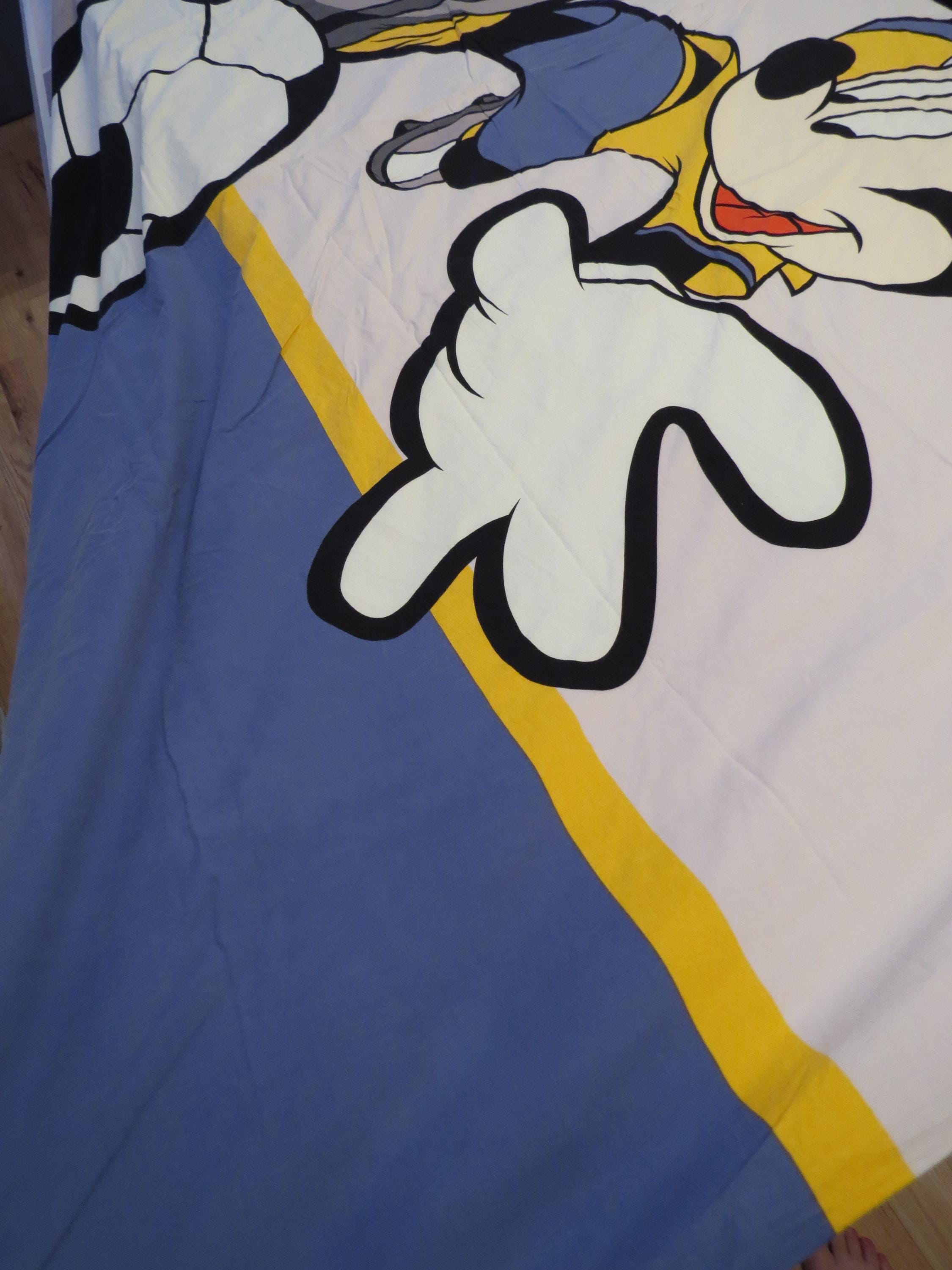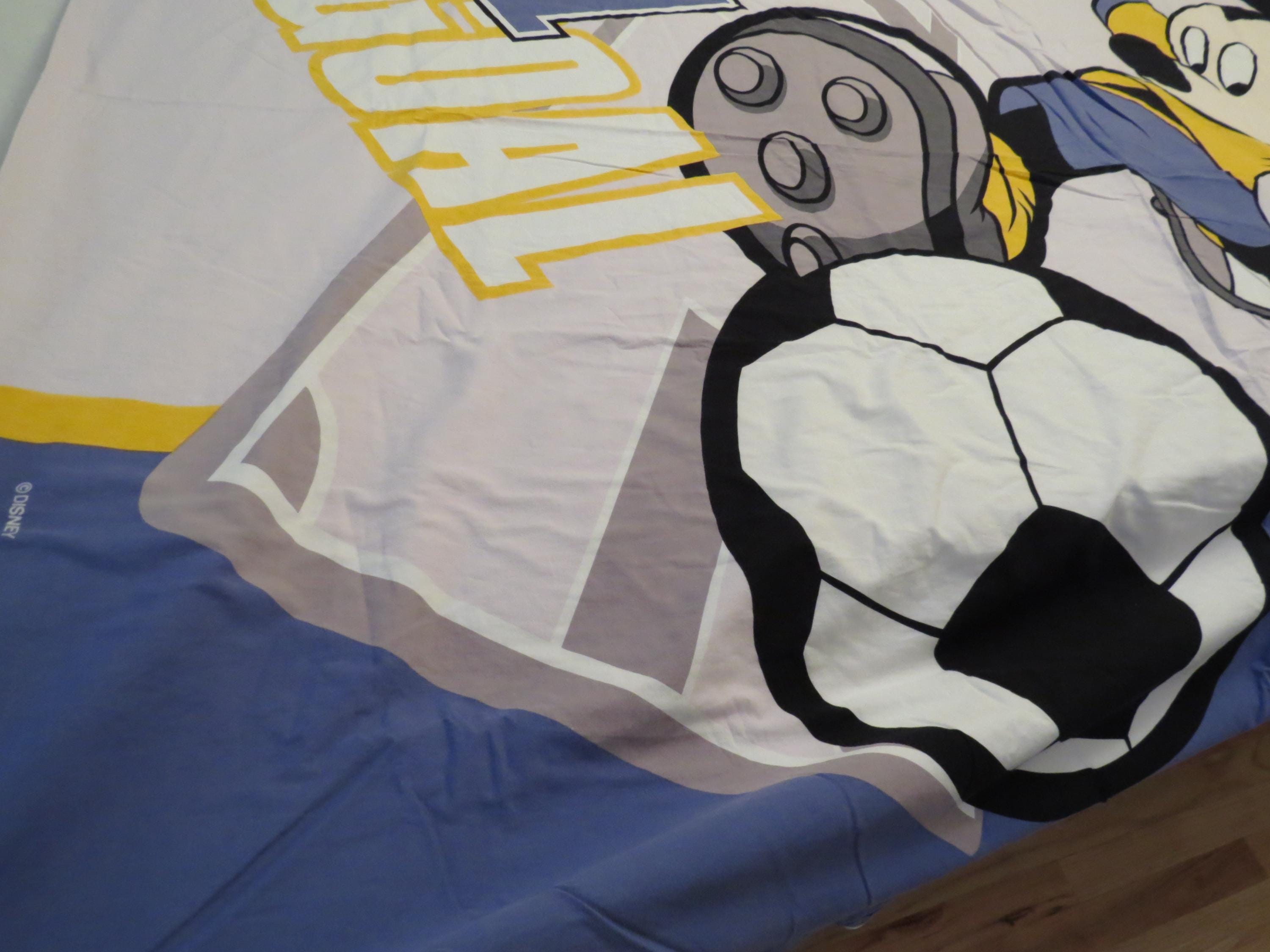 Vintage Mickey Mouse soccer duvet cover which is about 74" tall by 61" wide (194 cm by 155 cm). I think the size is a UK single. It is fairly wrinkled, and the zipper is along the edge on the right side. The fabric is worn with light pilling. It is worn along the edges, and has some fold/crease lines along the edges. There are multiple small marks/stains, tiny white marks, and light whitish marks. It has a missing thread spot, tiny marks, and some line marks.