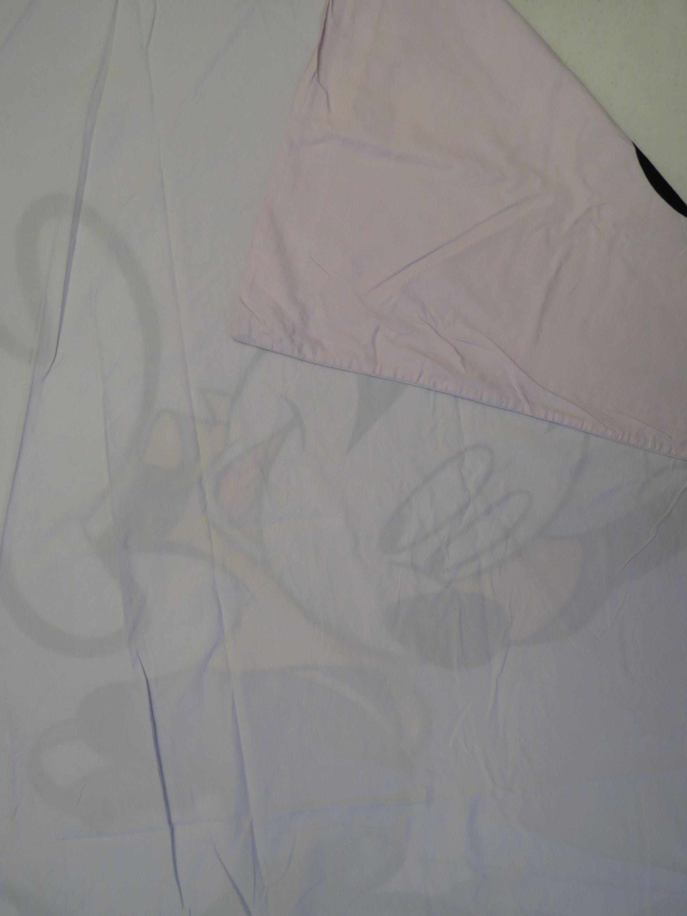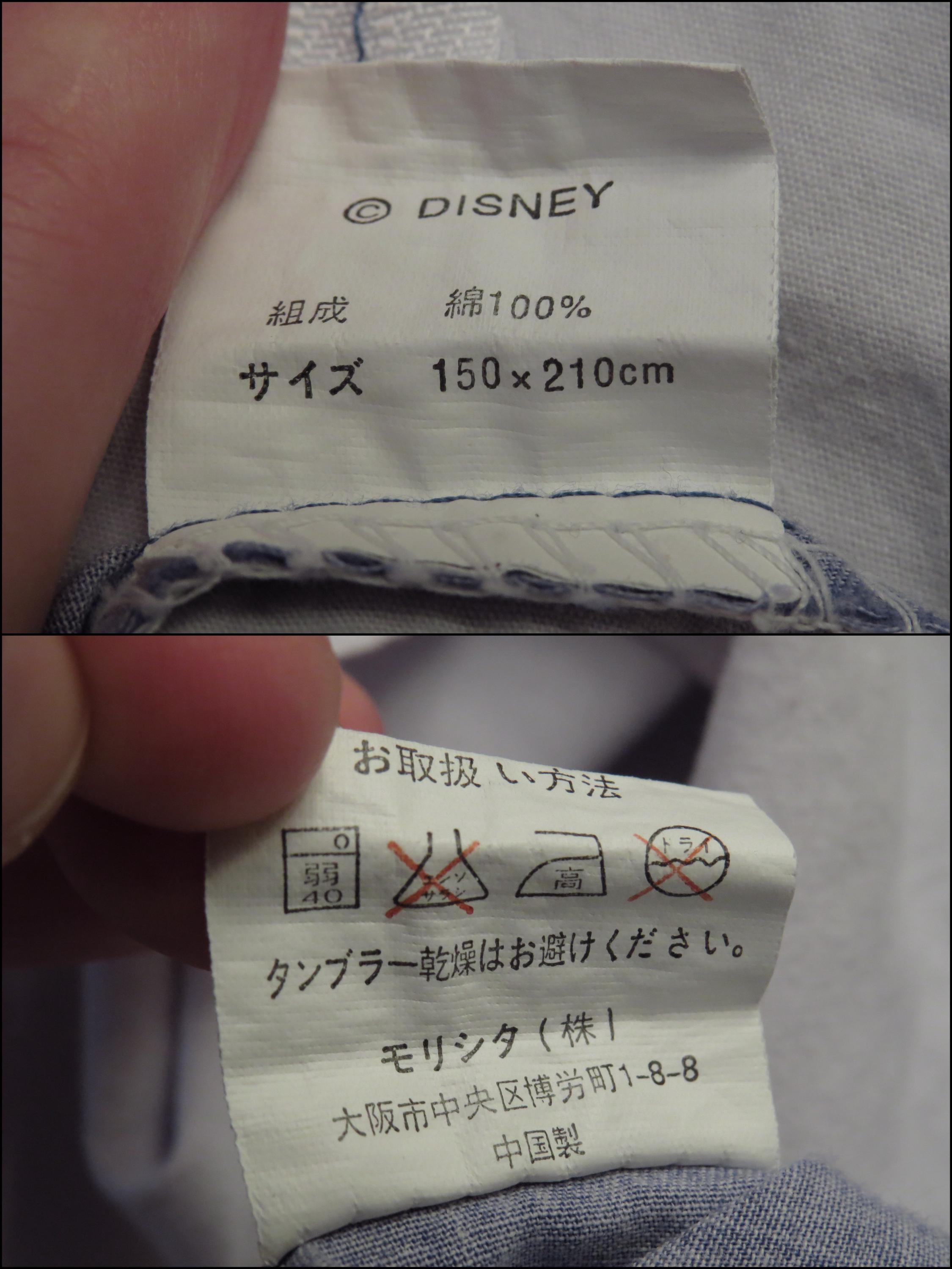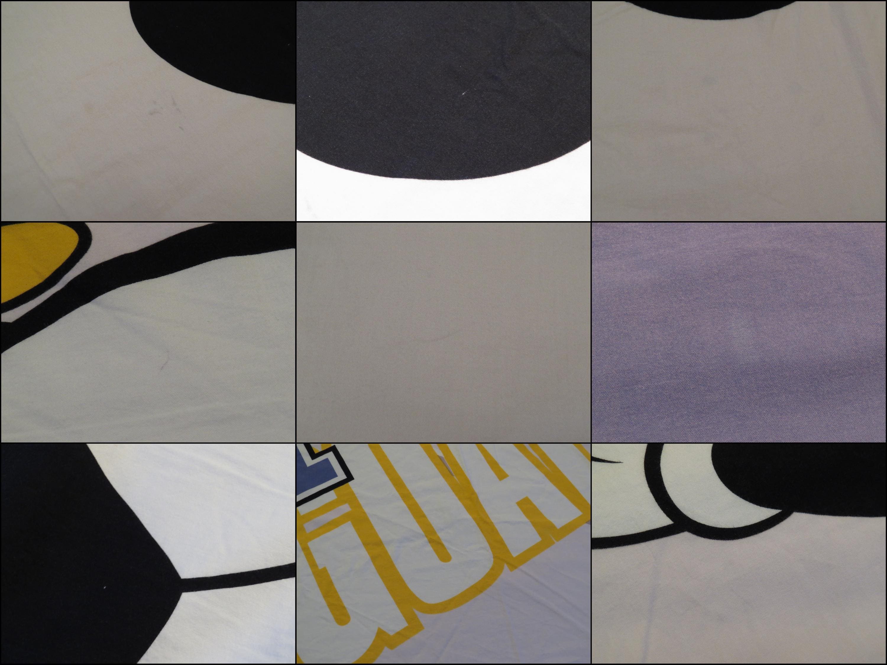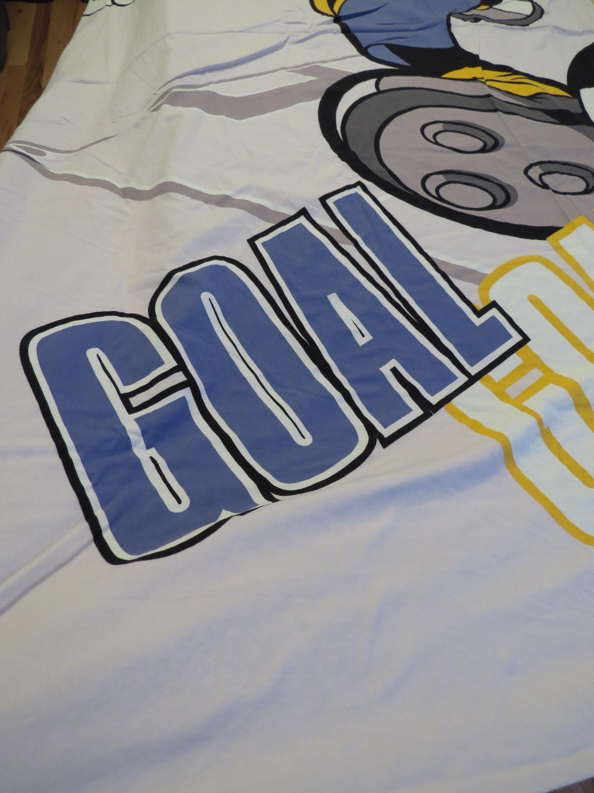 Vintage Mickey Mouse soccer duvet cover which is about 74" tall by 61" wide (194 cm by 155 cm). I think the size is a UK single. It is fairly wrinkled, and the zipper is along the edge on the right side. The fabric is worn with light pilling. It is worn along the edges, and has some fold/crease lines along the edges. There are multiple small marks/stains, tiny white marks, and light whitish marks. It has a missing thread spot, tiny marks, and some line marks.