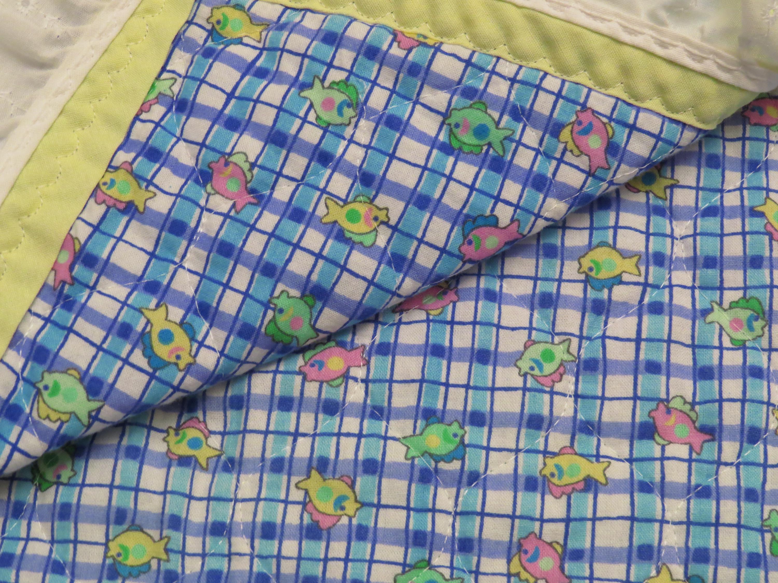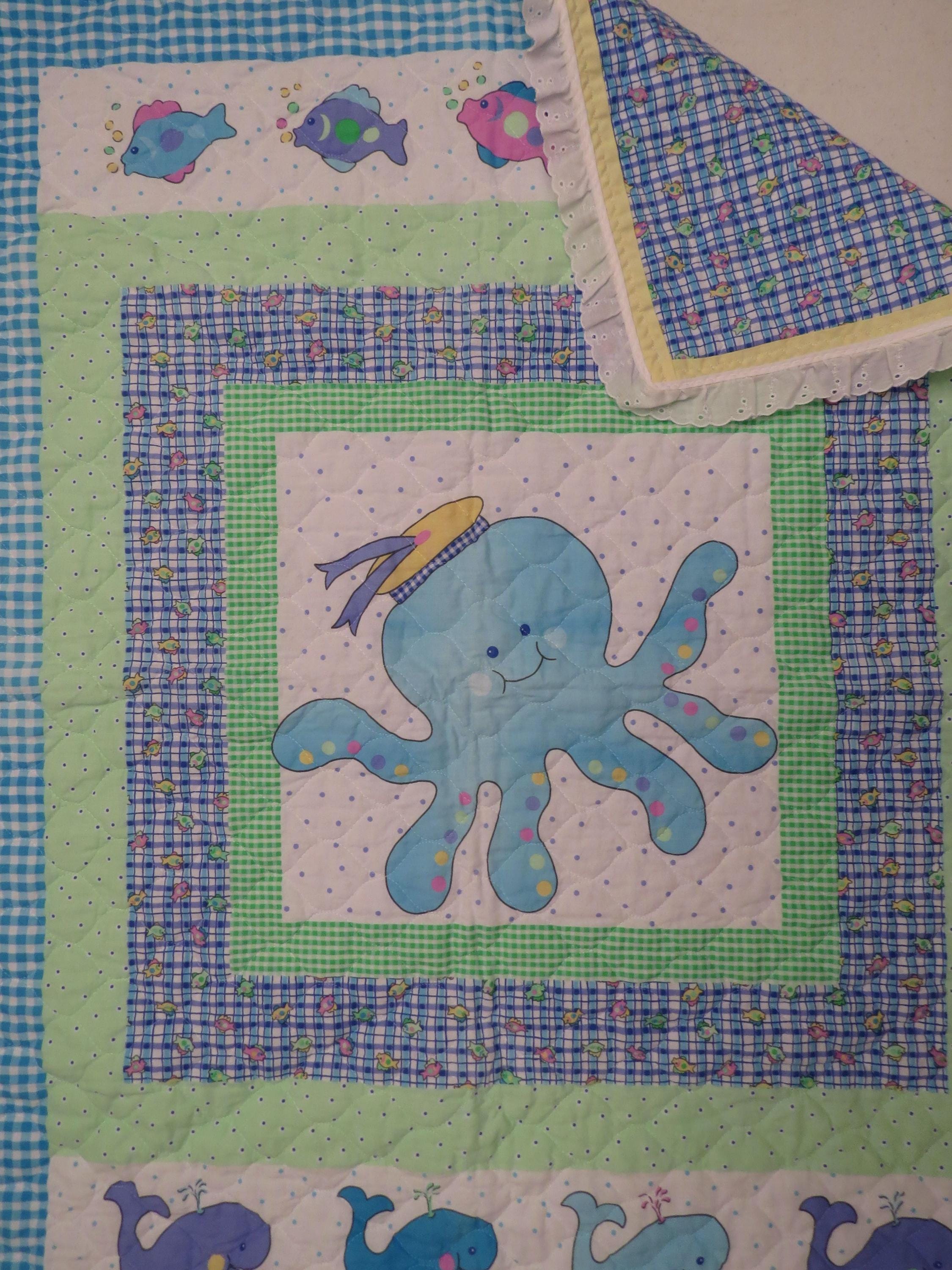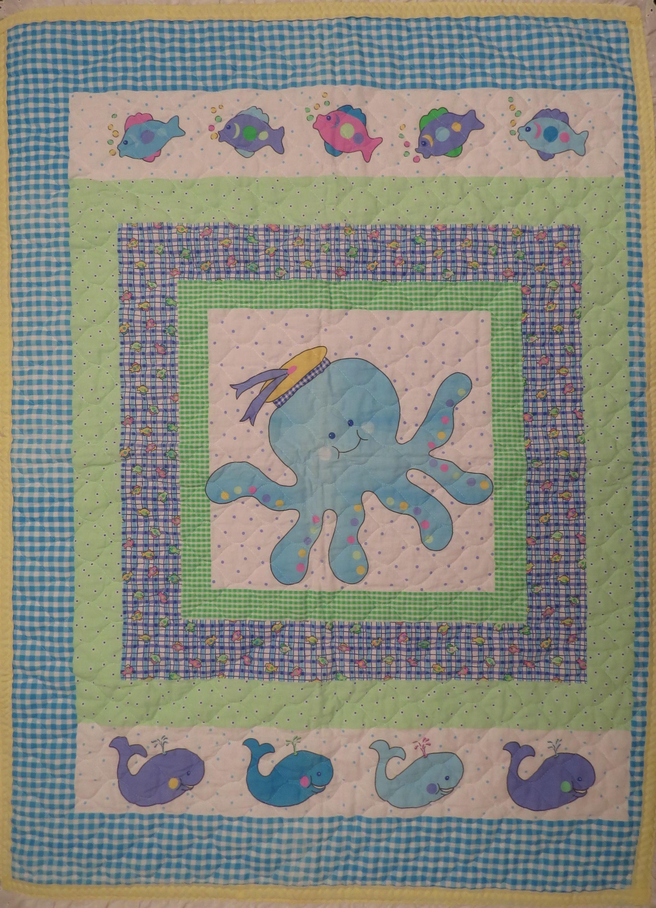 Vintage cute sea creatures small quilted blanket which is about 45" tall by 34" wide (114 cm by 86 cm). It is sewn unevenly around the edges, and the sides are not straight. It has a few thread snags, and a tiny mark. It looks a little faded in the middle on the front, and it is faded in areas on the backside.