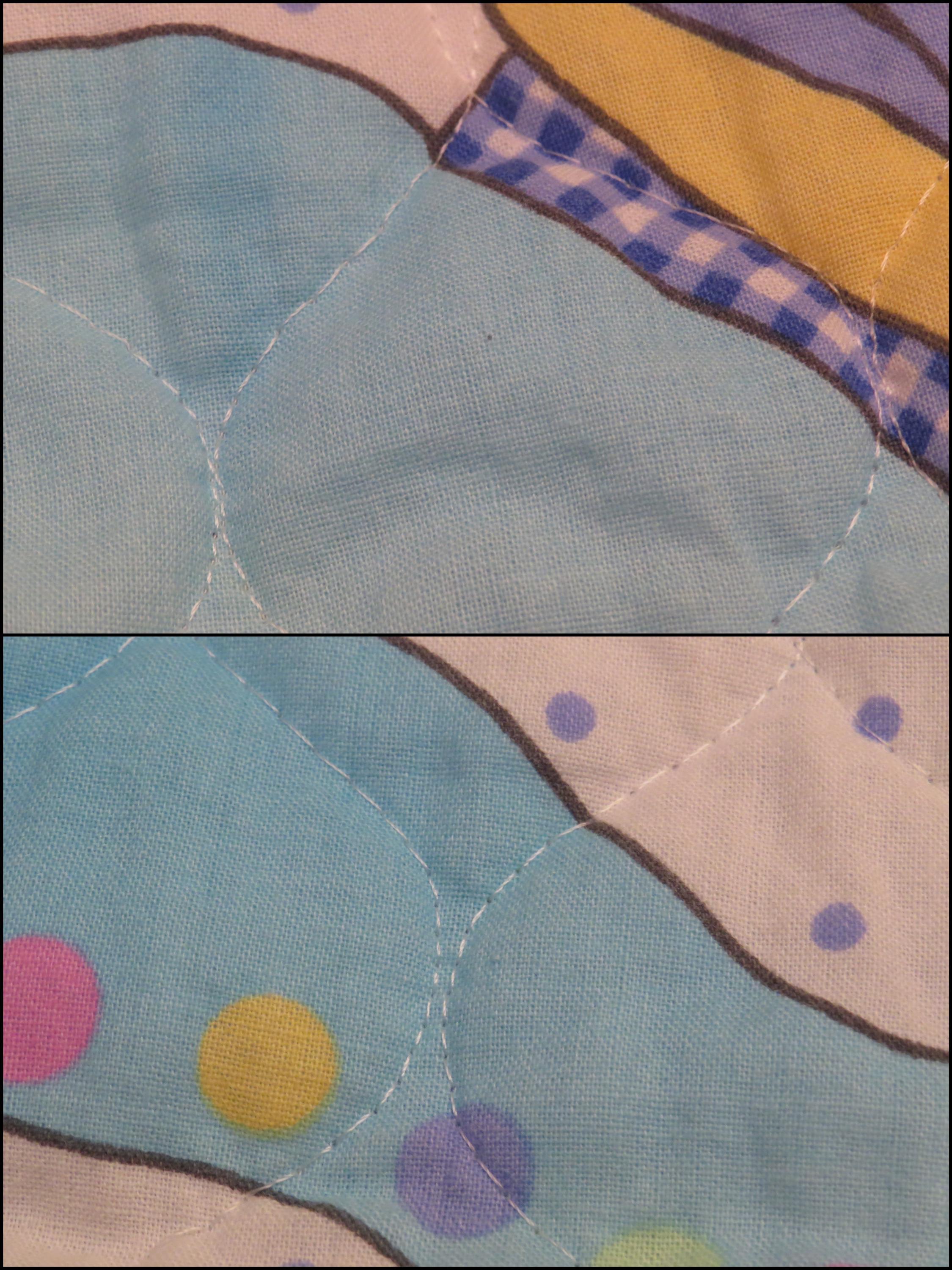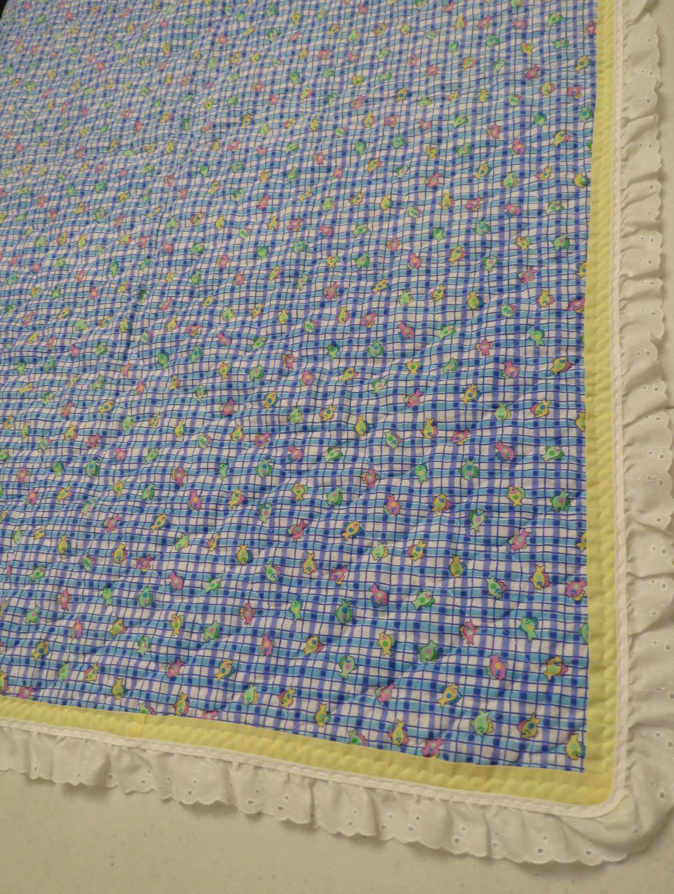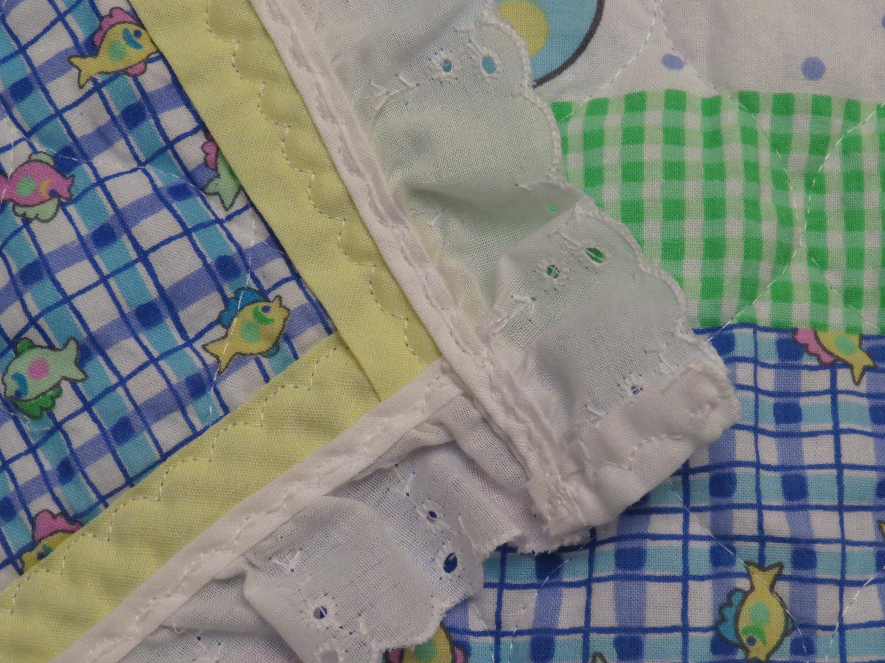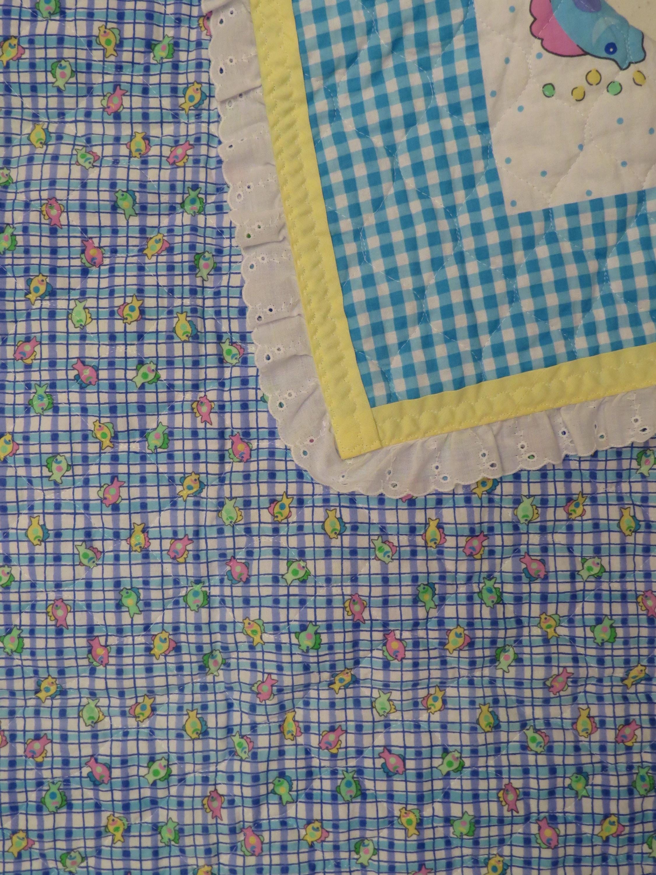 Vintage cute sea creatures small quilted blanket which is about 45" tall by 34" wide (114 cm by 86 cm). It is sewn unevenly around the edges, and the sides are not straight. It has a few thread snags, and a tiny mark. It looks a little faded in the middle on the front, and it is faded in areas on the backside.