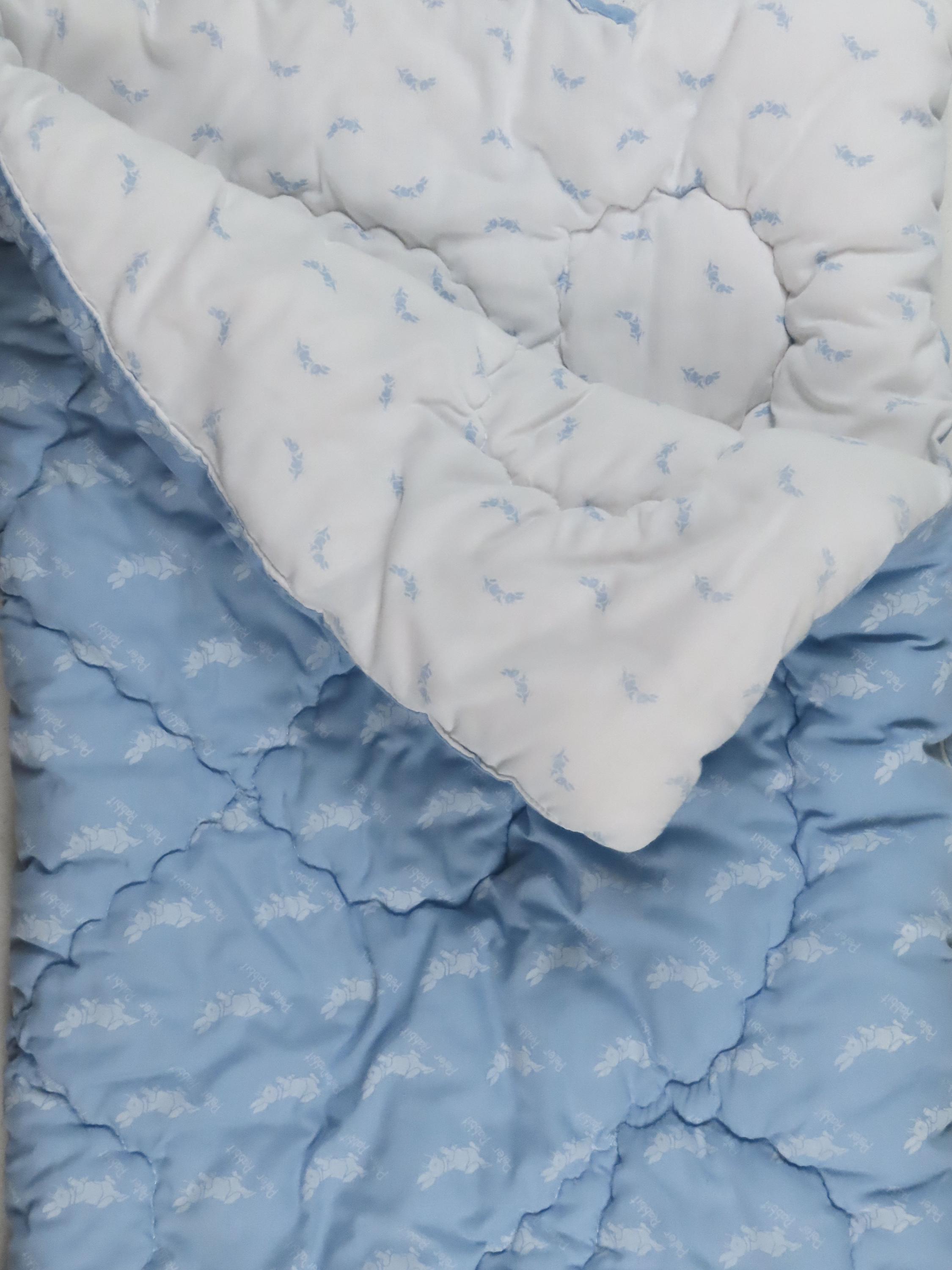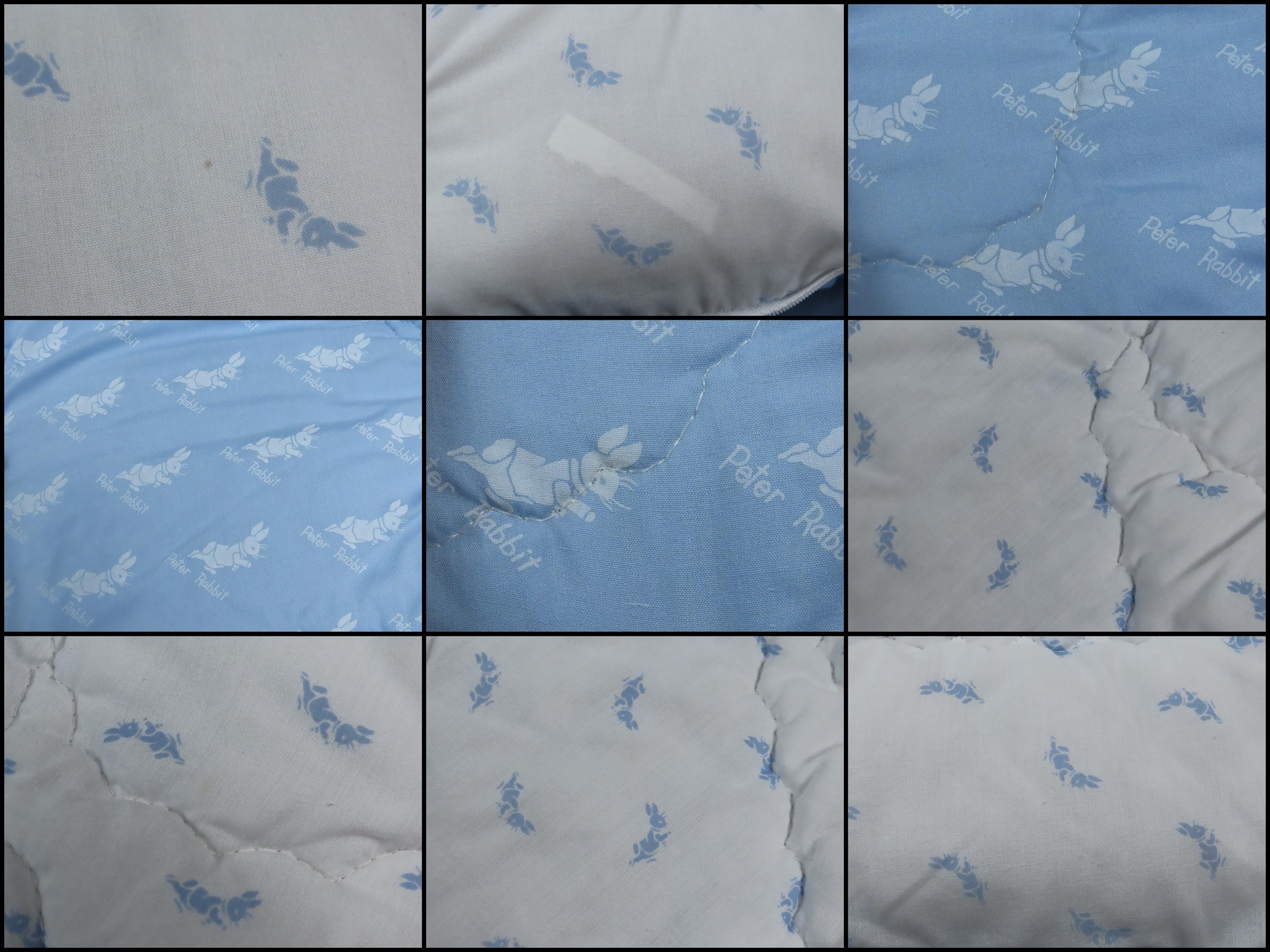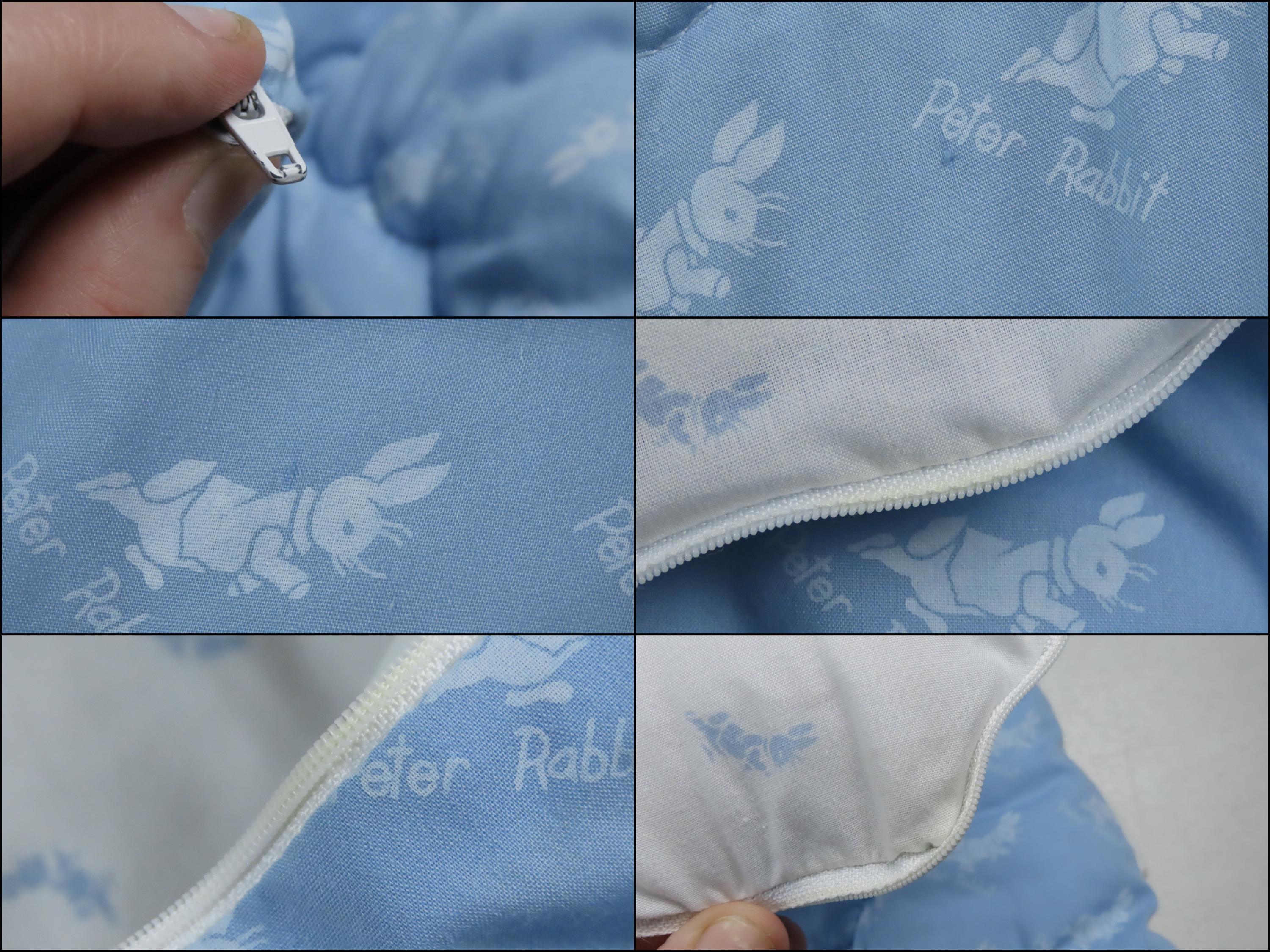 Vintage Beatrix Potter Peter Rabbit quilted zip-up blanket which is about 32" tall by 20" wide (82 cm by 52 cm) when zipped up. It is about 41" tall by 32" wide (103 cm by 82 cm) when unzipped laying flat. It is worn along the edges/stitching, a little faded in areas, and the filling has settled unevenly. The zipper pull has some missing paint, and it has some small yellowish stains along the zipper area on the edge.