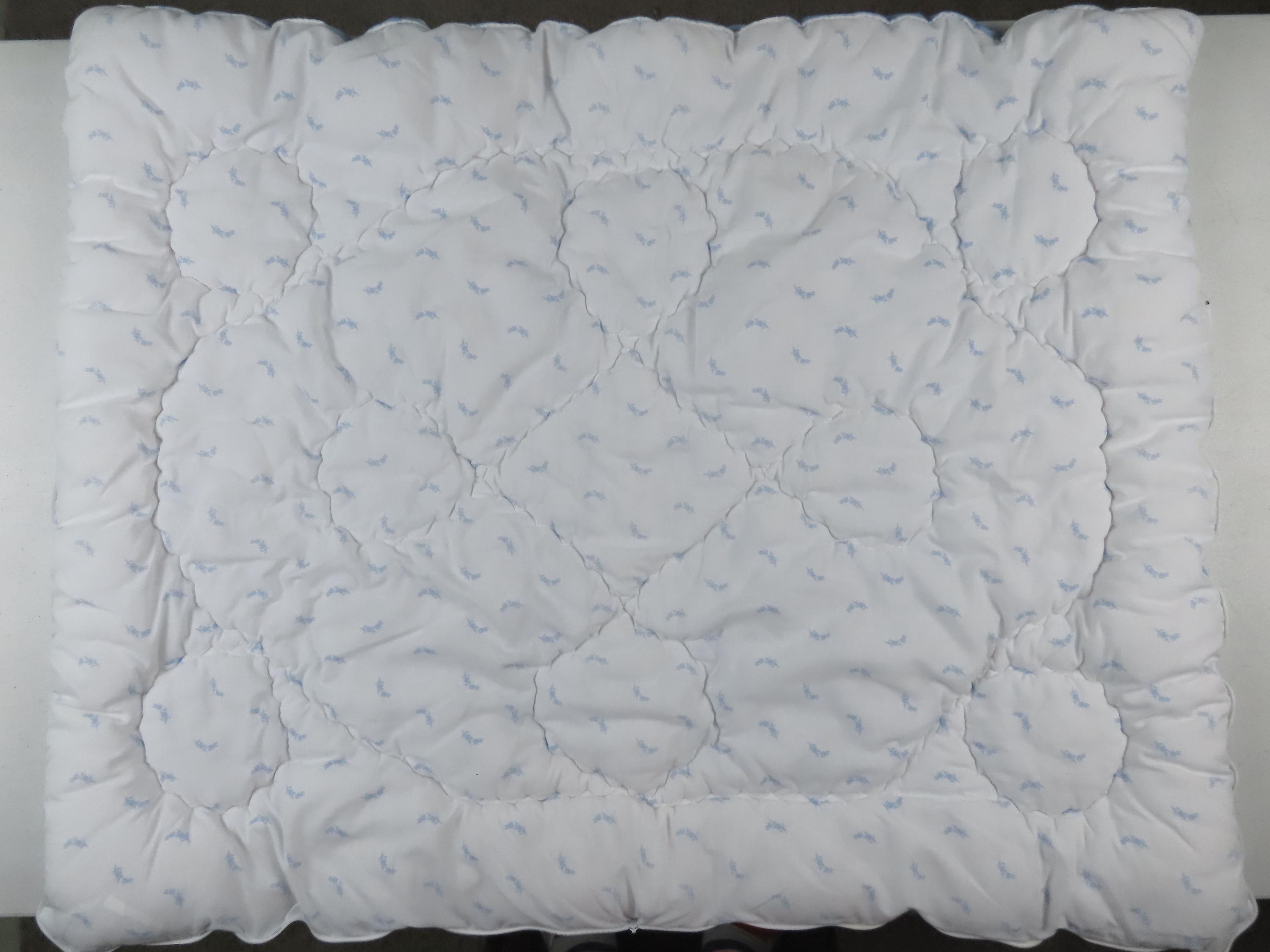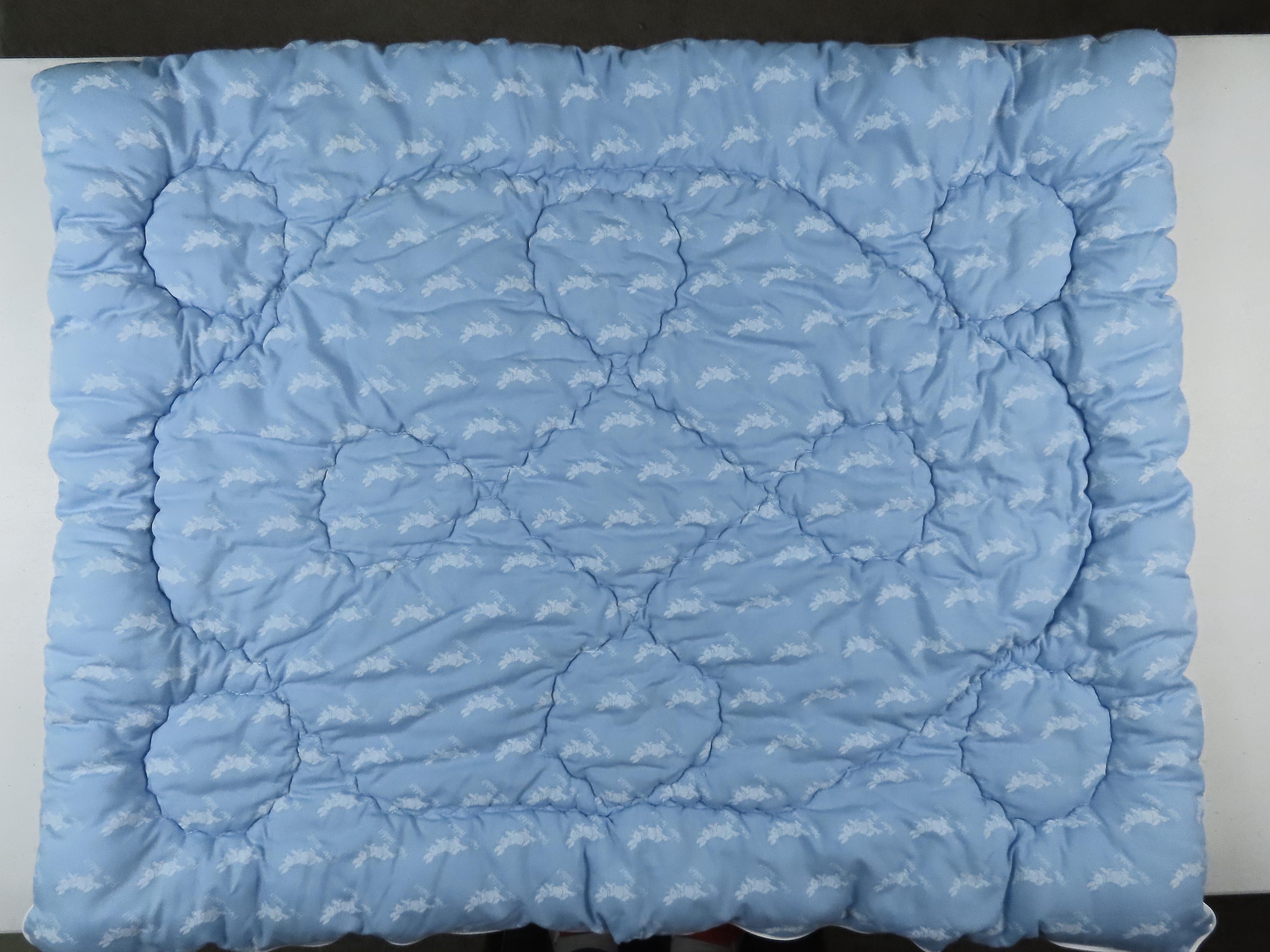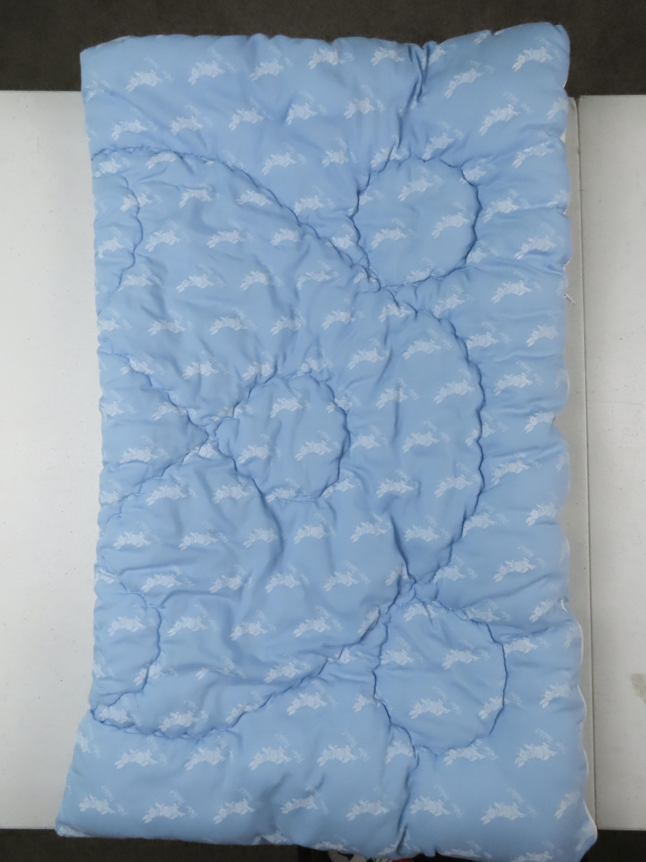 Vintage Beatrix Potter Peter Rabbit quilted zip-up blanket which is about 32" tall by 20" wide (82 cm by 52 cm) when zipped up. It is about 41" tall by 32" wide (103 cm by 82 cm) when unzipped laying flat. It is worn along the edges/stitching, a little faded in areas, and the filling has settled unevenly. The zipper pull has some missing paint, and it has some small yellowish stains along the zipper area on the edge.