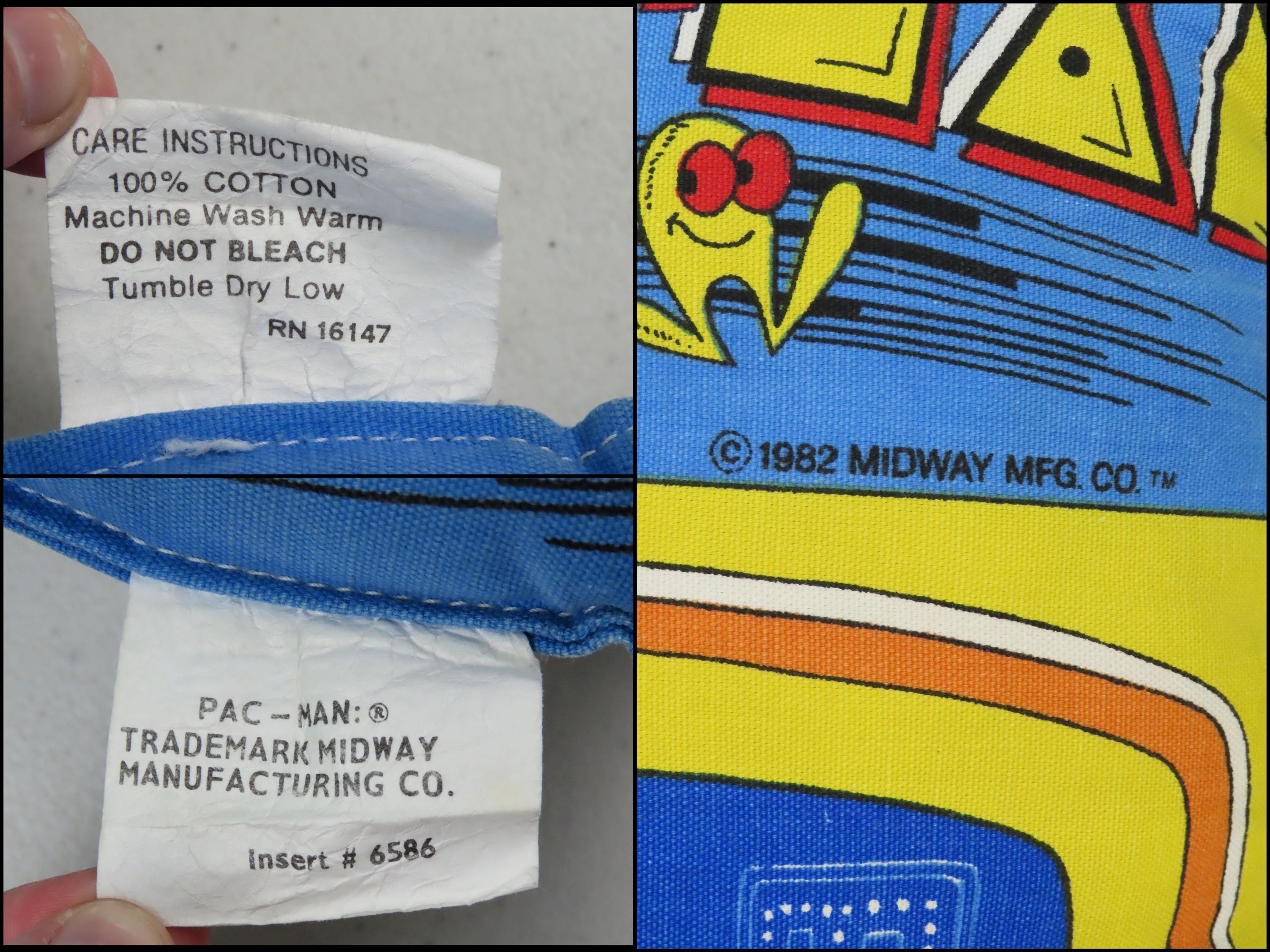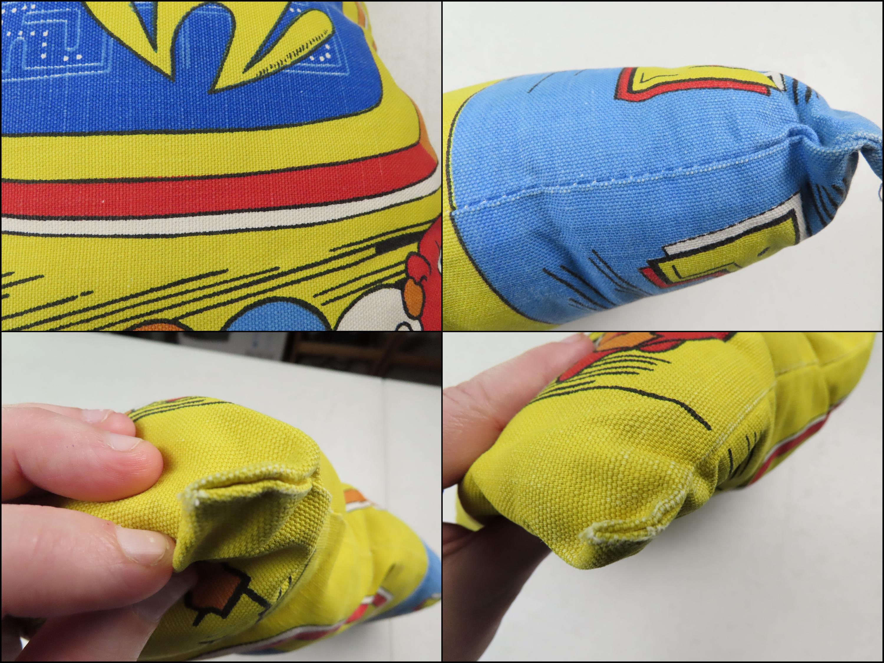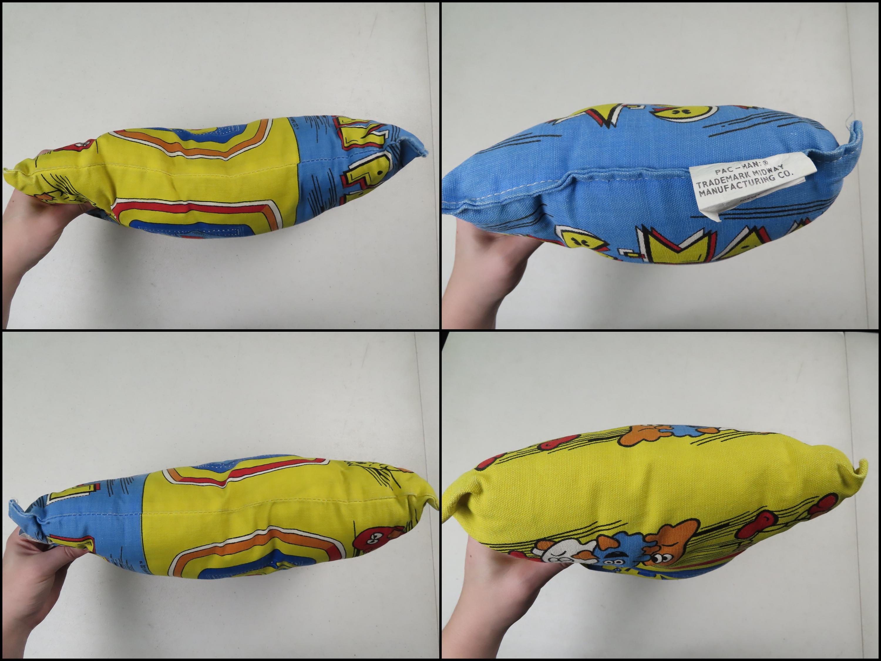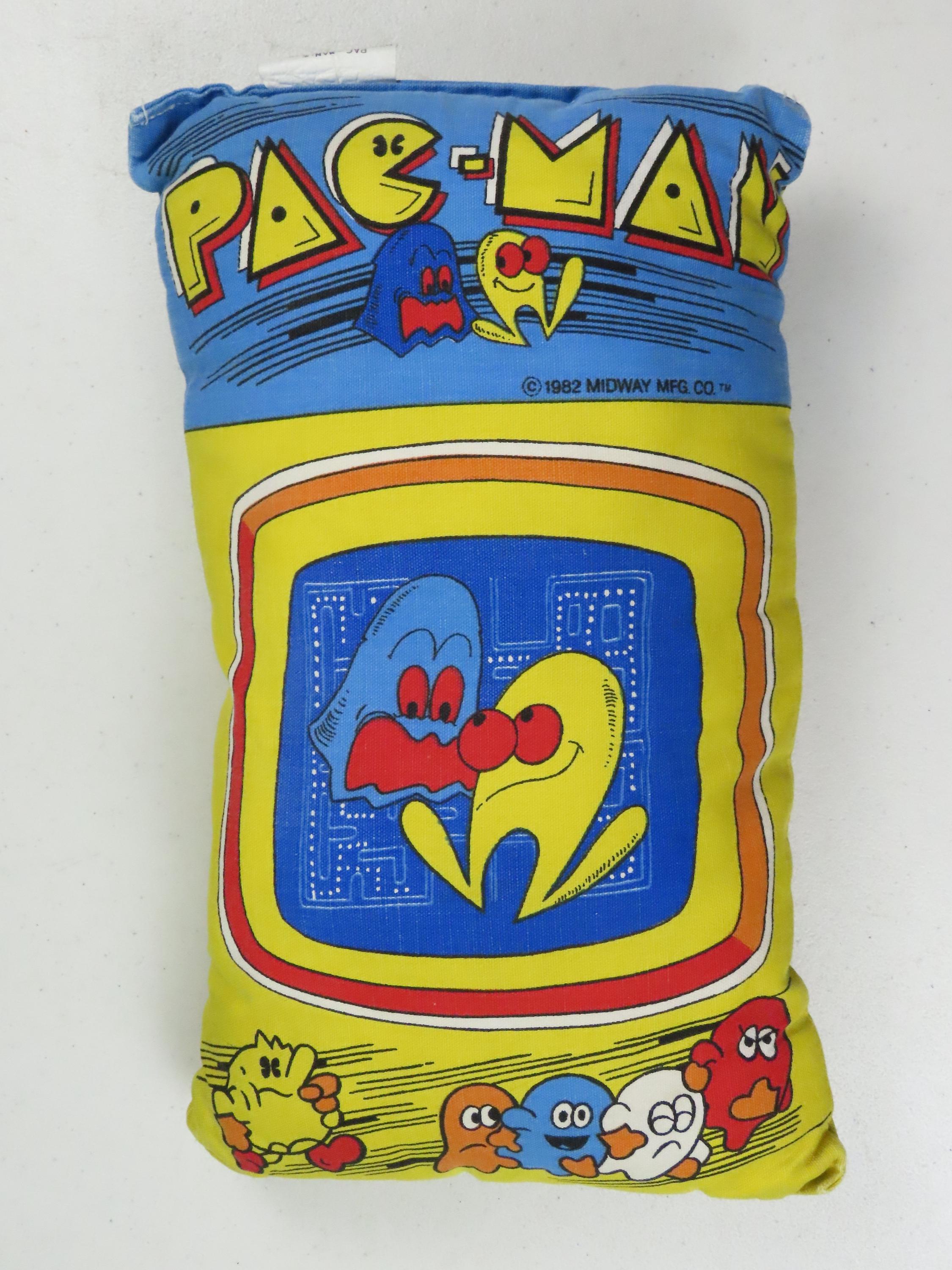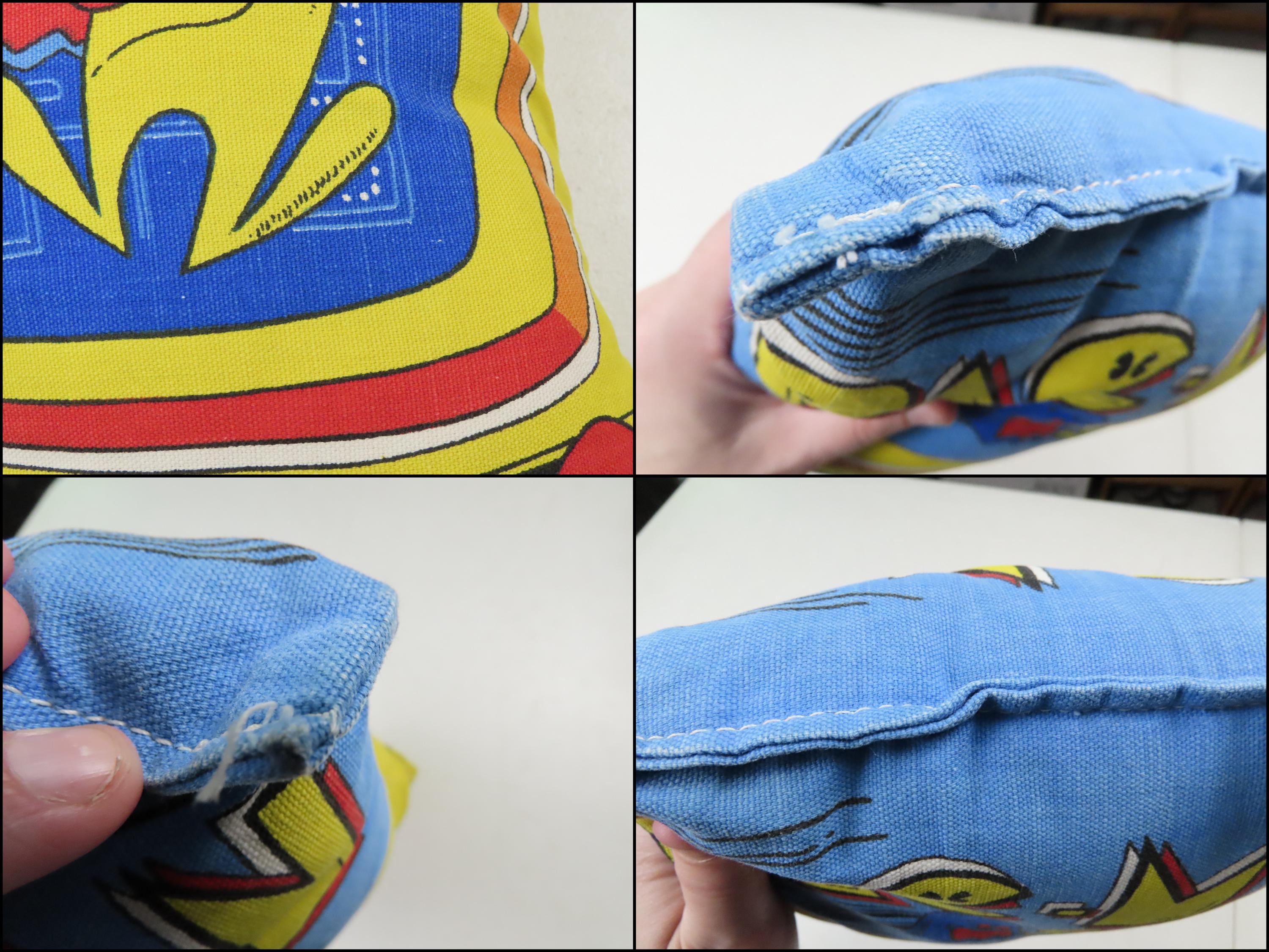 Vintage Pac-Man pillow from 1982 which is about 16" tall by 9" wide (41 cm by 25 cm). It is made from a heavier duty fabric, it feels like a canvas like texture. My camera had a hard time picking up the exact colors. The filling has settled unevenly, so it is lumpy. It has exposed stitching, tiny white marks, and it is a little faded in areas. It has some fraying on the corners, and it is worn along the edges/stitching.