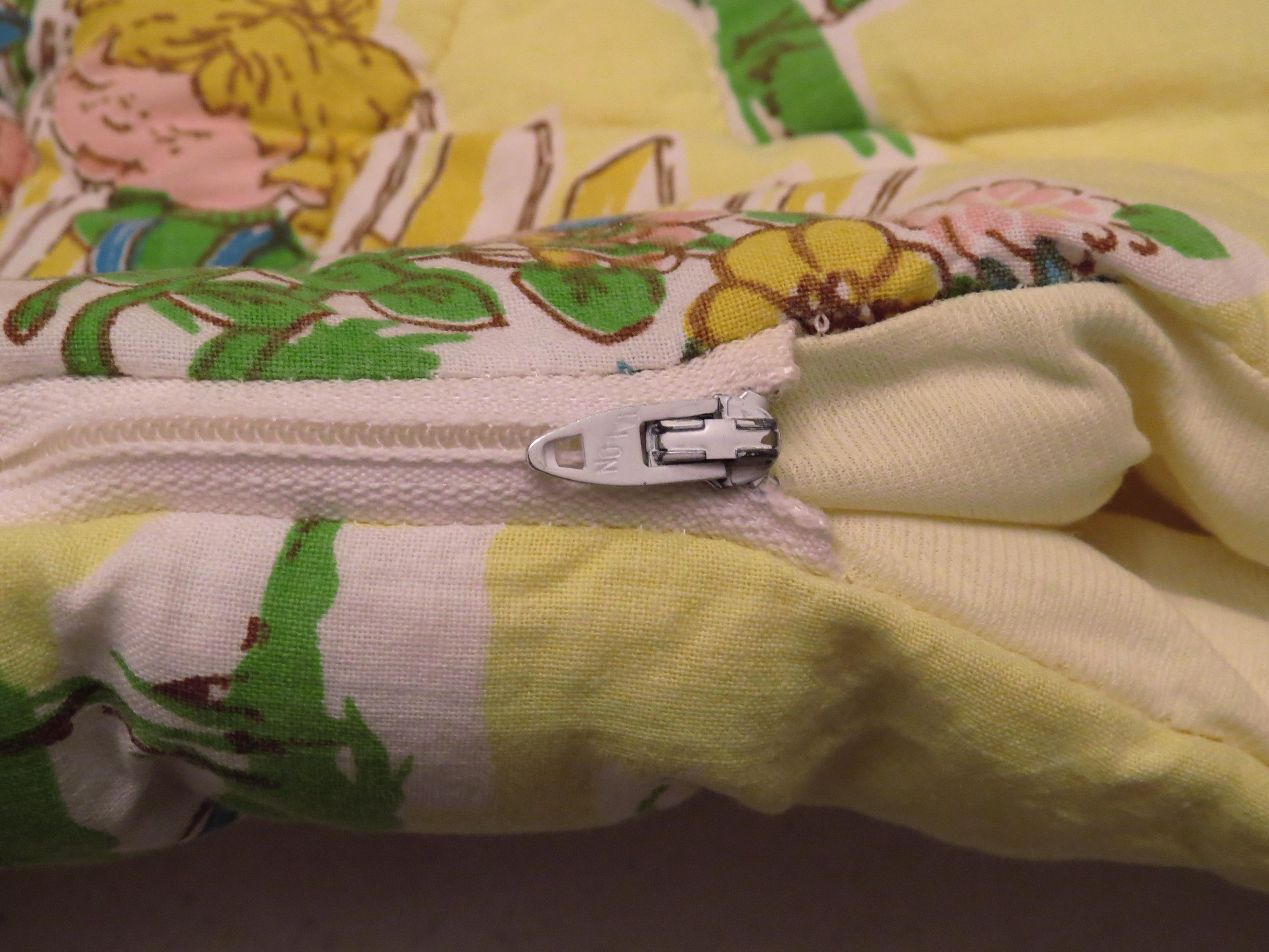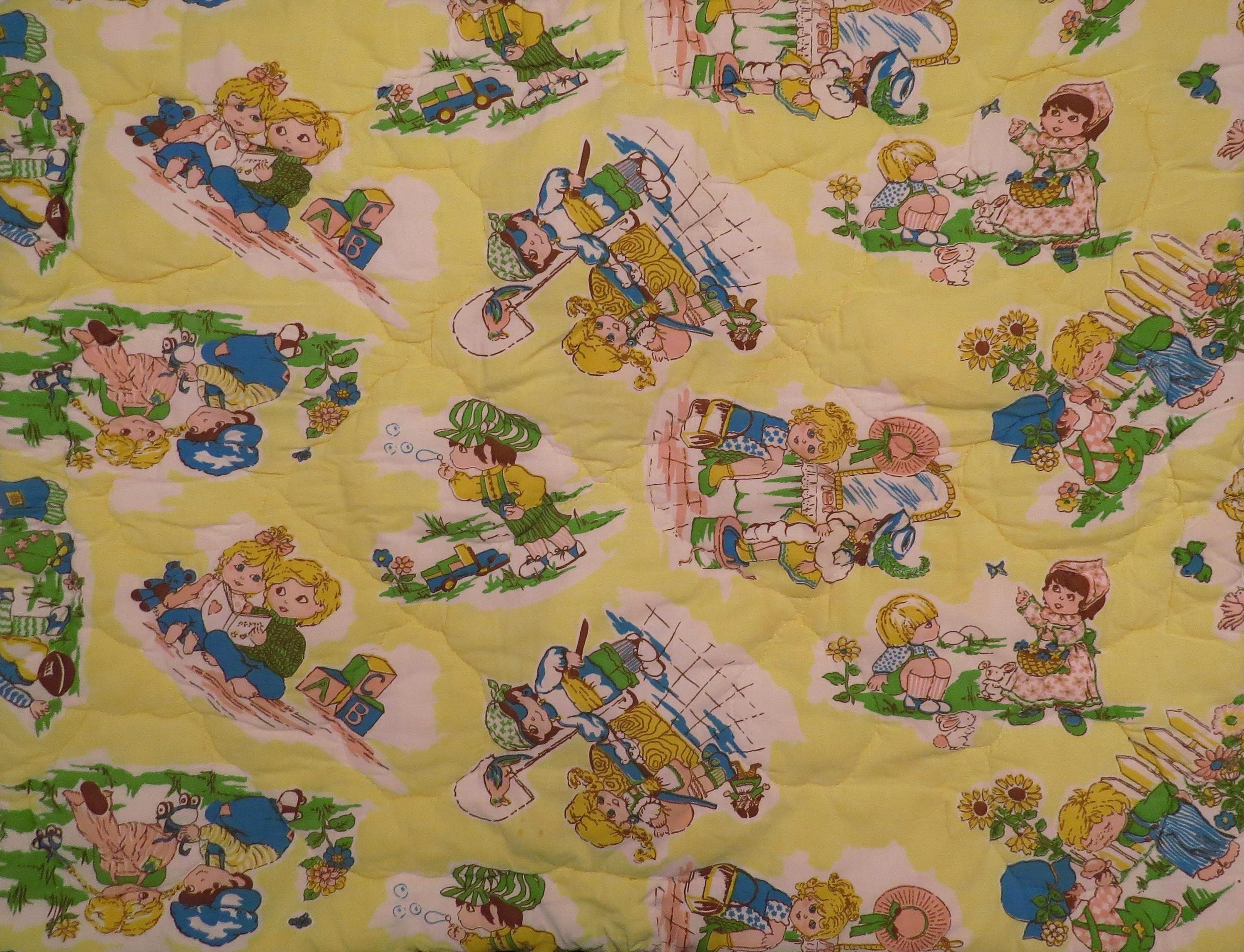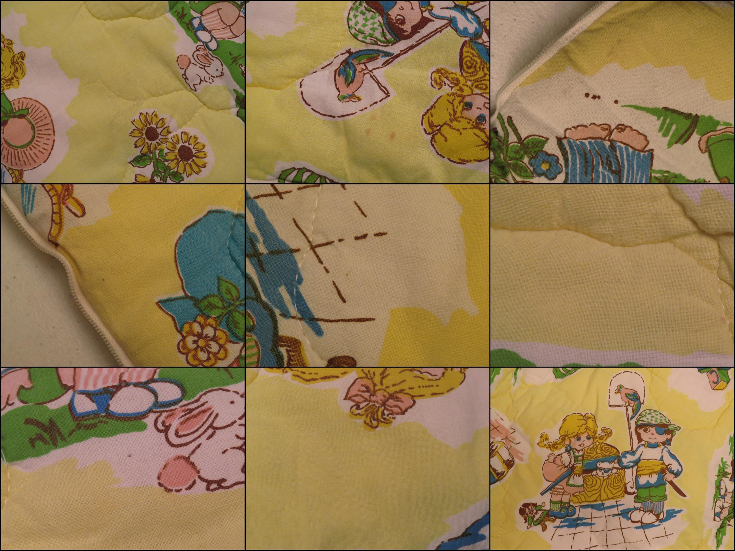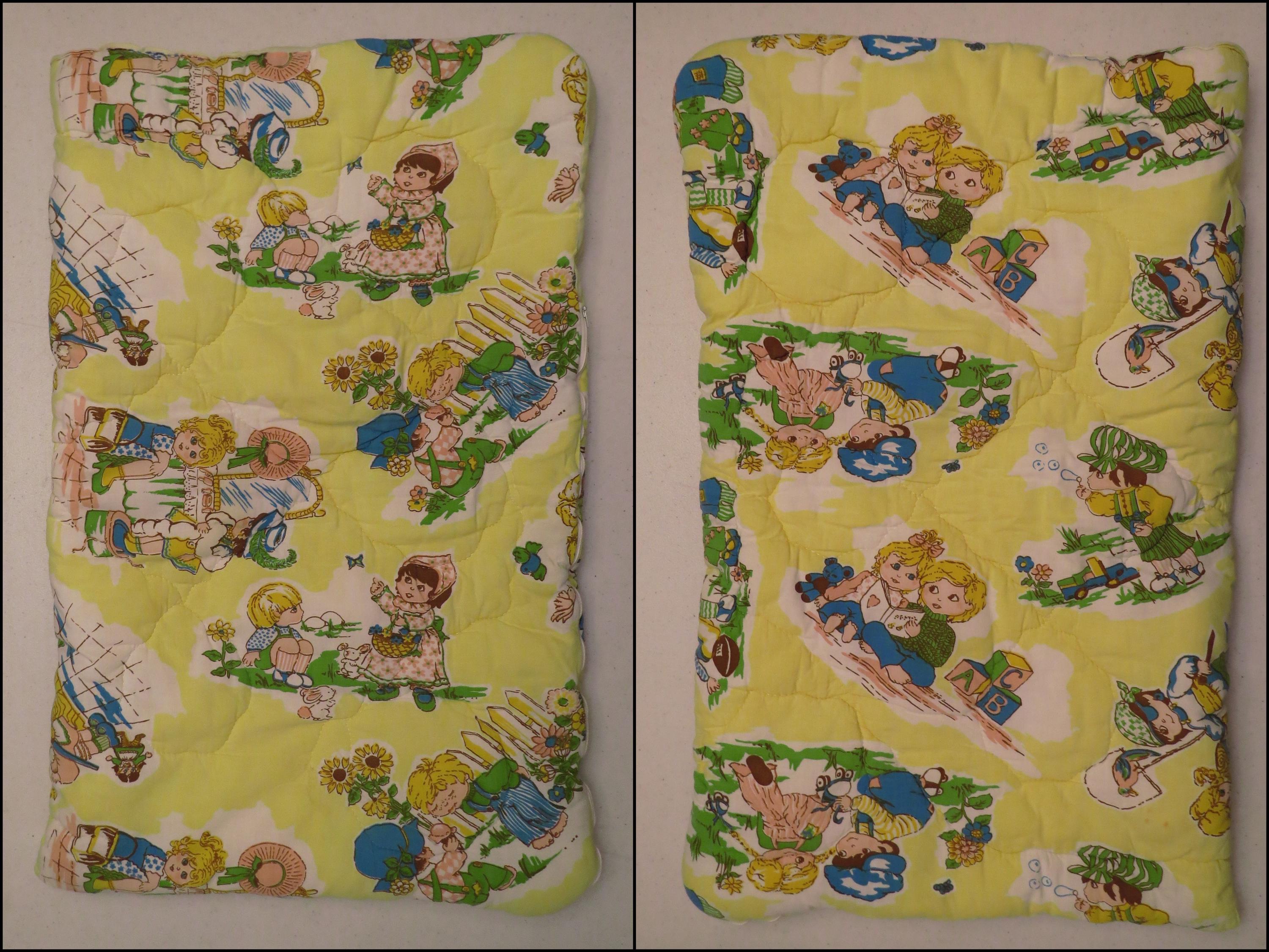 Vintage adorable children toddler sleeping bag which is about 30" tall by 19" wide when zipped up. It is about 40" by 31" unzipped. There is some stitching that is undone, and the filling has settled unevenly. It is a little faded in areas, has tiny marks, and there are stains throughout both sides.
