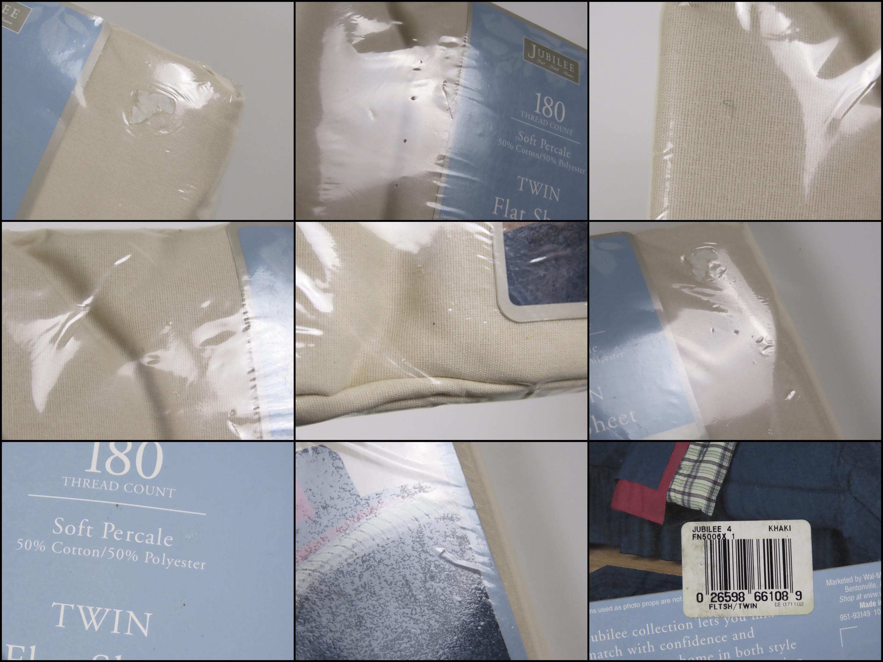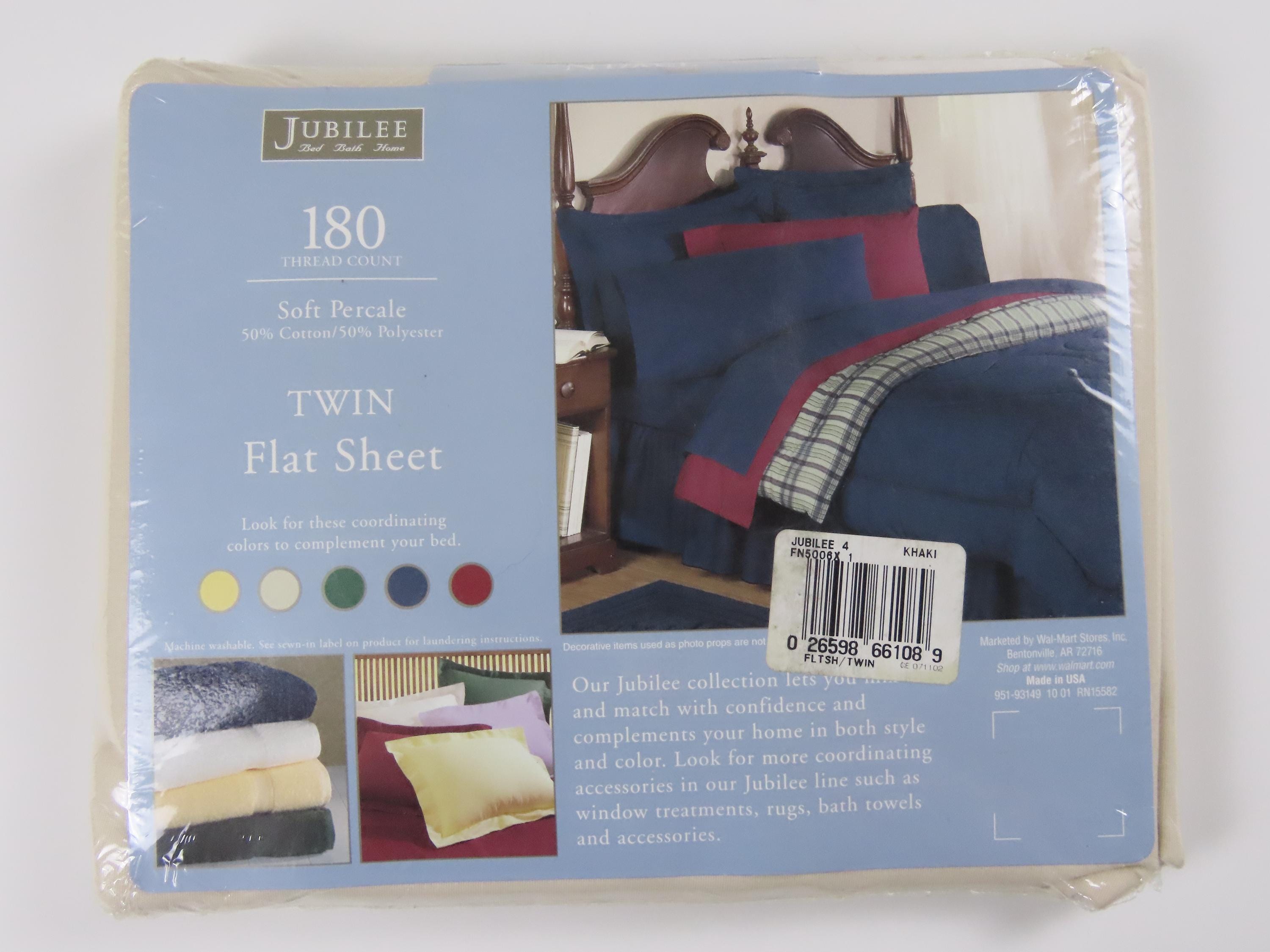 Vintage Jubilee "Khaki" twin flat sheet from 2002 which is new in the package. It has a 180 thread count, and is 50% cotton/50% polyester. The plastic has some old sticker residue, scratches, and marks/scuffs. The plastic packaging is worn, has a few tiny holes, and some loose dust/debris has gotten inside the packaging.