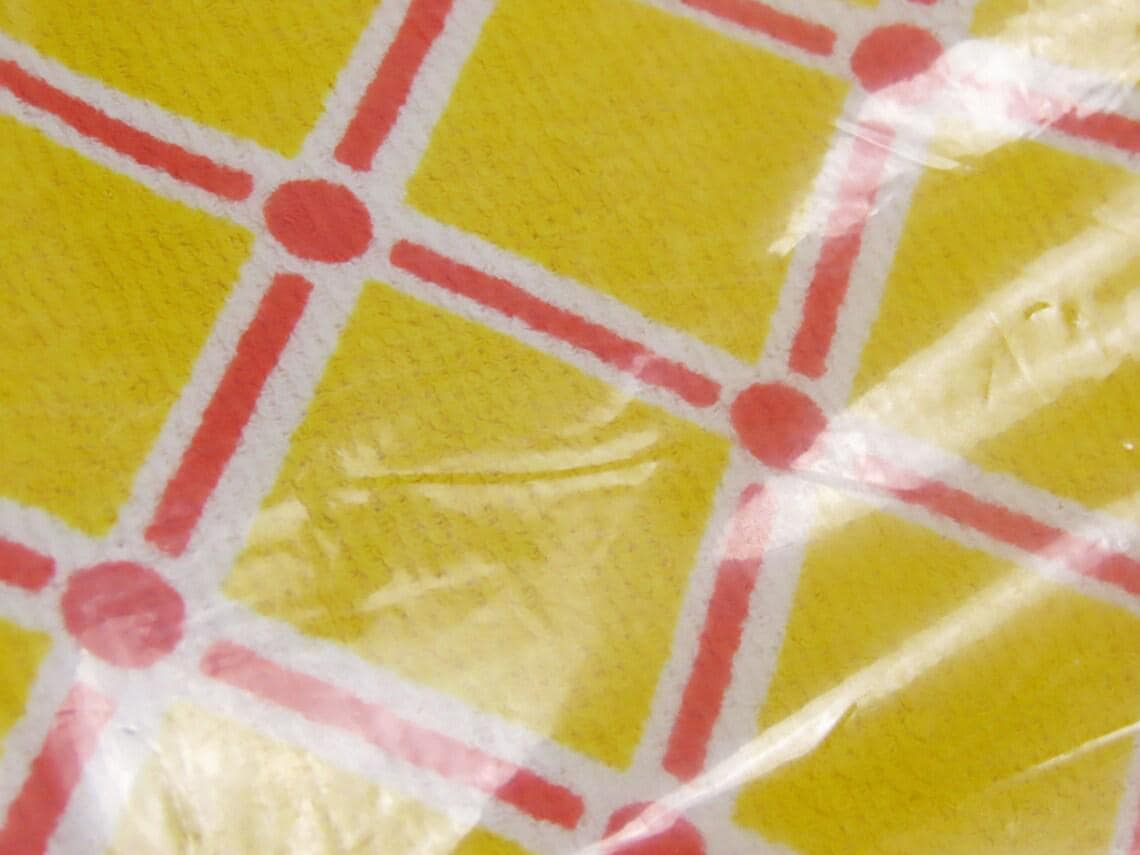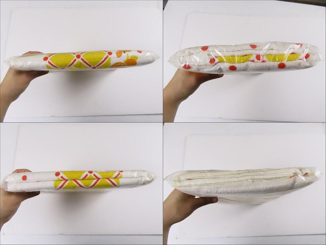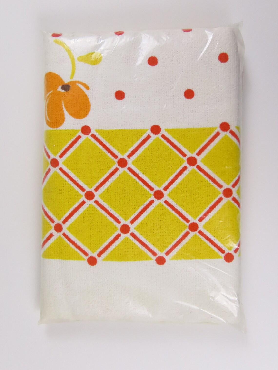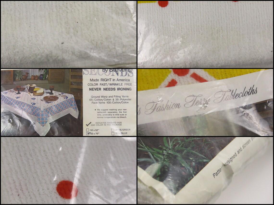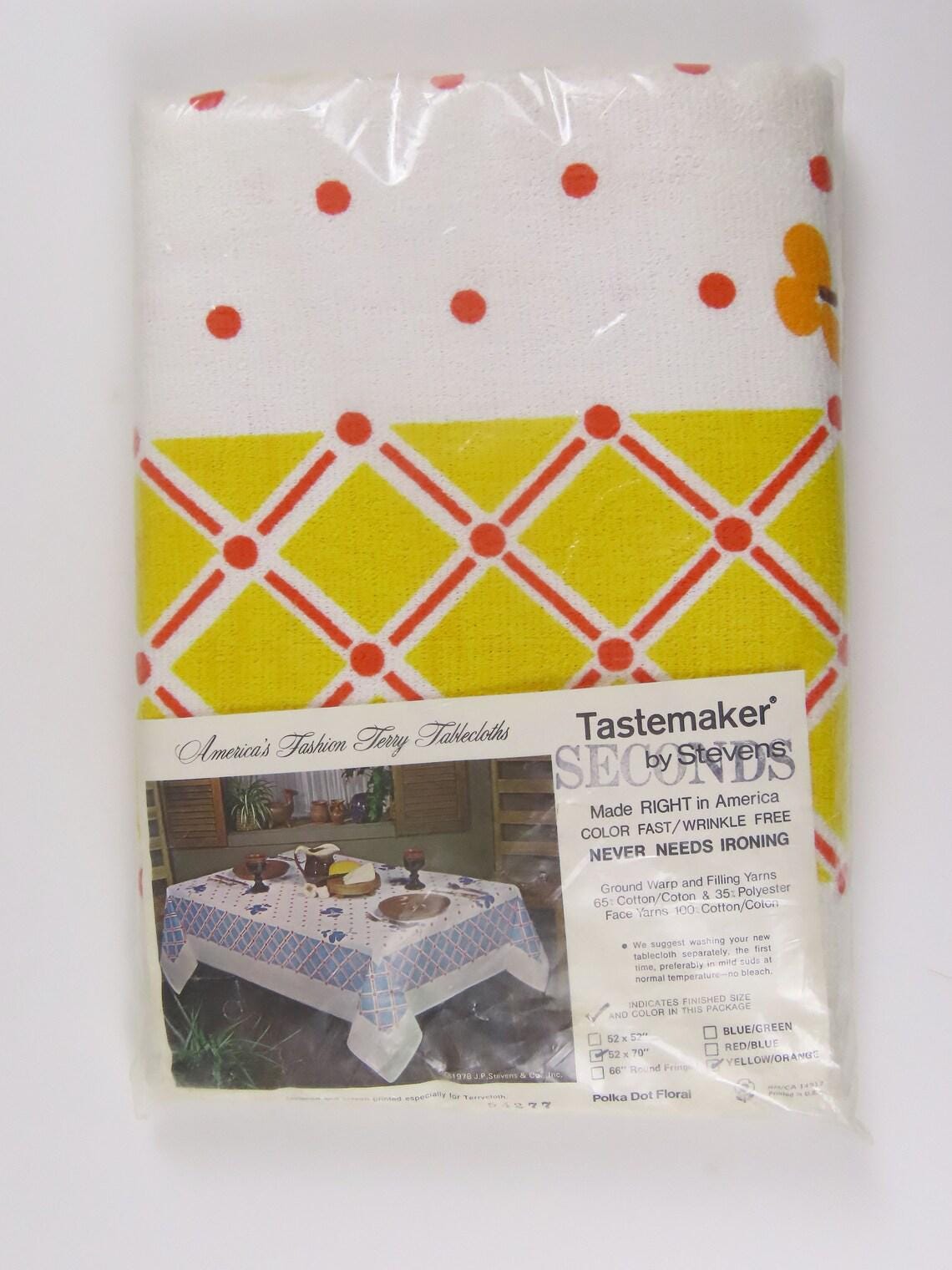 Vintage Tastemaker by Stevens polka dot floral terry tablecloth from 1978 which is new in the package. It is marked as "Seconds" so it might have some sort of flaw in manufacturing. My camera had a hard time picking up the exact colors. It is a rectangle at 52" by 70". The ground warp and filling yarns are 65% cotton and 35% polyester. The face yarn is 100% cotton. The plastic packaging is worn. The plastic has marks, scuffs, and old sticker residue. There are a few small holes in the plastic, and some loose dust/debris inside the packaging. The backside towards the bottom looks slightly discolored, but I can't tell if its the fabric, or the yellowing plastic.