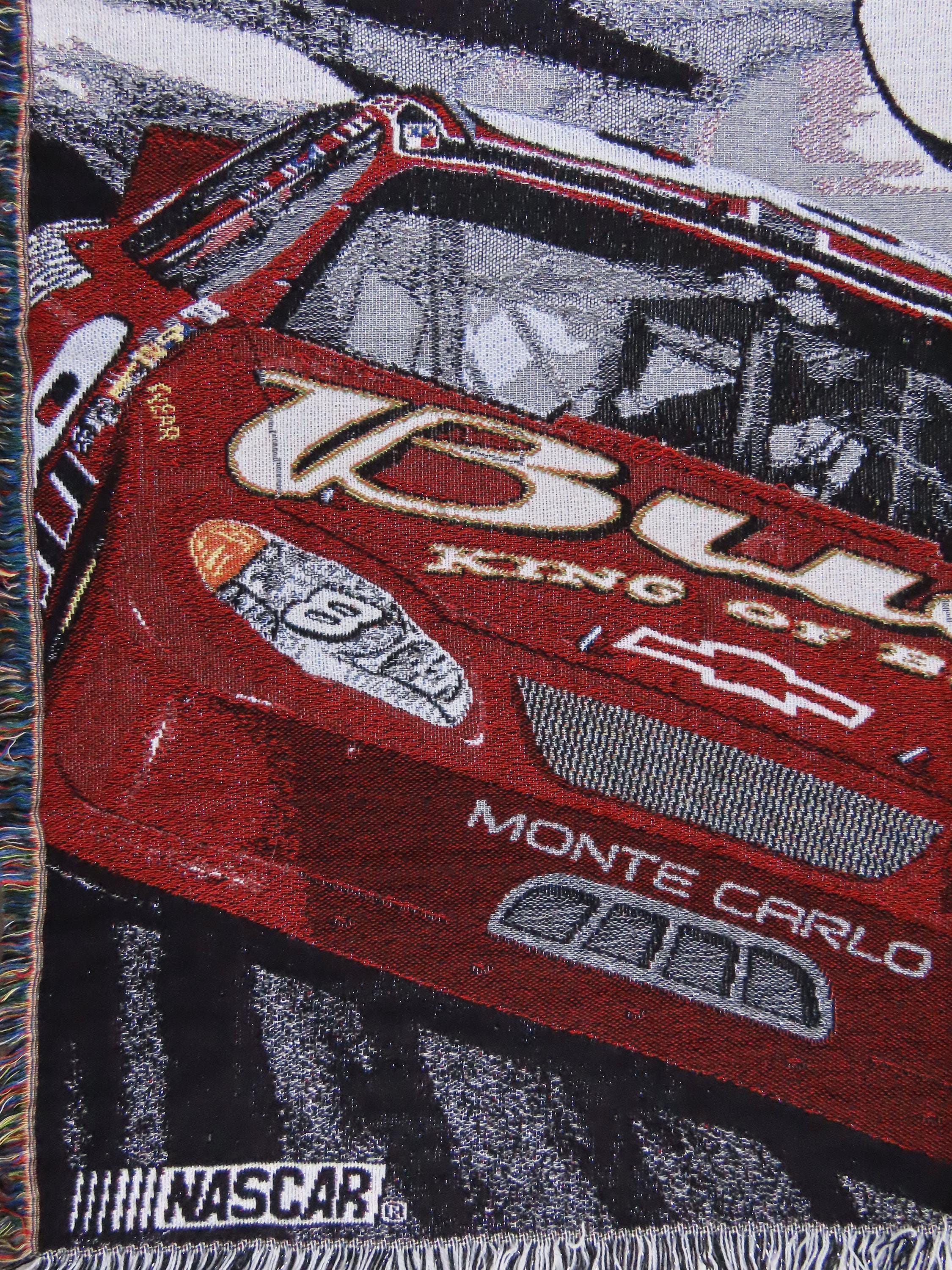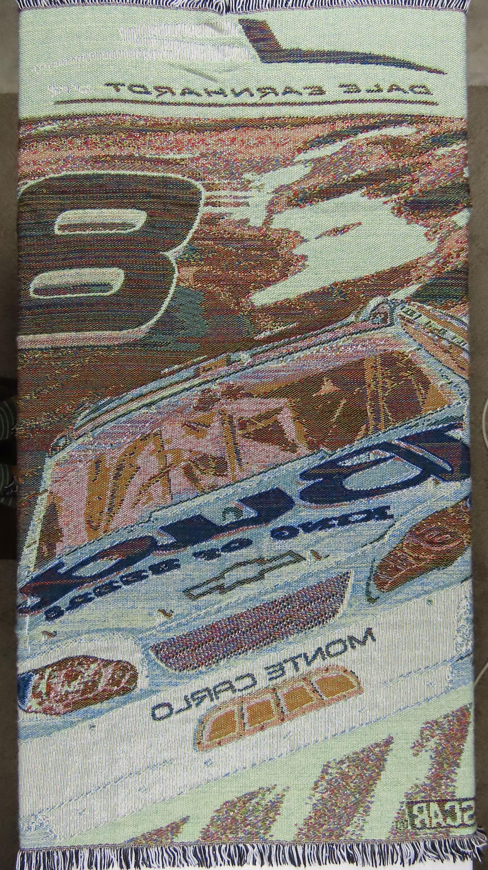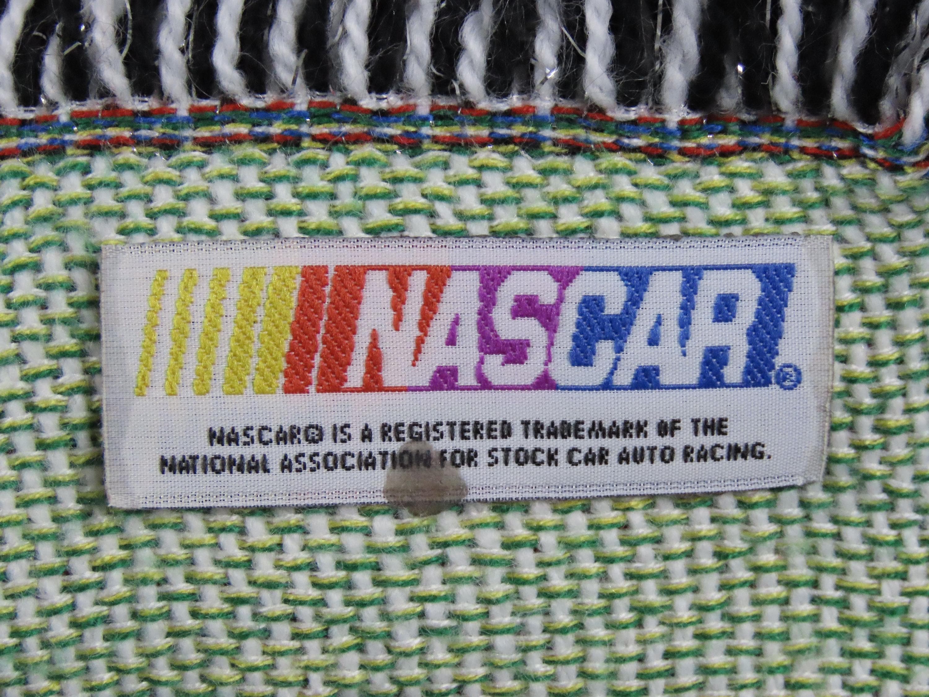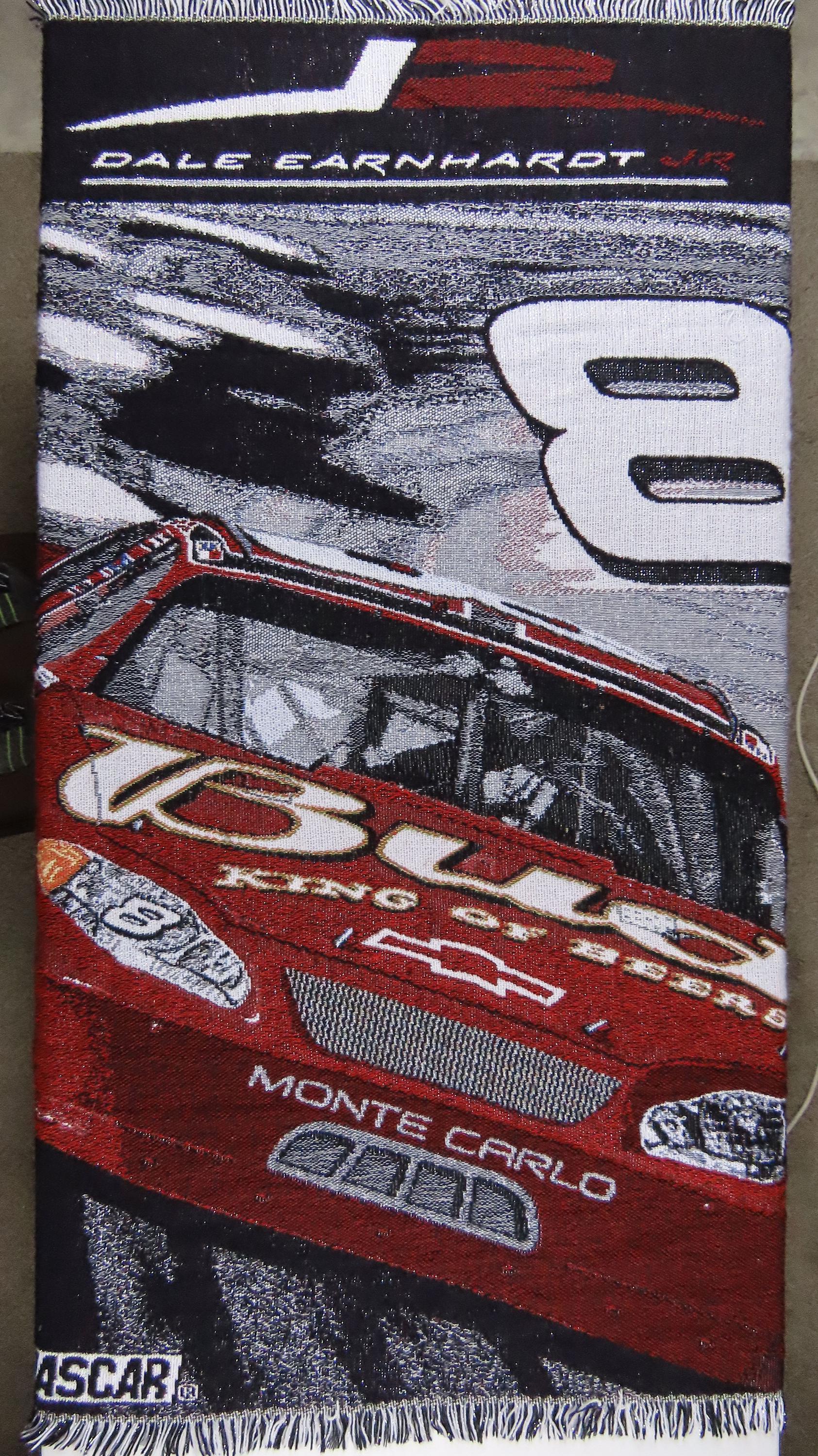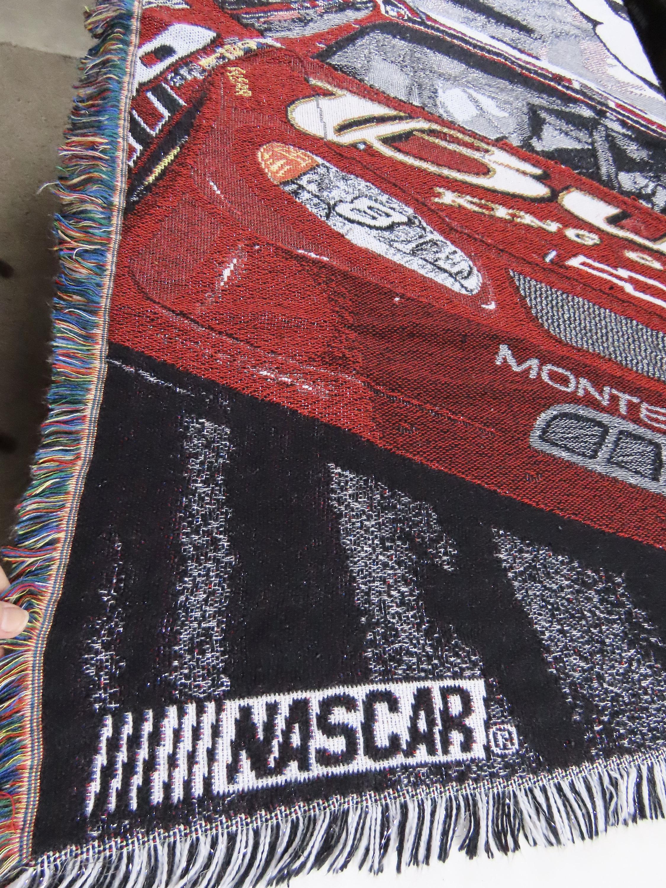 Vintage Nascar Dale Earnhardt Jr woven tapestry blanket which is 100% acrylic. It is about 58" tall by 47" wide (147 cm by 109 cm) which includes the decorative fringe edge. It has shiny silver fibers throughout. My camera had a hard time picking up the exact colors, especially the red. The blanket does not want to lay completely flat, and ripples some.