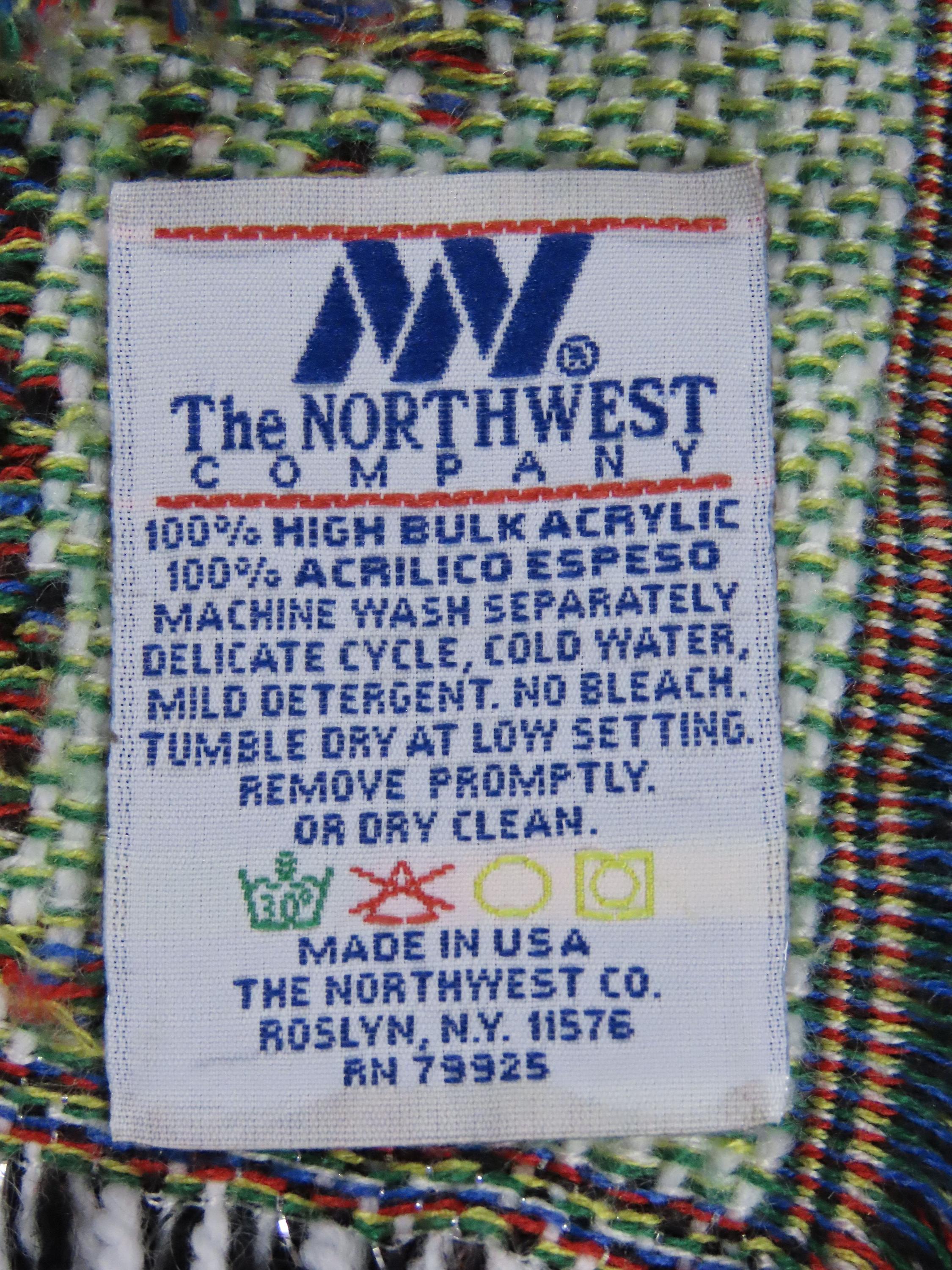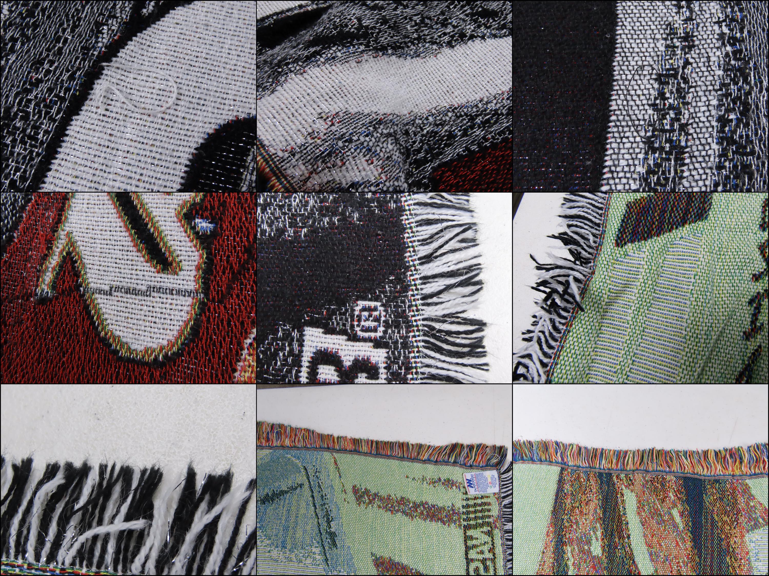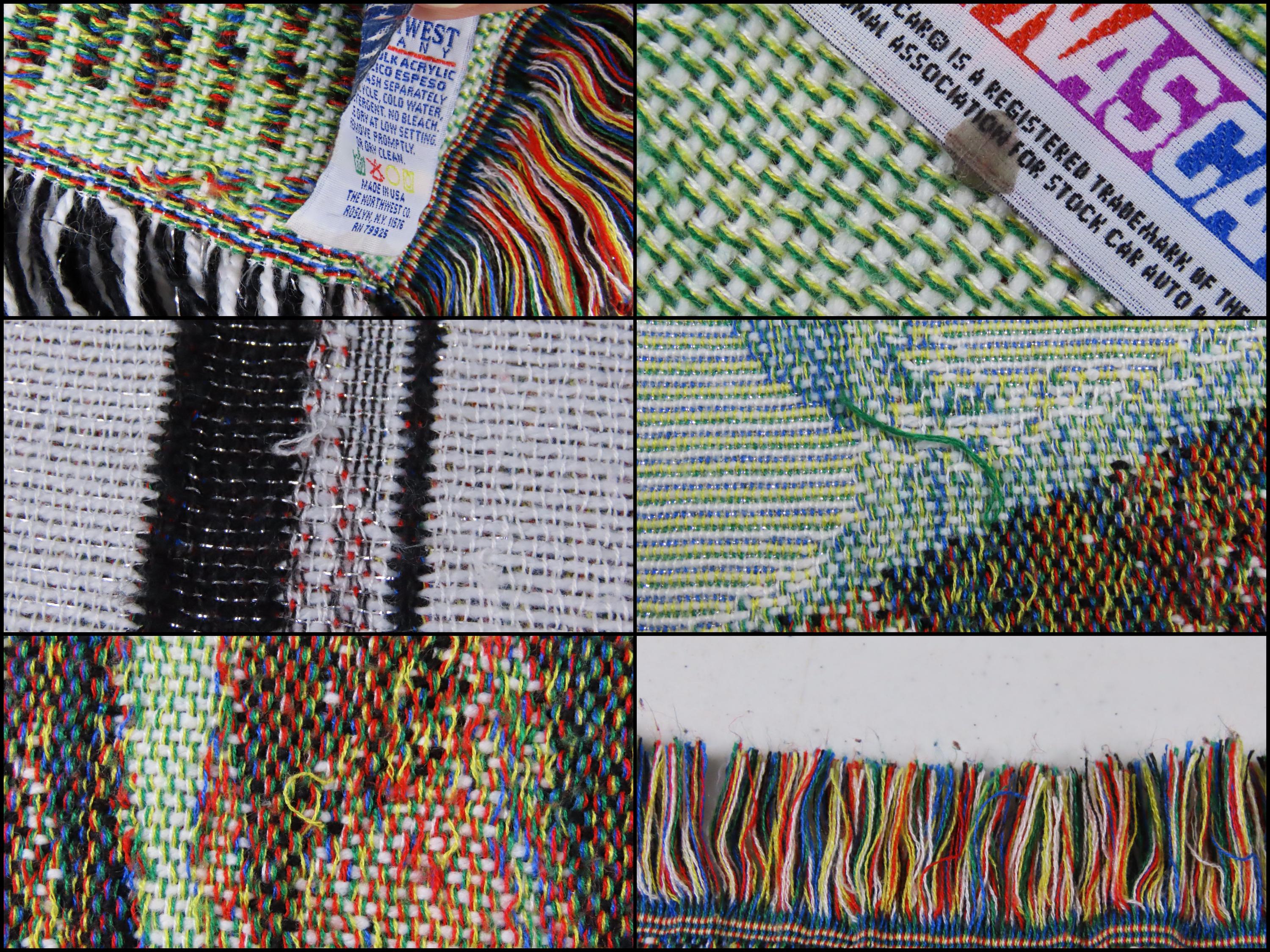 It has some loose/pulled fibers, missing fiber spots, and pilling in areas. The stitching on the Northwest tag is undone in areas, and there is a small stain on the Nascar tag. The decorative fringe edge is worn, some lint has stuck to the tips, and it is not a consistent even length along the edges.