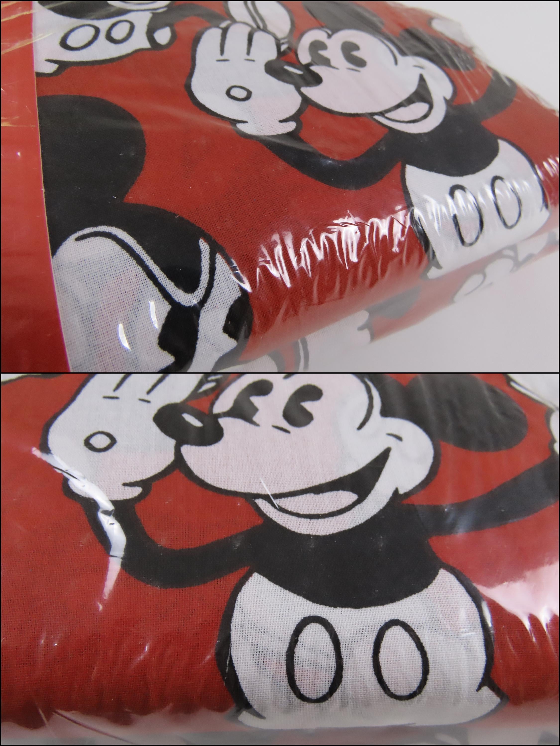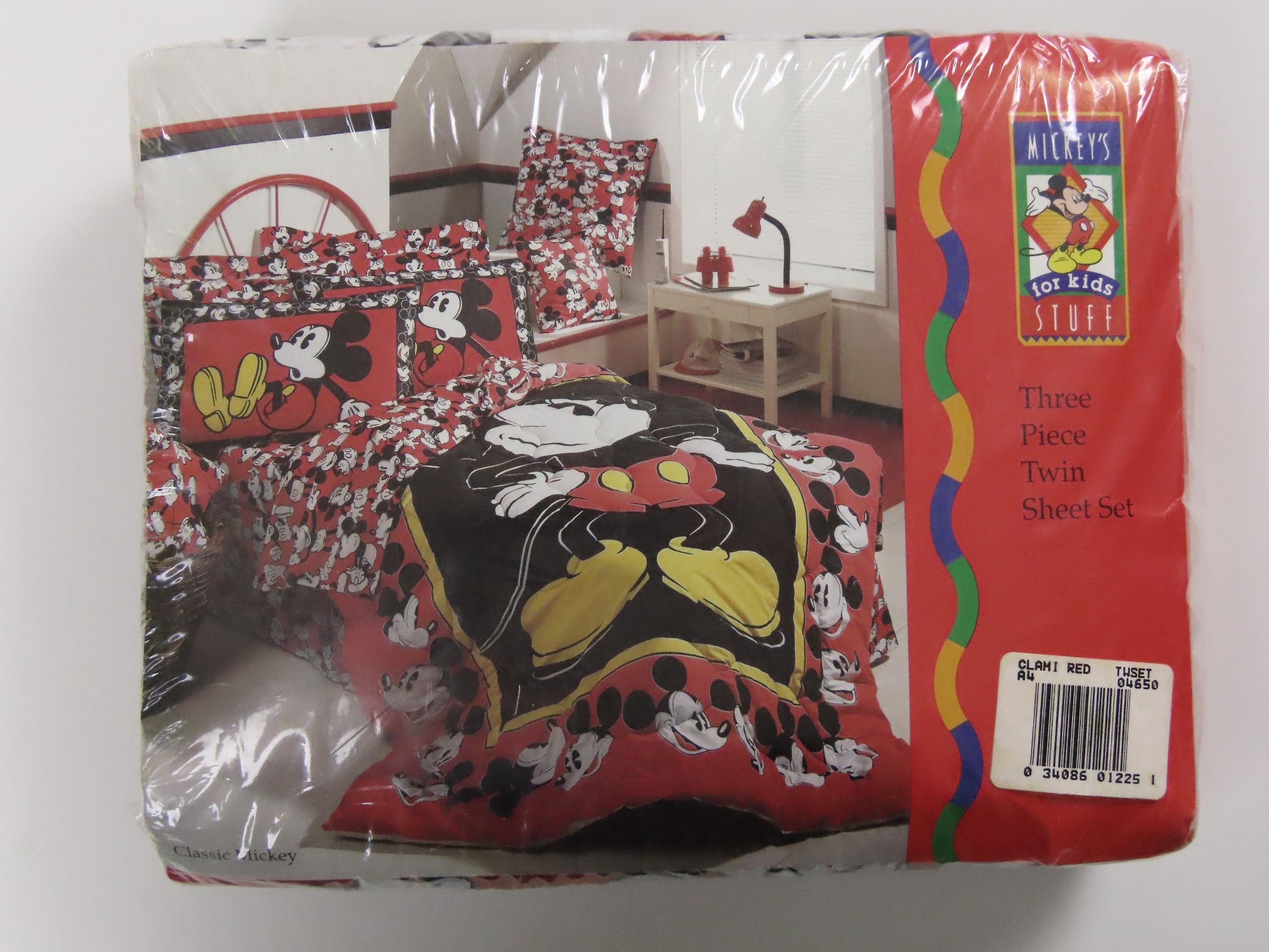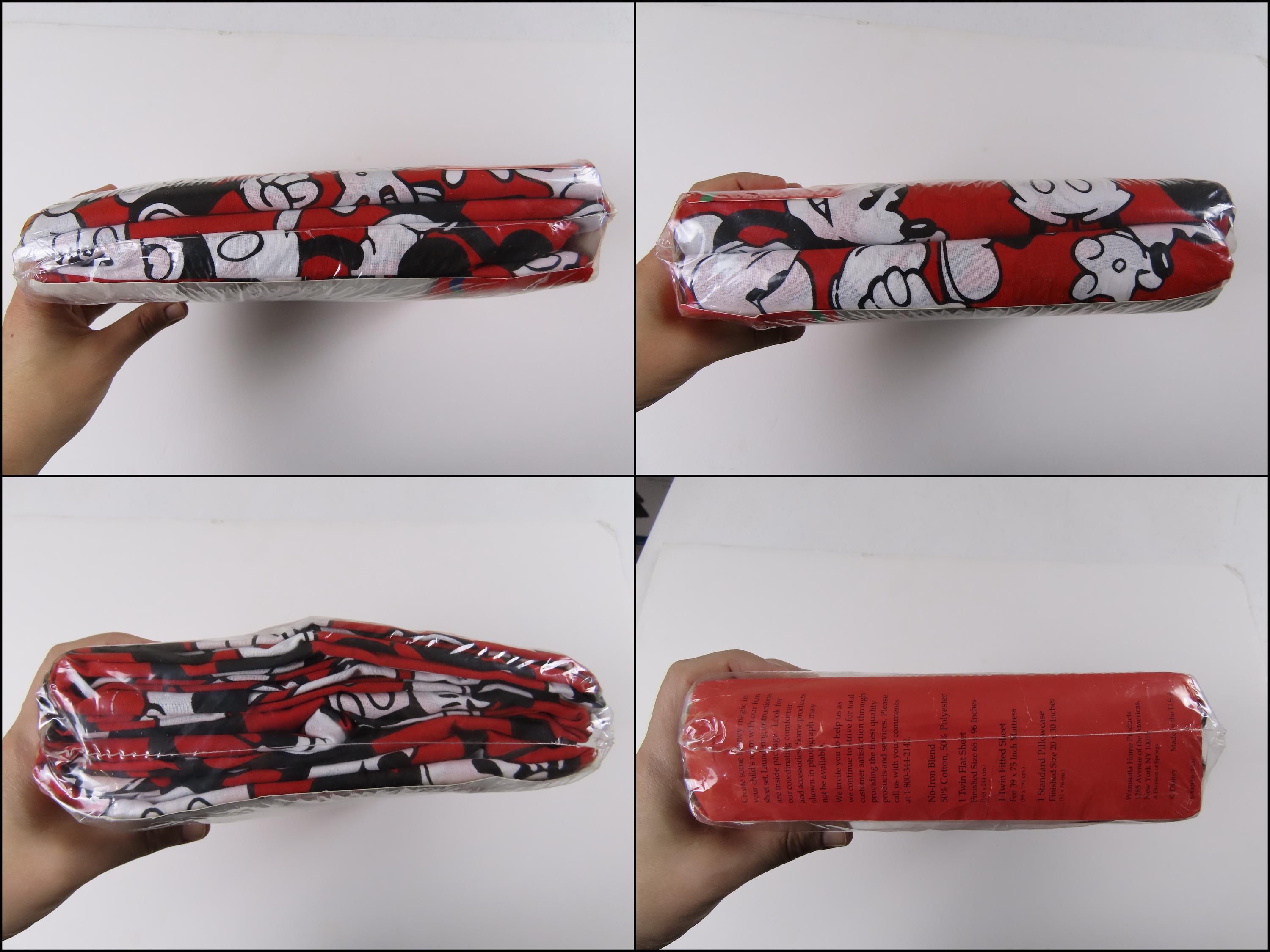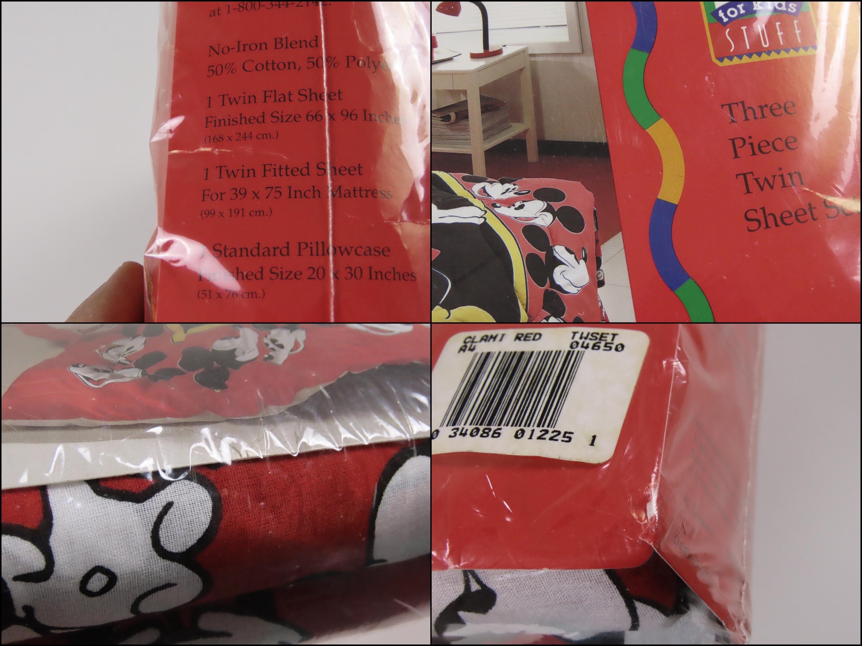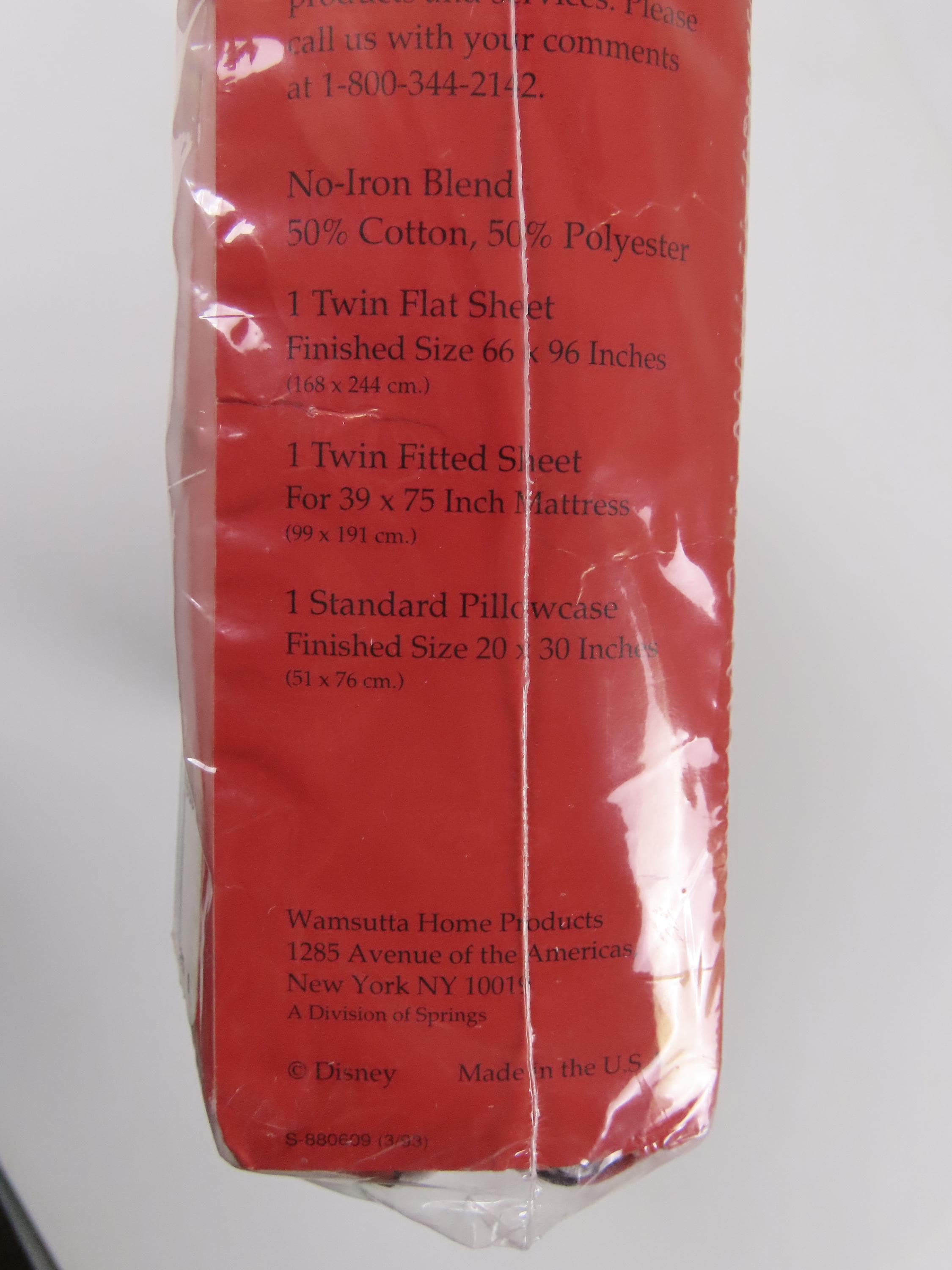 Vintage Mickey Mouse twin sheet set which is new in the package. It includes the flat sheet, fitted sheet, and pillowcase. It is 50% cotton and 50% polyester. My camera had a hard time picking up the exact color. The plastic packaging, and the cardboard insert are both worn. The plastic has some marks, old sticker residue, and scratches. The carboard insert is creased, bent, and tiny specs of the cardboard are loose inside of the packaging. There are lines of small light whitish marks on the flat sheet which could be sun damage depending on where it was stored, or printing errors.