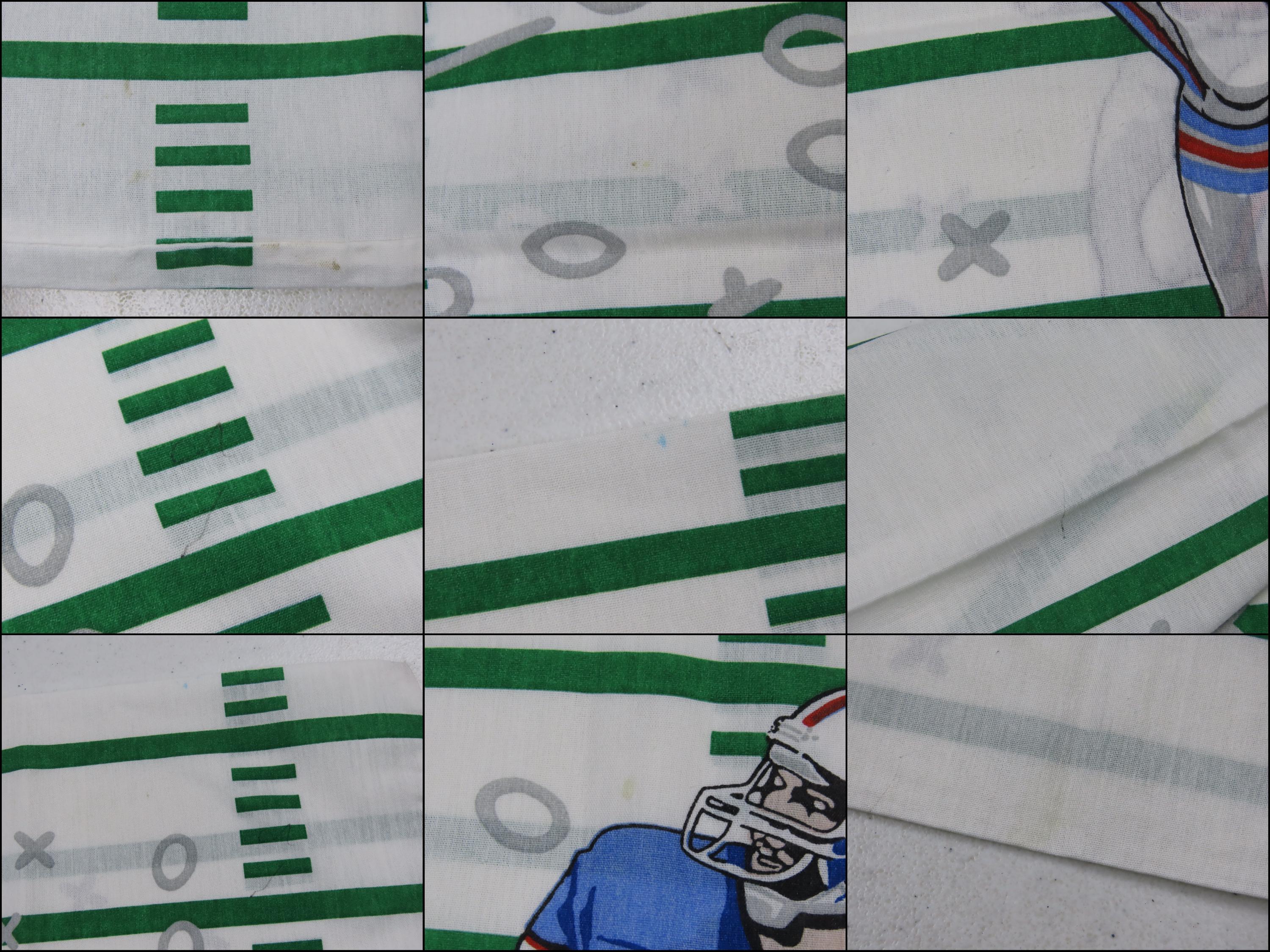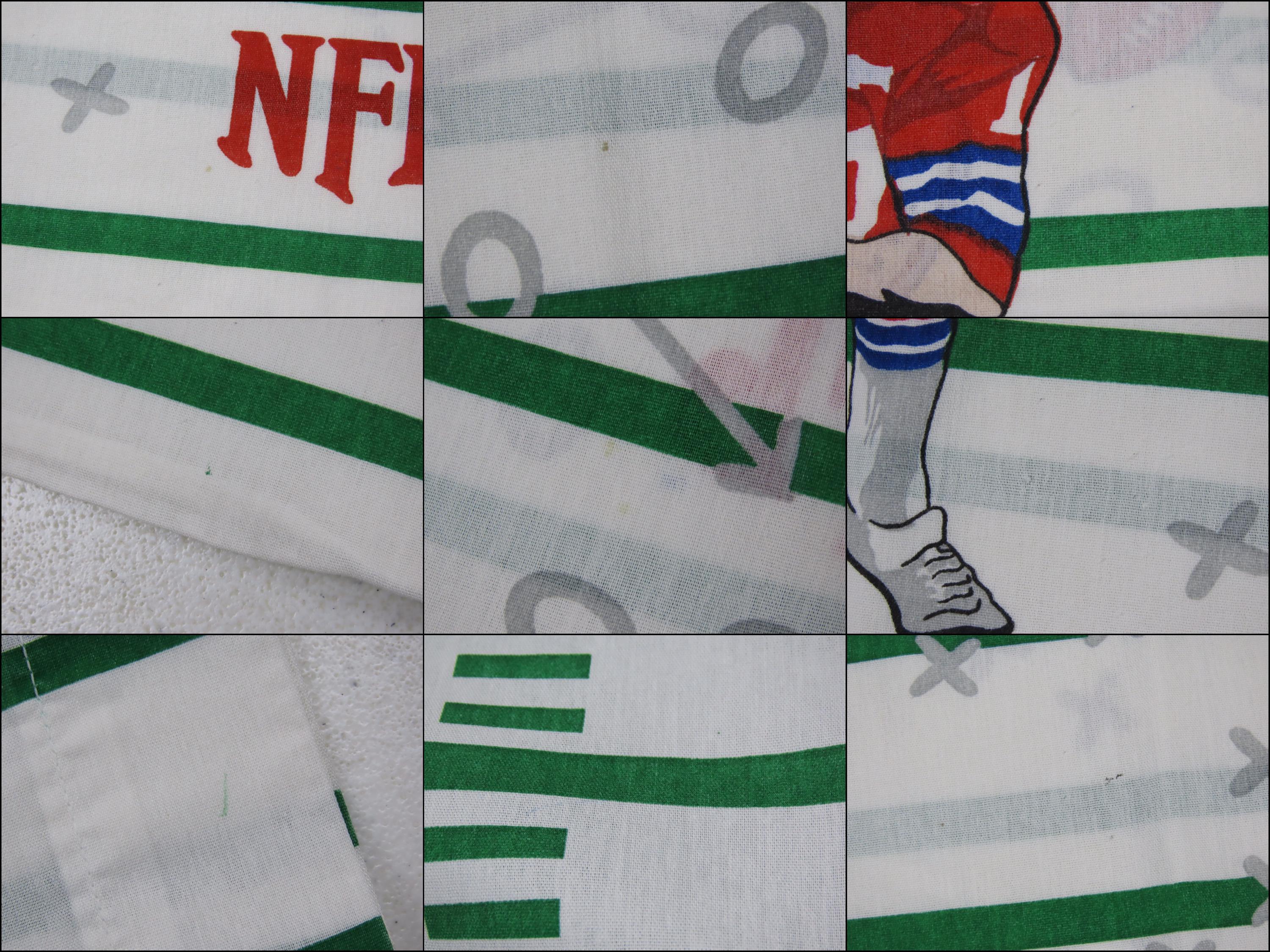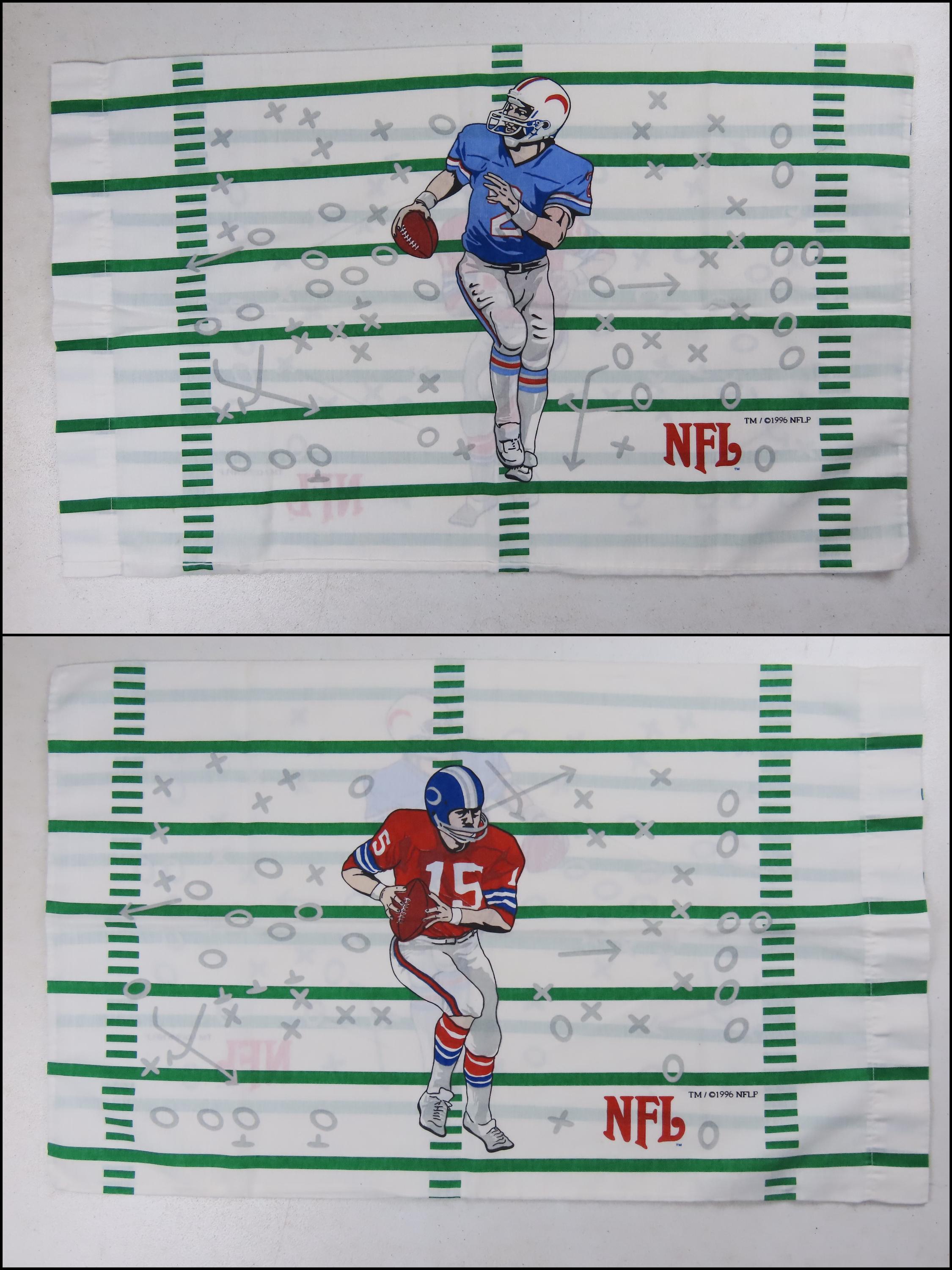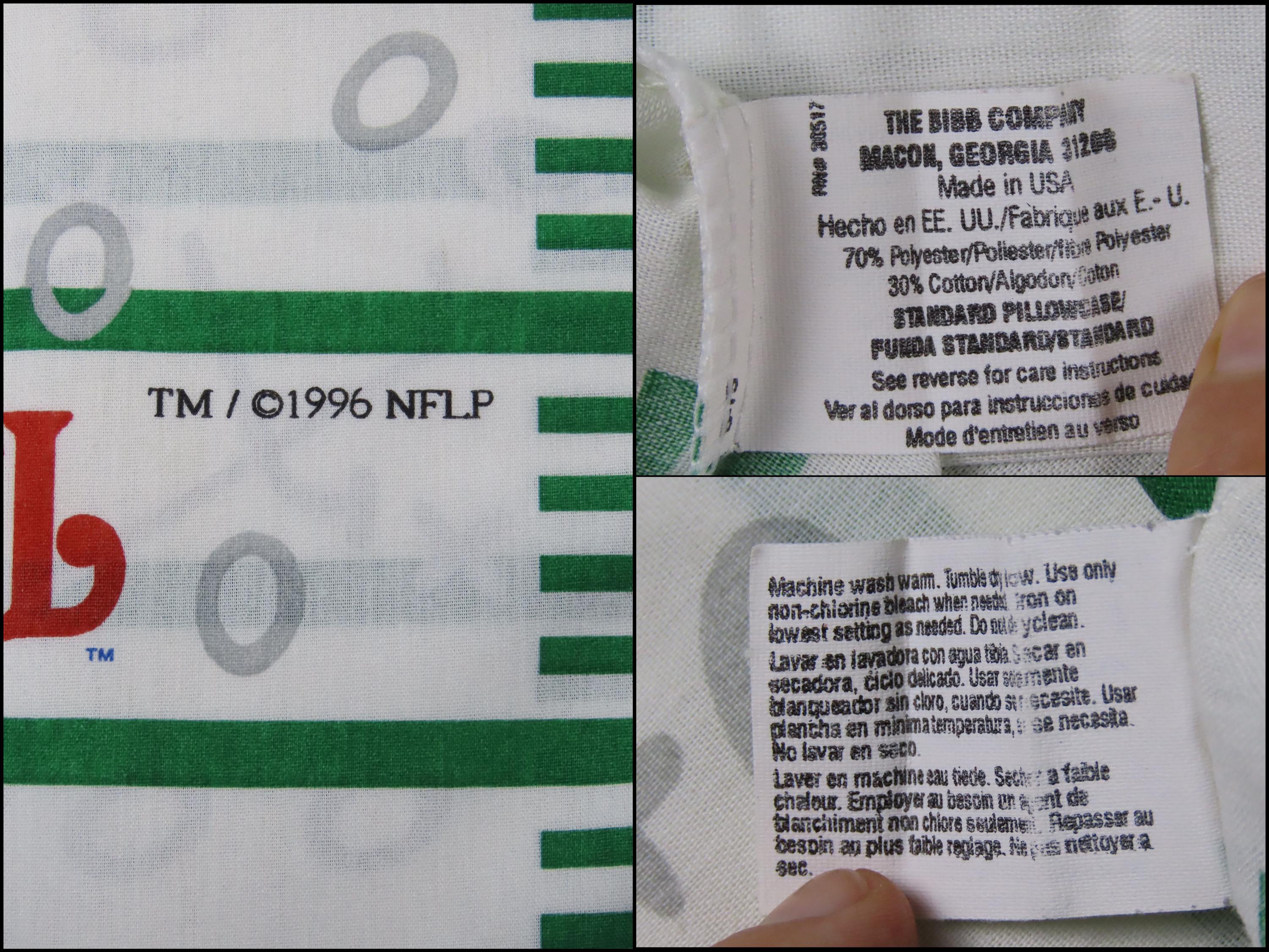 Vintage NFL standard pillowcase from 1996 which is 70% polyester and 30% cotton. It is worn along the edges/stitching, the colors are a little worn/streaky, and it has light pilling in areas. There are a few thread snags, thin spots, and some line marks. It has some small/tiny stains, small marks, and a larger yellowish stain.