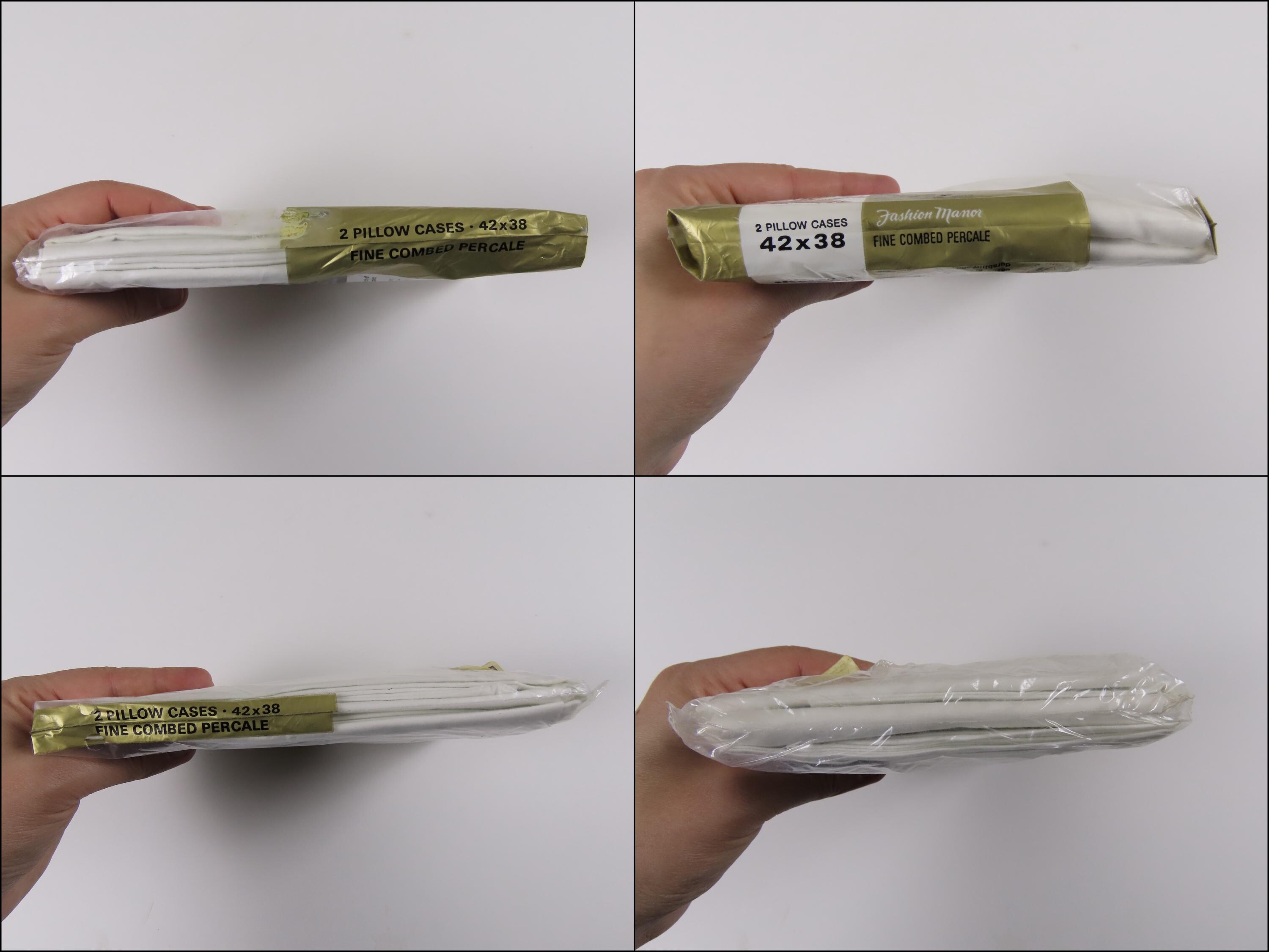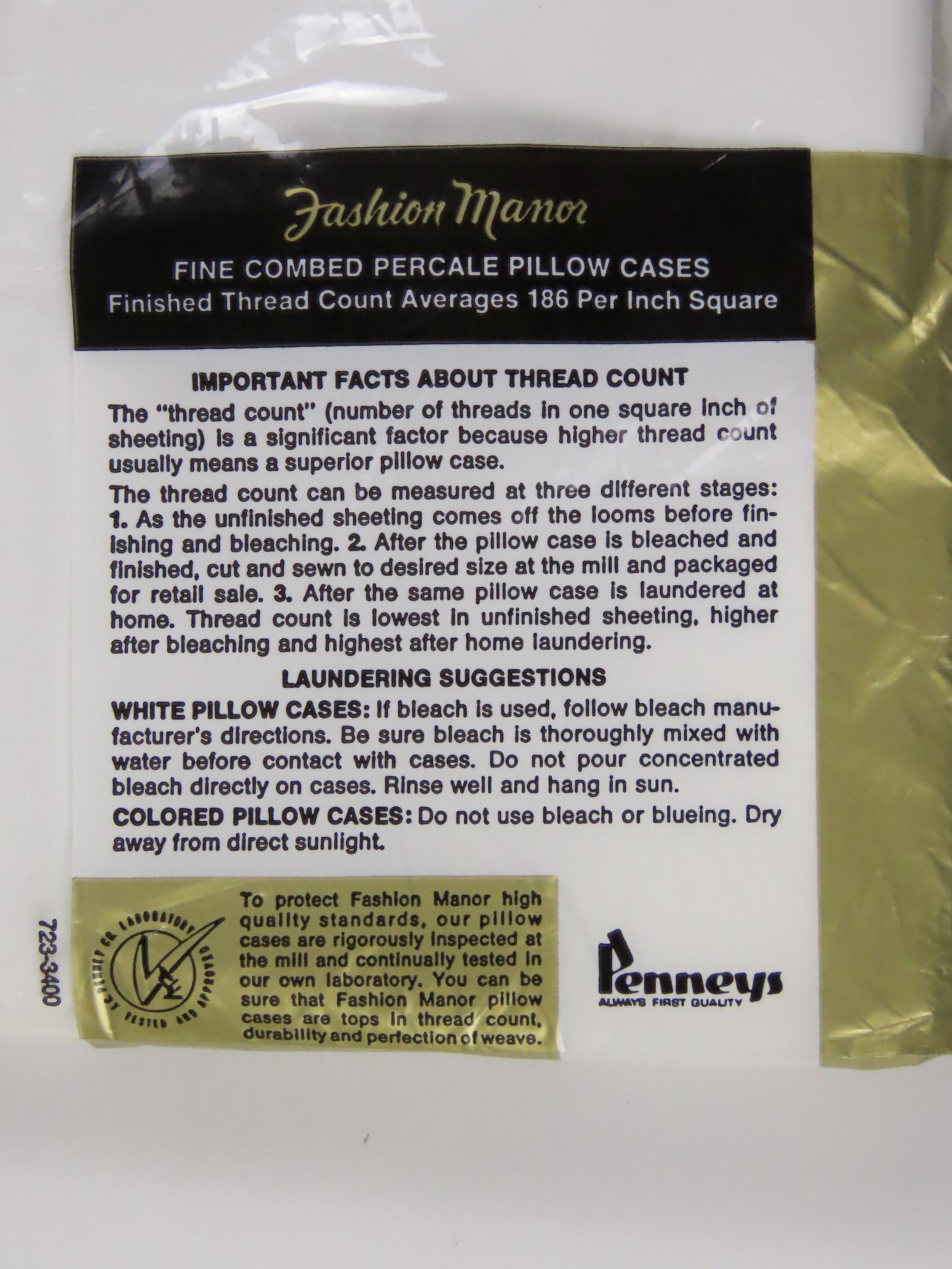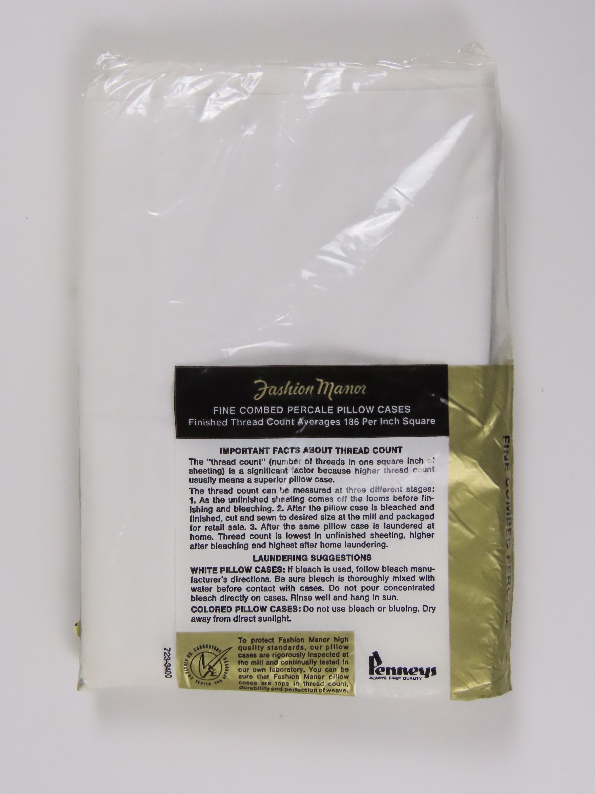 Set of 2 vintage Fashion Manor by JC Penney white pillowcases which are new in the package. They have a 186 thread count, and the size before hemming is 42" by 38". The plastic packaging is worn. The plastic has marks/stains, old sticker residue, and the ink has worn off/smeared in areas. It has some loose dust/debris inside the packaging.