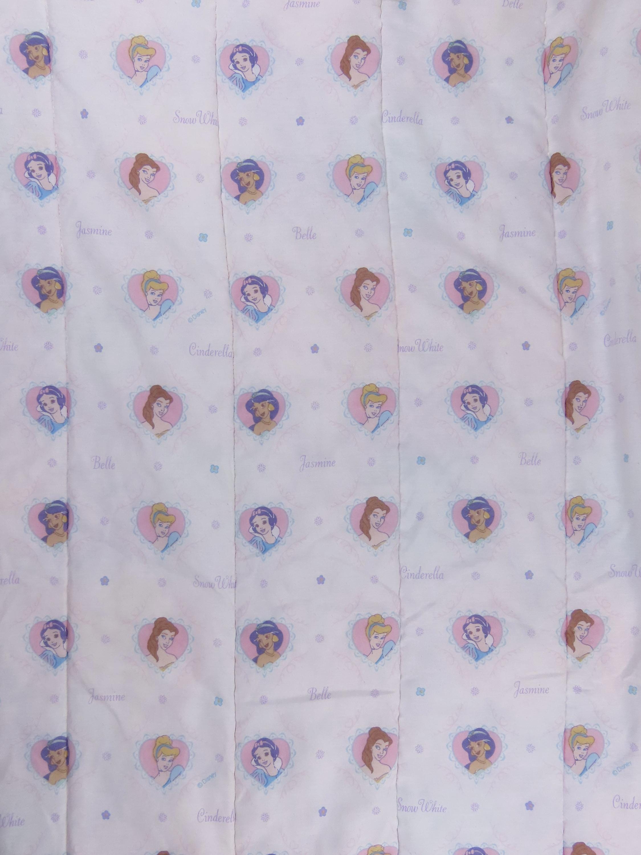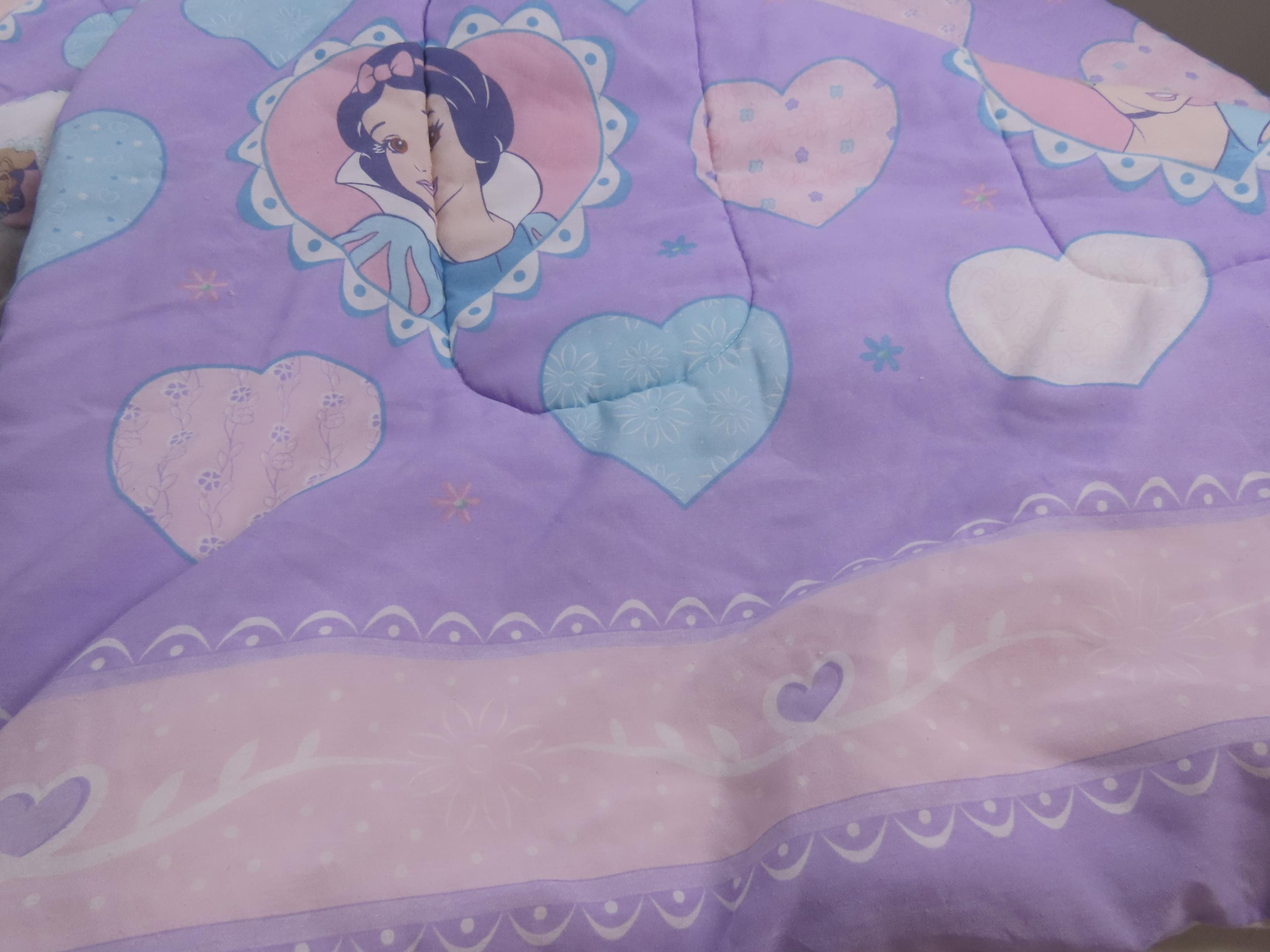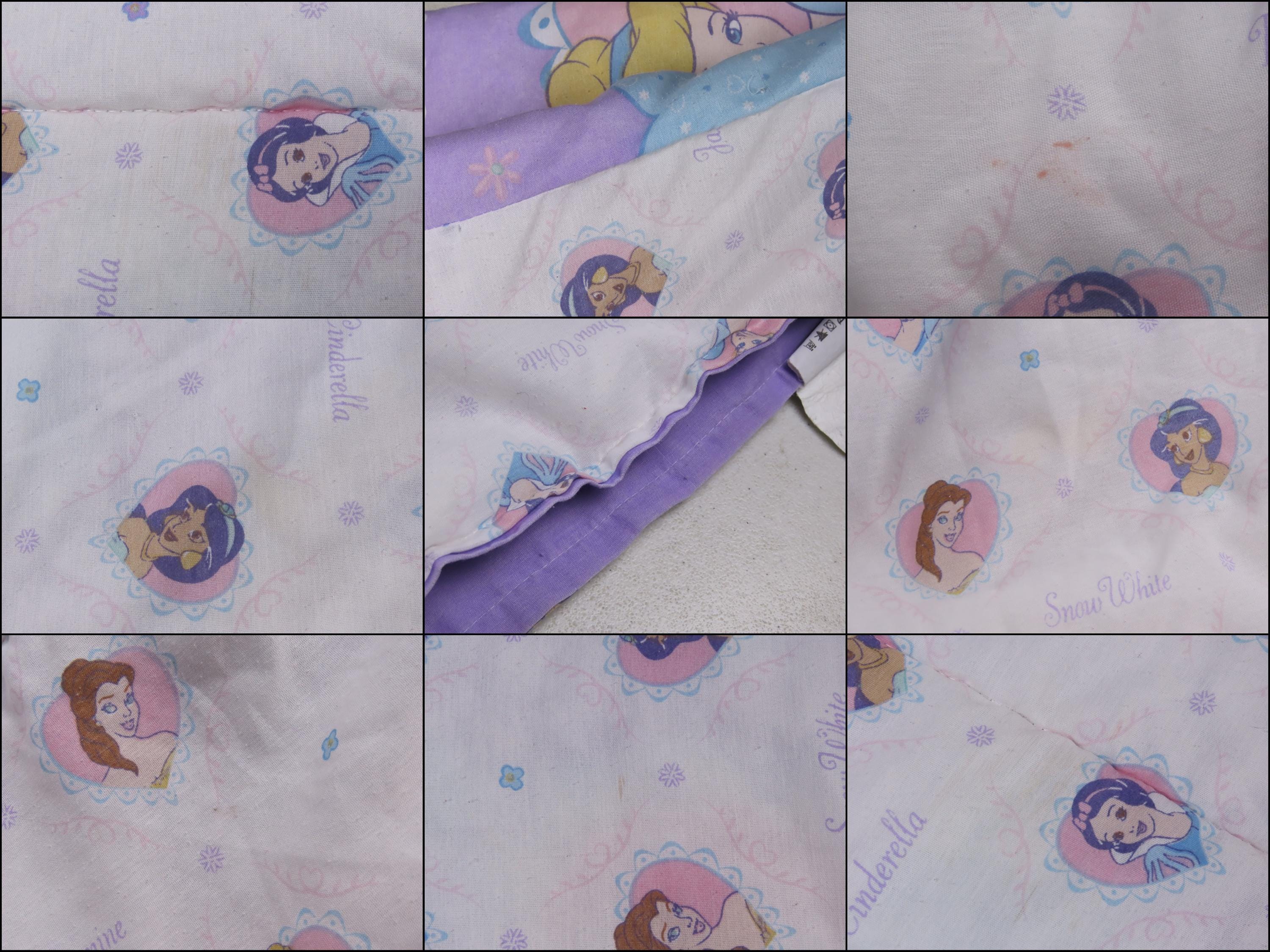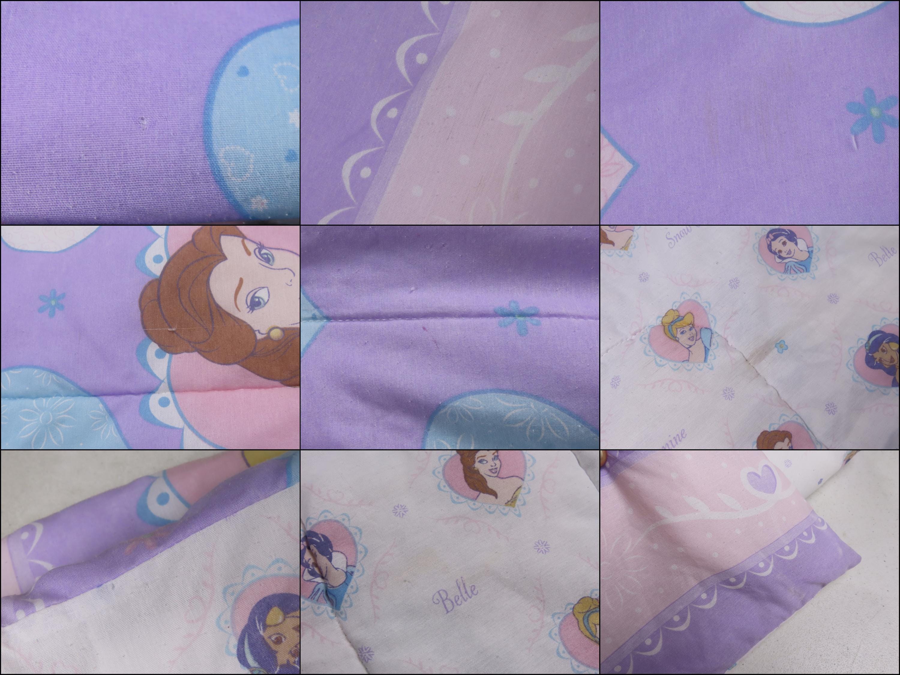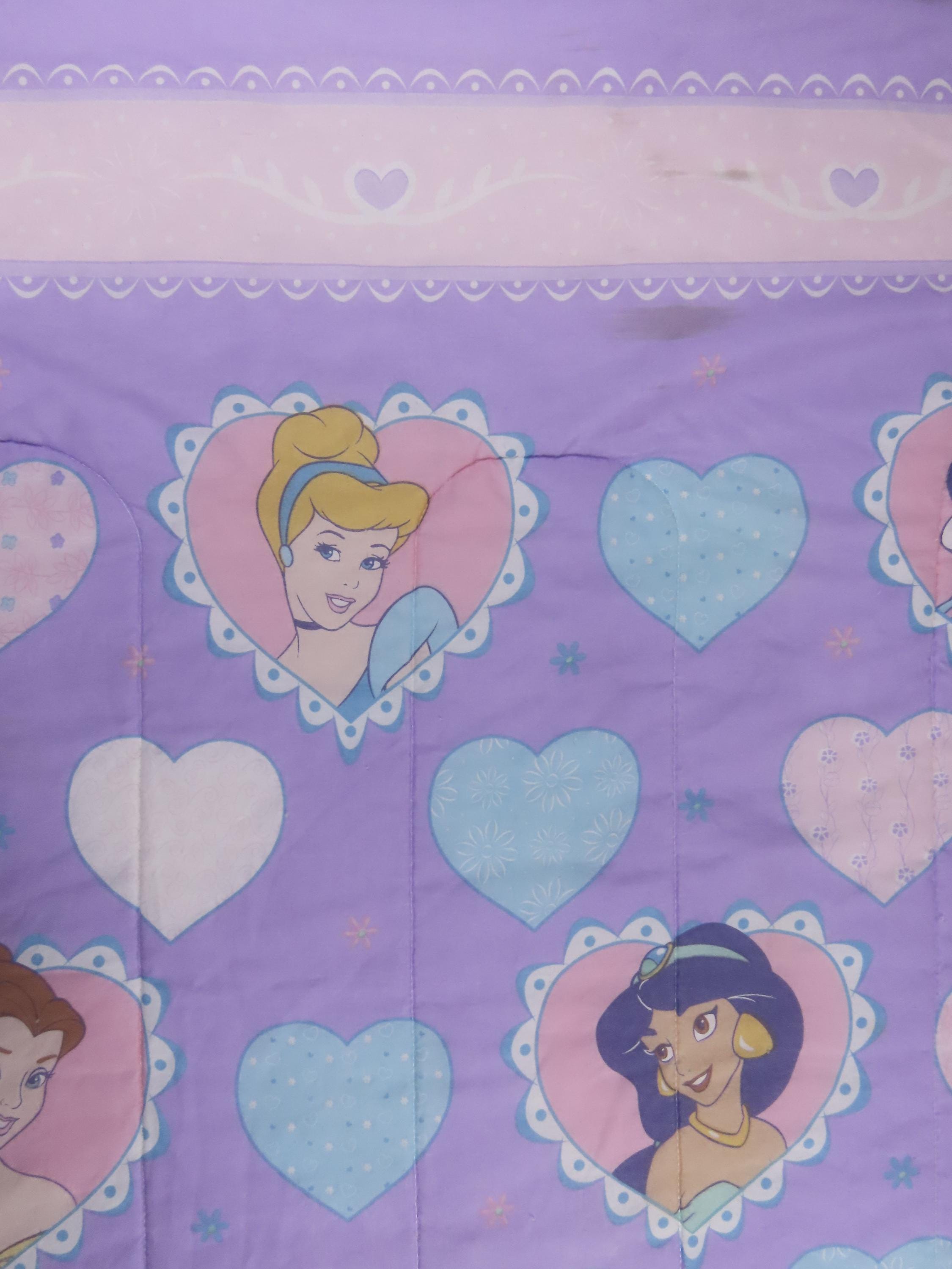 Vintage Disney Princess twin comforter which features Jasmine, Belle, Snow White, and Cinderella. It is 70% polyester and 30% cotton with a 100% polyester filling. My camera had a hard time picking up the exact colors. It is worn along the edges/stitching, and the filling has settled unevenly (especially lumpier around the corners). There are missing thread spots, thin spots, and thread snags. It is pilling, and is a little faded. It has a large cluster of stains, multiple small marks/stains, and a few larger stains. There are light whitish marks, a couple of tiny holes, and some thin spots trying to form tiny holes.