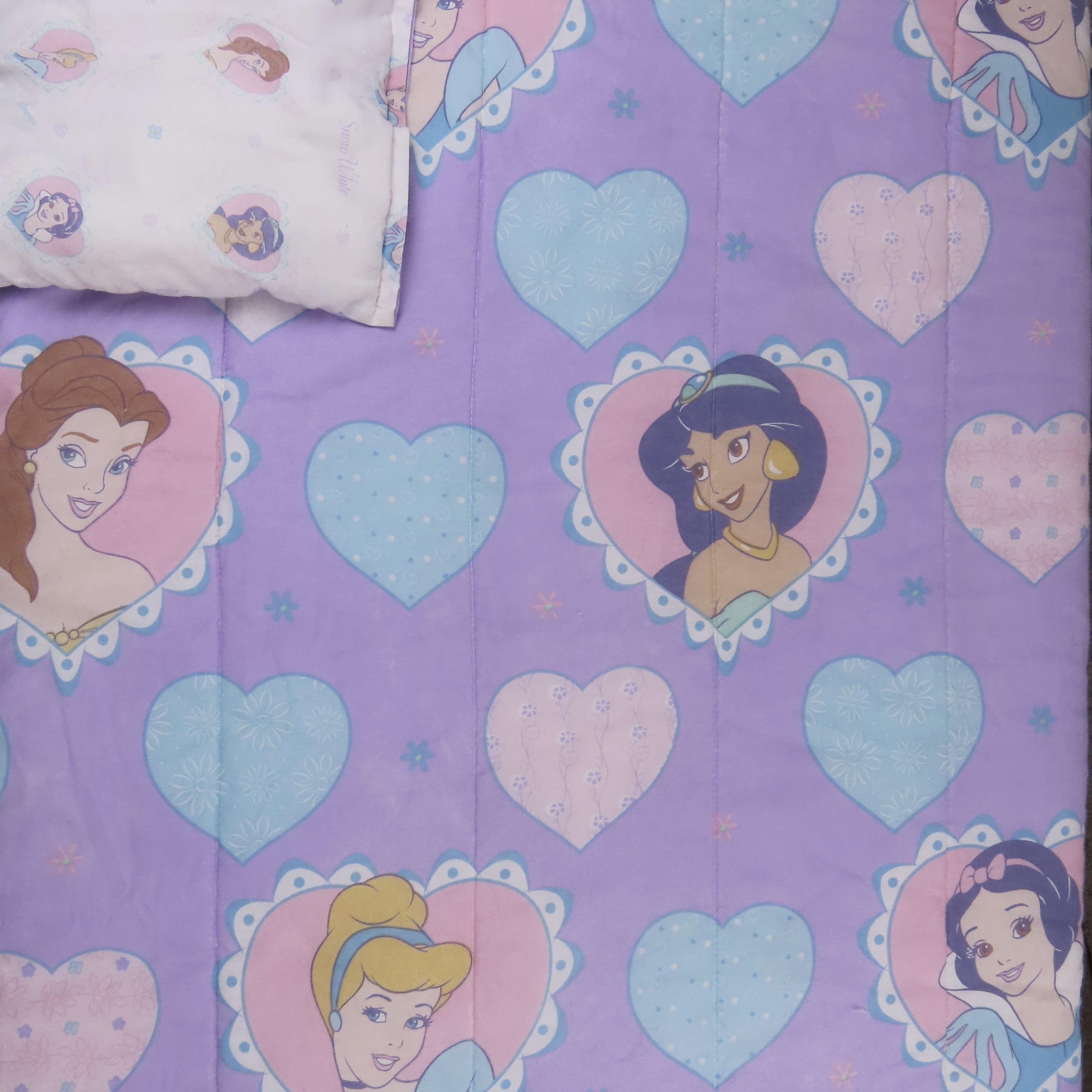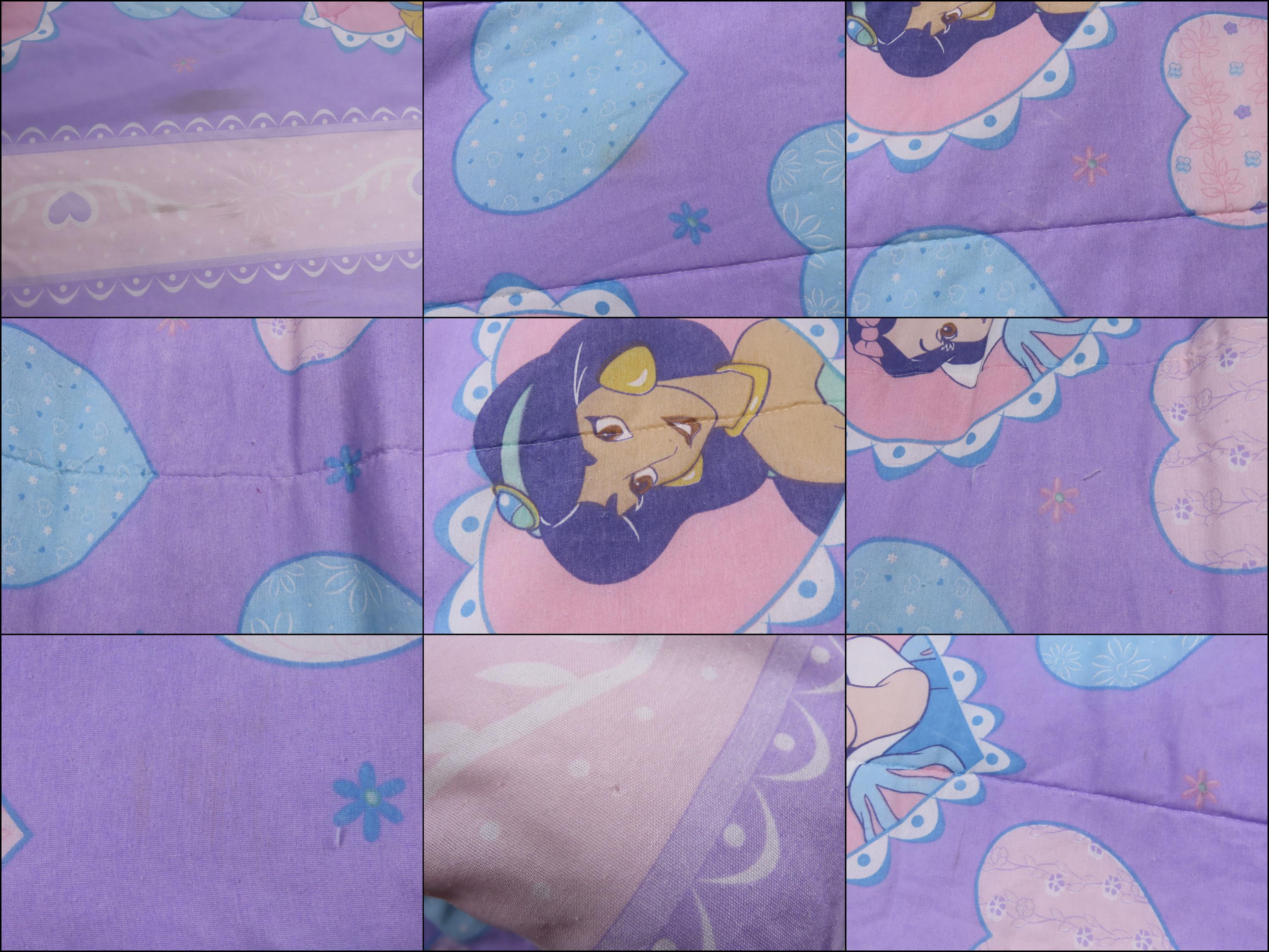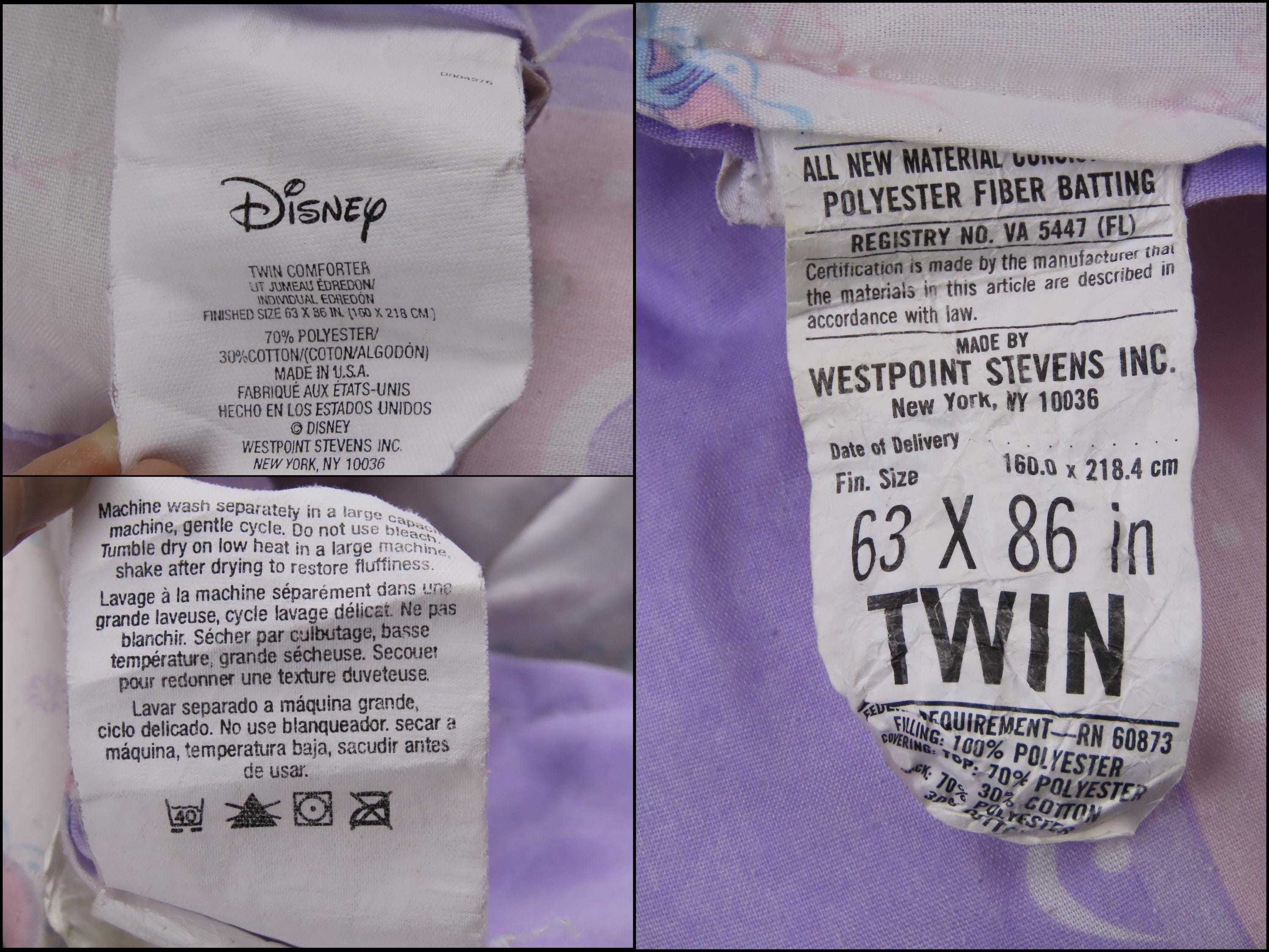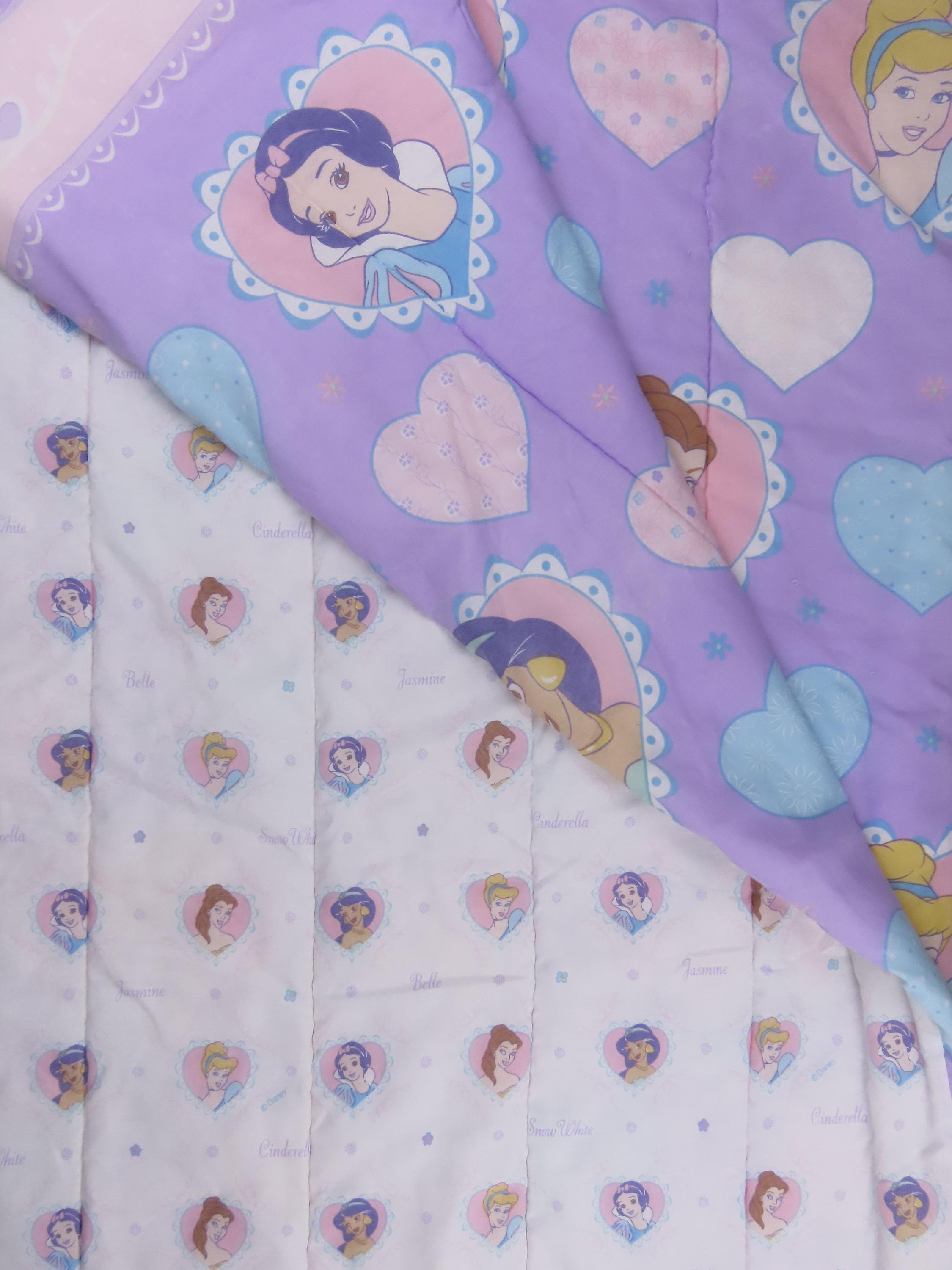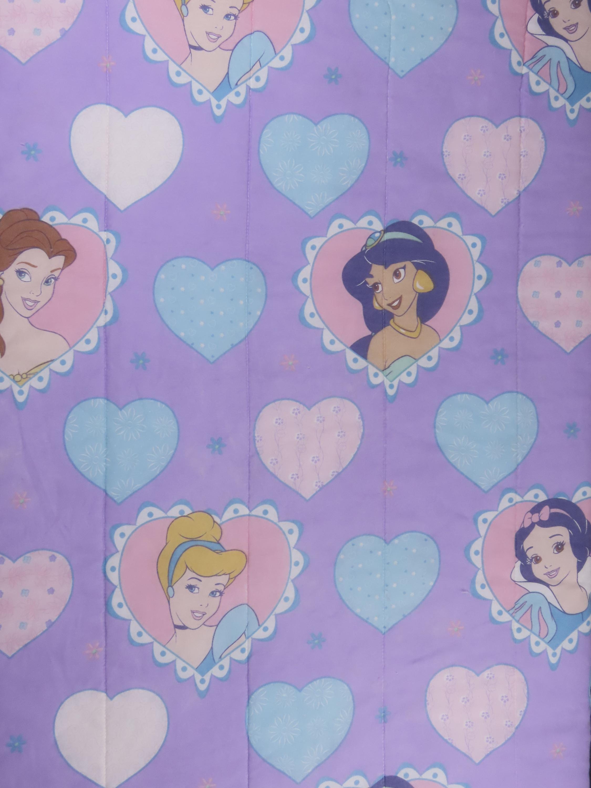 Vintage Disney Princess twin comforter which features Jasmine, Belle, Snow White, and Cinderella. It is 70% polyester and 30% cotton with a 100% polyester filling. My camera had a hard time picking up the exact colors. It is worn along the edges/stitching, and the filling has settled unevenly (especially lumpier around the corners). There are missing thread spots, thin spots, and thread snags. It is pilling, and is a little faded. It has a large cluster of stains, multiple small marks/stains, and a few larger stains. There are light whitish marks, a couple of tiny holes, and some thin spots trying to form tiny holes.