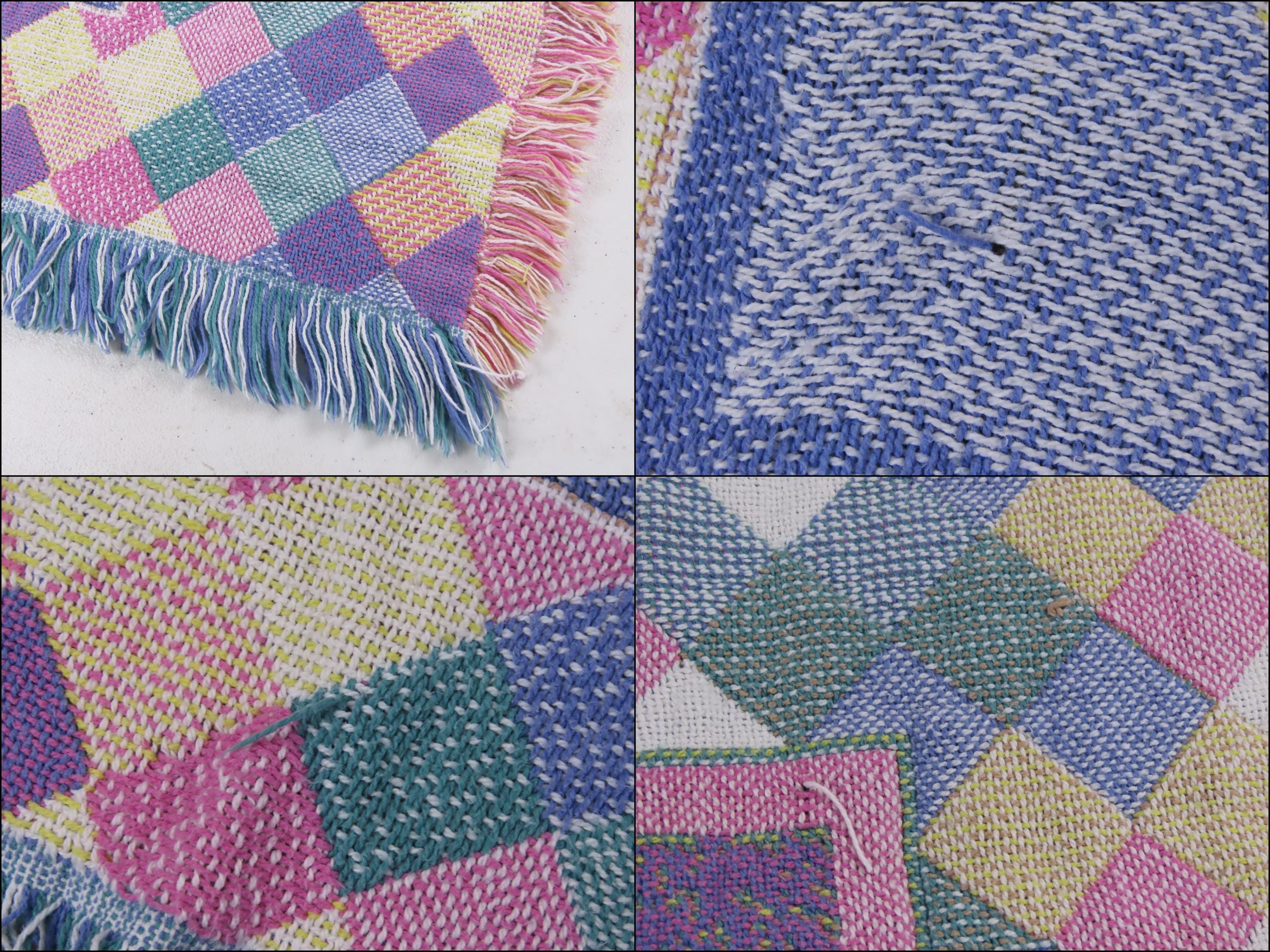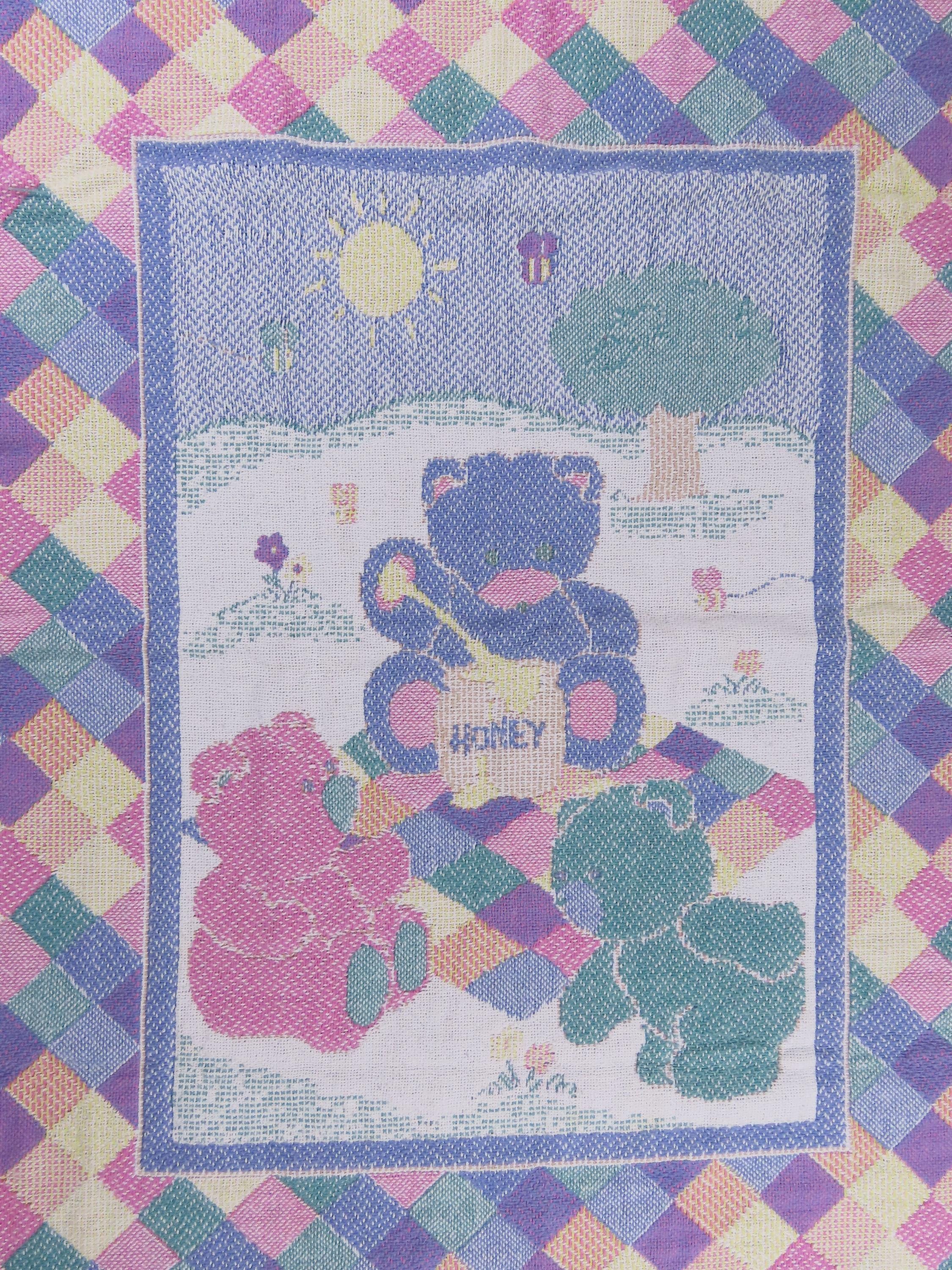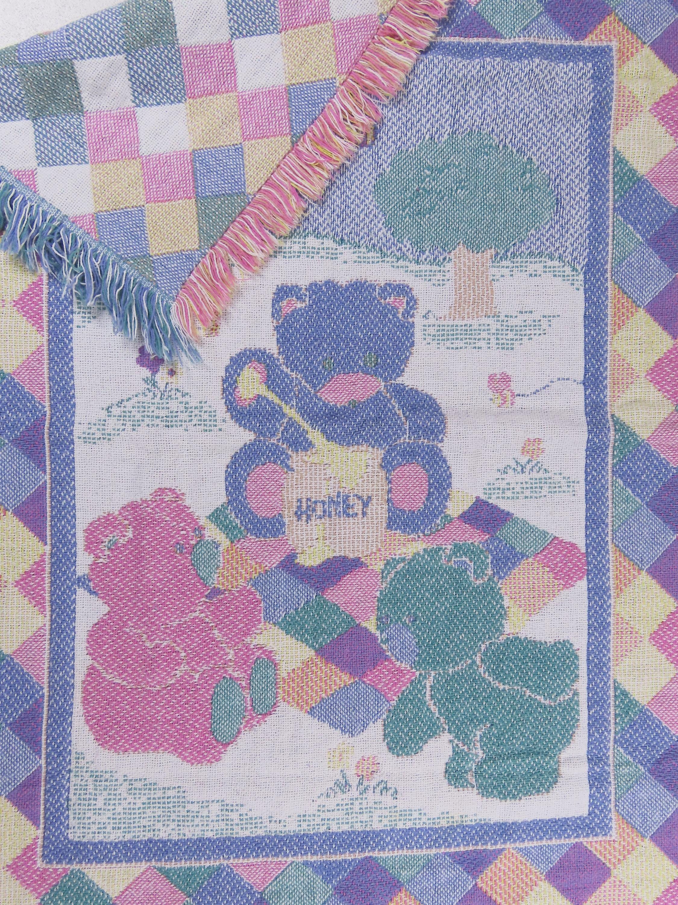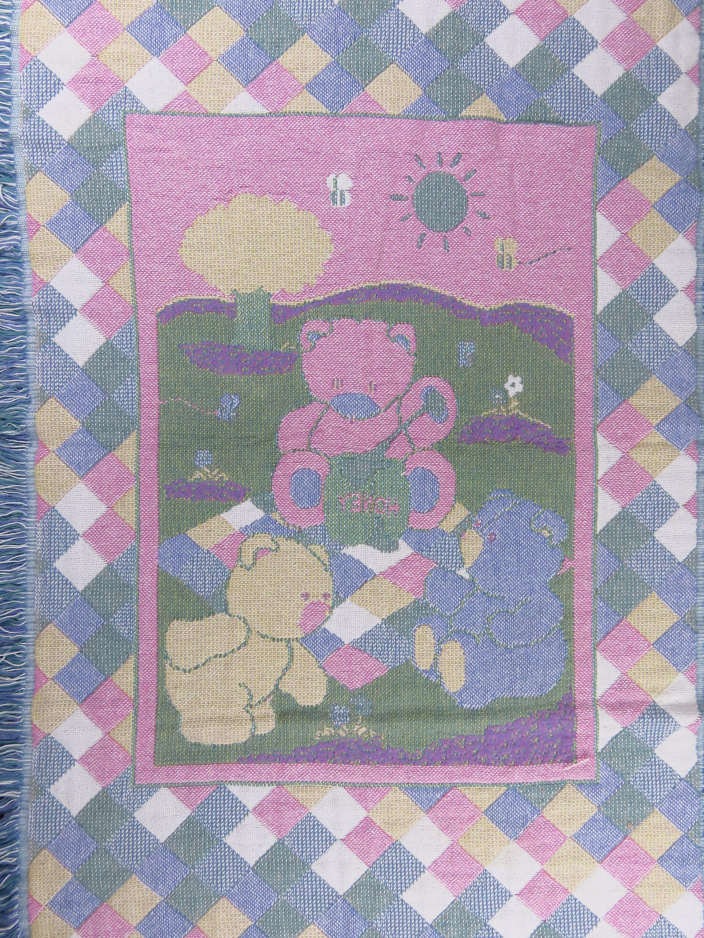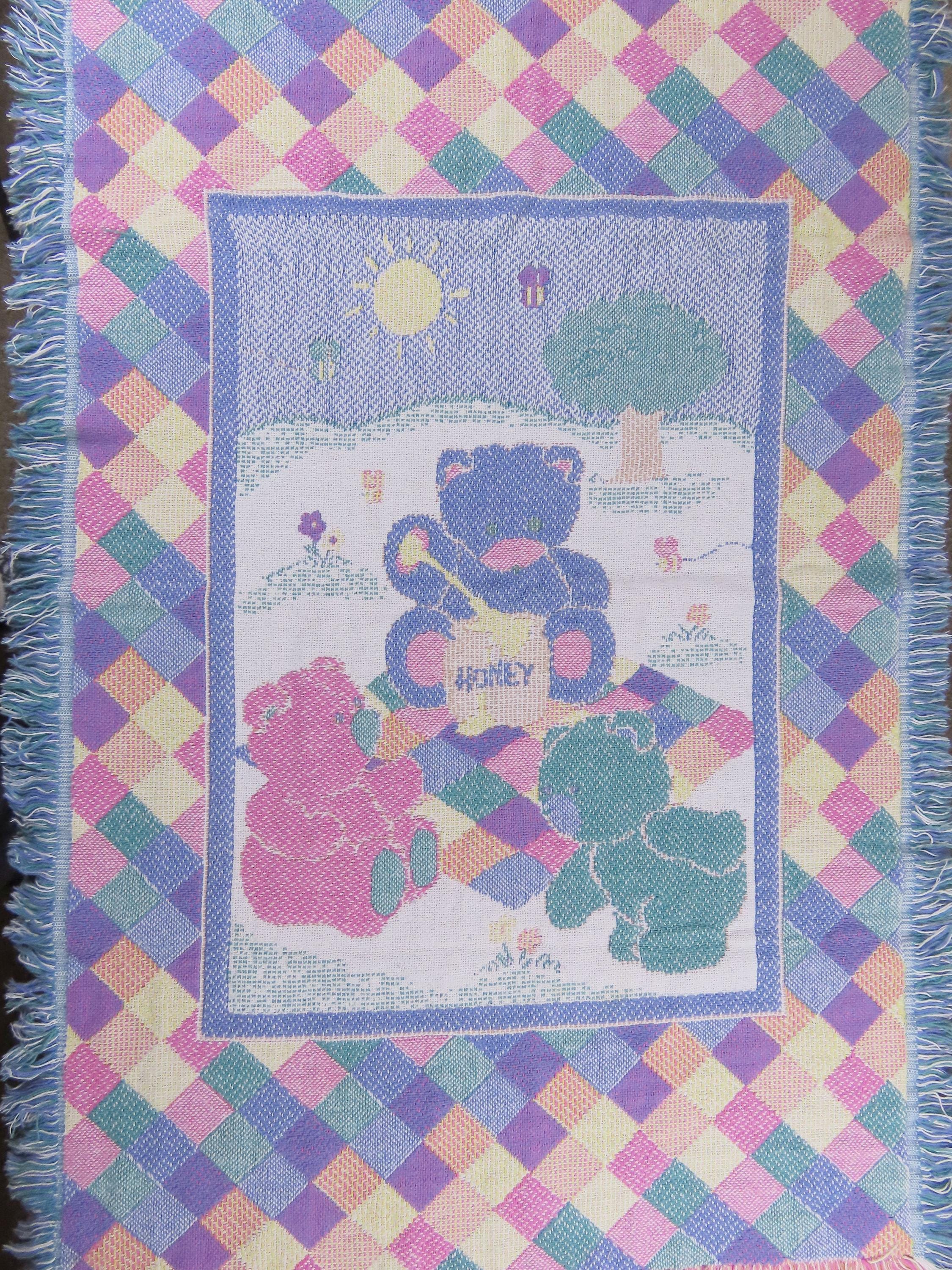 Vintage teddy bear small woven blanket which is about 48" tall by 32" wide including decorative fringe (120 cm by 82 cm). My camera had a hard time picking up the exact colors. It has light pilling and some loose/pulled fibers. The blanket doesn't want to lay completely flat, as it is wavy/rippled. There might be some lint still stuck to the trips of the decorative edge, but I think I removed most of it.