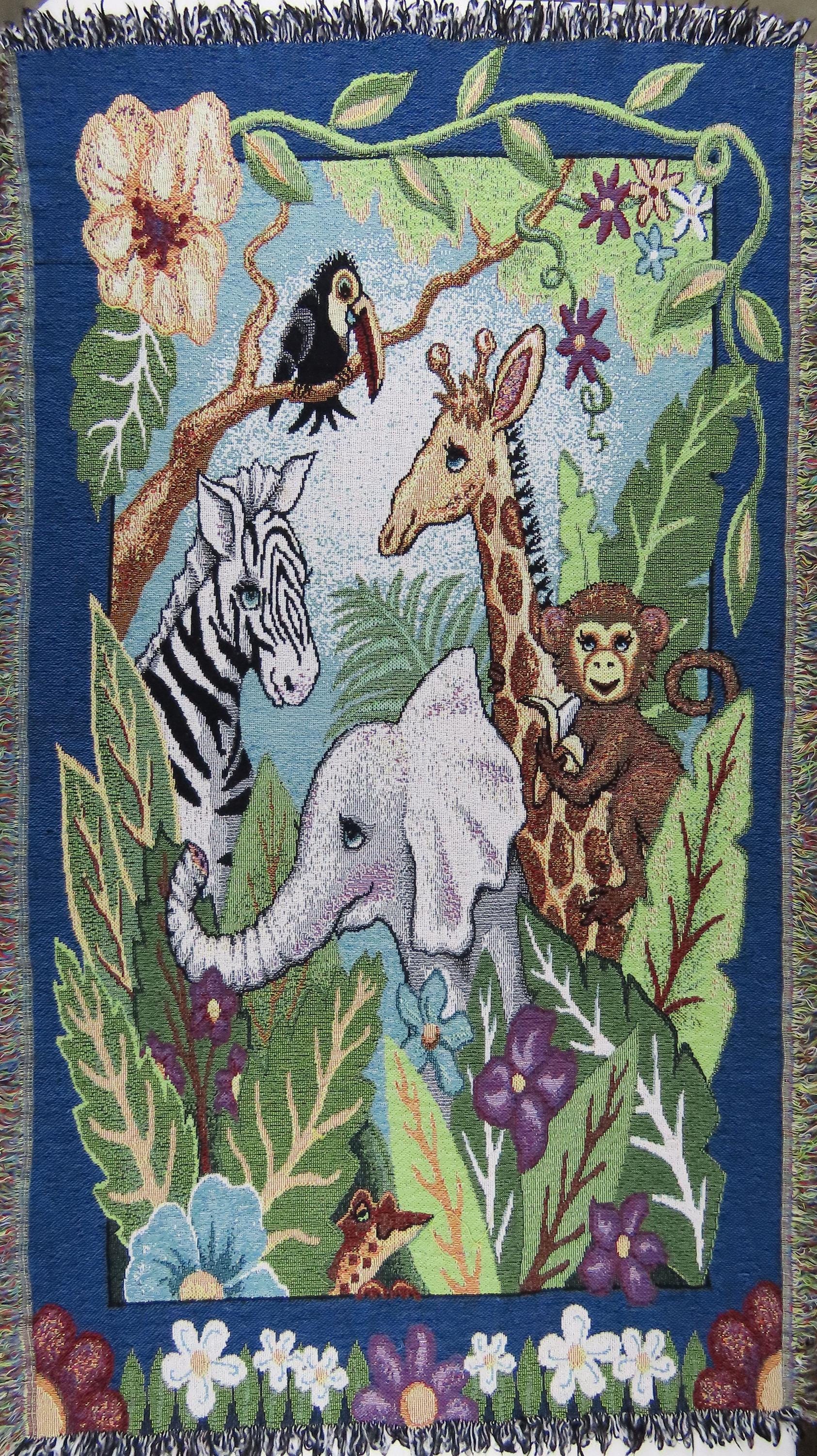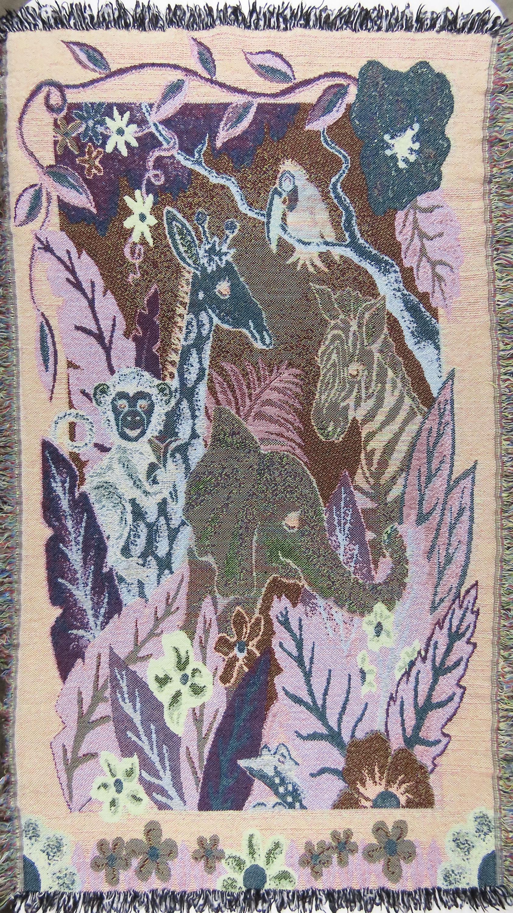 Vintage cute animals woven blanket which is about 53" tall and 33" wide including the decorative fringe (135 cm by 83 cm). It has a couple missing fiber spots, some loose/pulled fibers, and light pilling in areas. The top and bottom decorative fringe is matted and worn.