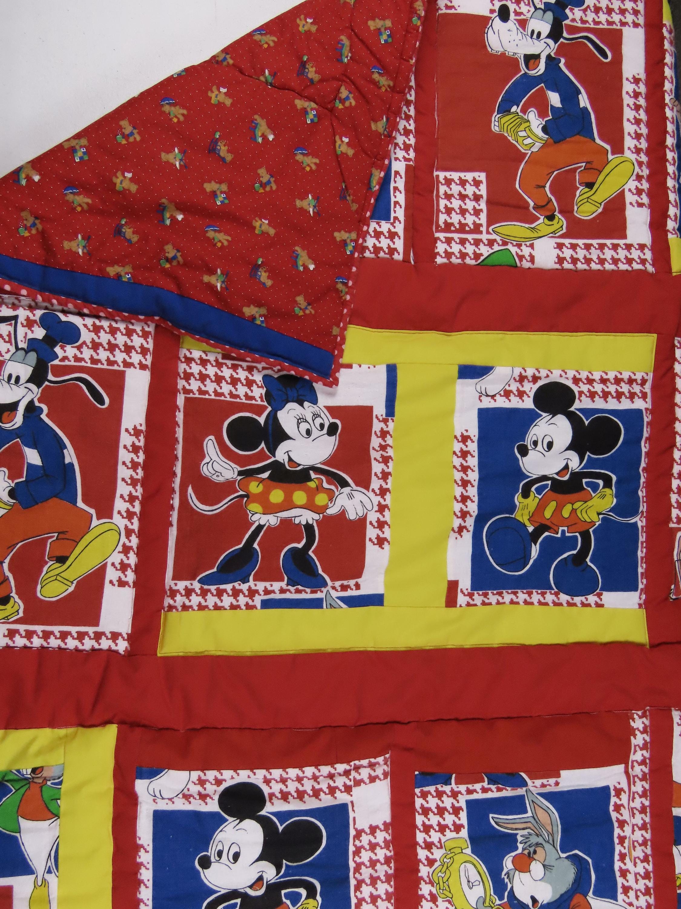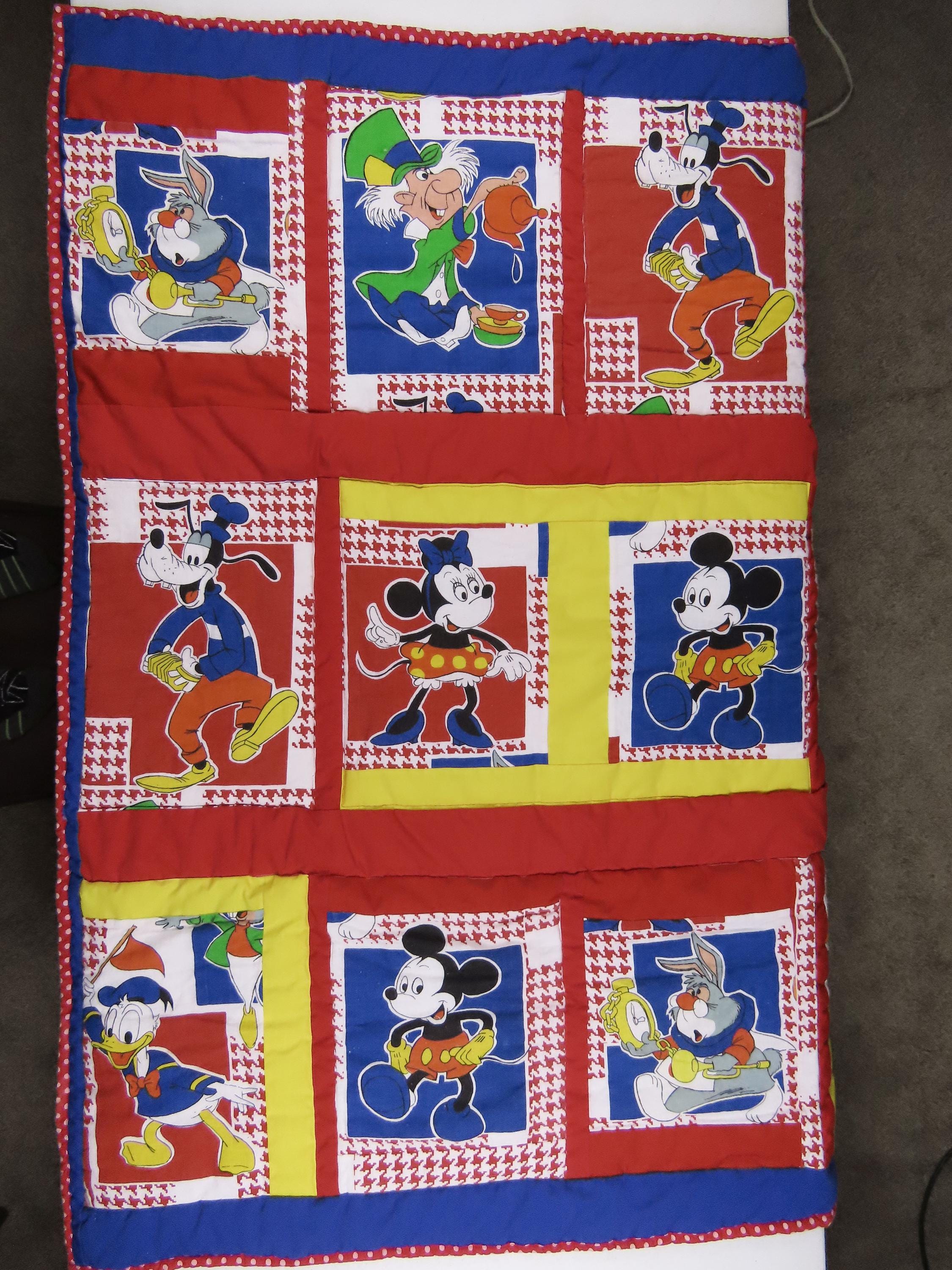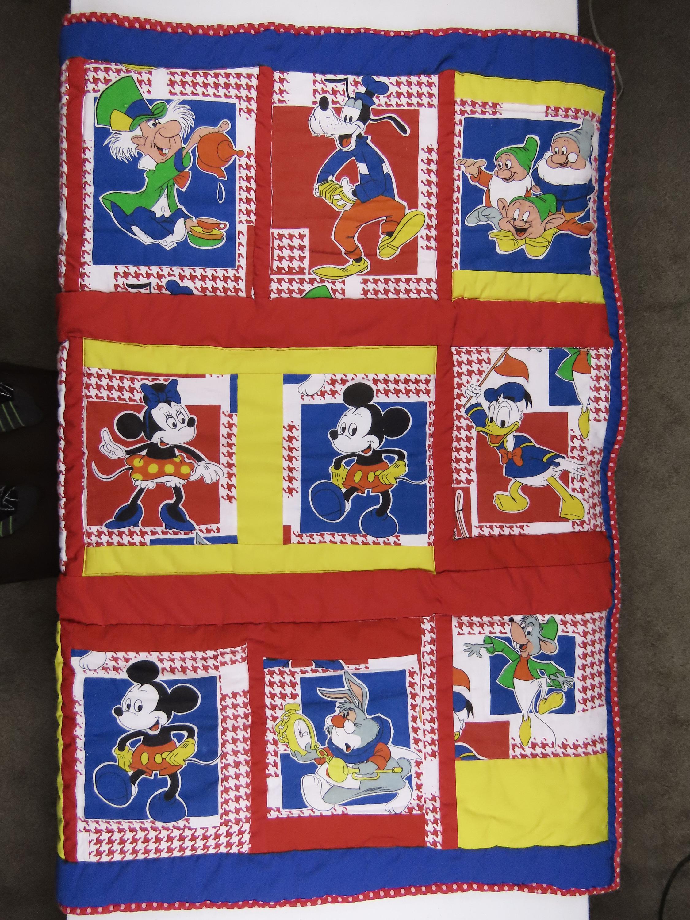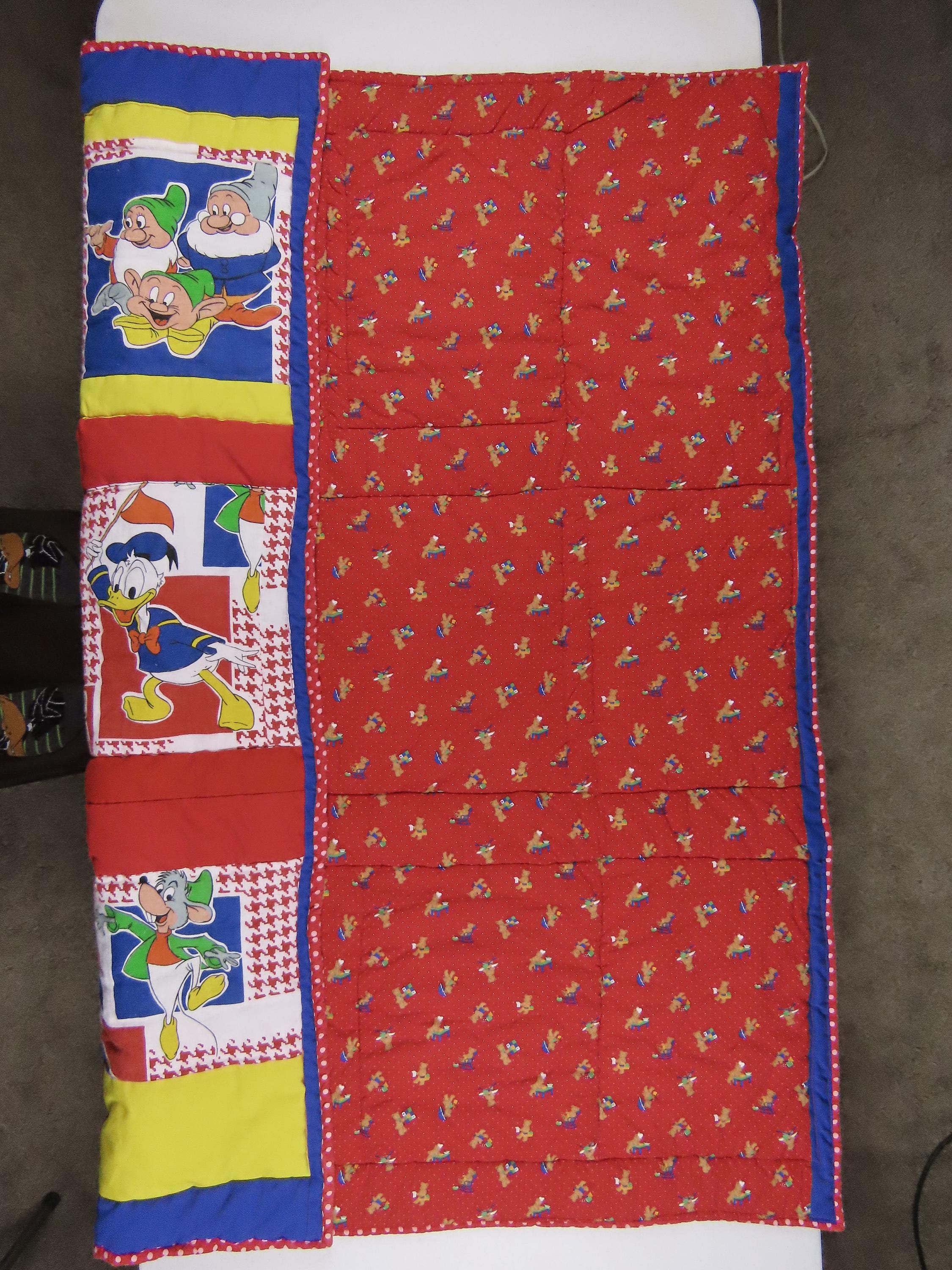 Vintage Disney Characters blanket from 1991 which is about 51" tall by 43" wide (132 cm by 111 cm). It has a heart drawn in the corner on the back showing the date it was made and other information. My camera had a hard time picking up the exact colors. It is worn along the edges/stitching, and it is sewn a little unevenly in areas. The edges are not completely straight/square.