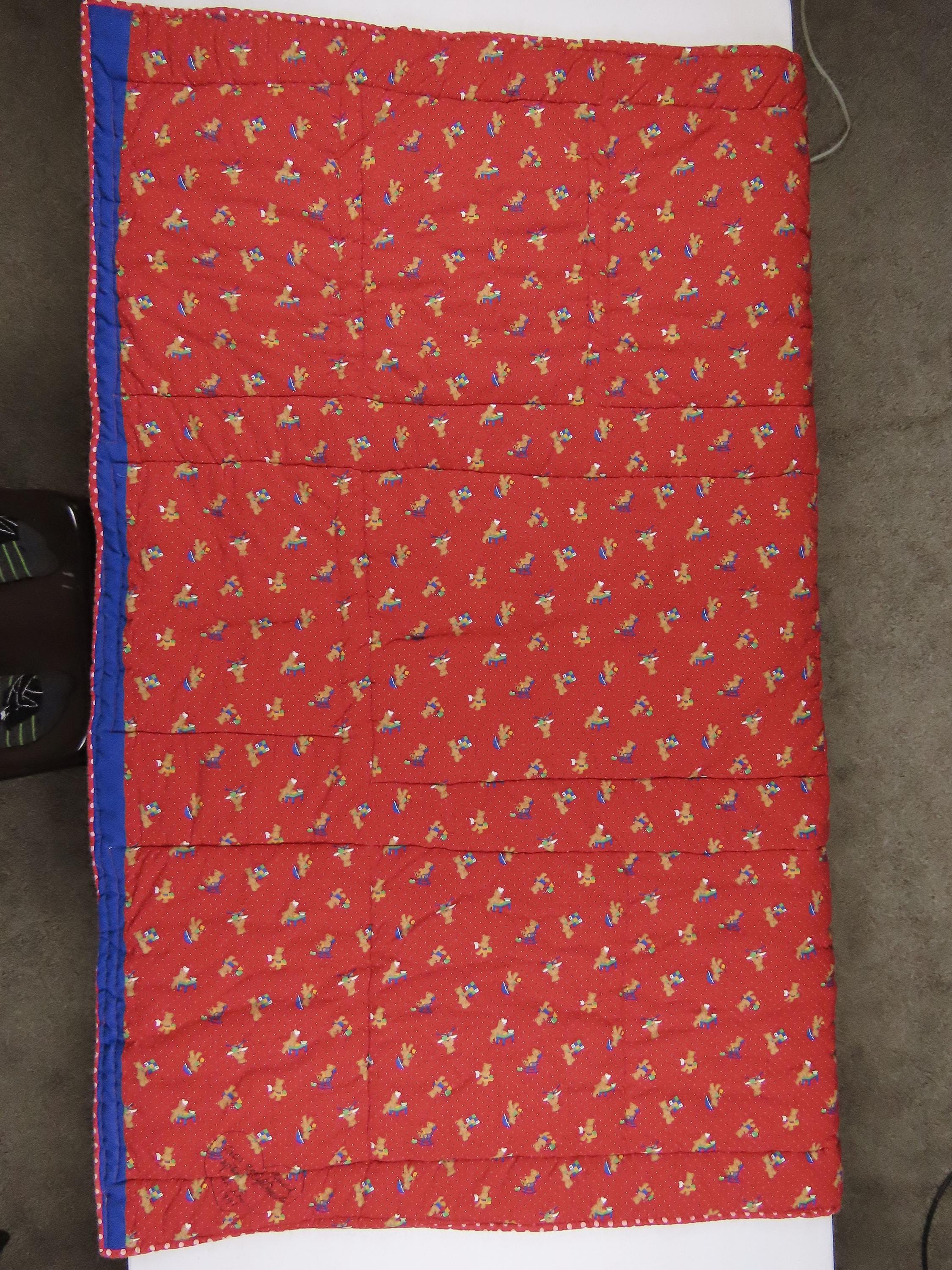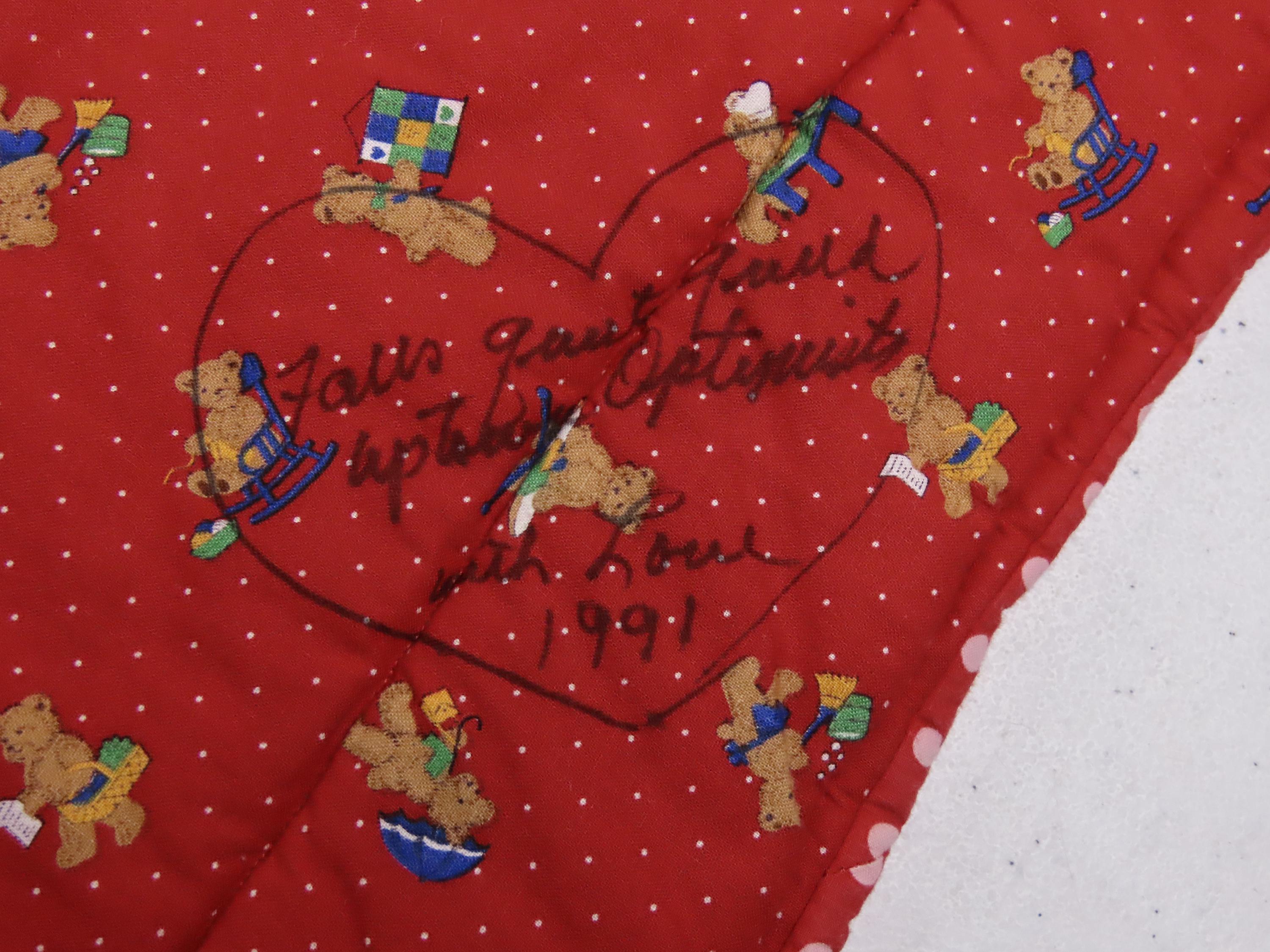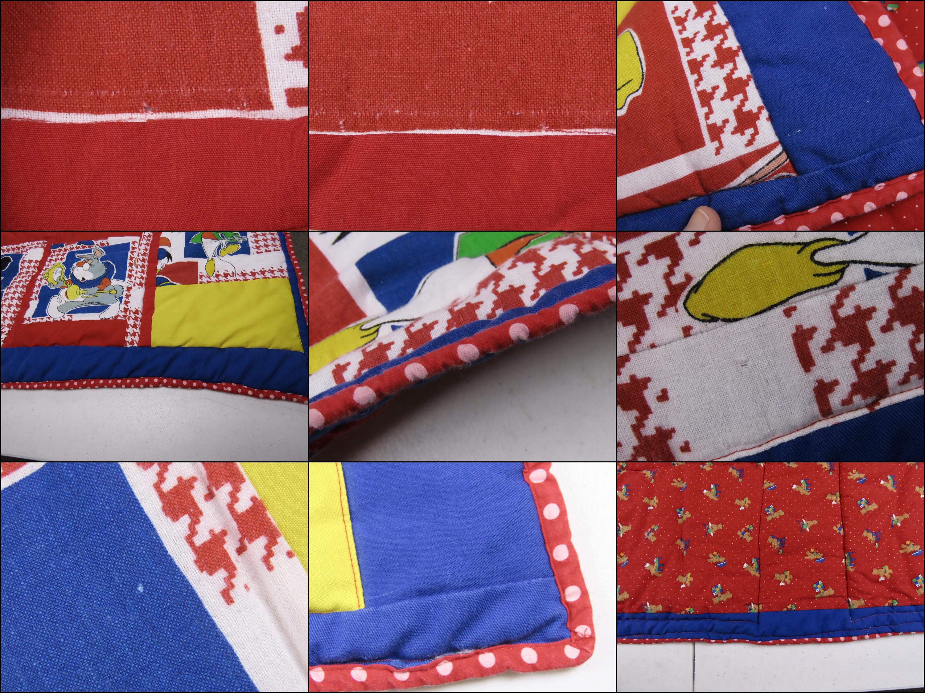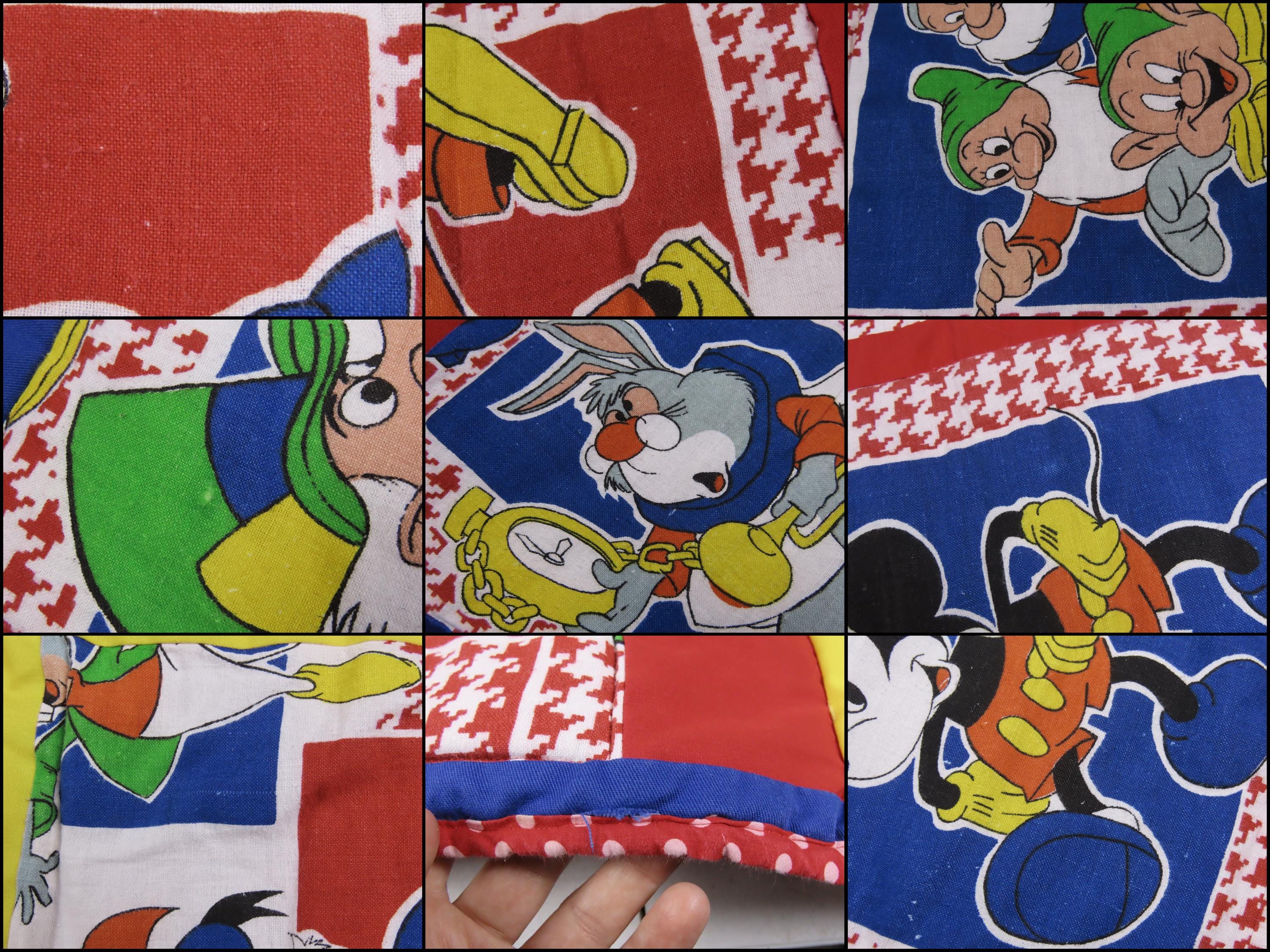 Vintage Disney Characters blanket from 1991 which is about 51" tall by 43" wide (132 cm by 111 cm). It has a heart drawn in the corner on the back showing the date it was made and other information. My camera had a hard time picking up the exact colors. It is worn along the edges/stitching, and it is sewn a little unevenly in areas. The edges are not completely straight/square.