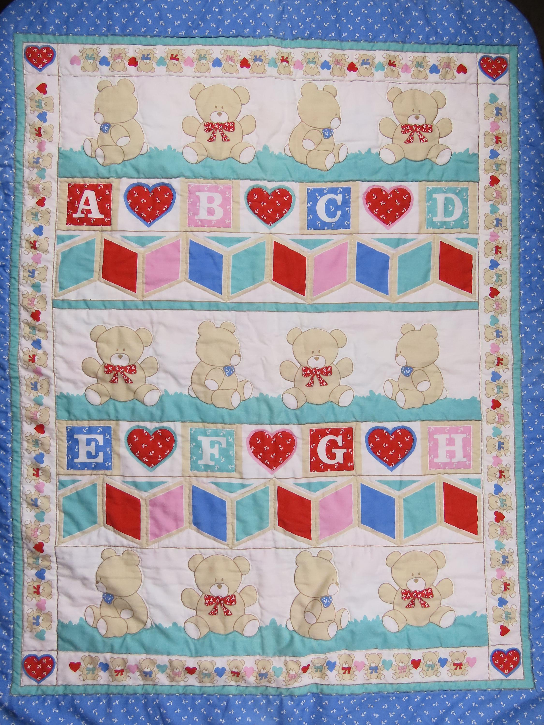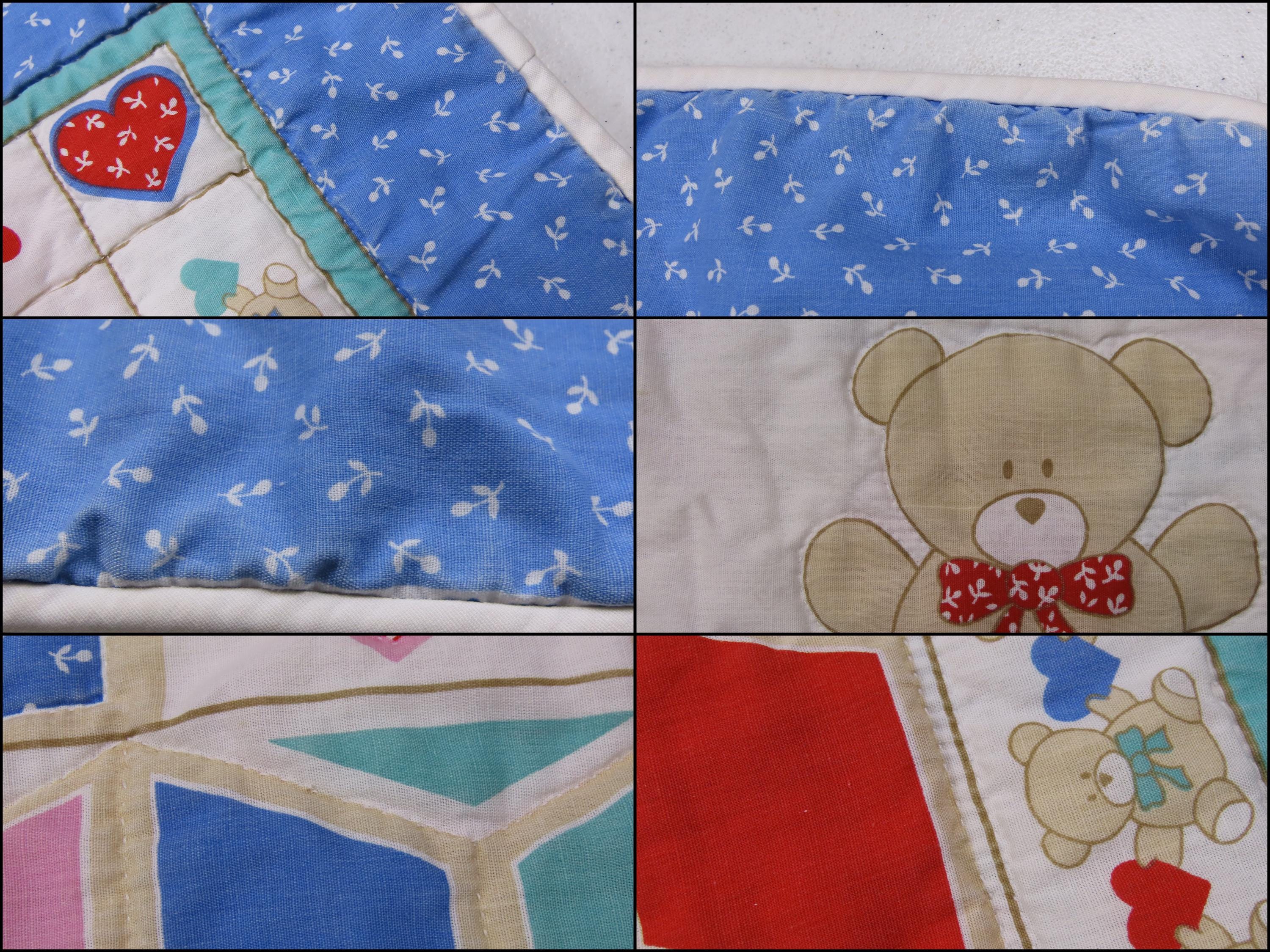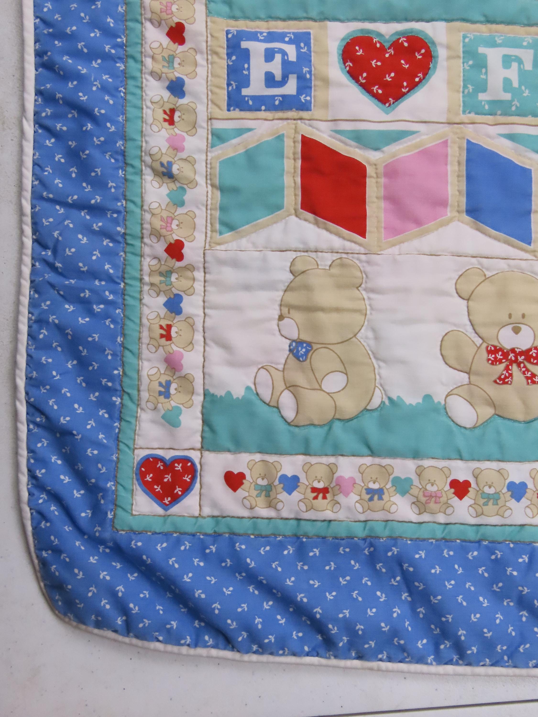 Vintage ABC's Teddy Bear small quilted blanket which is about 43" tall by 33" wide (111 cm by 85 cm). My camera had a hard time picking up the exact colors. It is worn along the edges/stitching, and it is faded in areas. There are missing thread spots, thread snags, and tiny white marks. It has some tiny marks. There are a couple small stains on the backside. The backside has a horizontal orientation.
