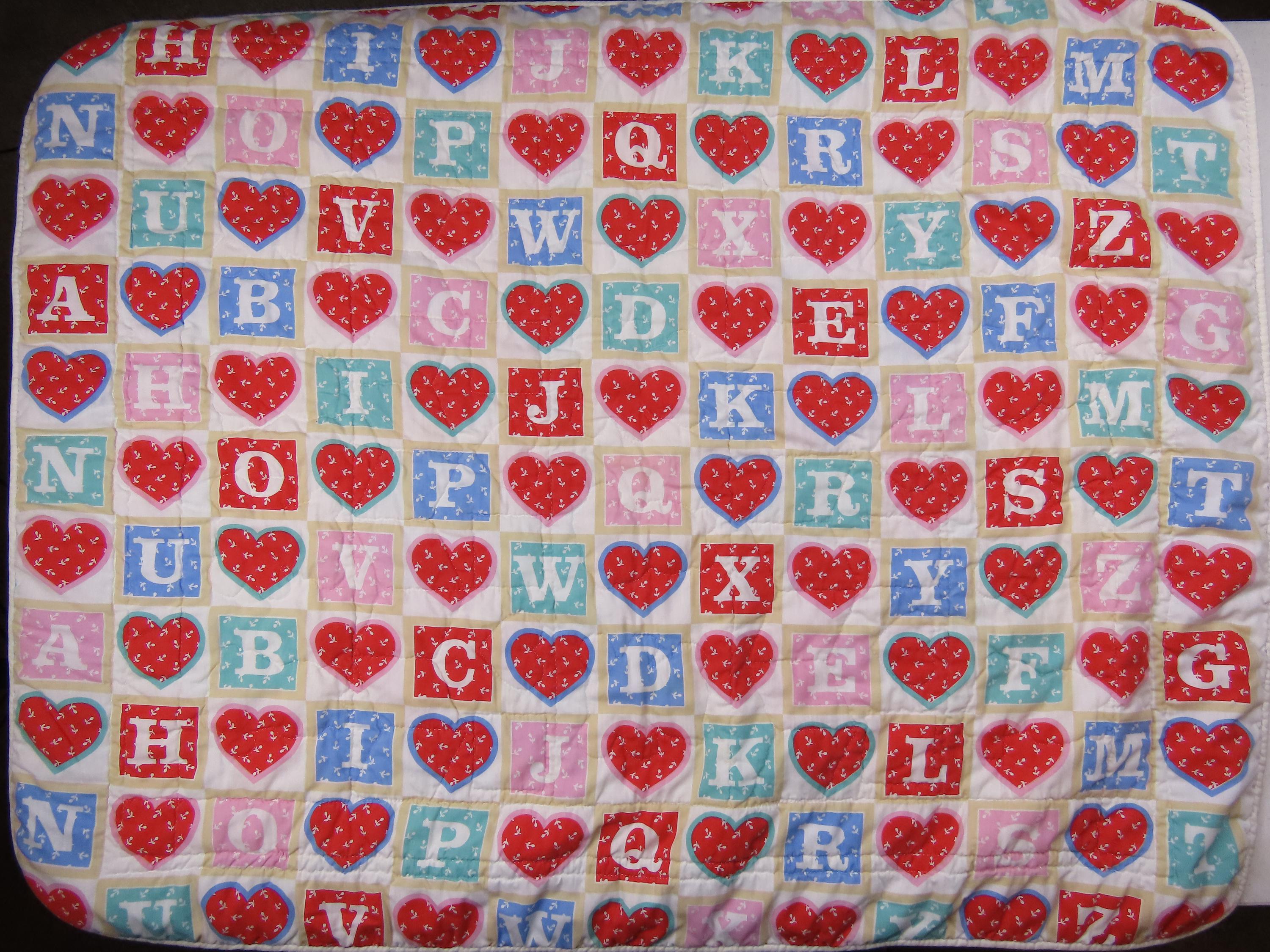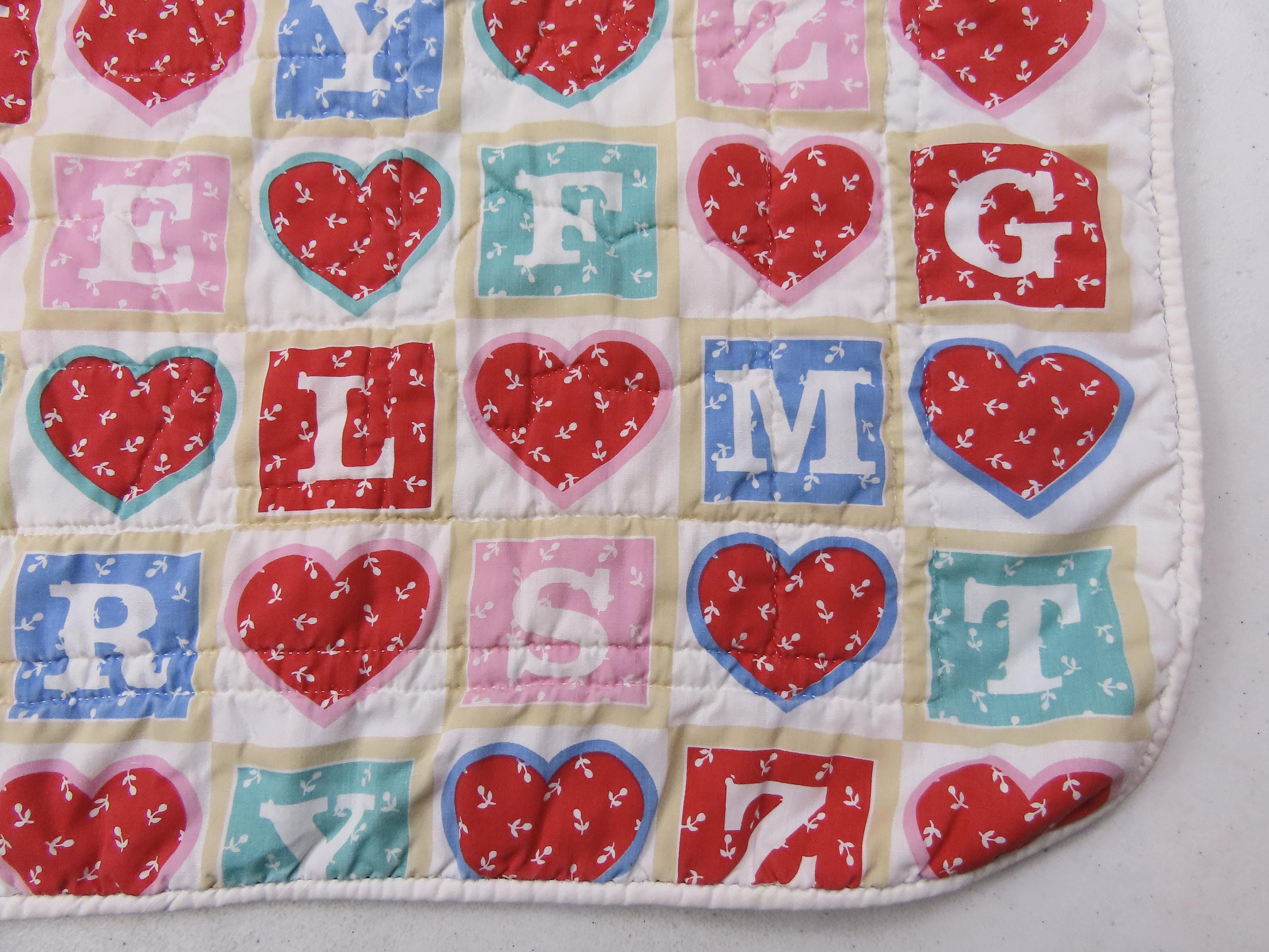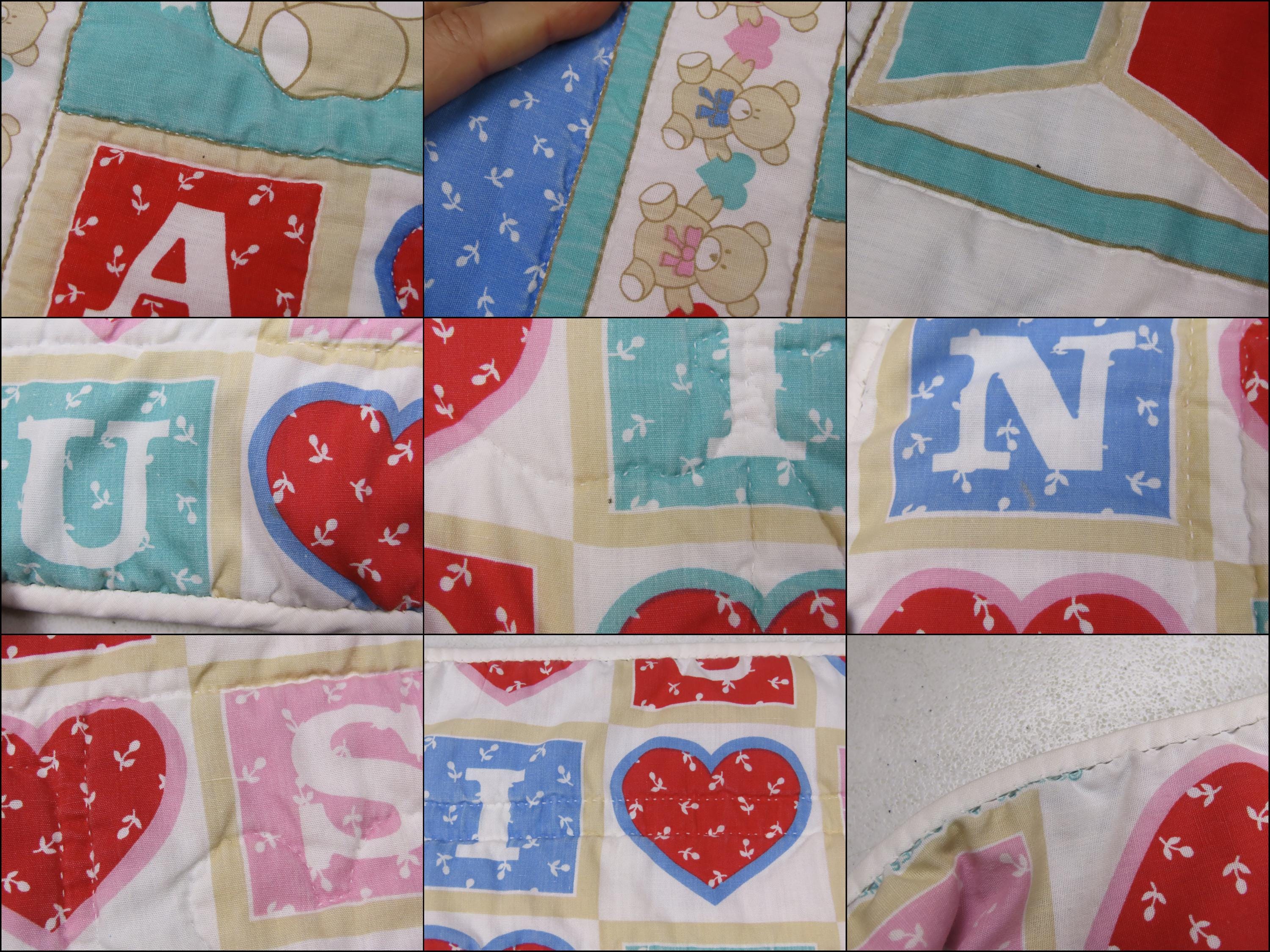 Vintage ABC's Teddy Bear small quilted blanket which is about 43" tall by 33" wide (111 cm by 85 cm). My camera had a hard time picking up the exact colors. It is worn along the edges/stitching, and it is faded in areas. There are missing thread spots, thread snags, and tiny white marks. It has some tiny marks. There are a couple small stains on the backside. The backside has a horizontal orientation.