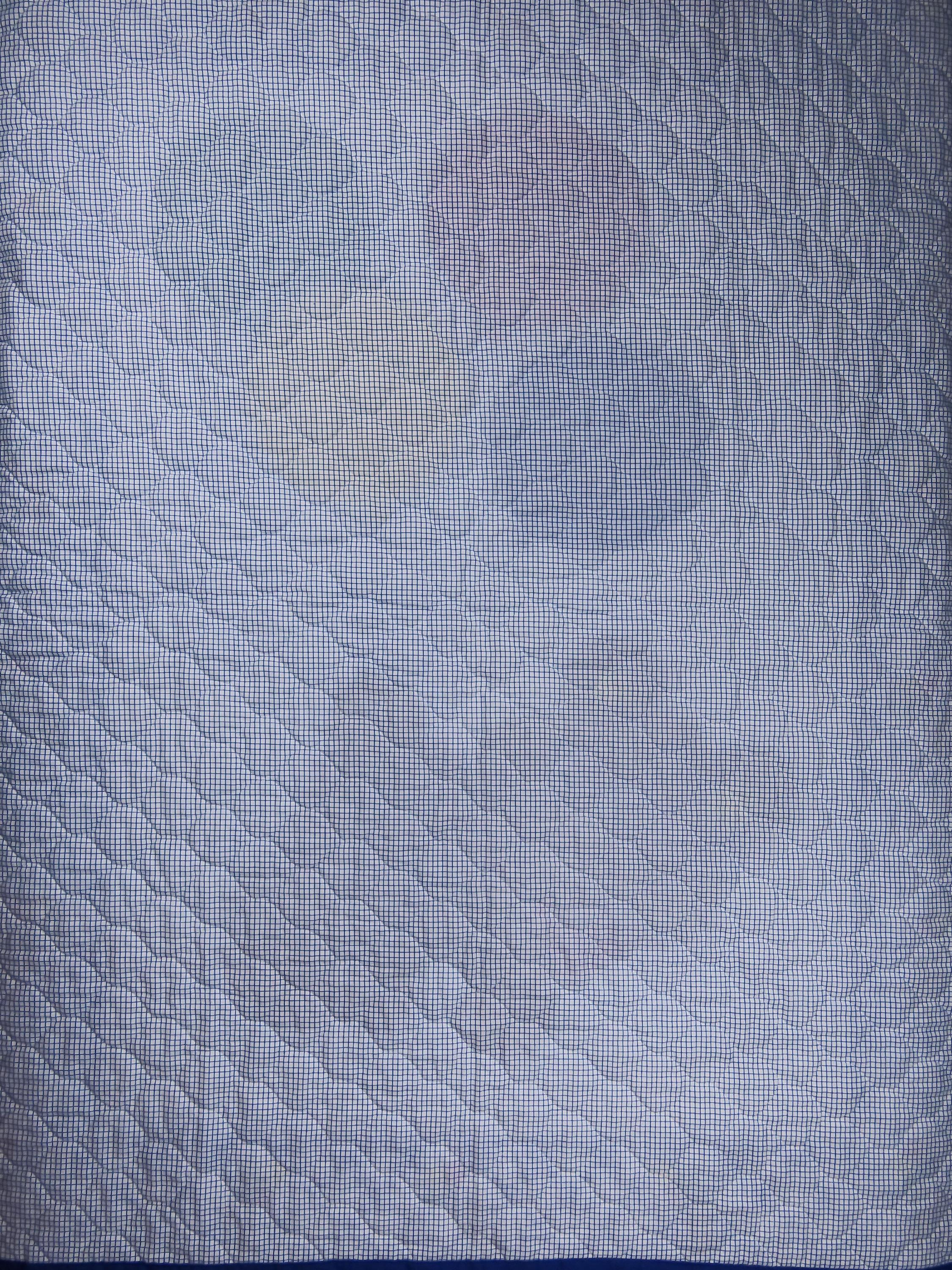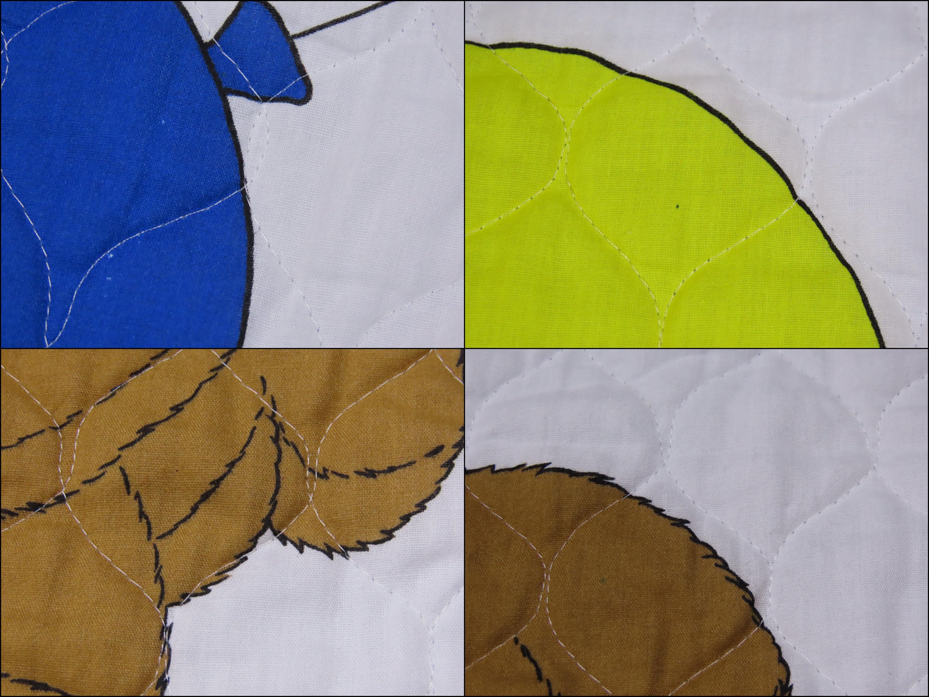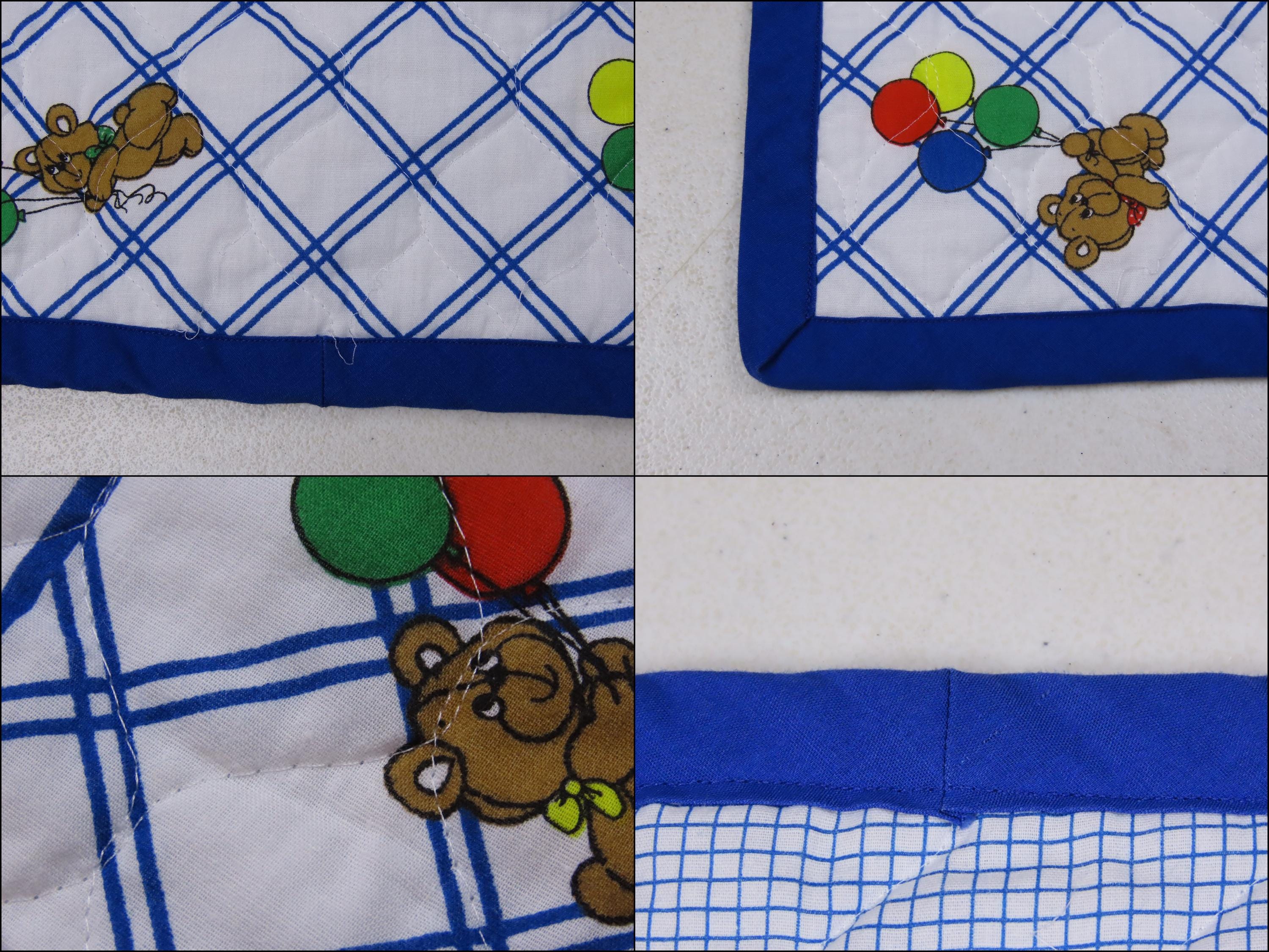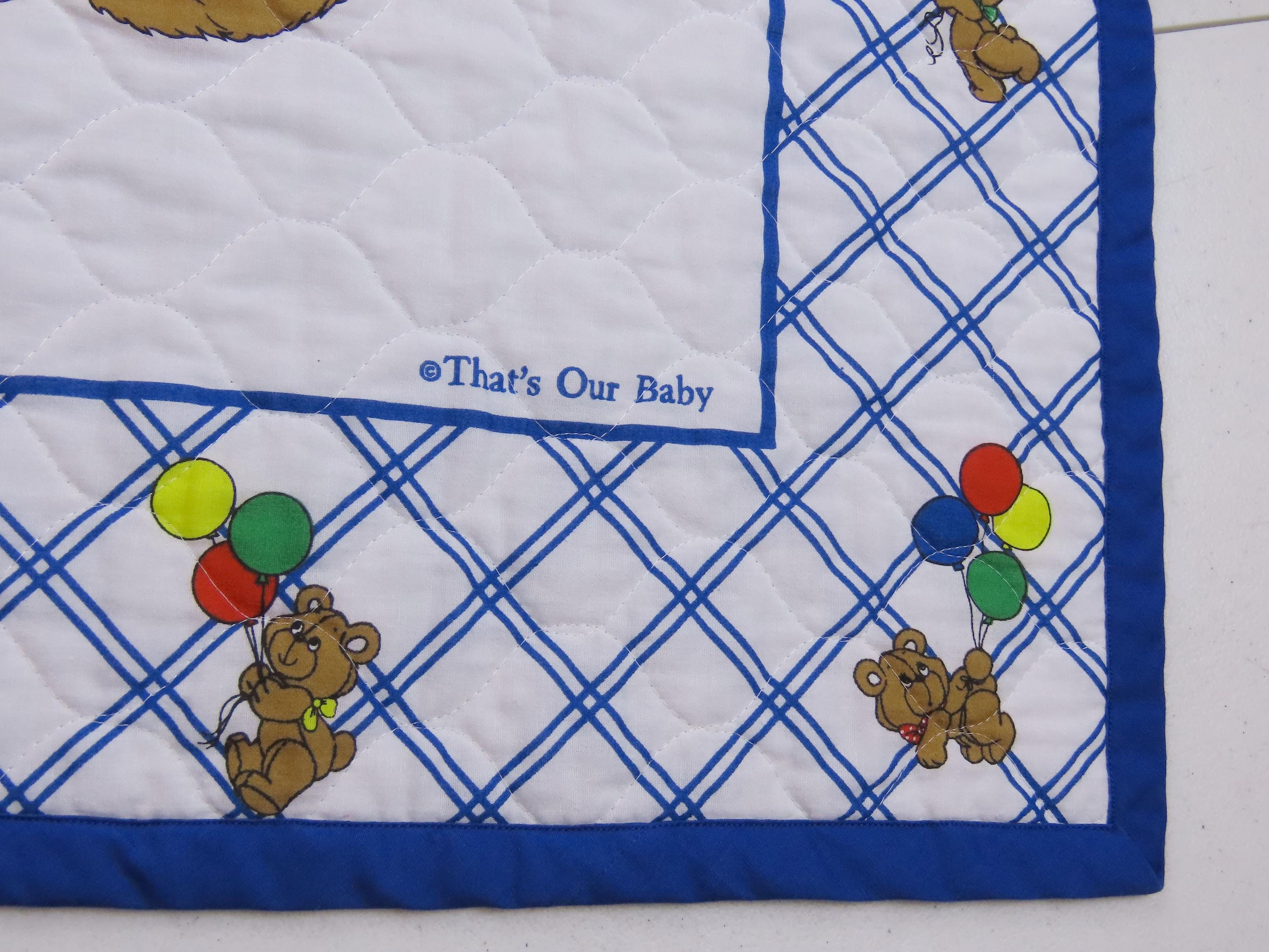 Vintage teddy bear "That's our Baby" small quilted blanket which is about 44.5" long by 34.5" wide (112 cm by 88 cm). There is some stitching undone near the edges. It has some tiny marks, tiny white marks, and thread snags.