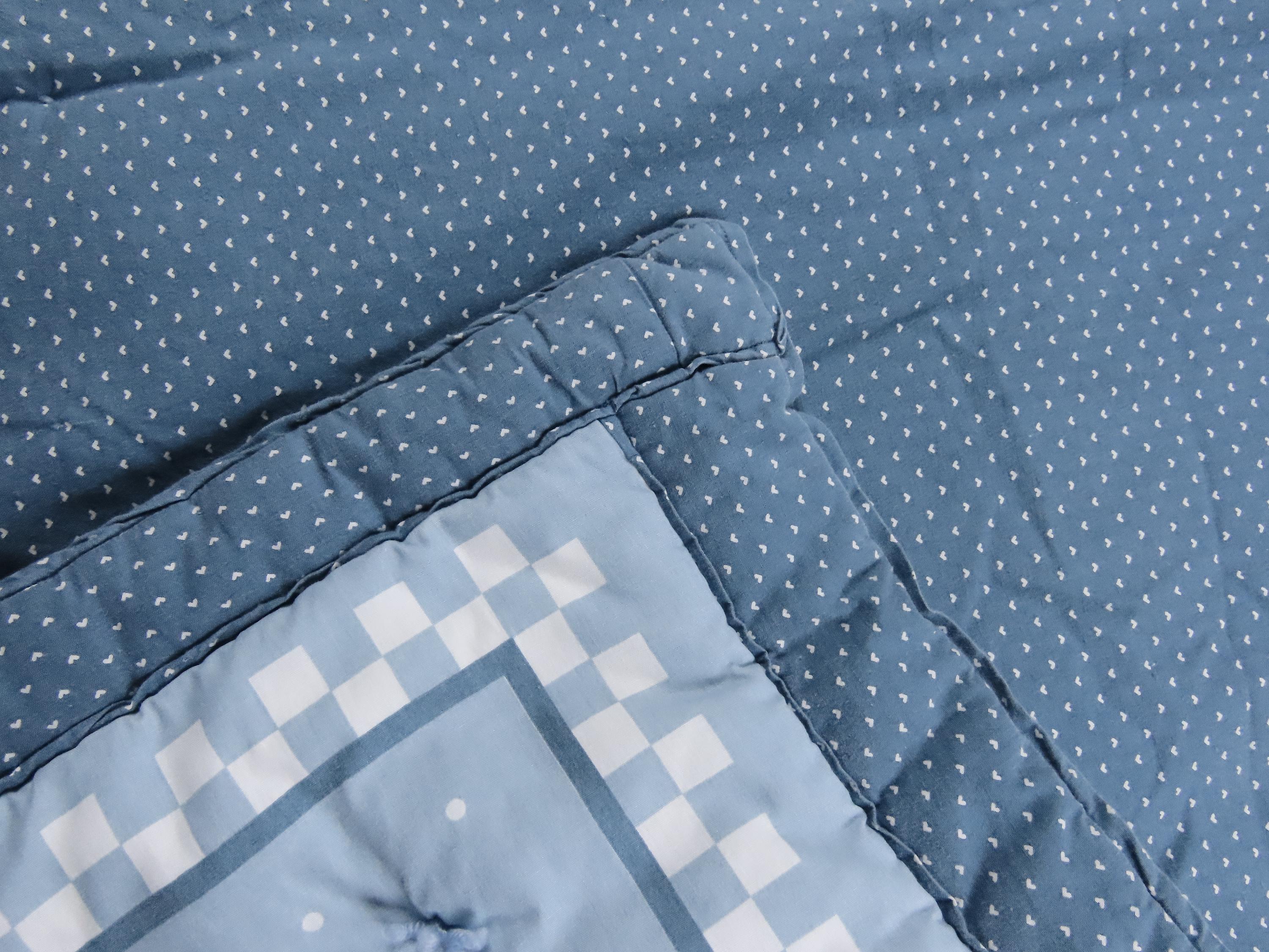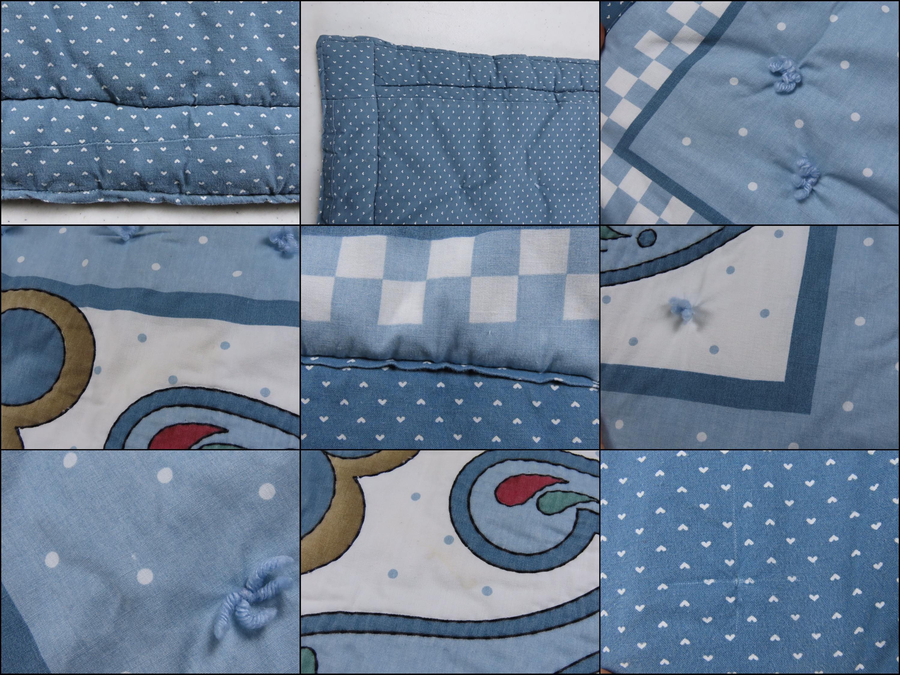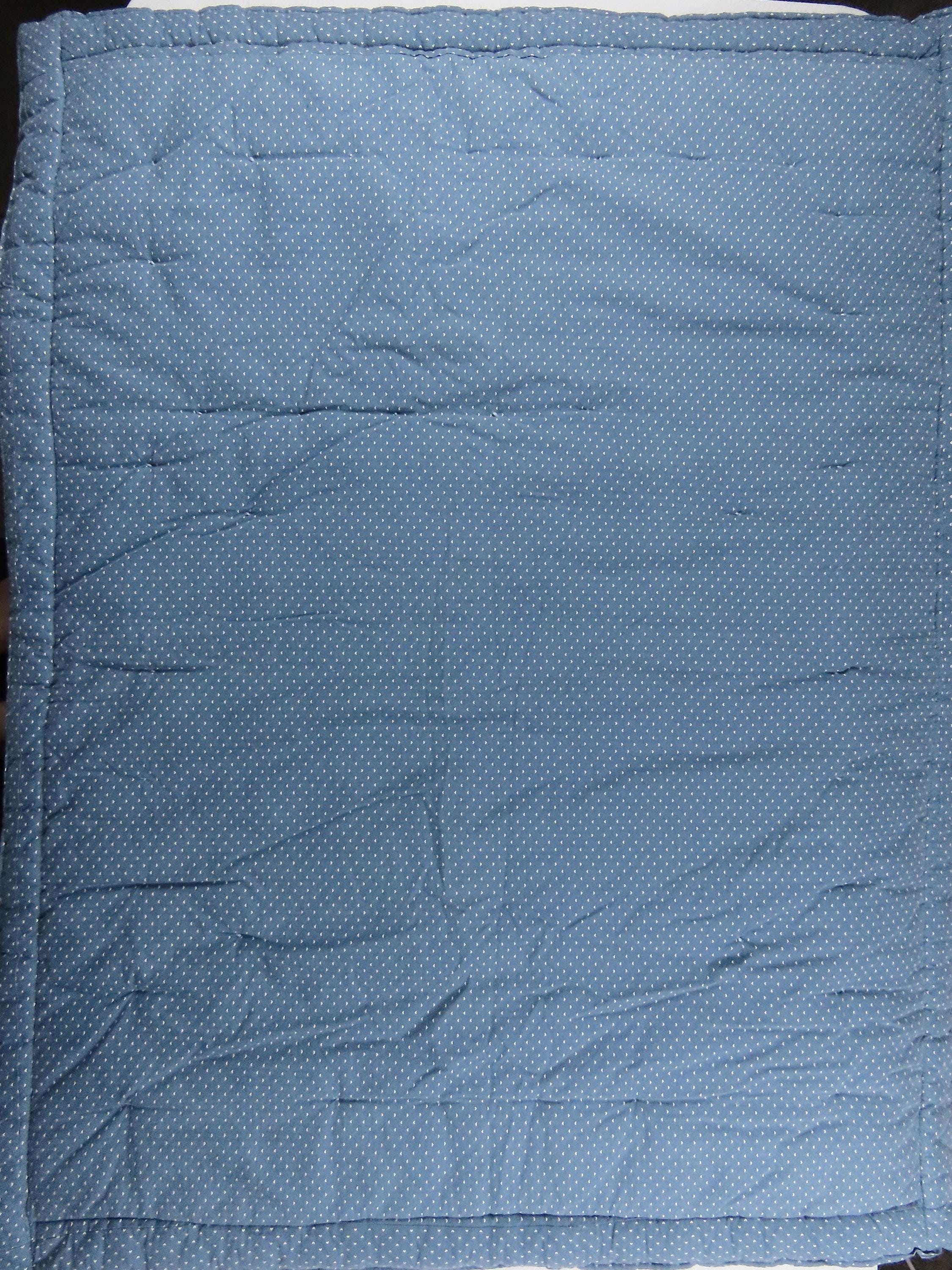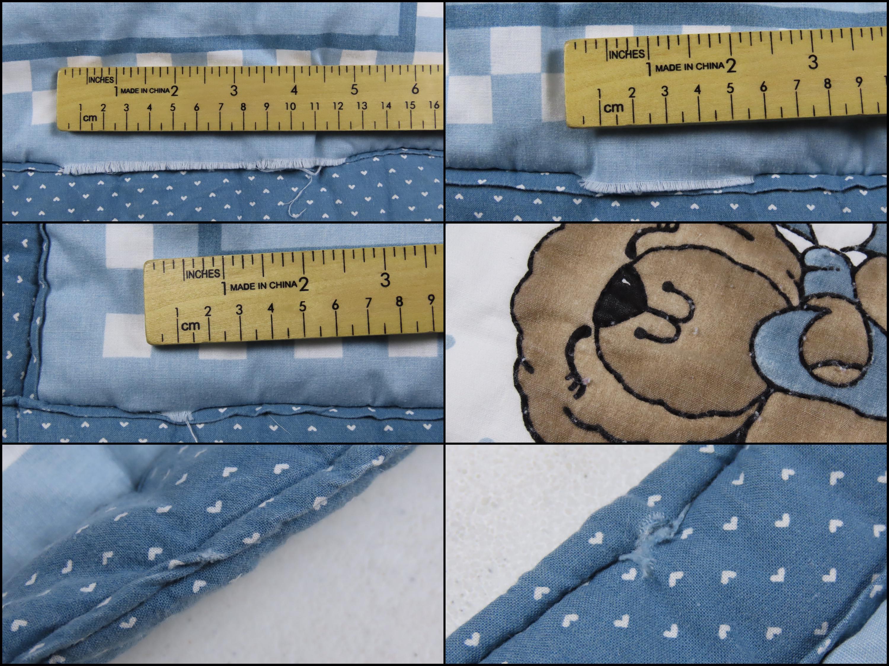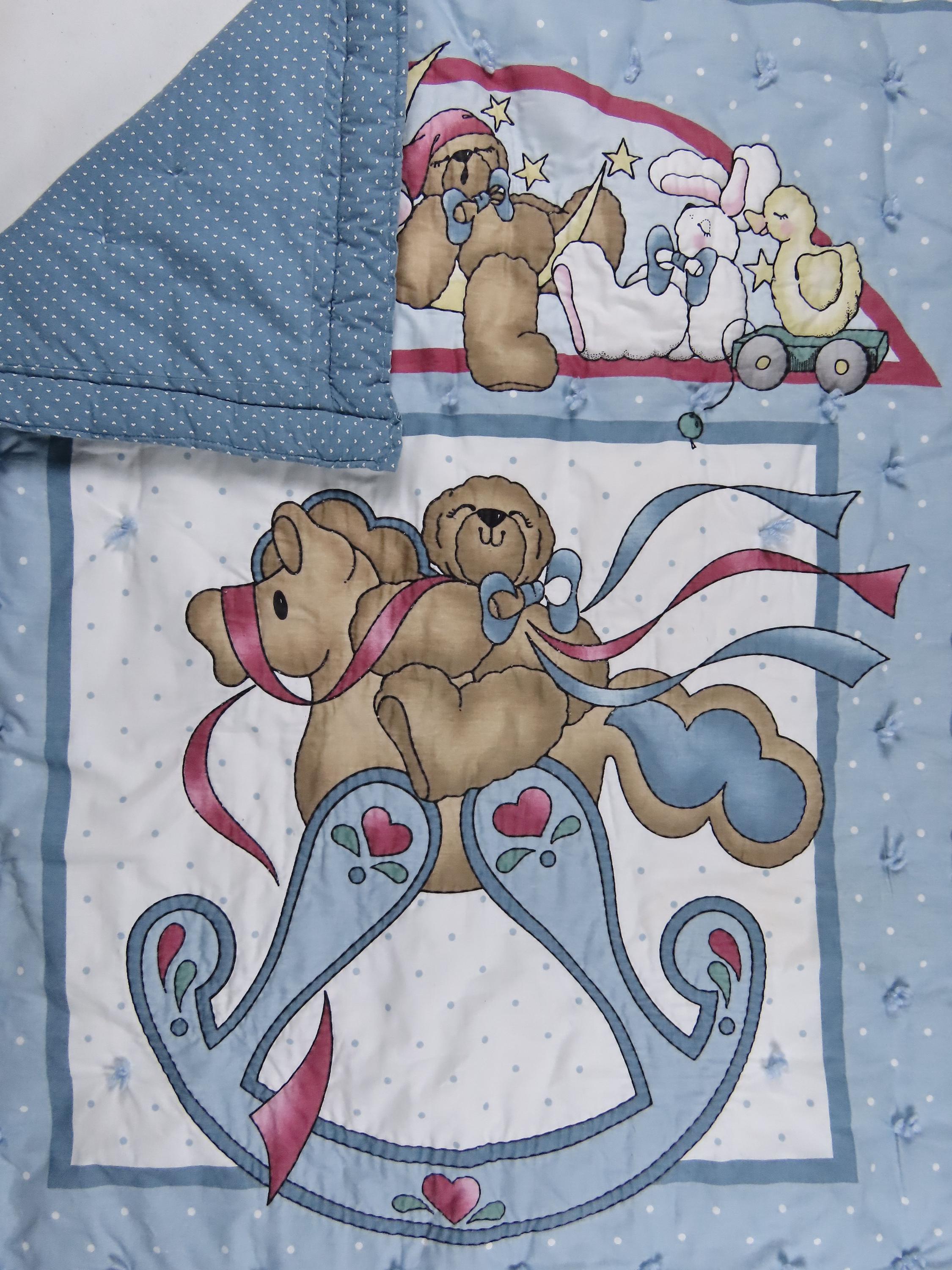 Vintage Teddy Bear crib comforter which is about 46" tall by 36" wide (118 cm by 92 cm). It is worn along the edges/stitching, sewn a little unevenly, and some areas along the stitching are undone forming holes. There are thread snags, some missing thread spots, and a couple large light stains (the edge on one of the stains is darker). It has a small hole on the edge, a small whitish mark, and a tiny hole. The fabric pools up some on the backside. It is a little faded in areas, the yarn ties are fraying some, and it has light pilling in areas.