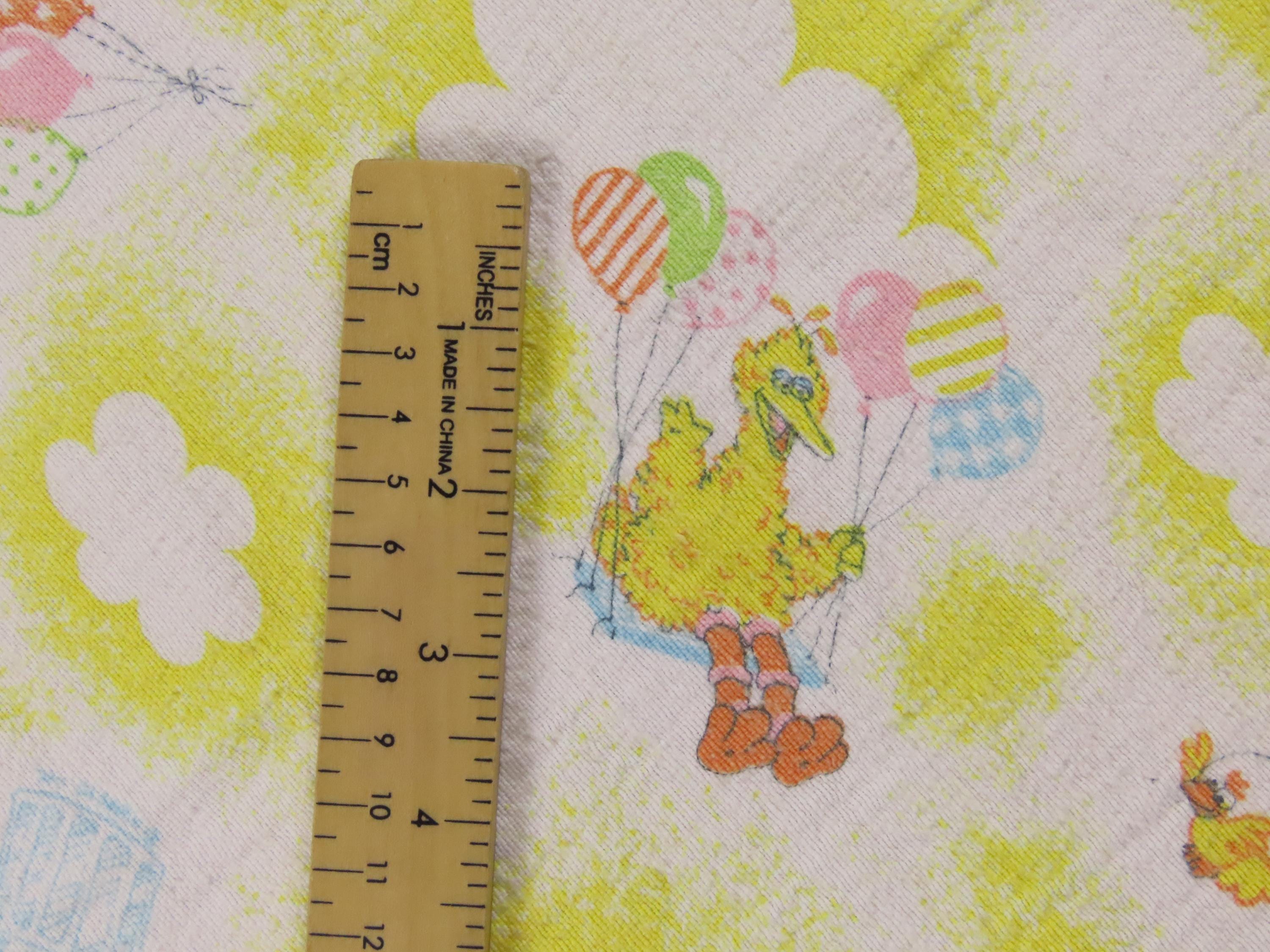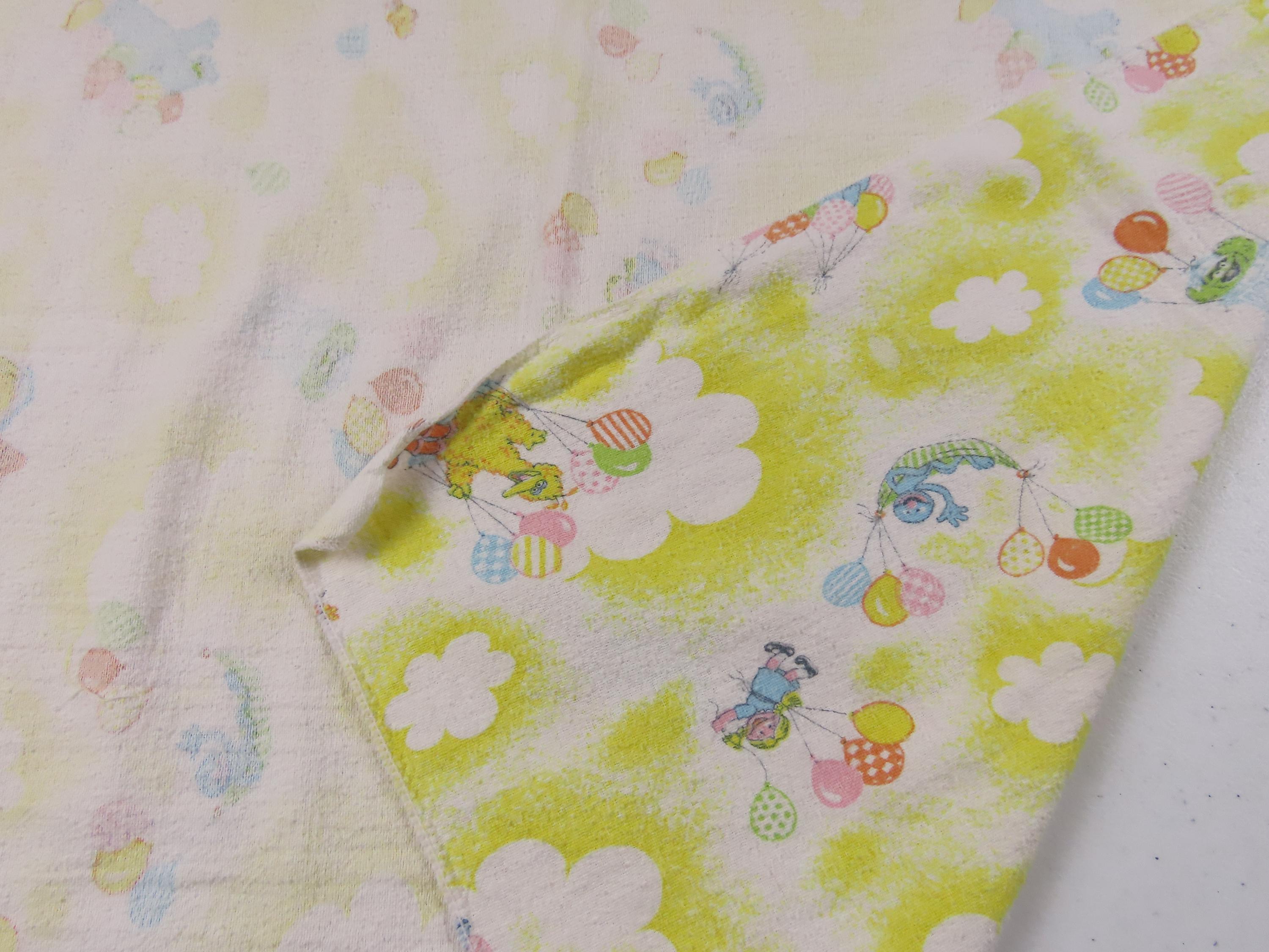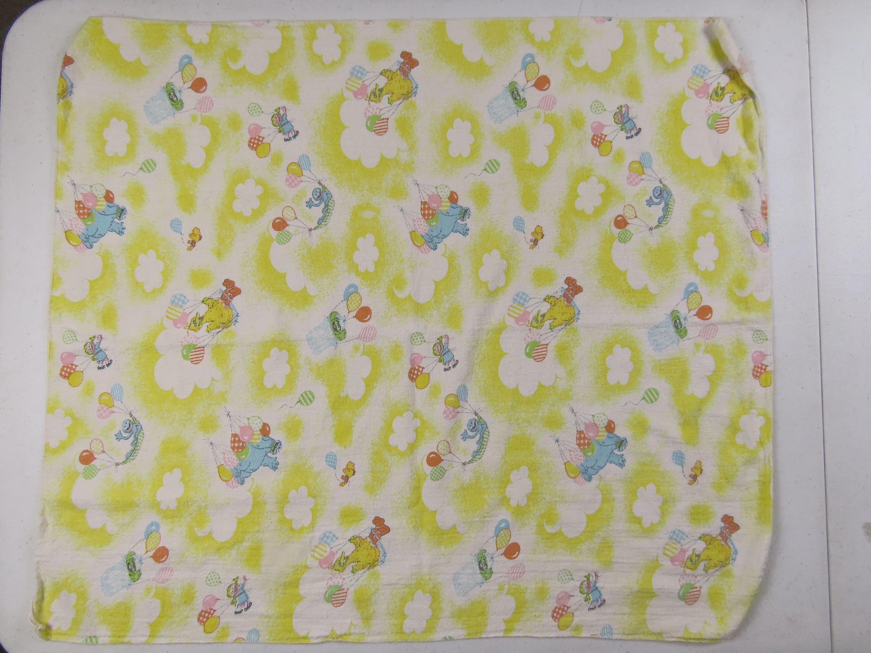 Vintage Sesame Street receiving blanket which is about 31" by 27" (80 cm by 69 cm). My camera had a hard time picking up the exact colors. It does not want to lay completely flat since the edges curl up. There are thread snags, some loose/pulled fibers, and hard creases. It is faded, pilling, and has a couple small areas where the fibers are more loosely woven trying to form holes.