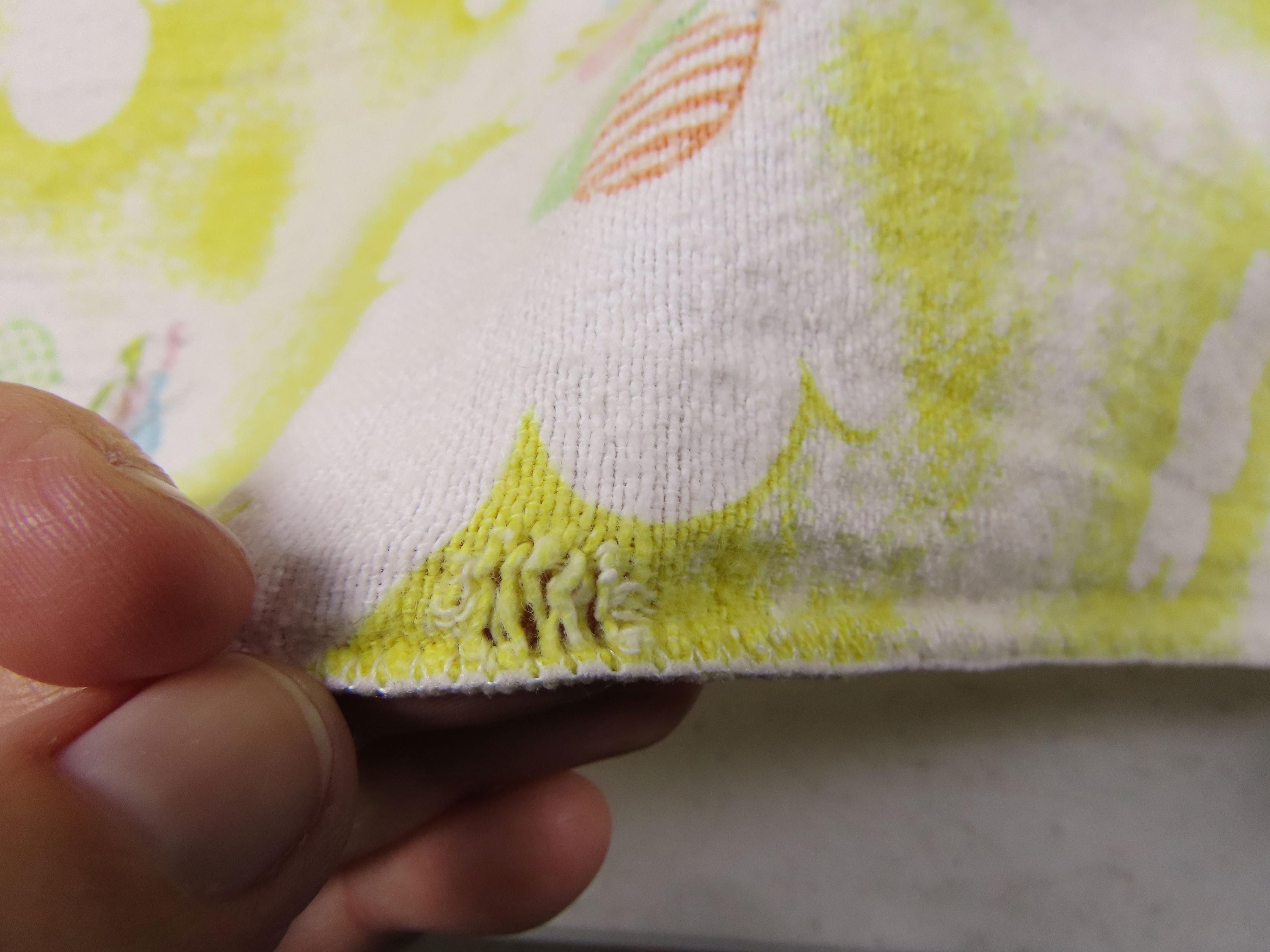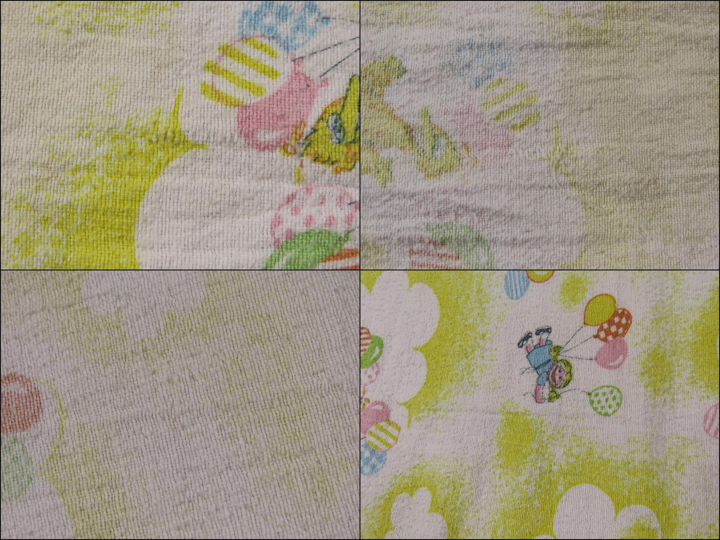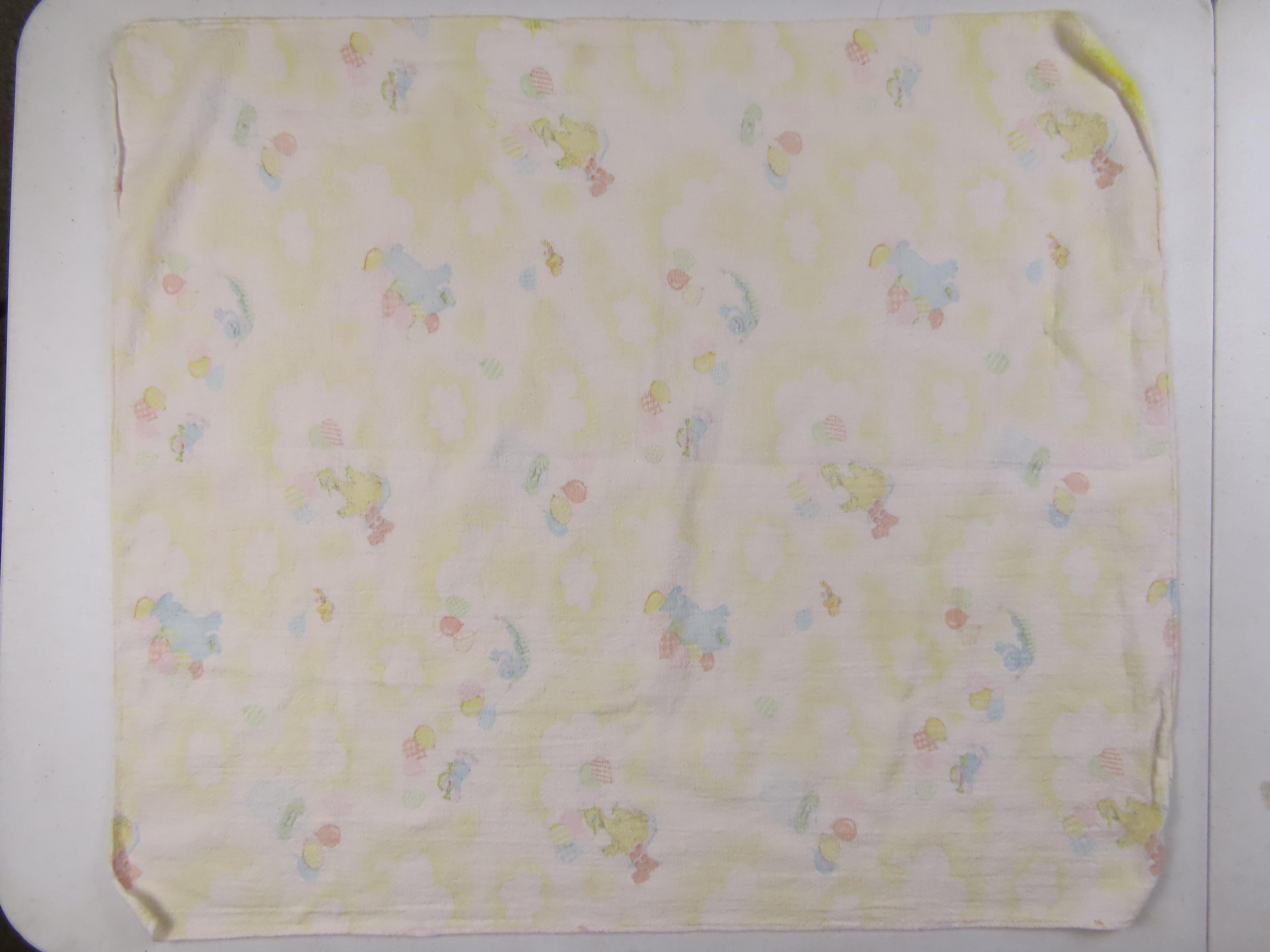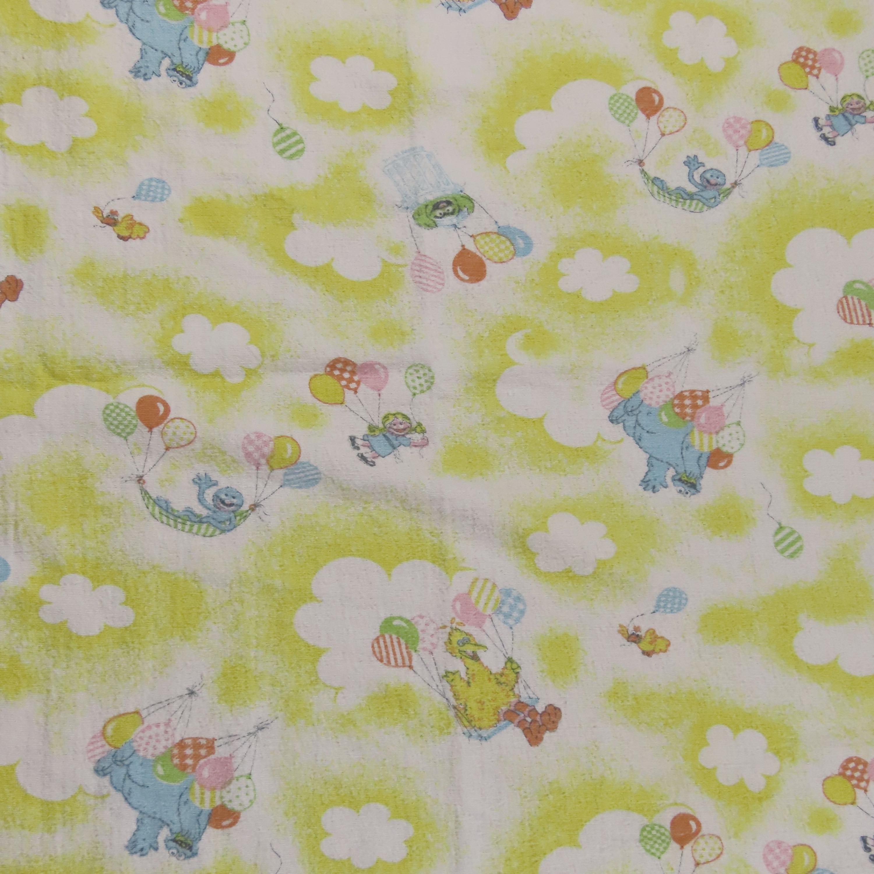 Vintage Sesame Street receiving blanket which is about 31" by 27" (80 cm by 69 cm). My camera had a hard time picking up the exact colors. It does not want to lay completely flat since the edges curl up. There are thread snags, some loose/pulled fibers, and hard creases. It is faded, pilling, and has a couple small areas where the fibers are more loosely woven trying to form holes.