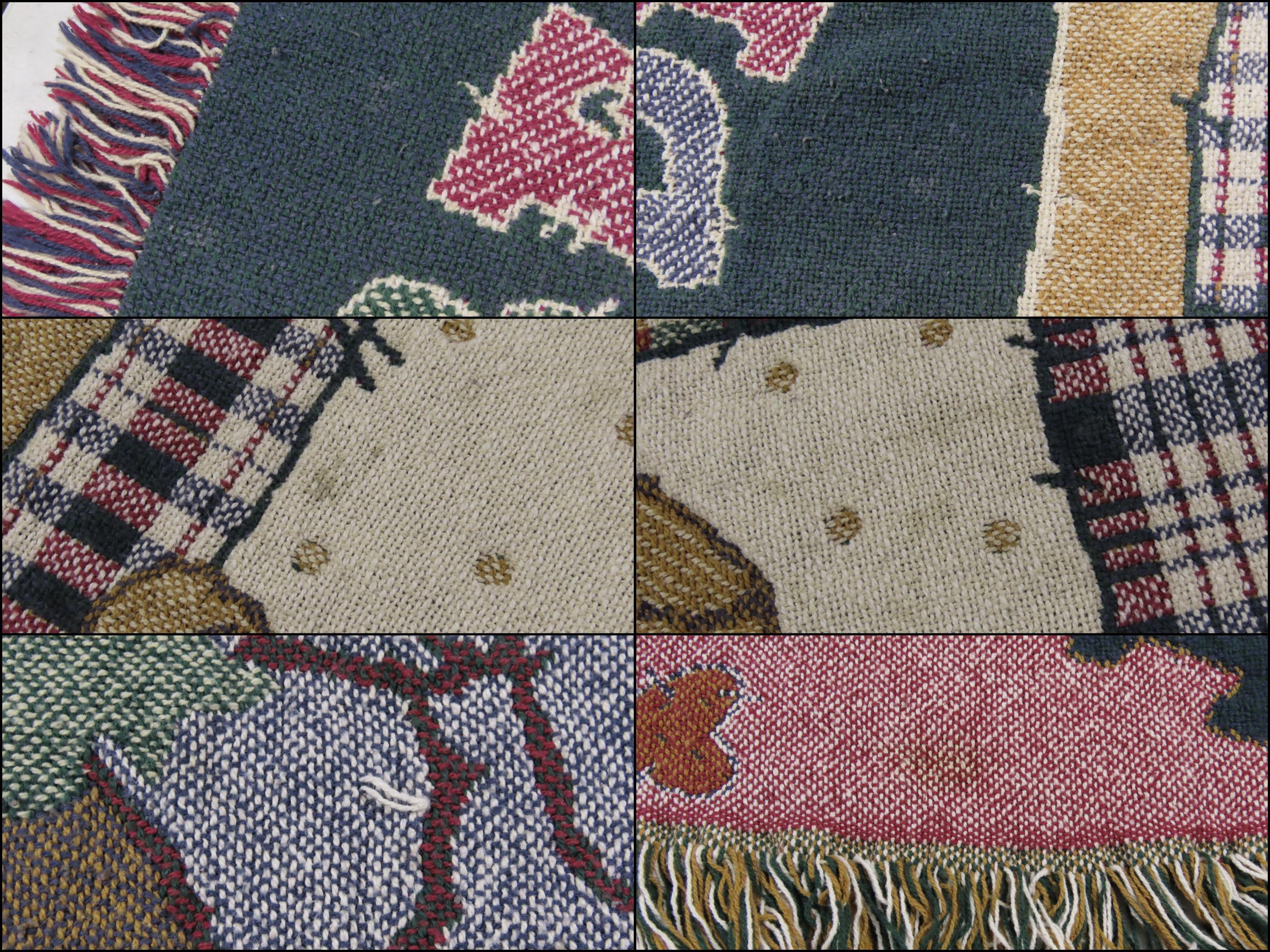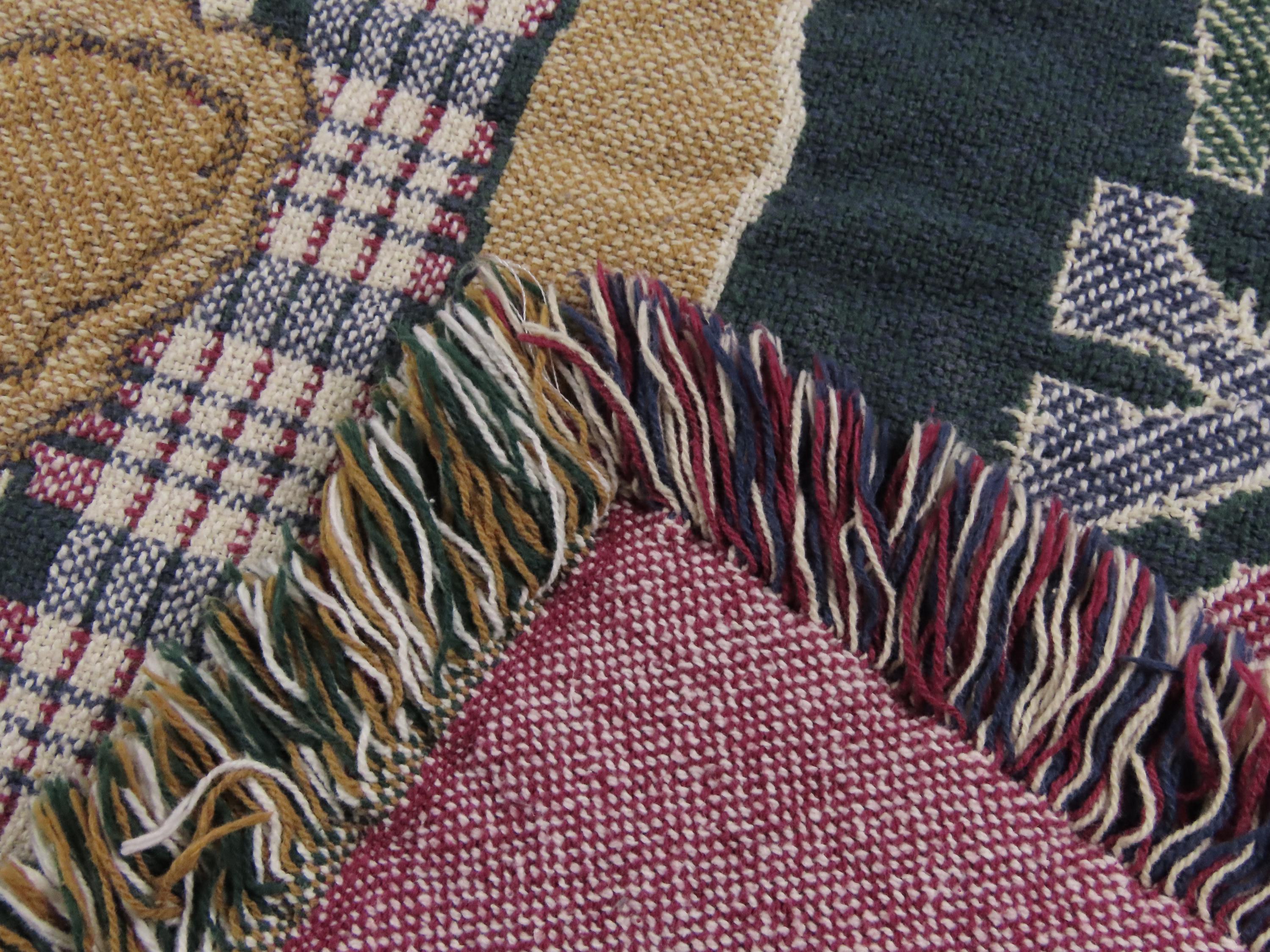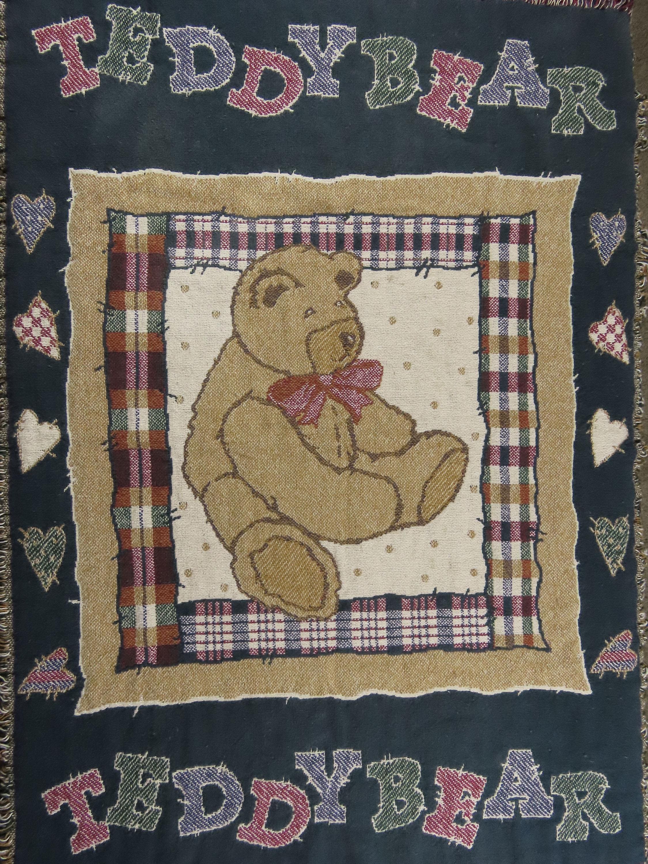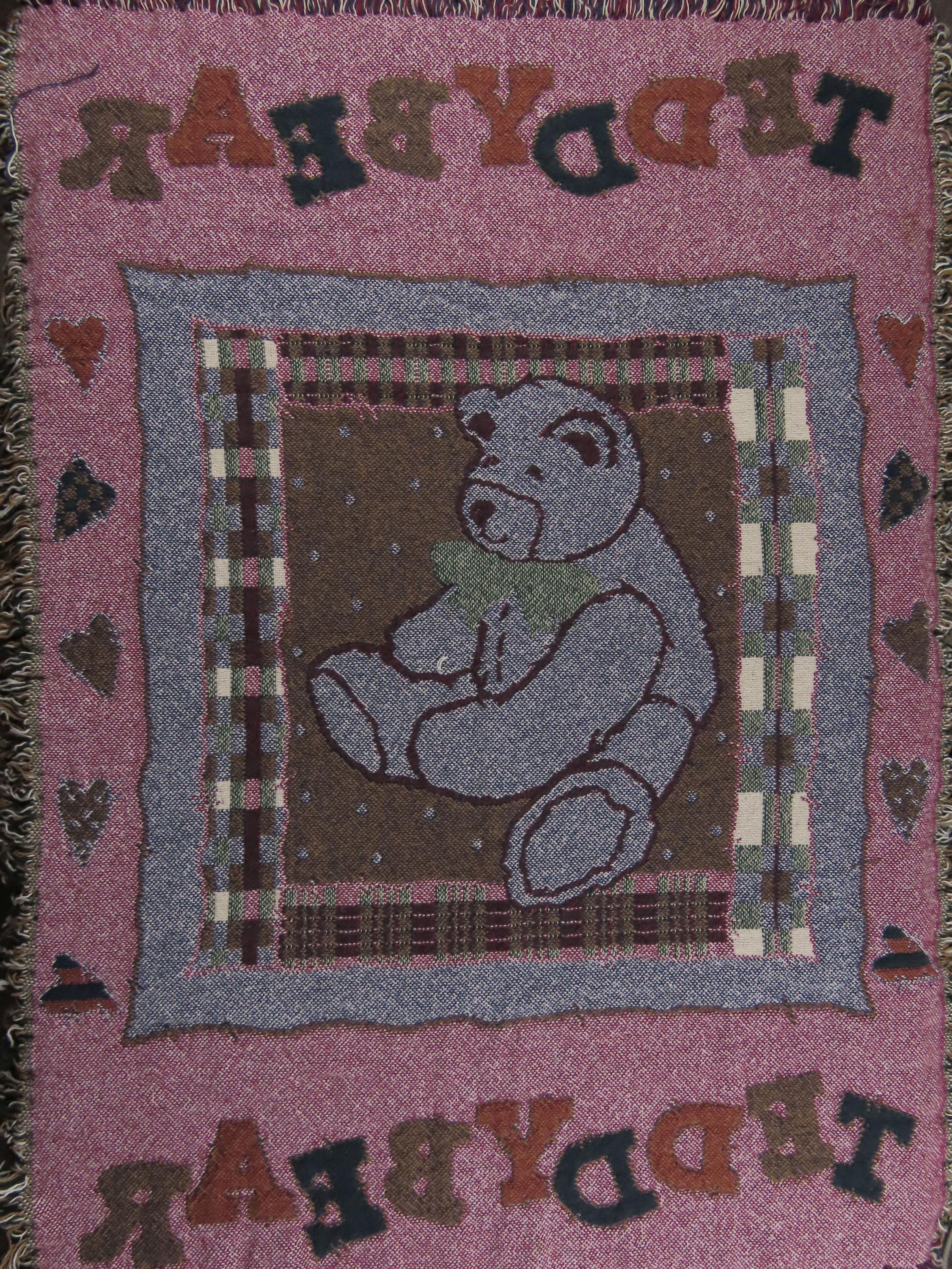 Vintage teddy bear small woven blanket which is about 47" tall by 36" wide including decorative fringe (120 cm by 91 cm). The blanket has overall wear, pilling, and some loose/pulled fibers. The blanket doesn't want to lay completely flat, as it is wavy/rippled. It has a few small stains, a larger stain (on backside), and a few small light whitish marks/blemishes. The tips of the yarn for the decorative edge are fraying. The frontside is pilling for than the backside.